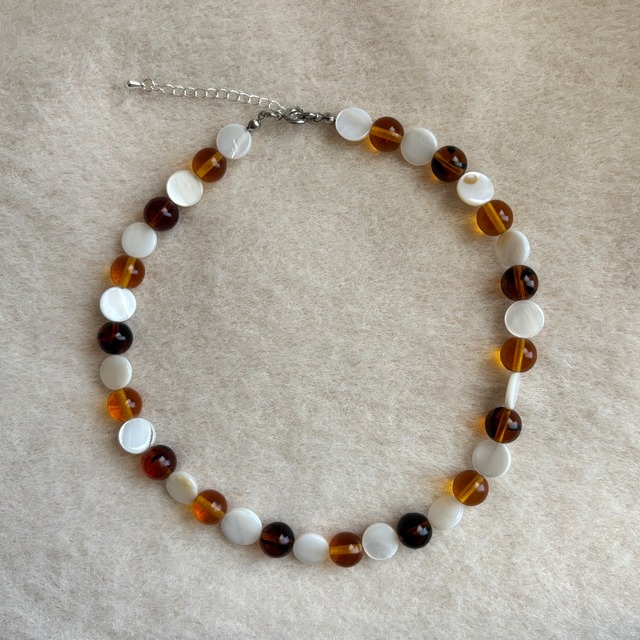 夕暮れの光を閉じ込めたようなネックレス○ 透き通るようなオレンジアンバーのビーズと、白のディスクが交互に並び、日が沈む空に漂う光と余白。 アジャスター付きで首元にフィットさせる日、ゆったり身につける日 その日のコーデに合わせて使えます。 サイズ:全長 約37.5cm(エンドパーツ含む) ※アジャスター部分:約5cm (含まない37cm) 丈夫なナイロンコートワイヤーを使用しており、型崩れしにくく長く使えます。 ステンレス製の留め具は水や汗に強く、デイリーにもリゾートにもぴったり。 ※長くご愛用いただく中で、使用環境や保管状況・摩擦や経年により多少の変色や劣化がみられる場合がございます。 ⚠️ご購入前のご案内 ・当店のアクセサリーは一点ずつ手作業でお作りしています。そのため、形や色味にわずかな違いが生じる場合がございます。既製品にはない個性としてお楽しみください。 ・使用しているパーツは一つひとつ大きさや形に差があるため、商品ページに記載している直径やサイズと多少の誤差が生じることがございます。あらかじめご了承ください。 ・使用している金属はアレルギー対応ではございません。肌に合わないと感じられた場合は、ご着用をお控えください。 ・強い力を加えたり引っ張ったりすると破損することがございます。特に細かなパーツは繊細ですので、お取り扱いにはご注意ください。 ・汗や水濡れ、湿度によって変色や劣化が起こりやすくなります。ご使用後は柔らかい布で軽く拭き取り、高温多湿や直射日光を避けて保管していただけると安心です。 ・初期不良を除き、お客様都合での返品・交換は承っておりません。ご不安な点があれば、ご購入前にお気軽にお問い合わせください。 ・ご使用中の破損や、時間の経過による変色・劣化については対応いたしかねます。あらかじめご了承ください。
