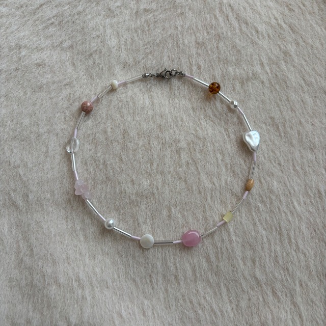 マシュマロみたいにやわらかな質感。 優しいピンクと、ミルクの白、チョコレートのような深い色を組み合わせた、甘くて静かな色合いのネックレスです。 異なる形のビーズが並ぶことで、見た目にちょっと動きが出ます。 丈夫なナイロンコートワイヤーを使用しており、型崩れしにくく長く使えます。 ステンレス製の留め具は水や汗に強く、デイリーにもリゾートにもぴったり。 サイズ:全長 約35.3cm(エンドパーツ含む) ※アジャスターは付いておりません。 ⚠️ご購入前のご案内 ・当店のアクセサリーは一点ずつ手作業でお作りしています。そのため、形や色味にわずかな違いが生じる場合がございます。既製品にはない個性としてお楽しみください。 ・使用しているパーツは一つひとつ大きさや形に差があるため、商品ページに記載している直径やサイズと多少の誤差が生じることがございます。あらかじめご了承ください。 ・使用している金属はアレルギー対応ではございません。肌に合わないと感じられた場合は、ご着用をお控えください。 ・強い力を加えたり引っ張ったりすると破損することがございます。特に細かなパーツは繊細ですので、お取り扱いにはご注意ください。 ・汗や水濡れ、湿度によって変色や劣化が起こりやすくなります。ご使用後は柔らかい布で軽く拭き取り、高温多湿や直射日光を避けて保管していただけると安心です。 ・初期不良を除き、お客様都合での返品・交換は承っておりません。ご不安な点があれば、ご購入前にお気軽にお問い合わせください。 ・ご使用中の破損や、時間の経過による変色・劣化については対応いたしかねます。あらかじめご了承ください。