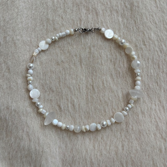 月の光のような優しい輝きをイメージして作ったネックレスです。 一粒一粒のホワイトシェルと、ところどころに散りばめたきらめくビーズが、月明かりのようにそっと輝きます。 季節問わず使えるネックレス。 丈夫なナイロンコートワイヤーを使用しており、型崩れしにくく長く使えます。 ステンレス製の留め具は水や汗に強く、デイリーにもリゾートにもぴったり。 サイズ:全長 約37cm(エンドパーツ含む) ※アジャスターは付いておりません。 ⚠️ご購入前のご案内 ・当店のアクセサリーは一点ずつ手作業でお作りしています。そのため、形や色味にわずかな違いが生じる場合がございます。既製品にはない個性としてお楽しみください。 ・使用しているパーツは一つひとつ大きさや形に差があるため、商品ページに記載している直径やサイズと多少の誤差が生じることがございます。あらかじめご了承ください。 ・使用している金属はアレルギー対応ではございません。肌に合わないと感じられた場合は、ご着用をお控えください。 ・強い力を加えたり引っ張ったりすると破損することがございます。特に細かなパーツは繊細ですので、お取り扱いにはご注意ください。 ・汗や水濡れ、湿度によって変色や劣化が起こりやすくなります。ご使用後は柔らかい布で軽く拭き取り、高温多湿や直射日光を避けて保管していただけると安心です。 ・初期不良を除き、お客様都合での返品・交換は承っておりません。ご不安な点があれば、ご購入前にお気軽にお問い合わせください。 ・ご使用中の破損や、時間の経過による変色・劣化については対応いたしかねます。あらかじめご了承ください。