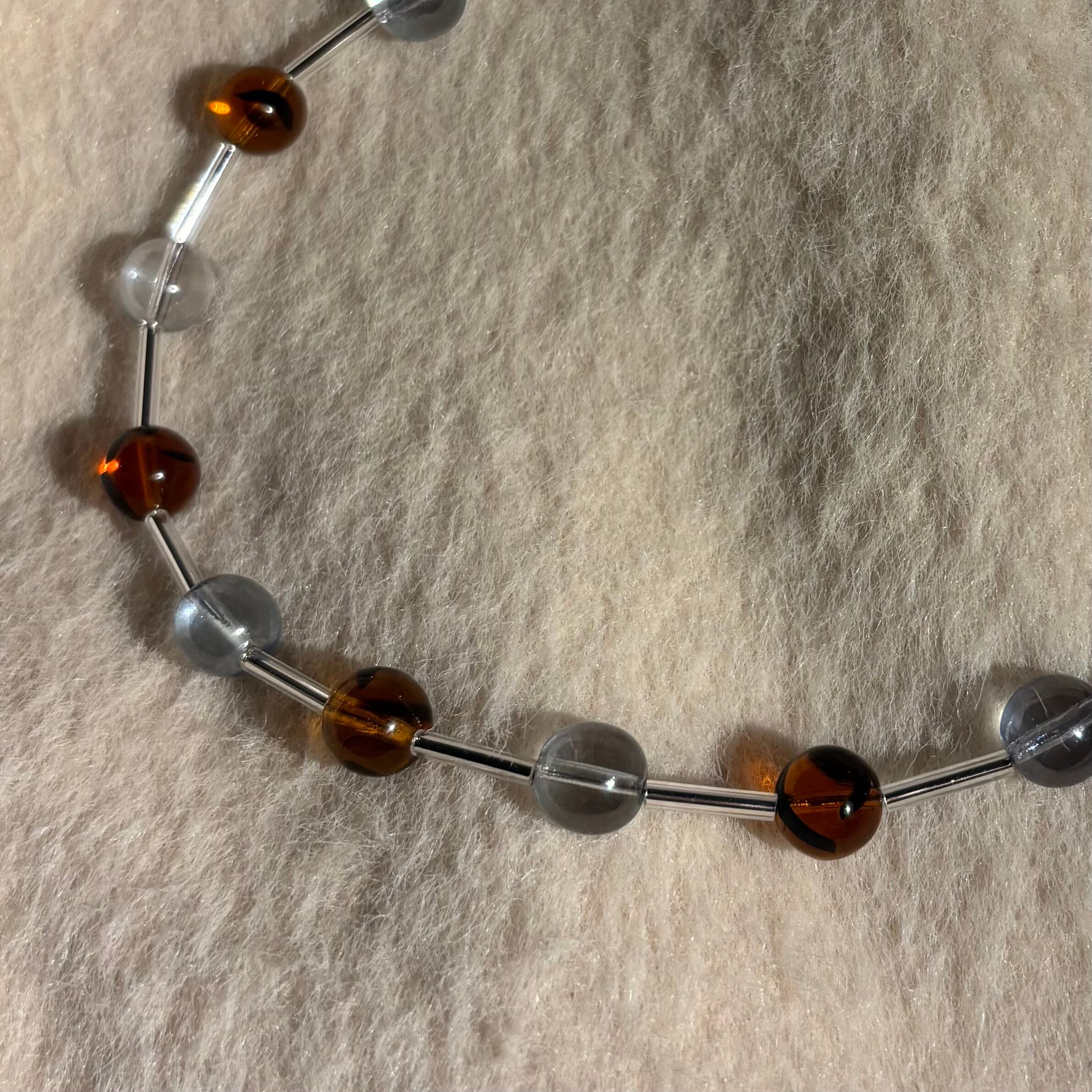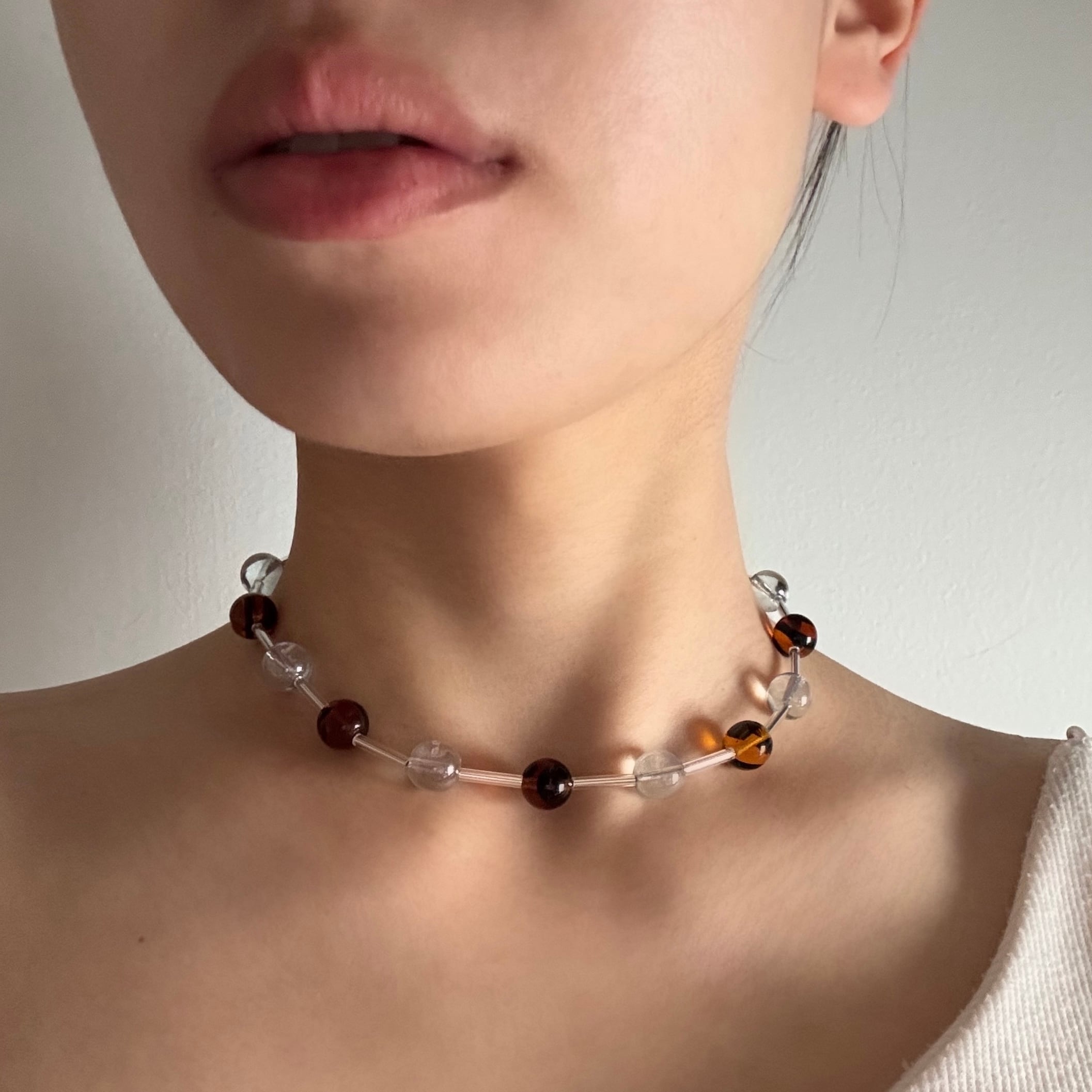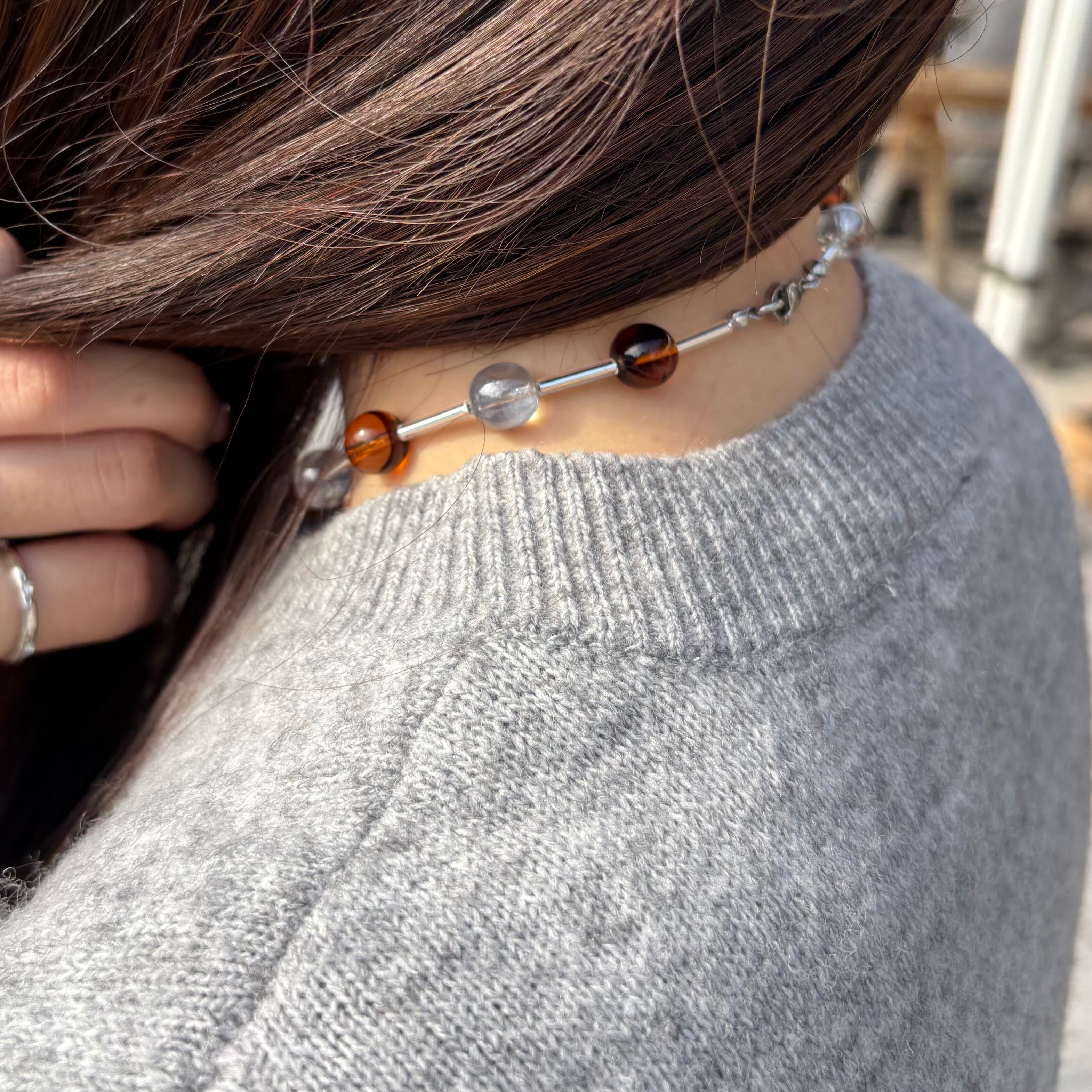 透明感のあるブルーと、べっこうのような艶やかなブラウンビーズを組み合わせたネックレス。