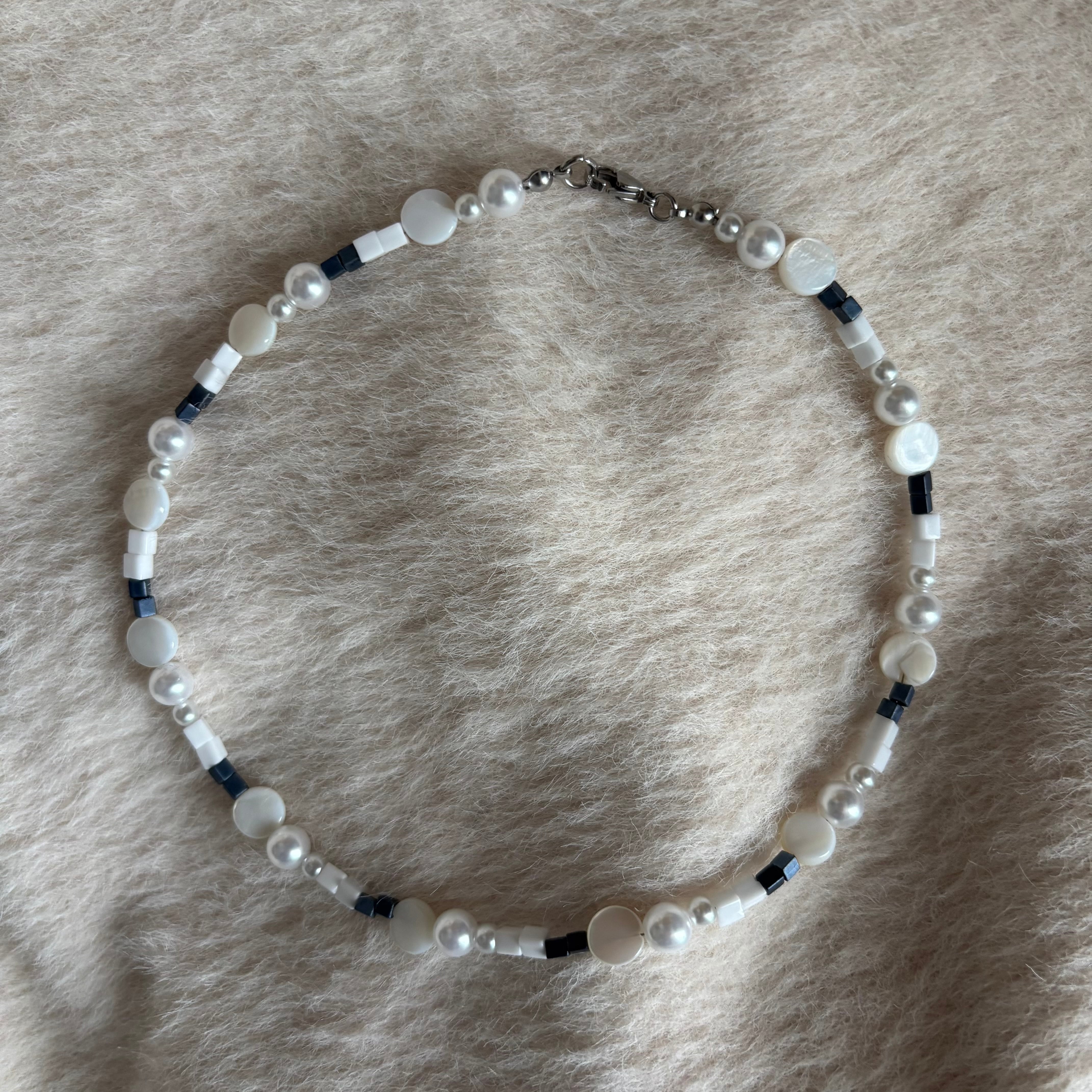 深いグレーのスクエアビーズと柔らかなパールトーンが、冬の静かな美しさを映し出し、