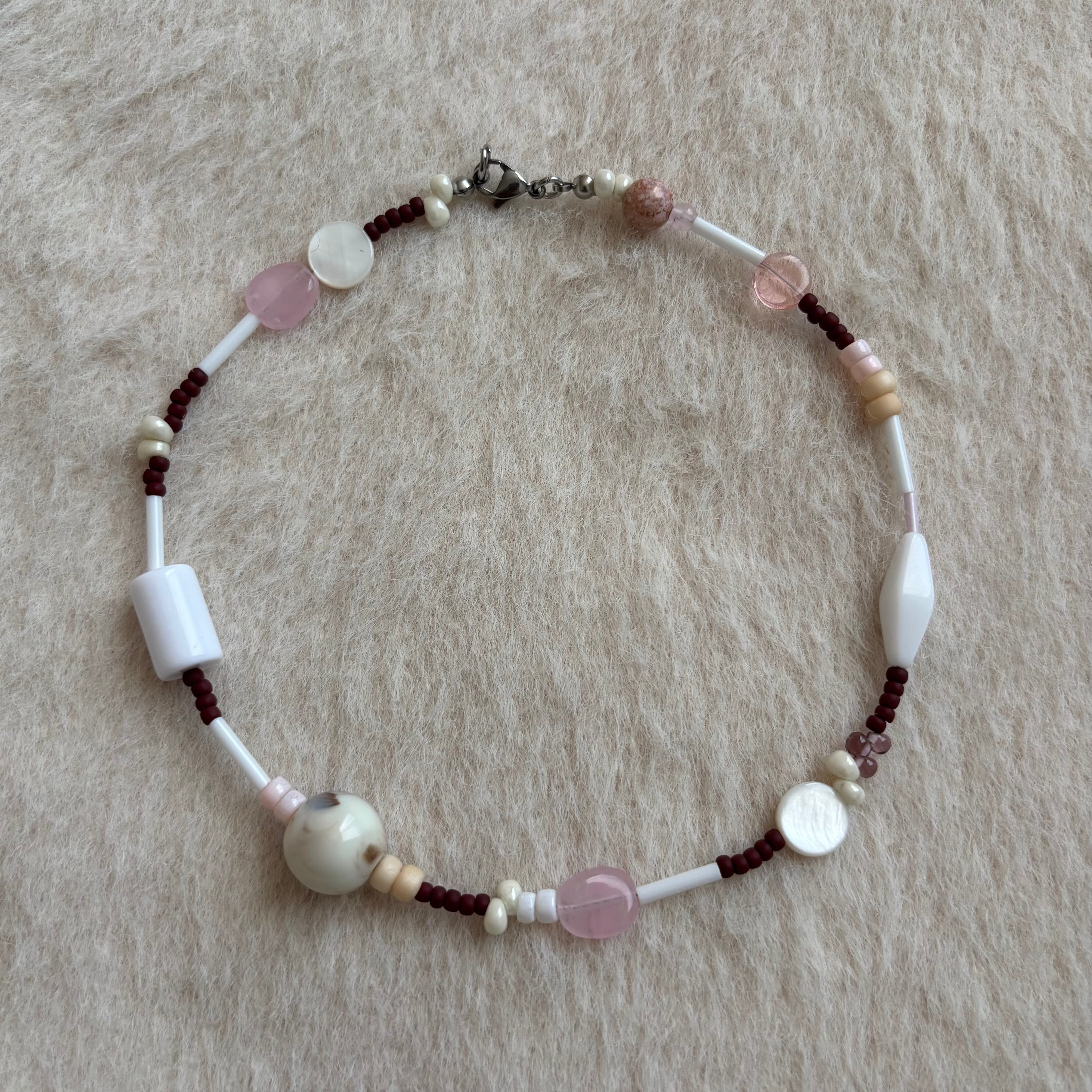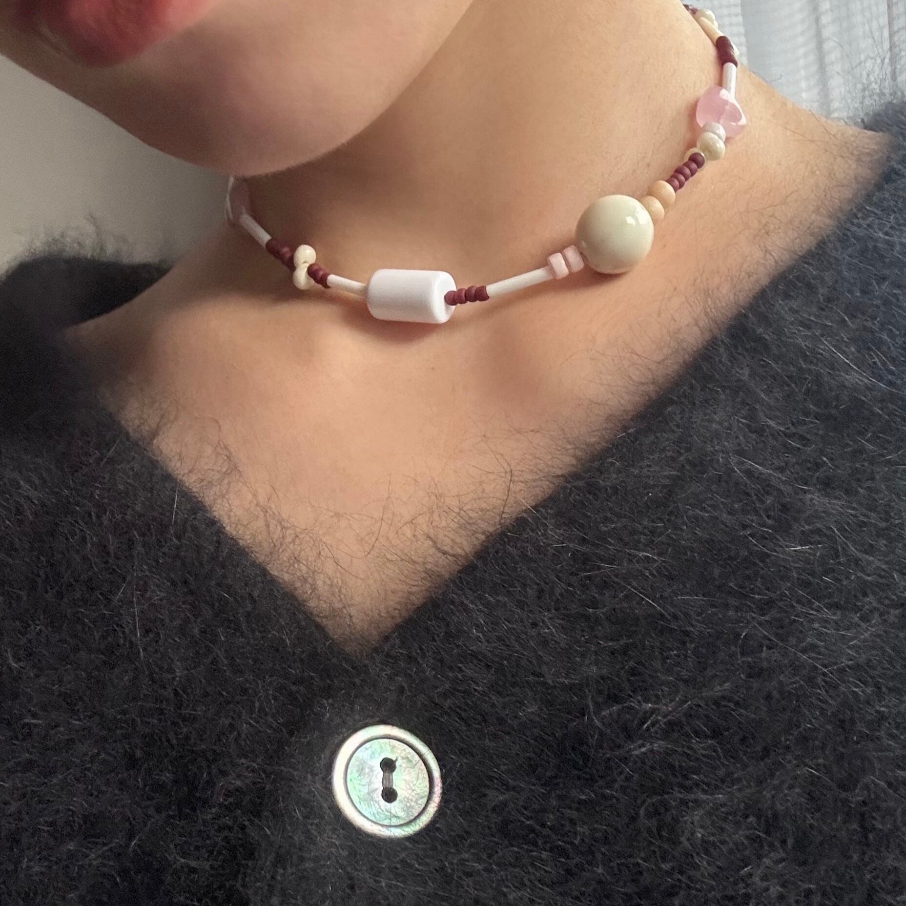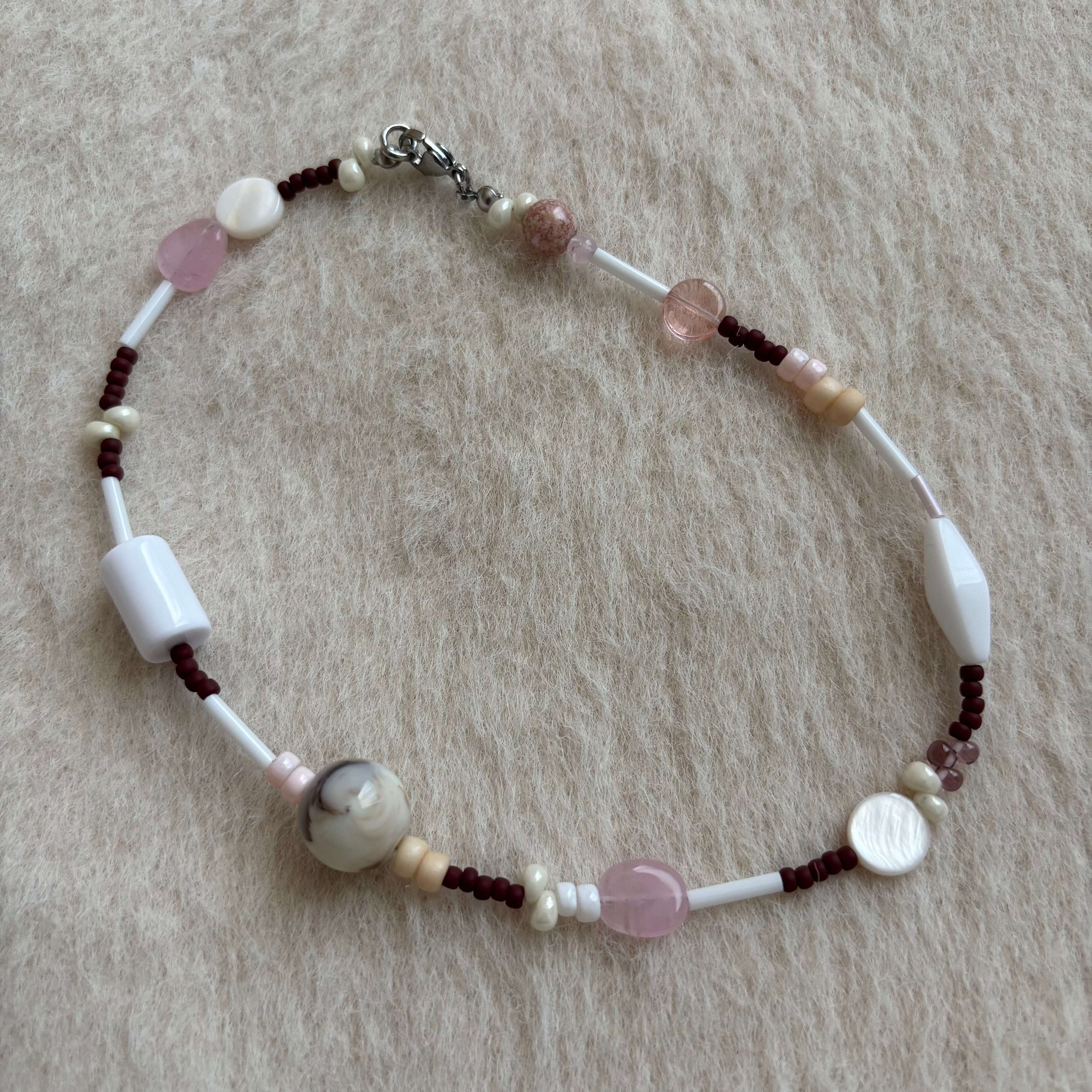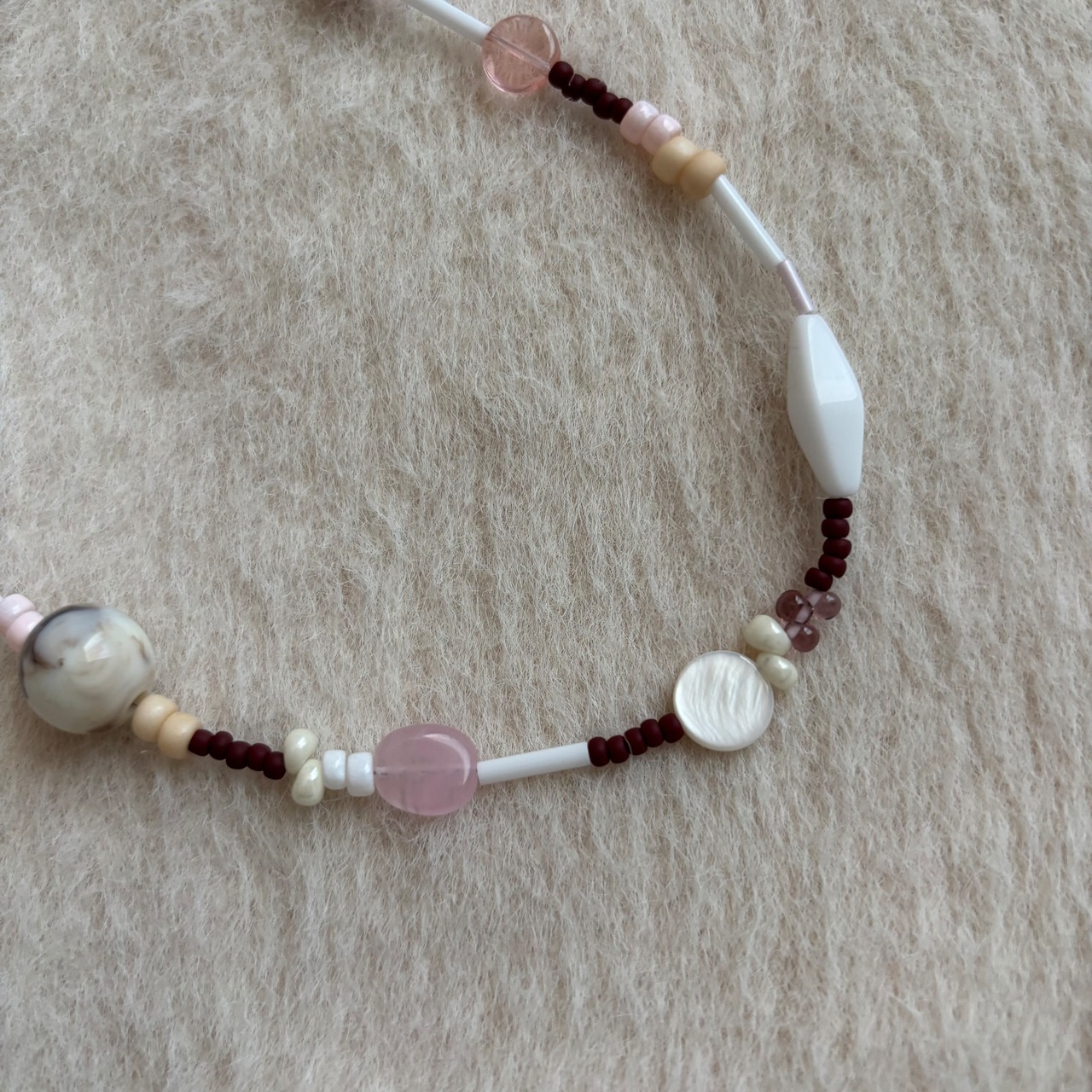 優しいピンクと、ミルクの白、チョコレートのような深い色を組み合わせた、甘くて静かな色合いのネックレスです。