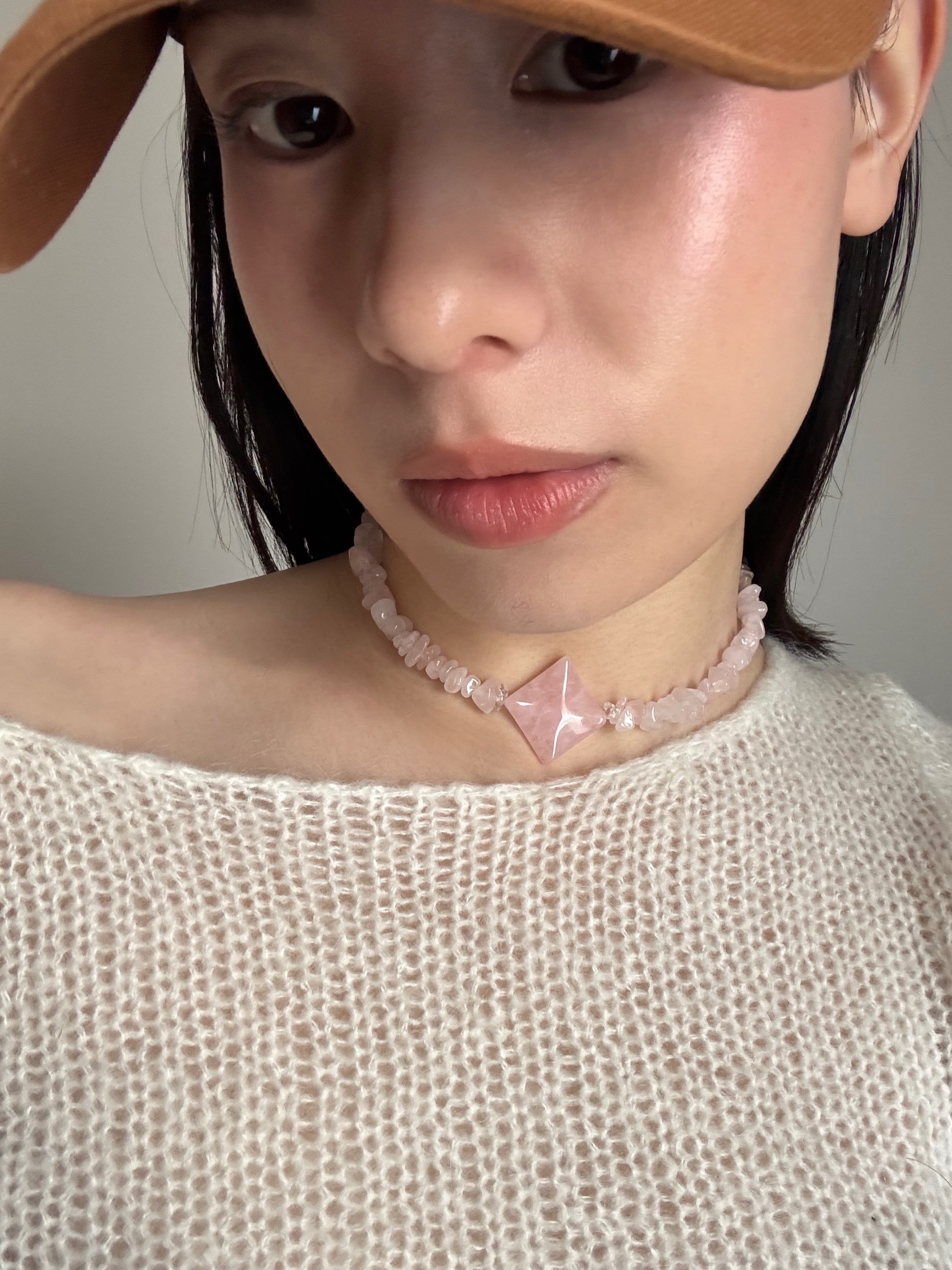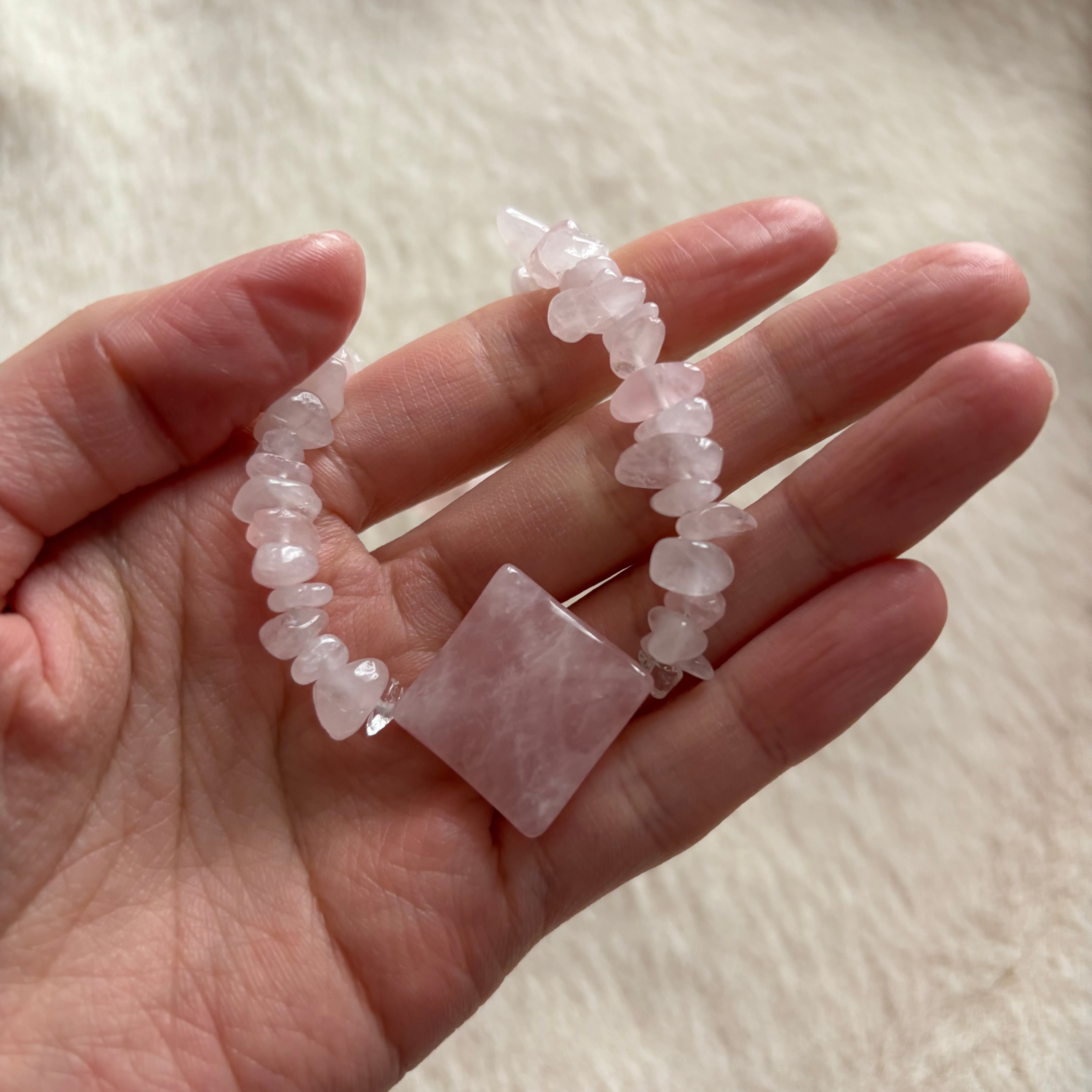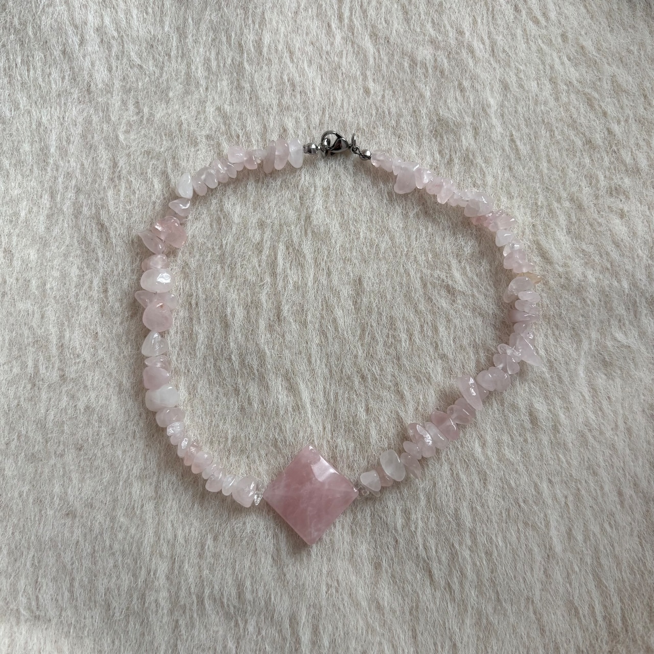 中央に存在感のあるスクエア型のローズクォーツ。その周りには小さなローズクォーツの石が散りばめられています。