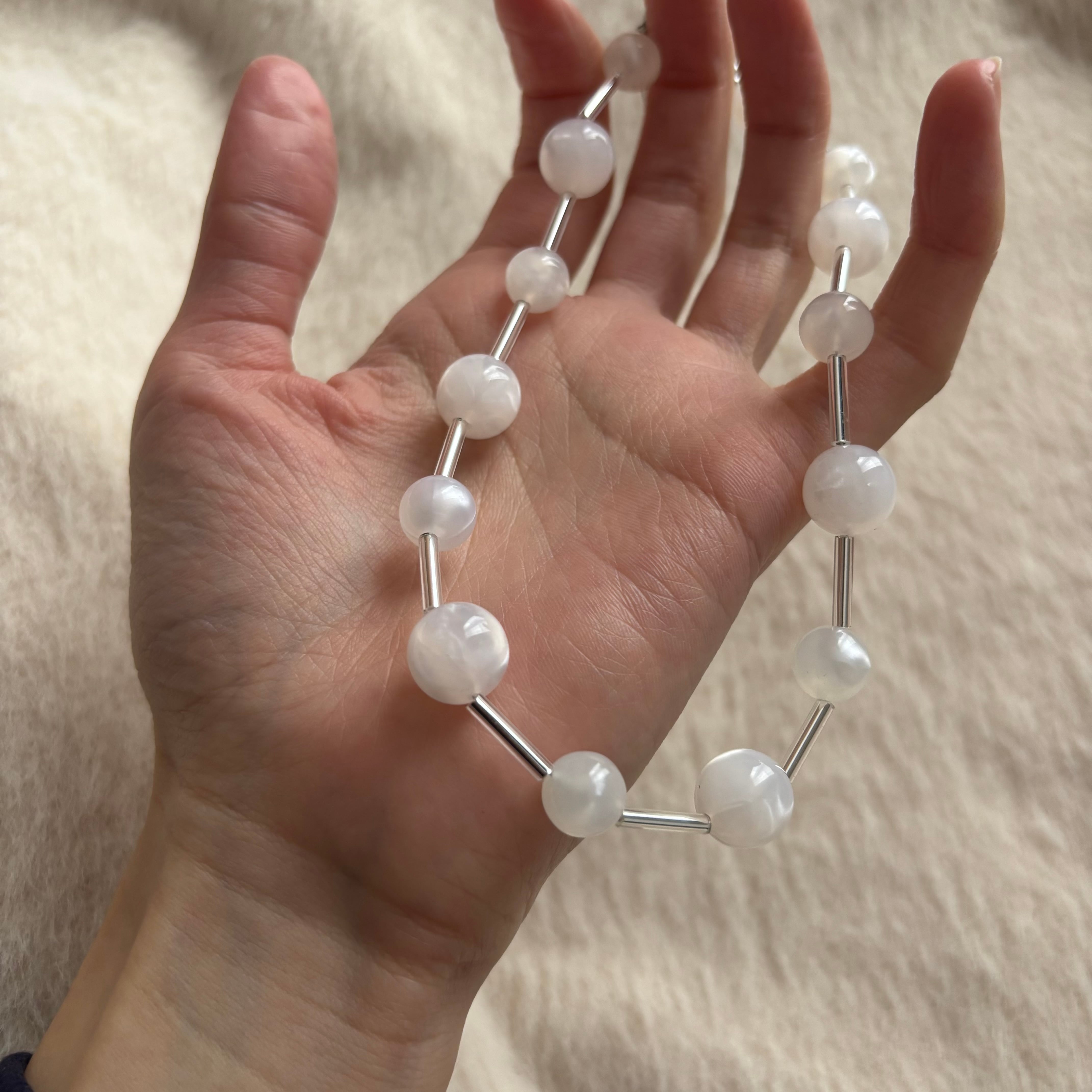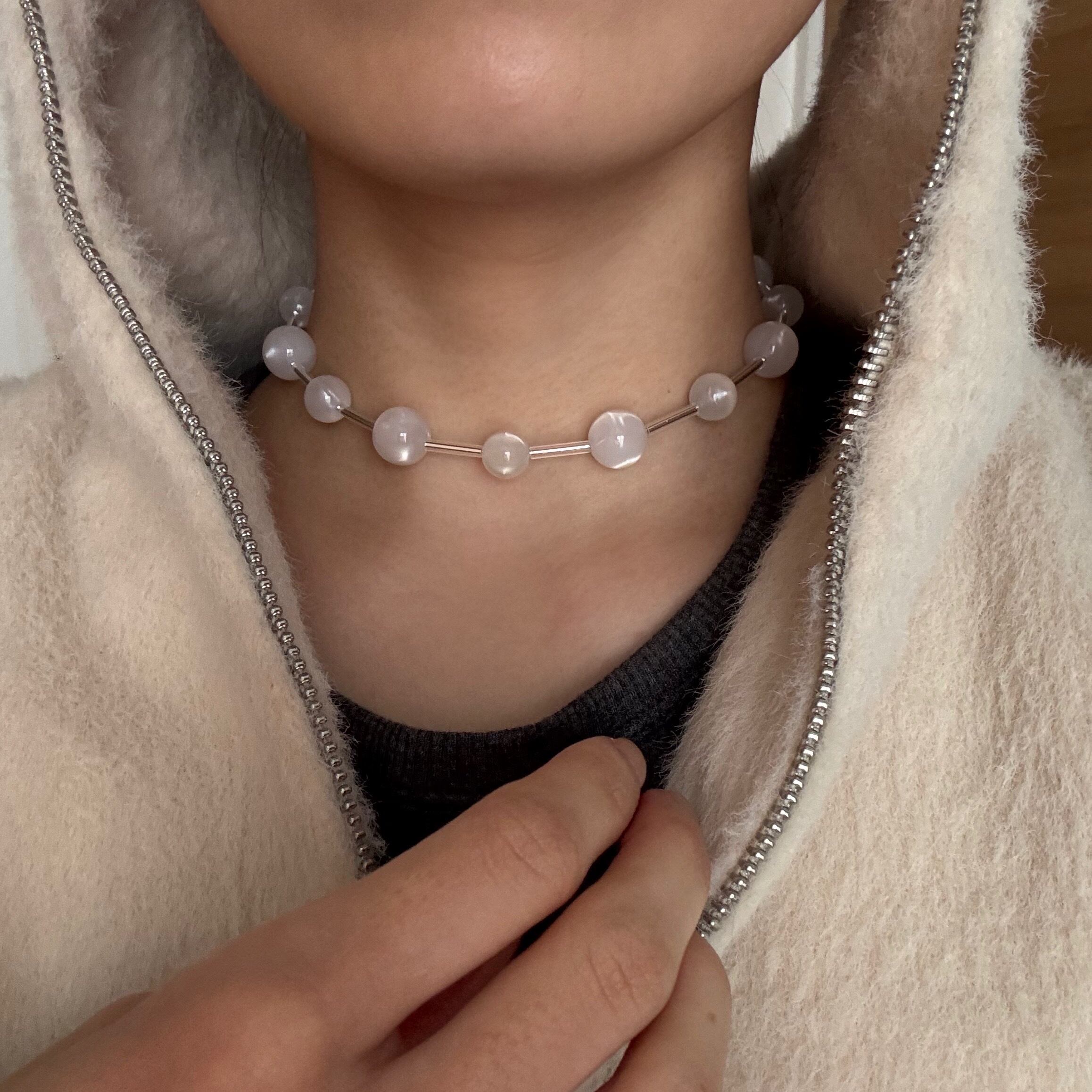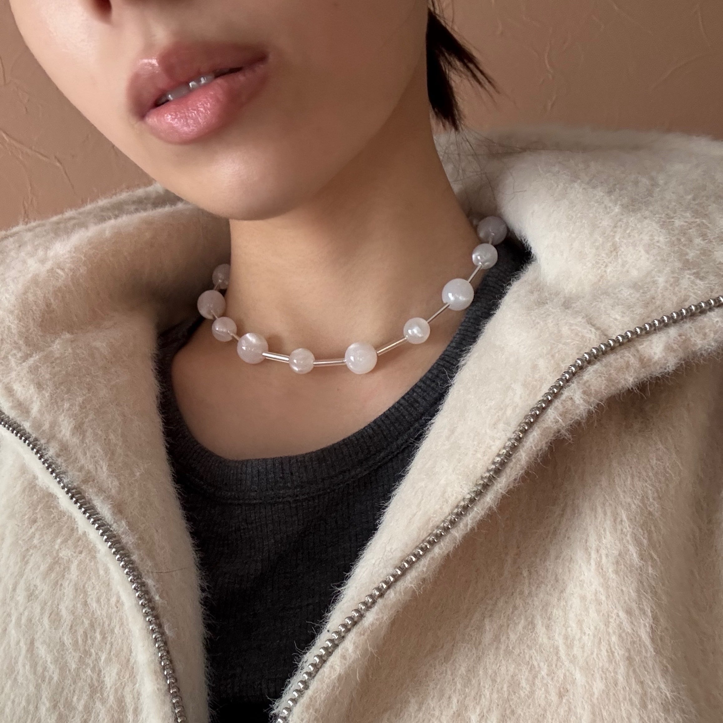 光を受けるたびにふんわりと煌めき、まるで月明かりの中を漂うかのようなネックレスです。シンプルながらも存在感のあるデザインで、日常から特別なシーンまで幅広くお使いいただけます。
