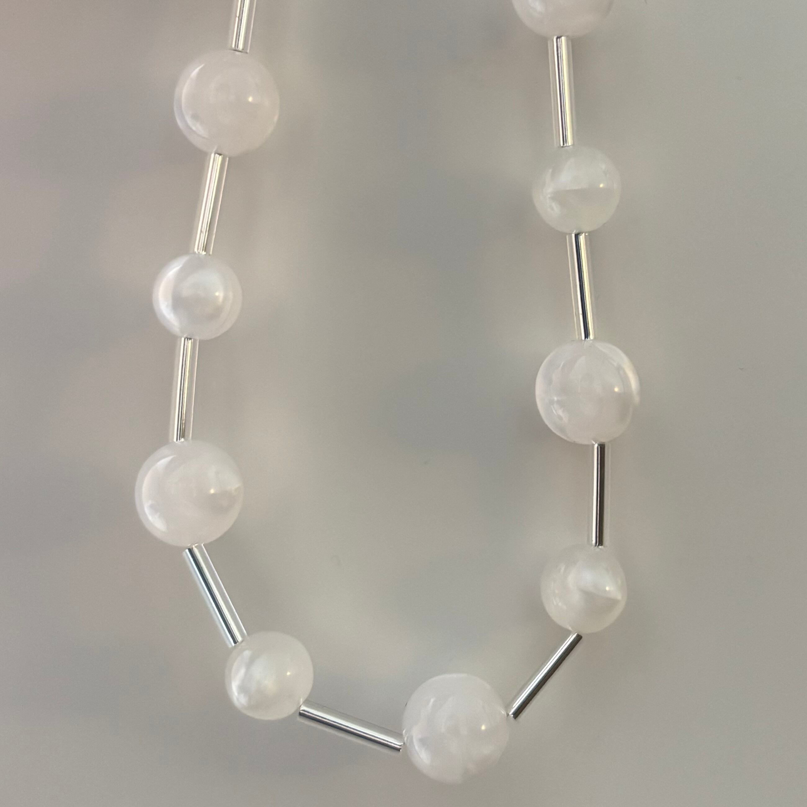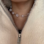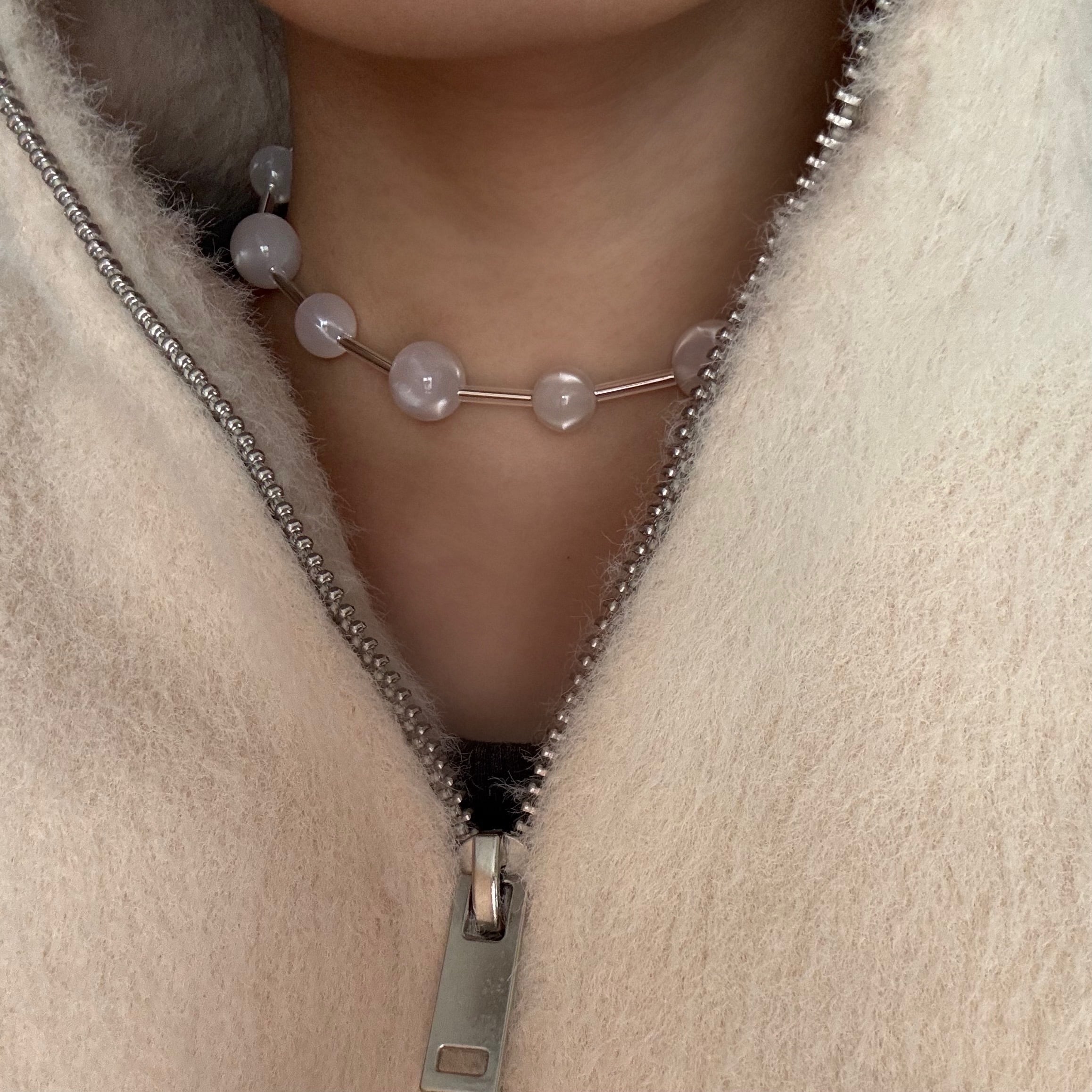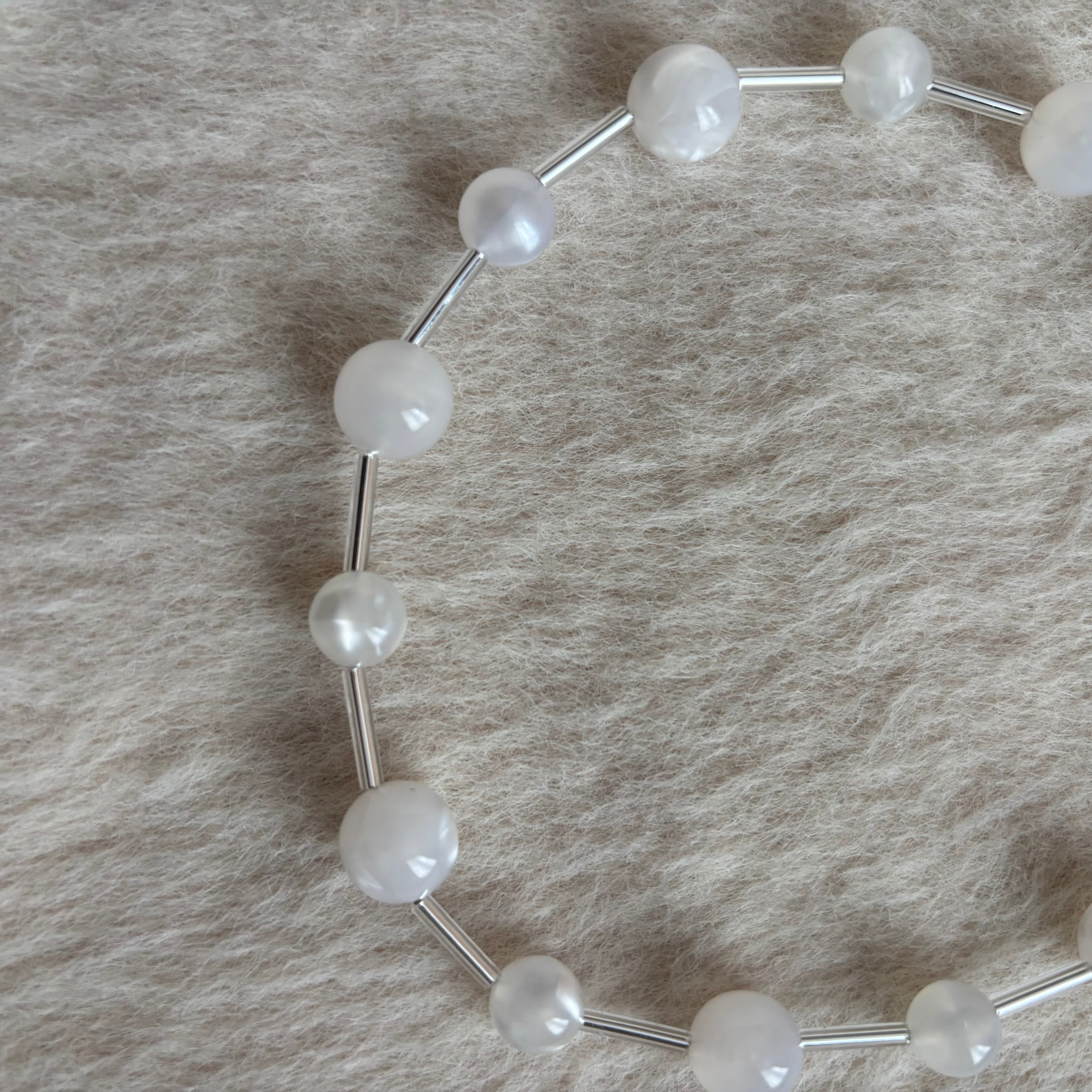 光を受けるたびにふんわりと煌めき、まるで月明かりの中を漂うかのようなネックレスです。シンプルながらも存在感のあるデザインで、日常から特別なシーンまで幅広くお使いいただけます。