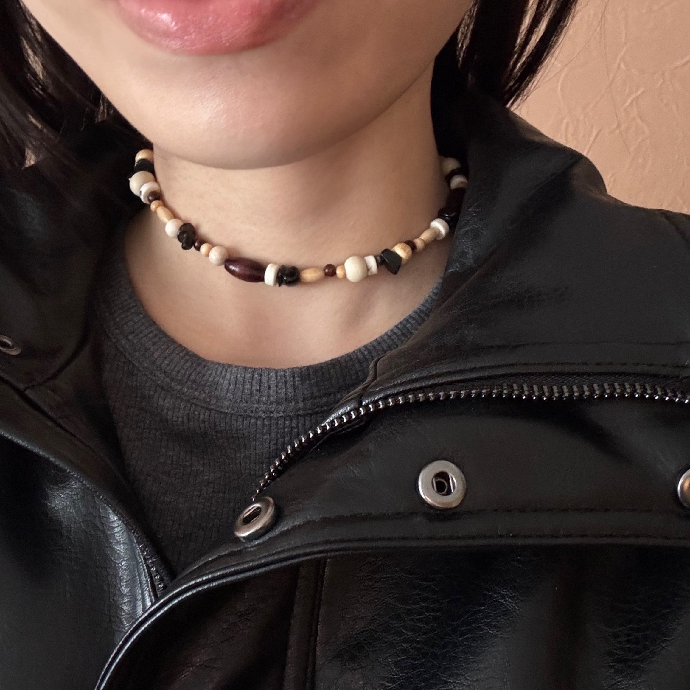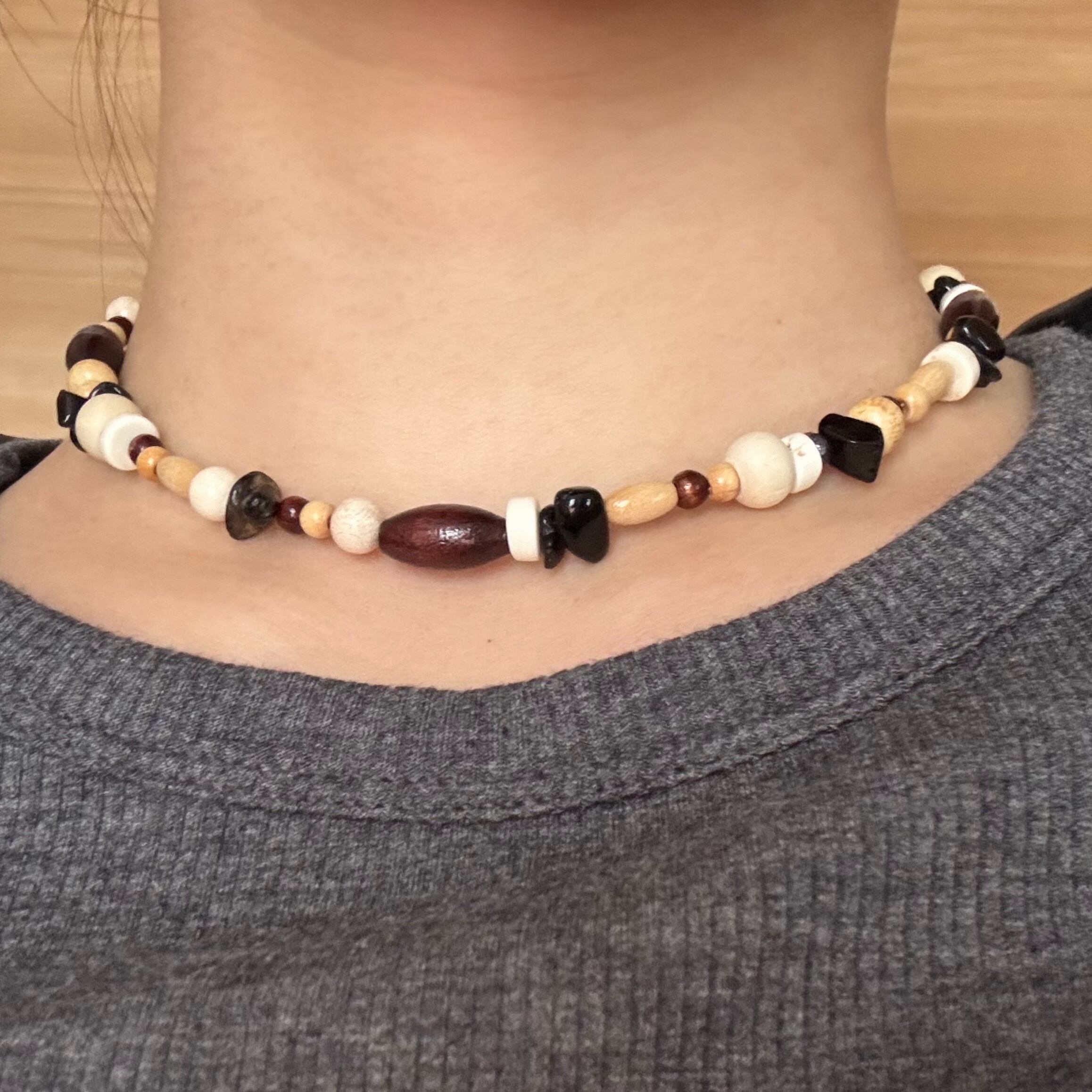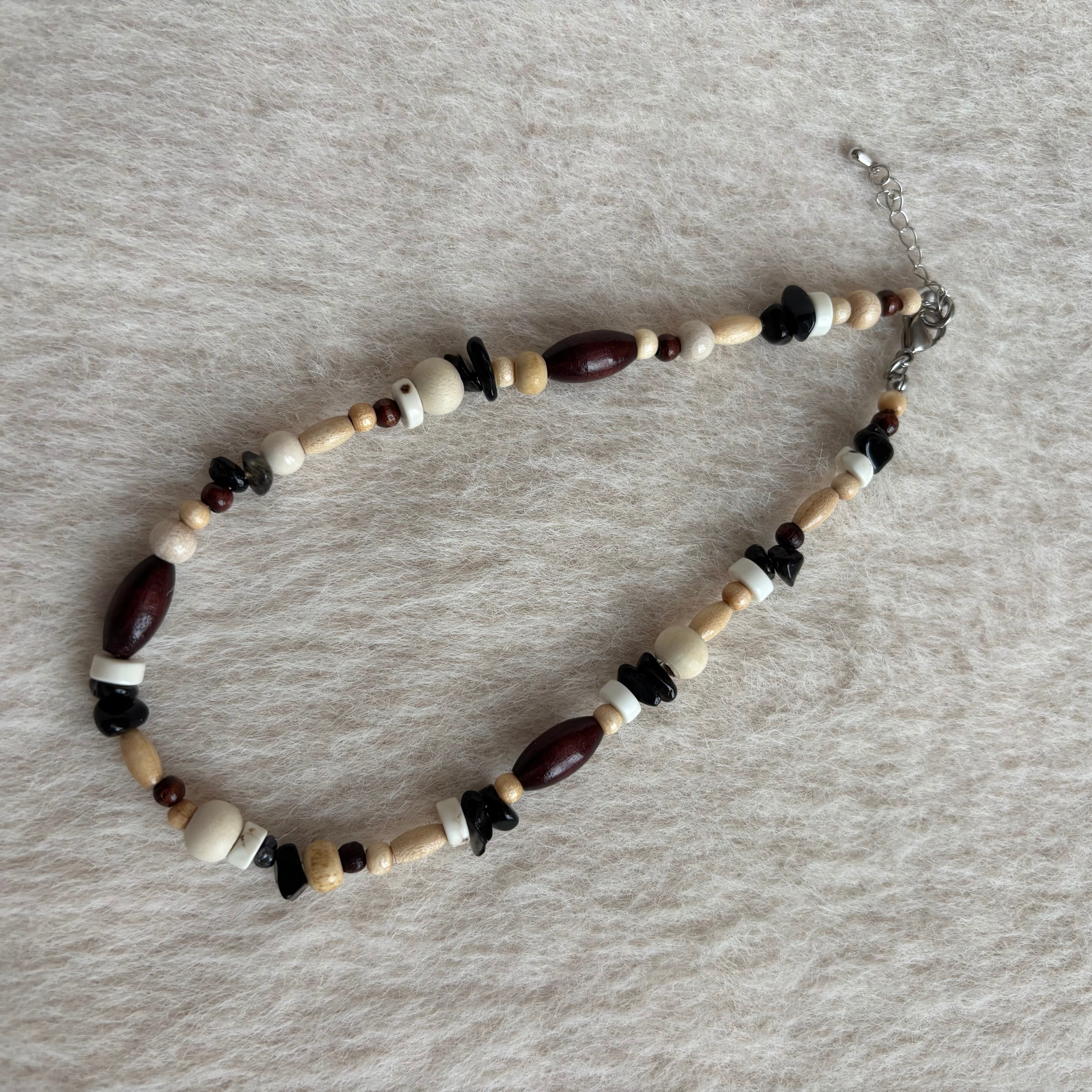 その間に、素朴なウッドビーズがそっと散りばめられています。