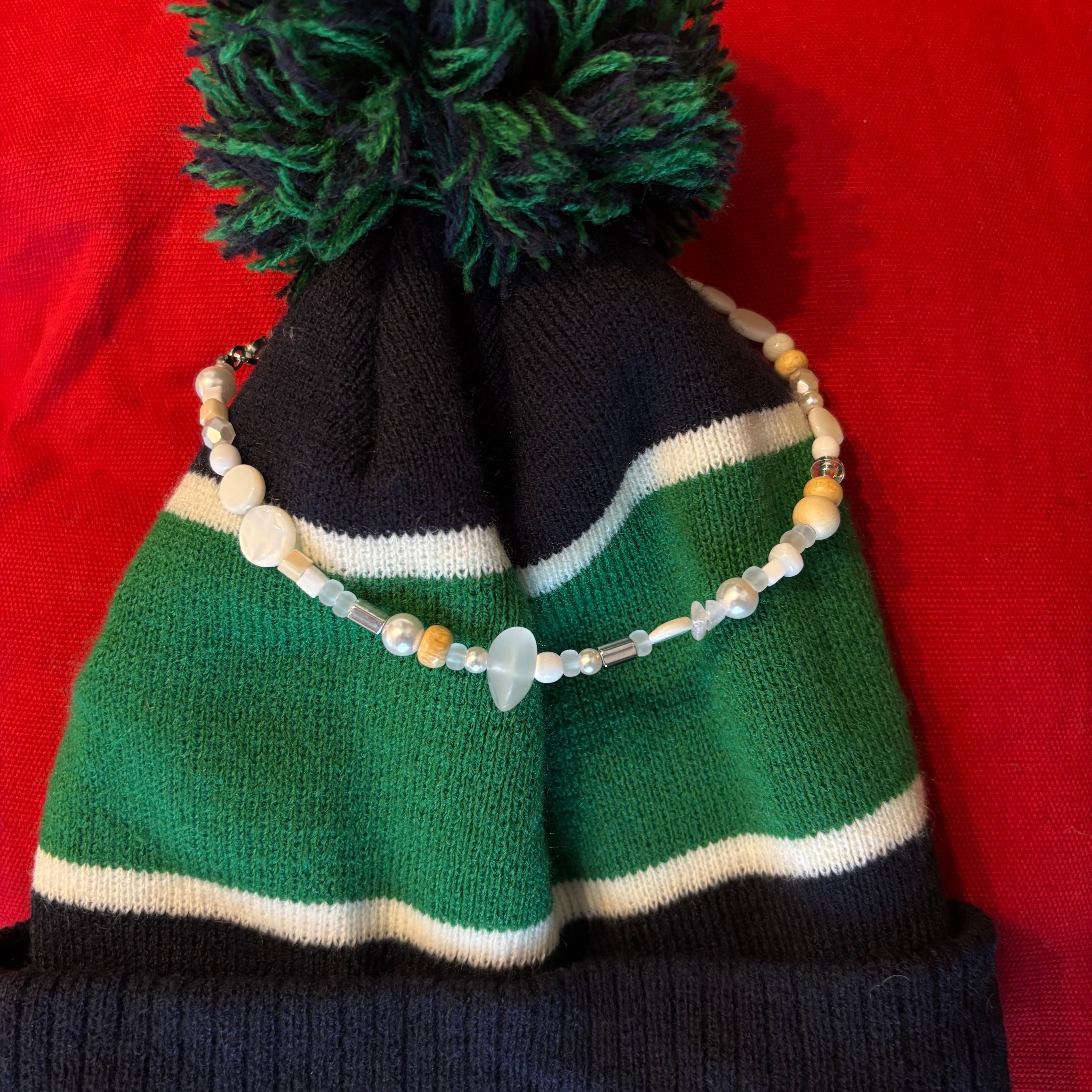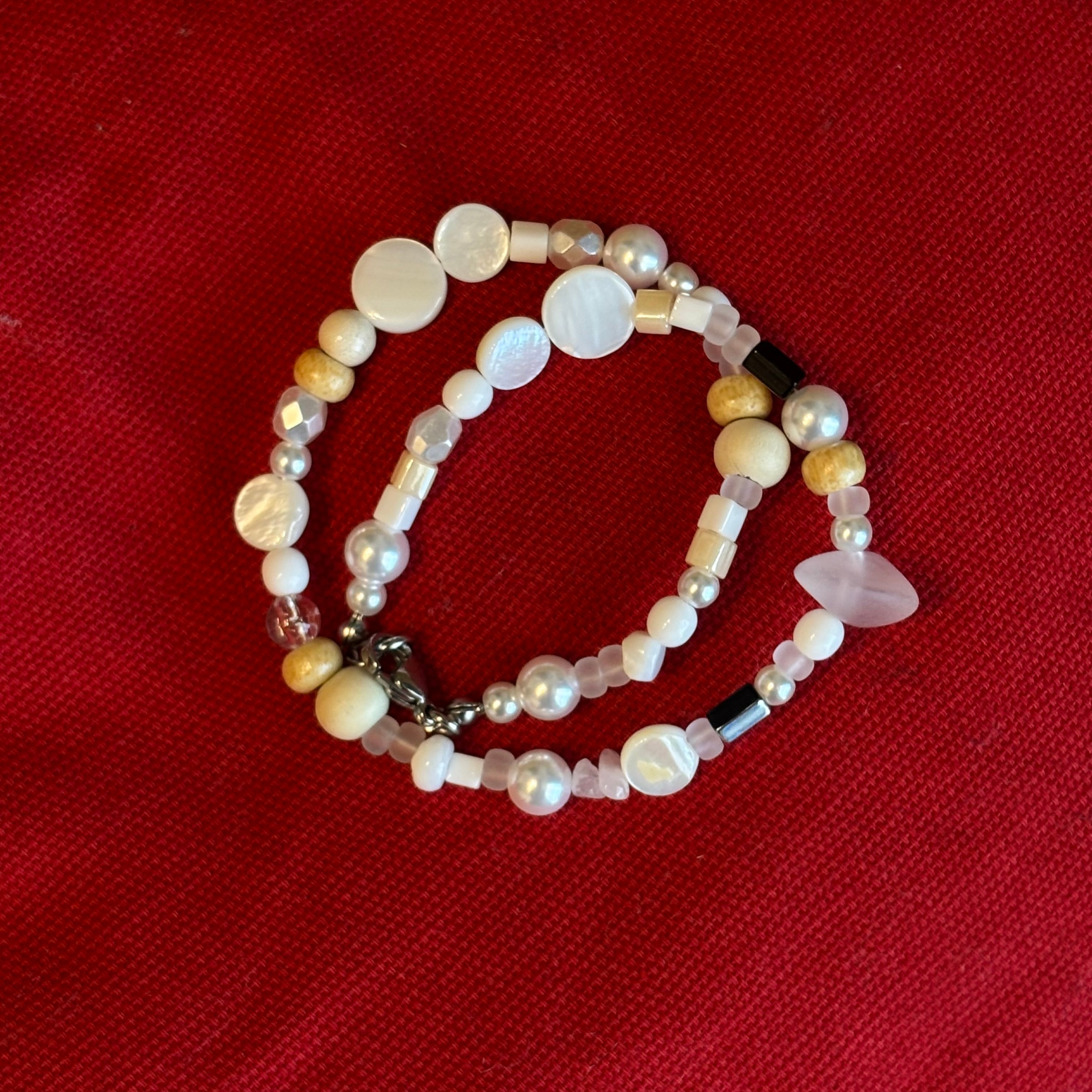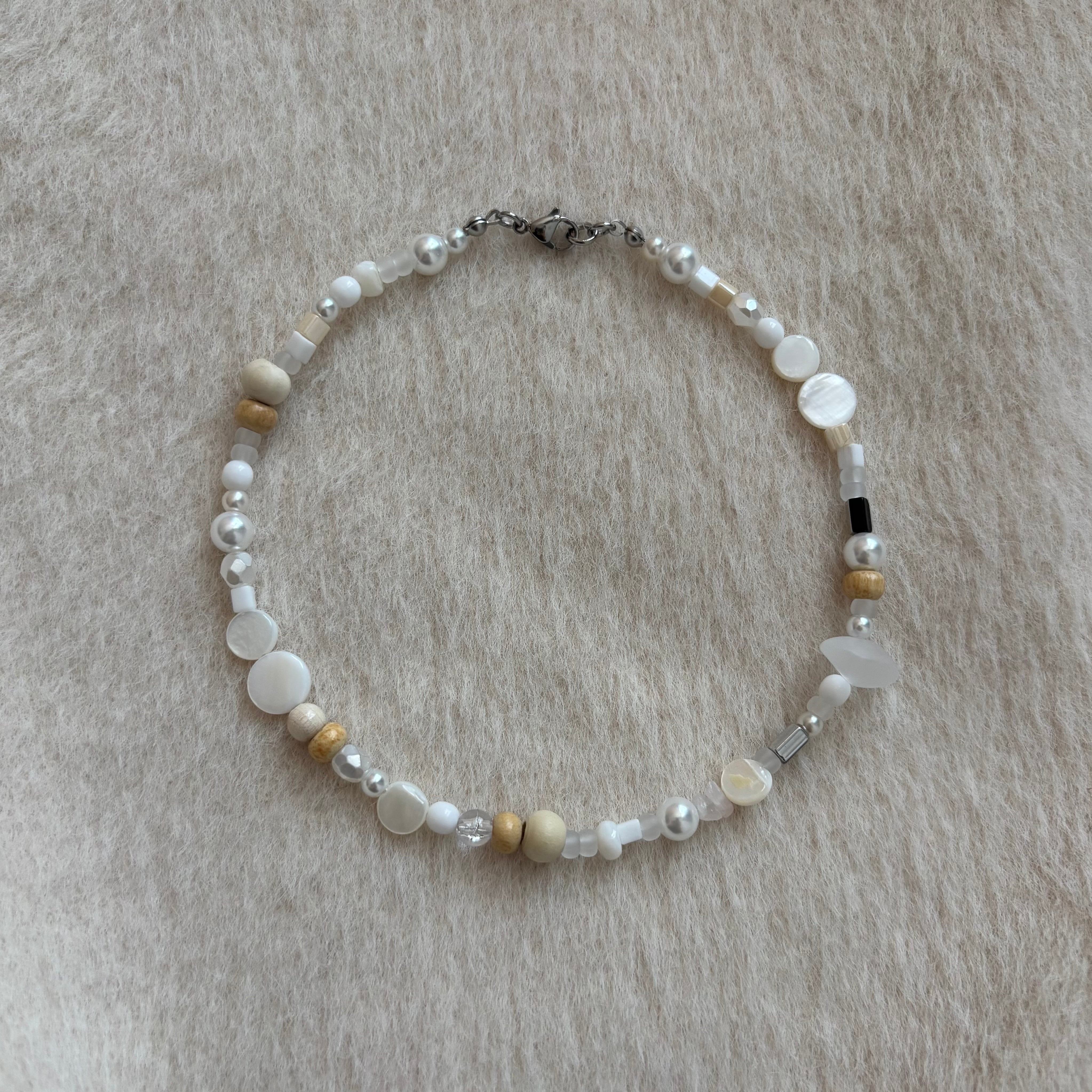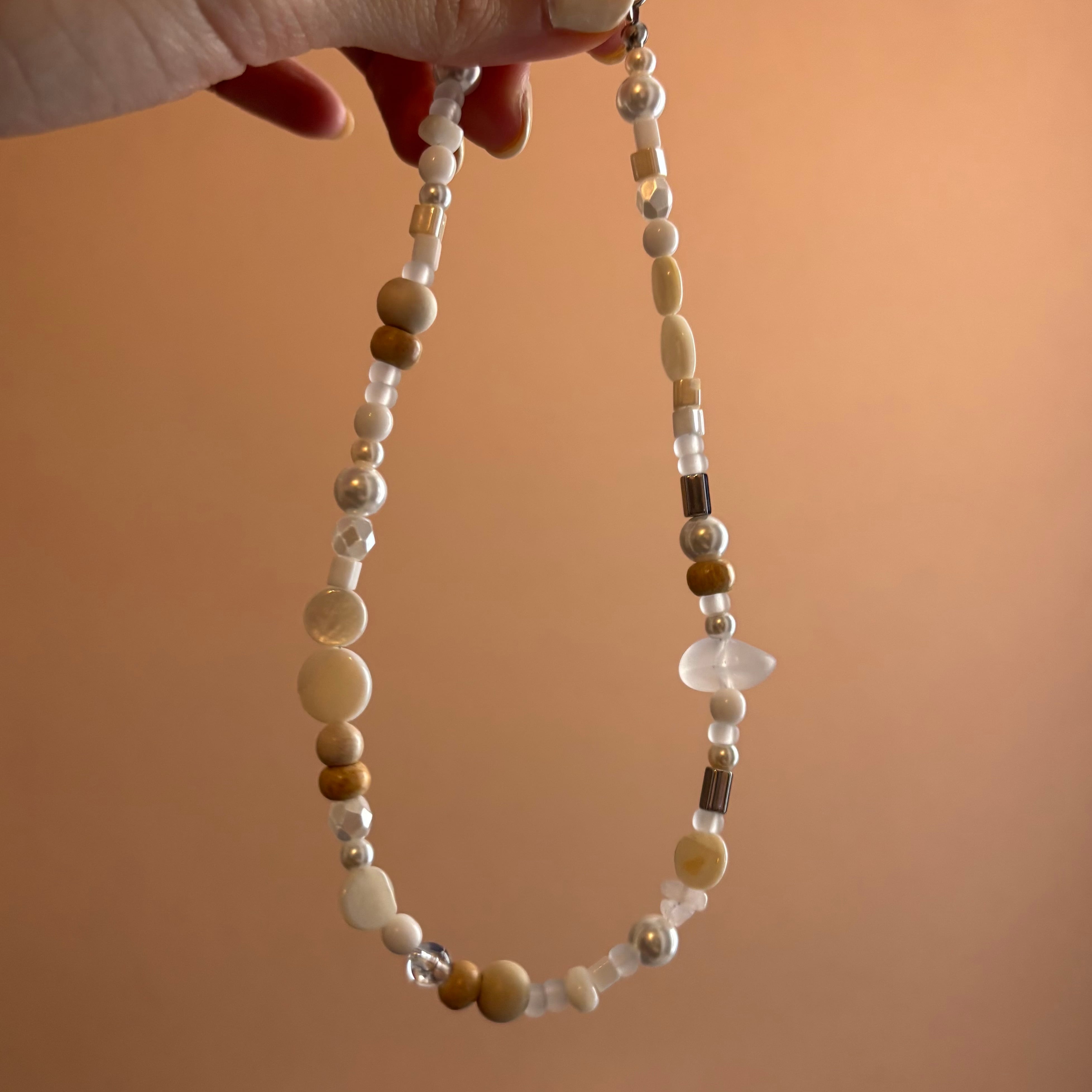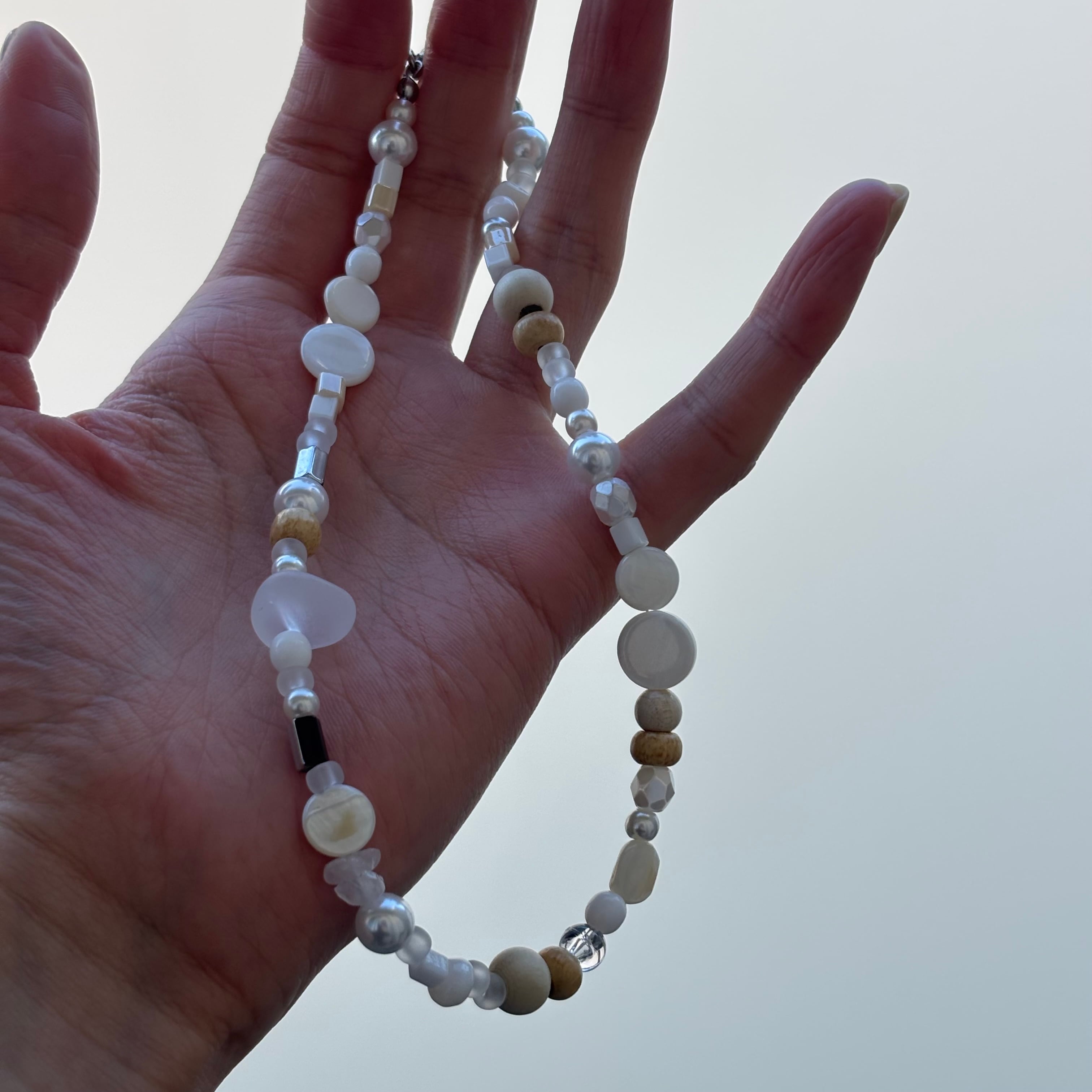 白やクリーム、淡いベージュ、シルバーなど控えめな色味が連なり、小石のような印象を与えます。粒の形も、丸みのあるウッド、艶やかなパール、少し角のあるメタルビーズなどが混ざり合い、リズムを生みながらも全体は静かにまとまっていて、一粒一粒が丁寧に選ばれているような配置で、クラフト感がありながら洗練された雰囲気。