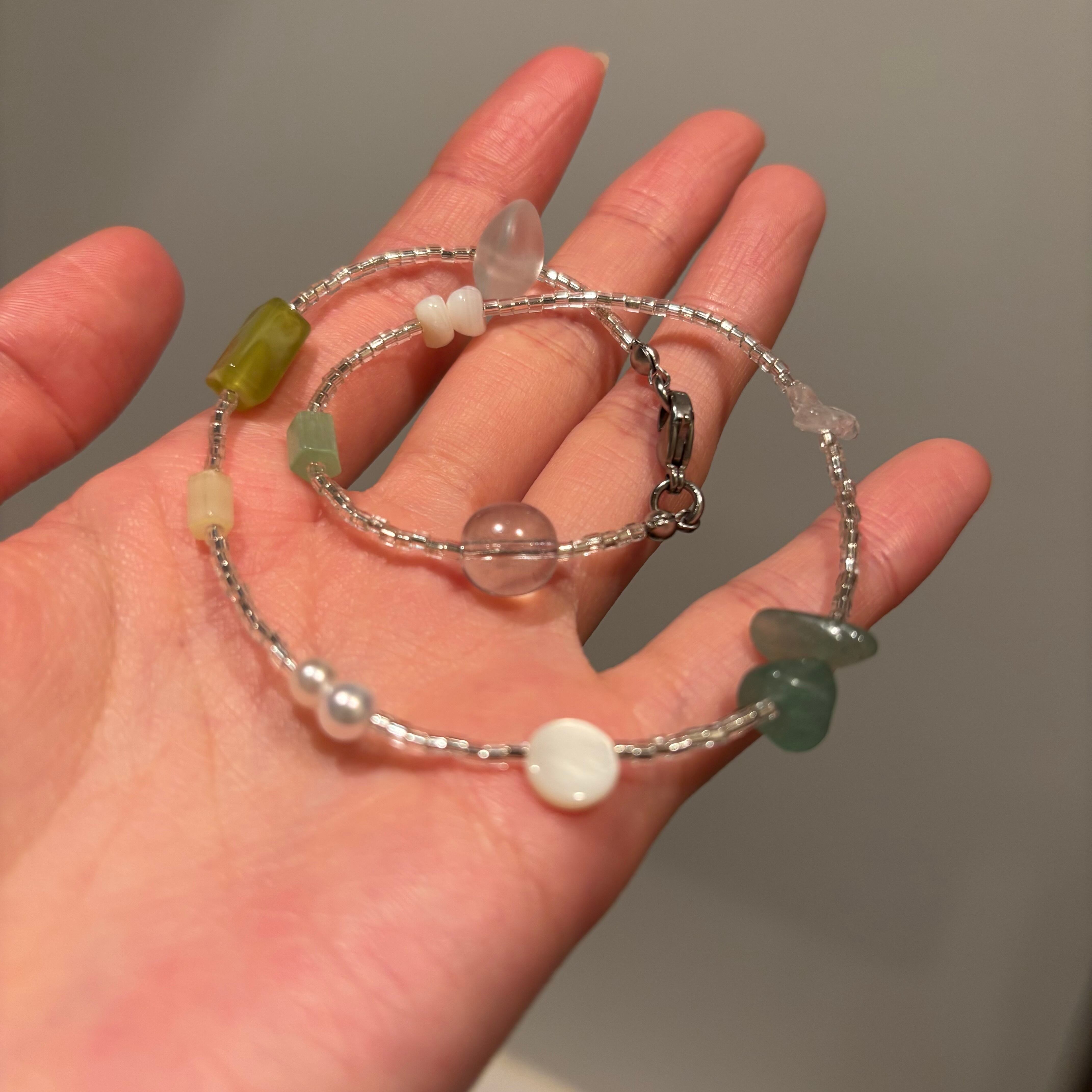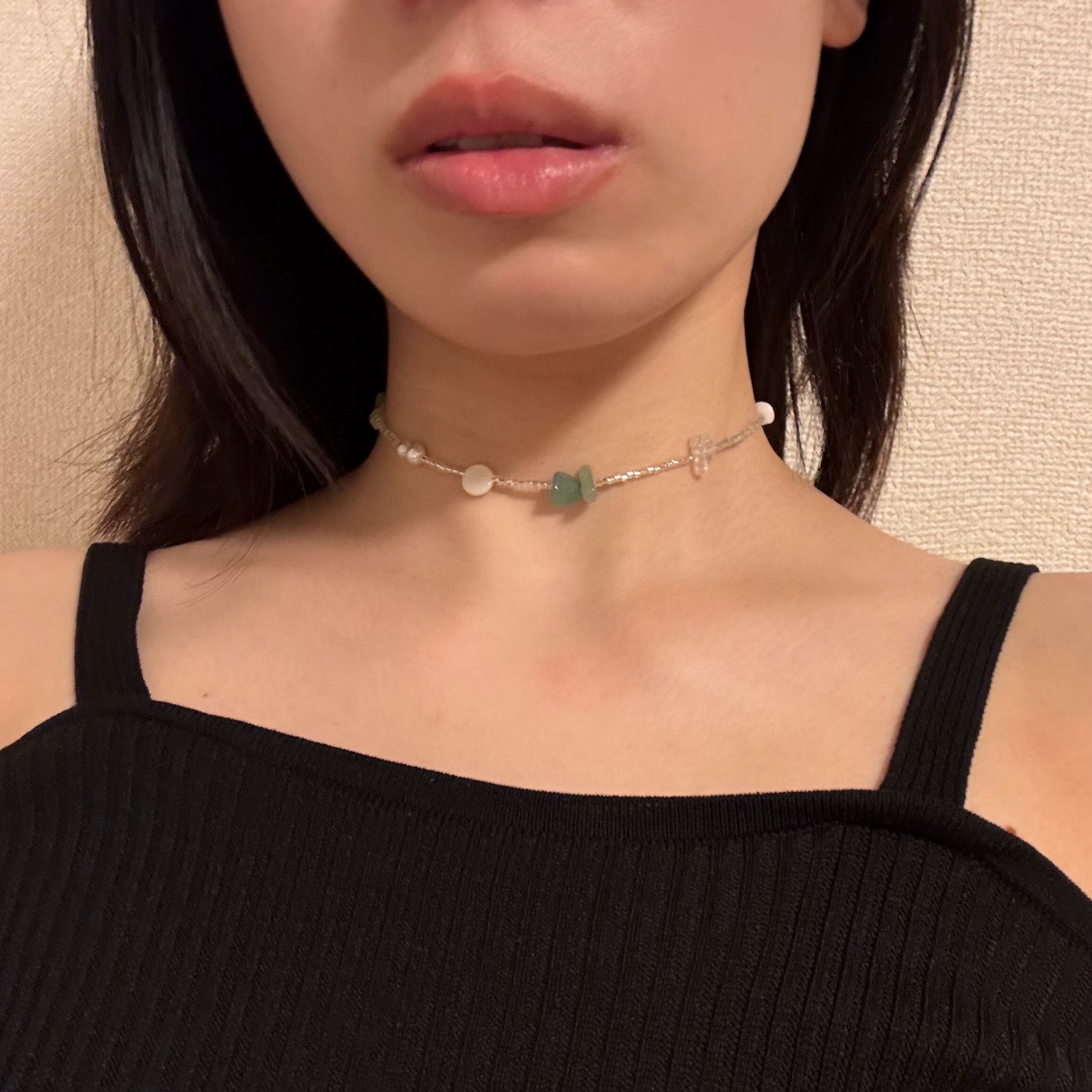 シルバーカラーのロングビーズの光が下地になり、淡いグリーンと乳白の粒たち。