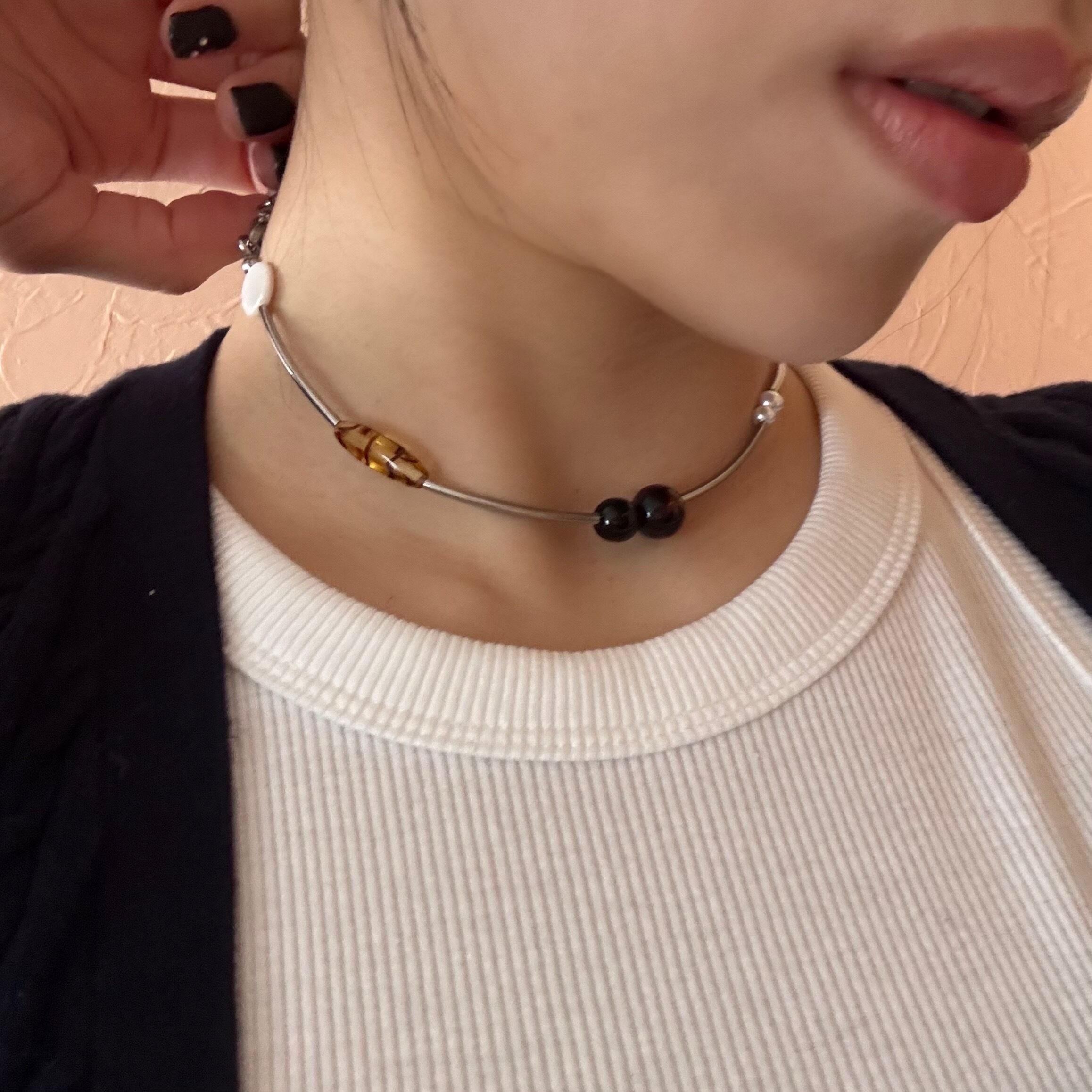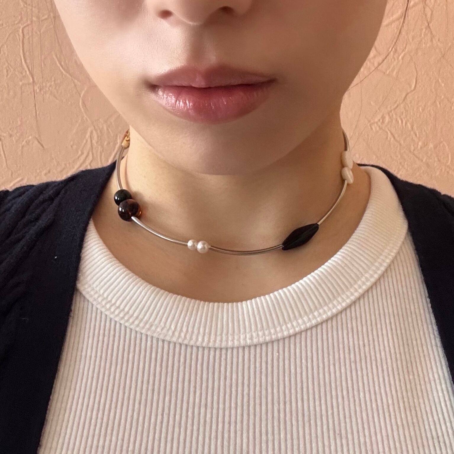 やわらかなカーブを描くラインに、個性あるビーズが静かに並んだネックレスです。