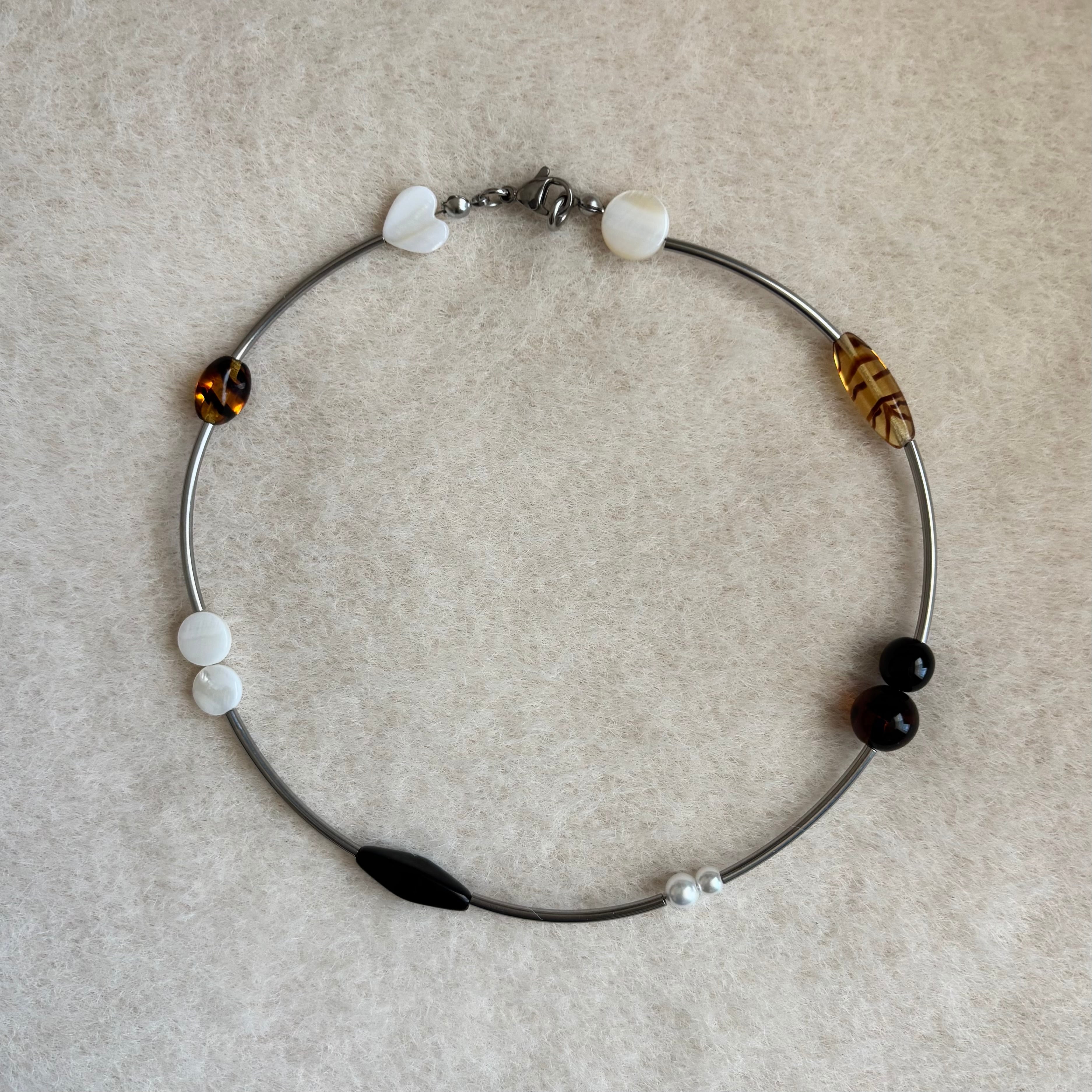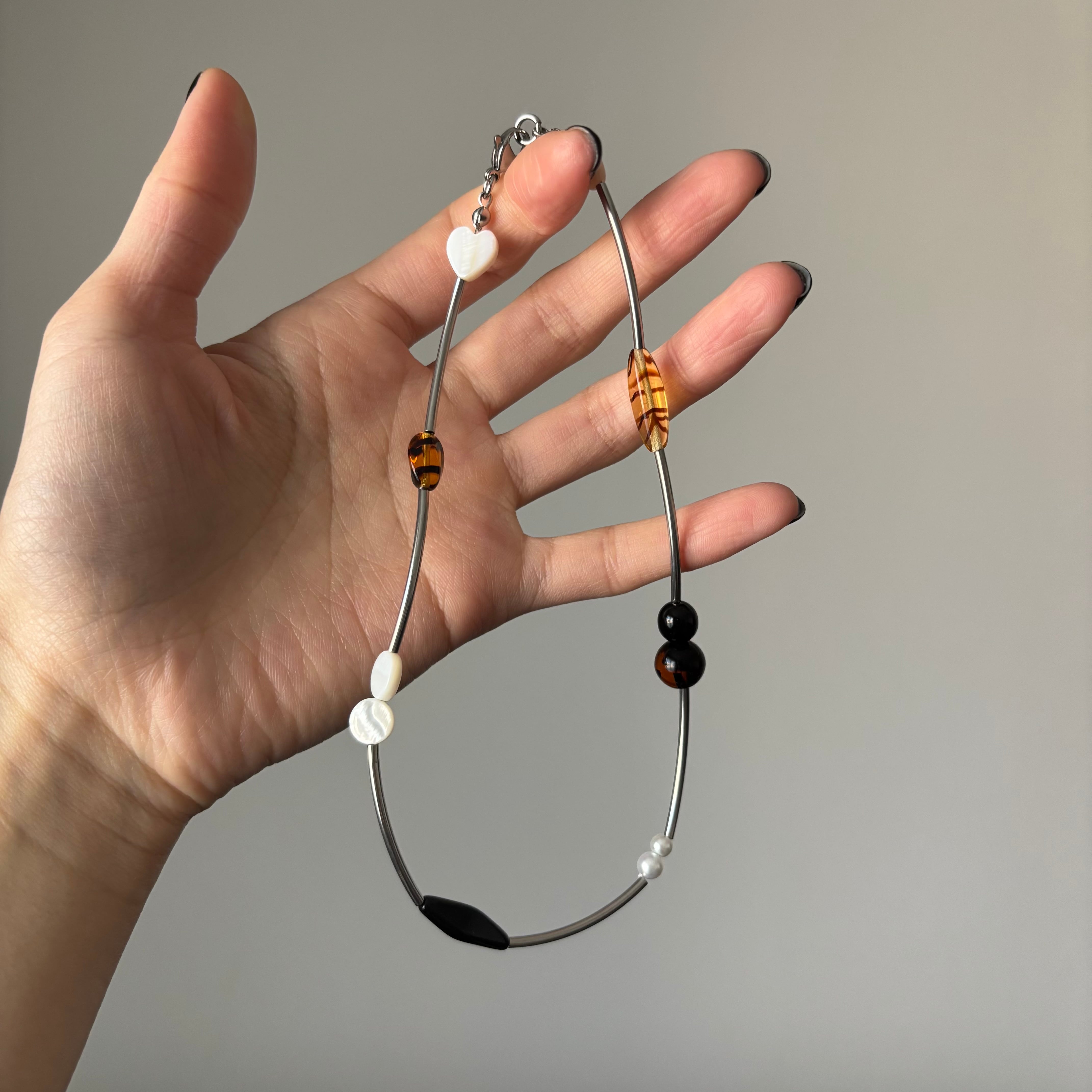 豹柄のような模様のビーズがさりげなく存在感を放ち、全体に穏やかな動きを添えています。