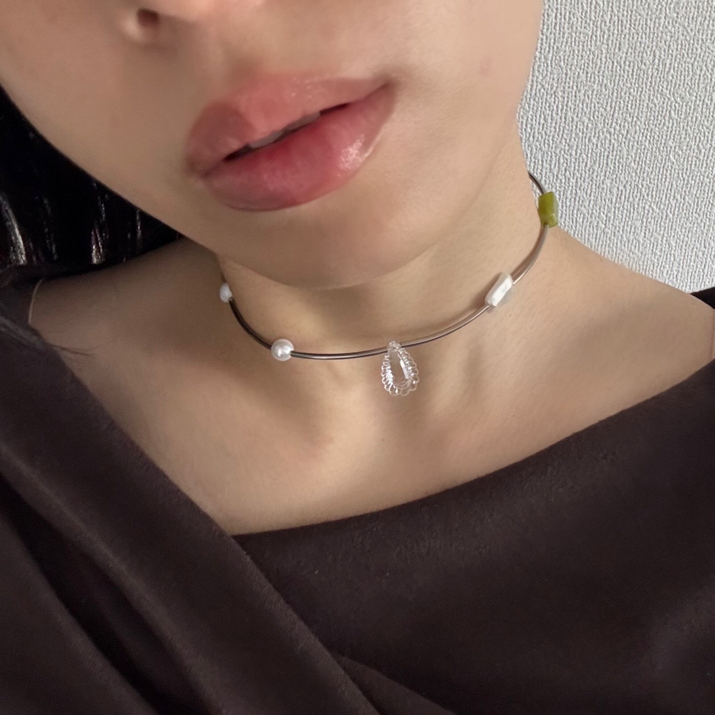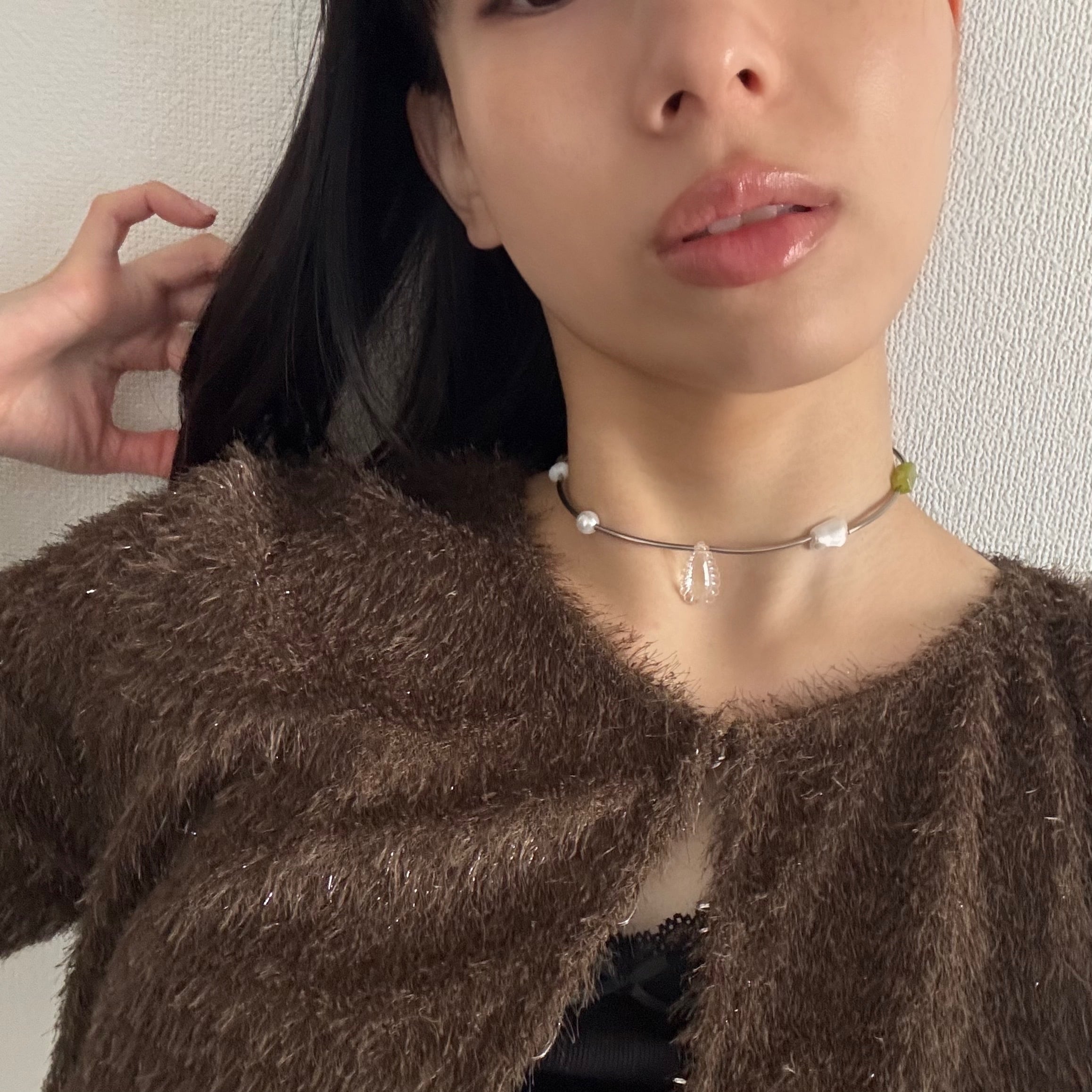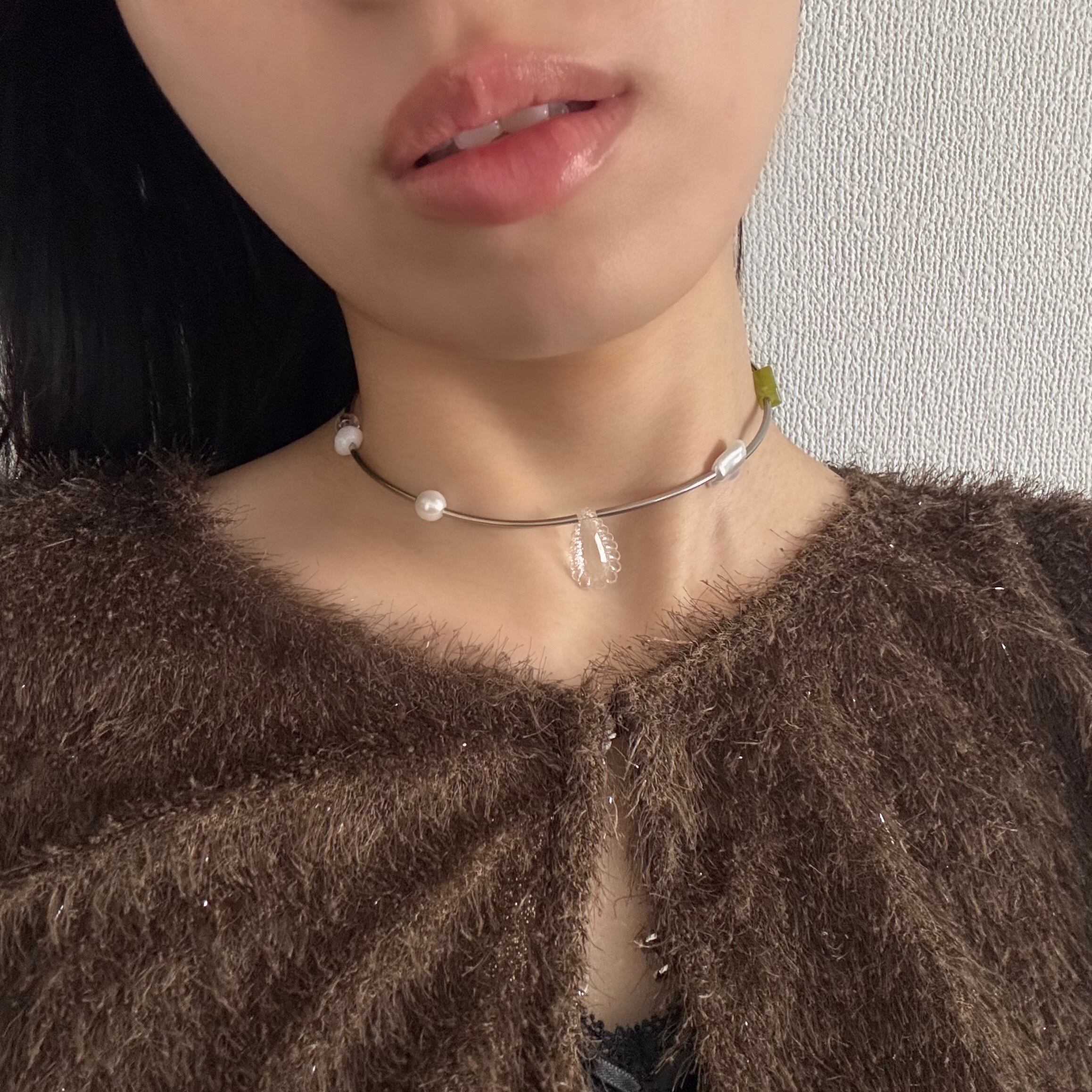 このネックレスは首に沿うタイプです。