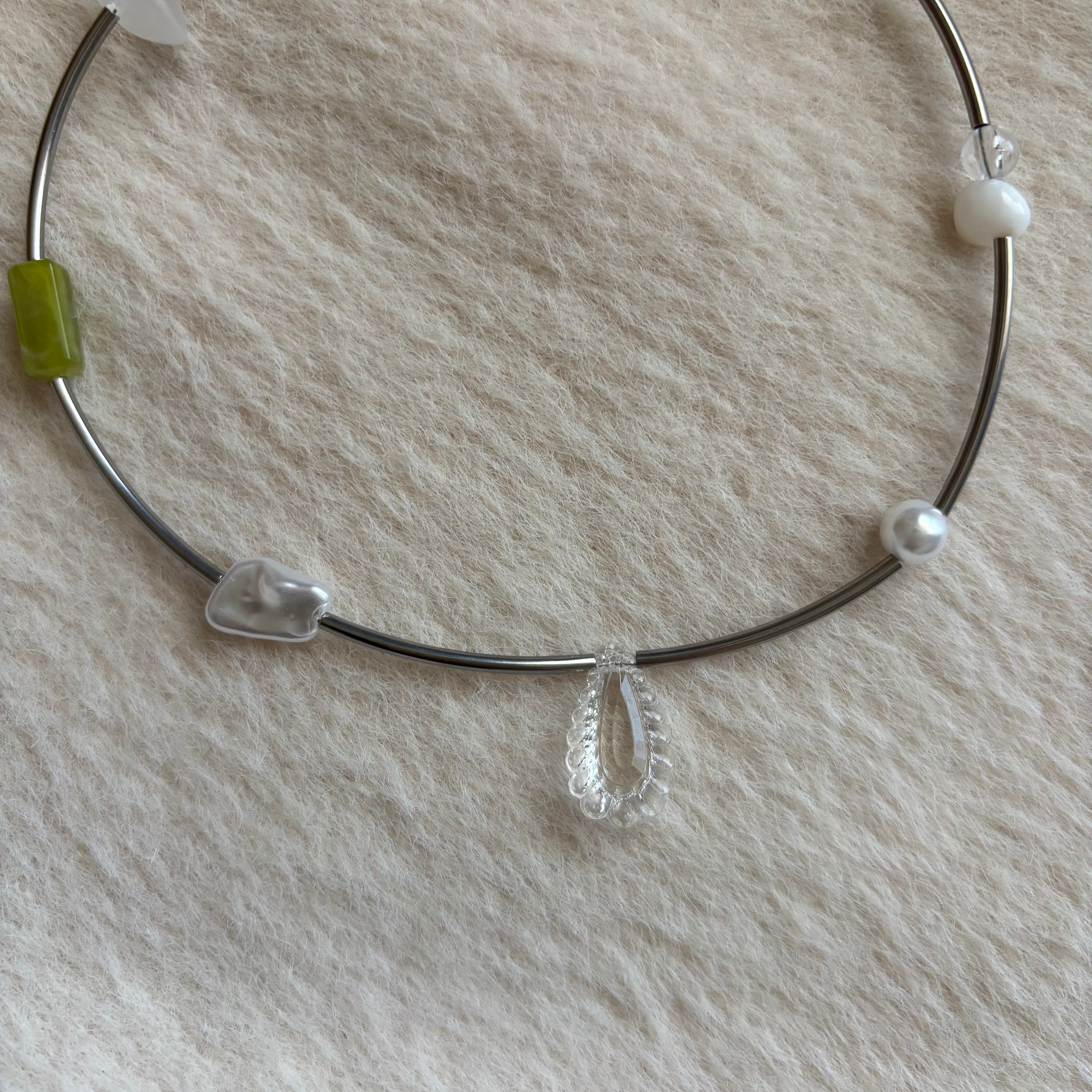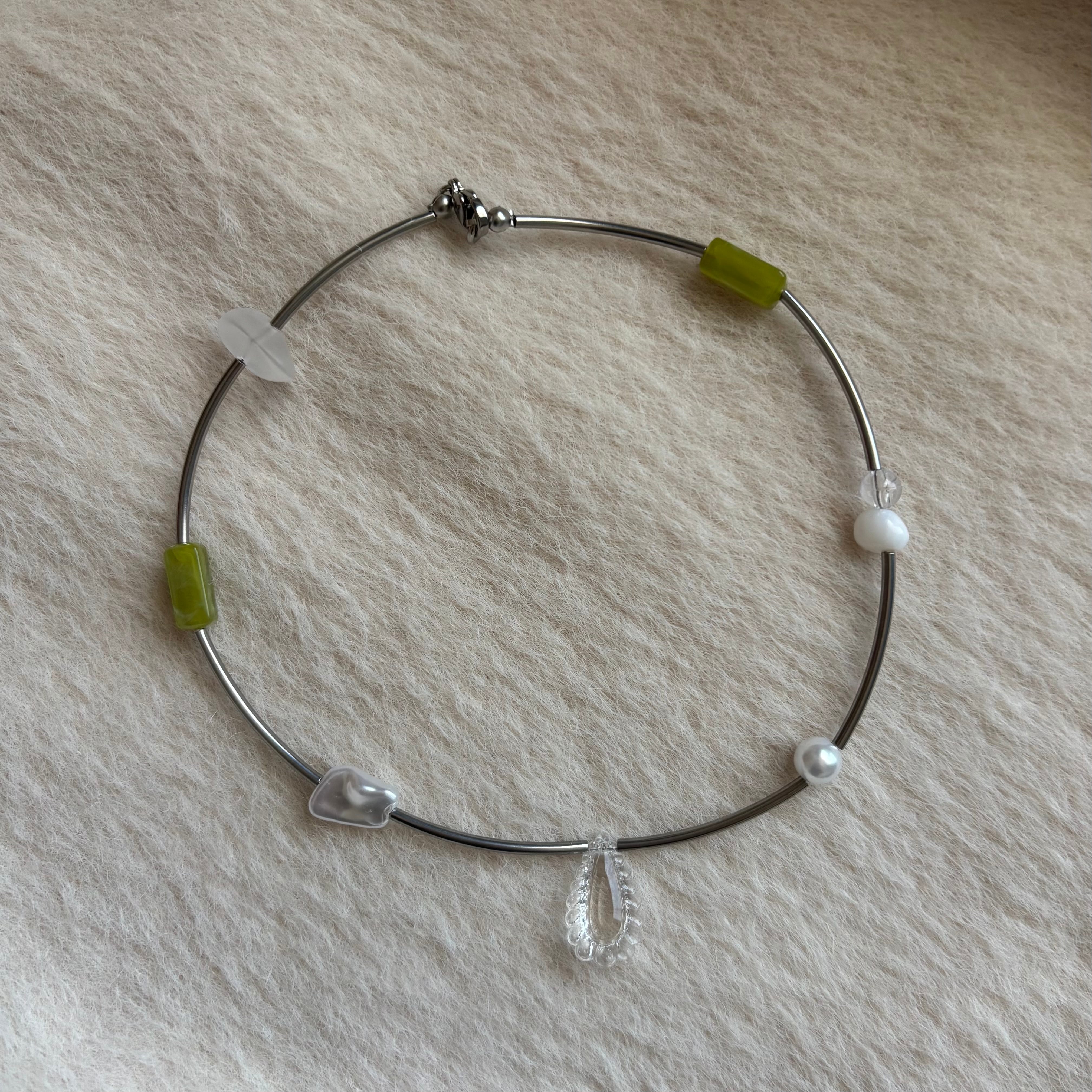 細いシルバーカラーのロングビーズに沿って緑の円柱ビーズが並び、白や半透明の粒が間に置かれている。