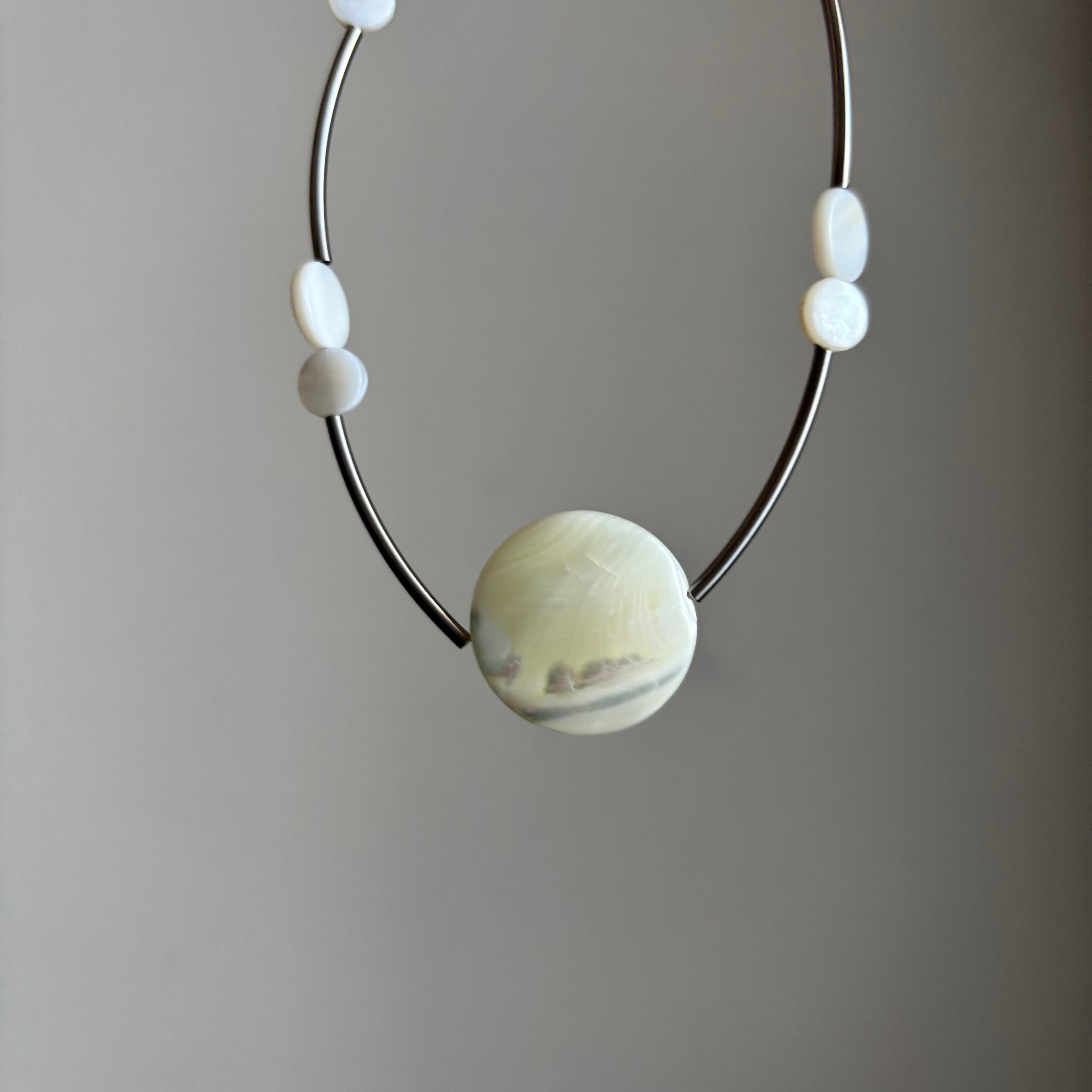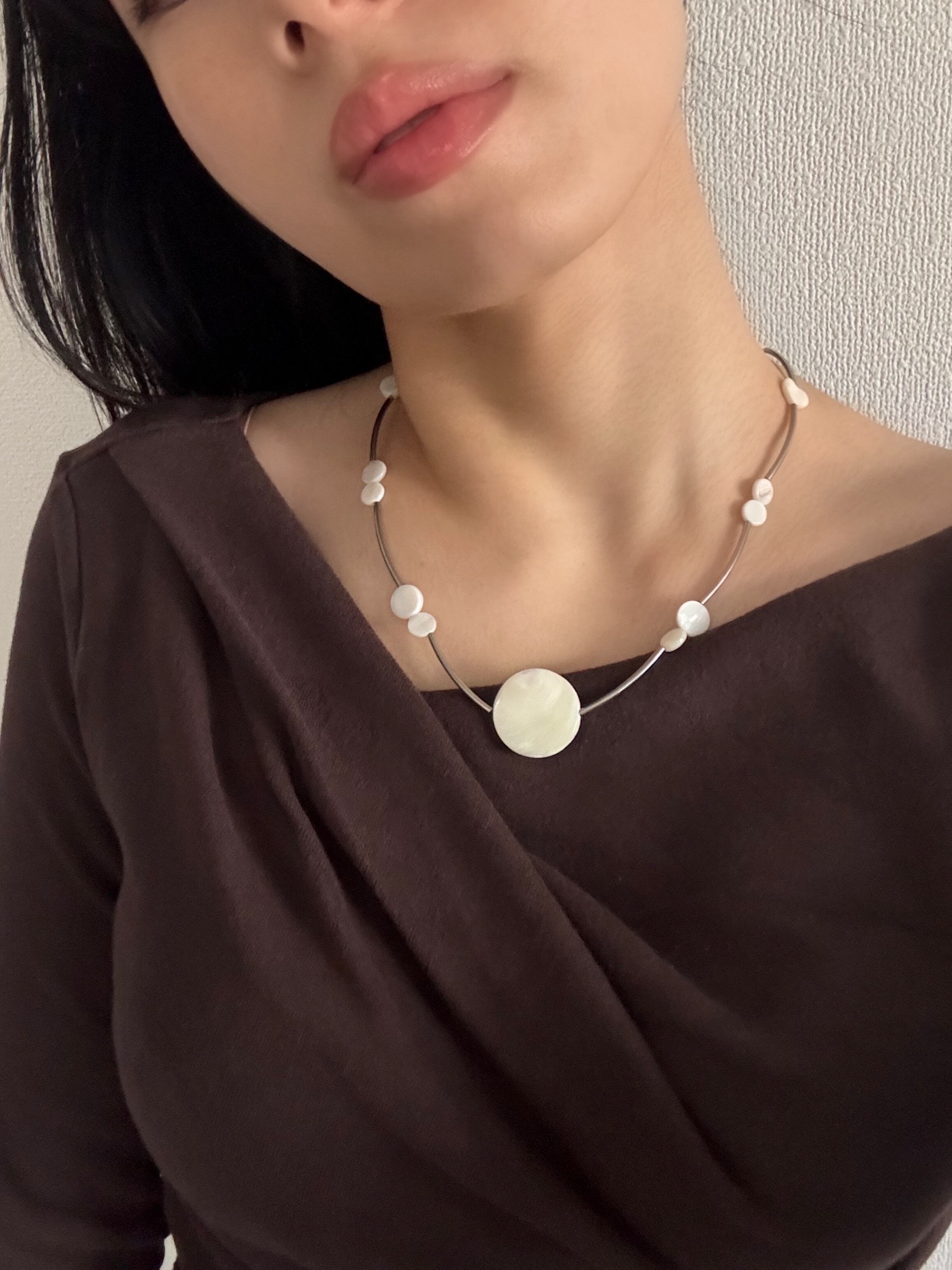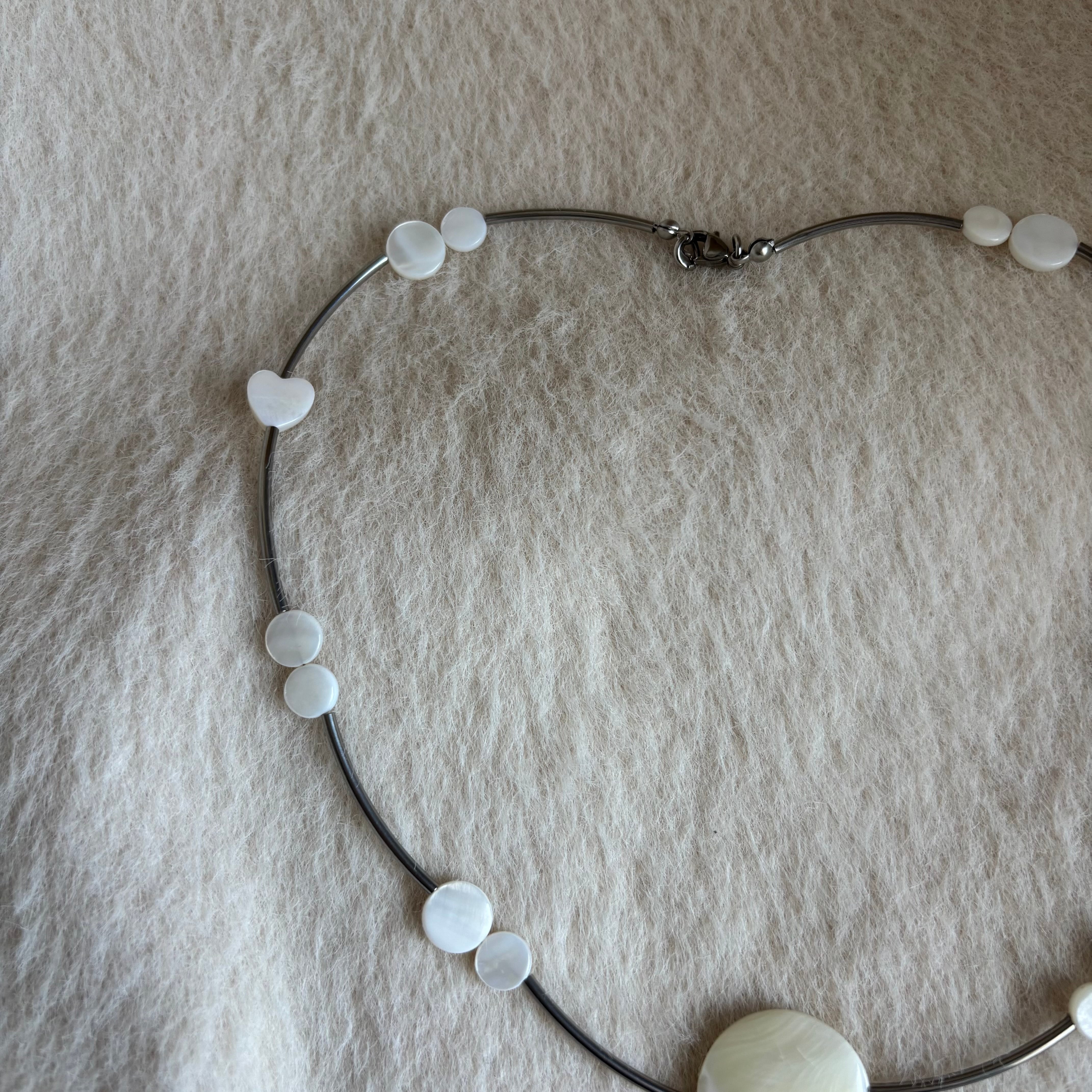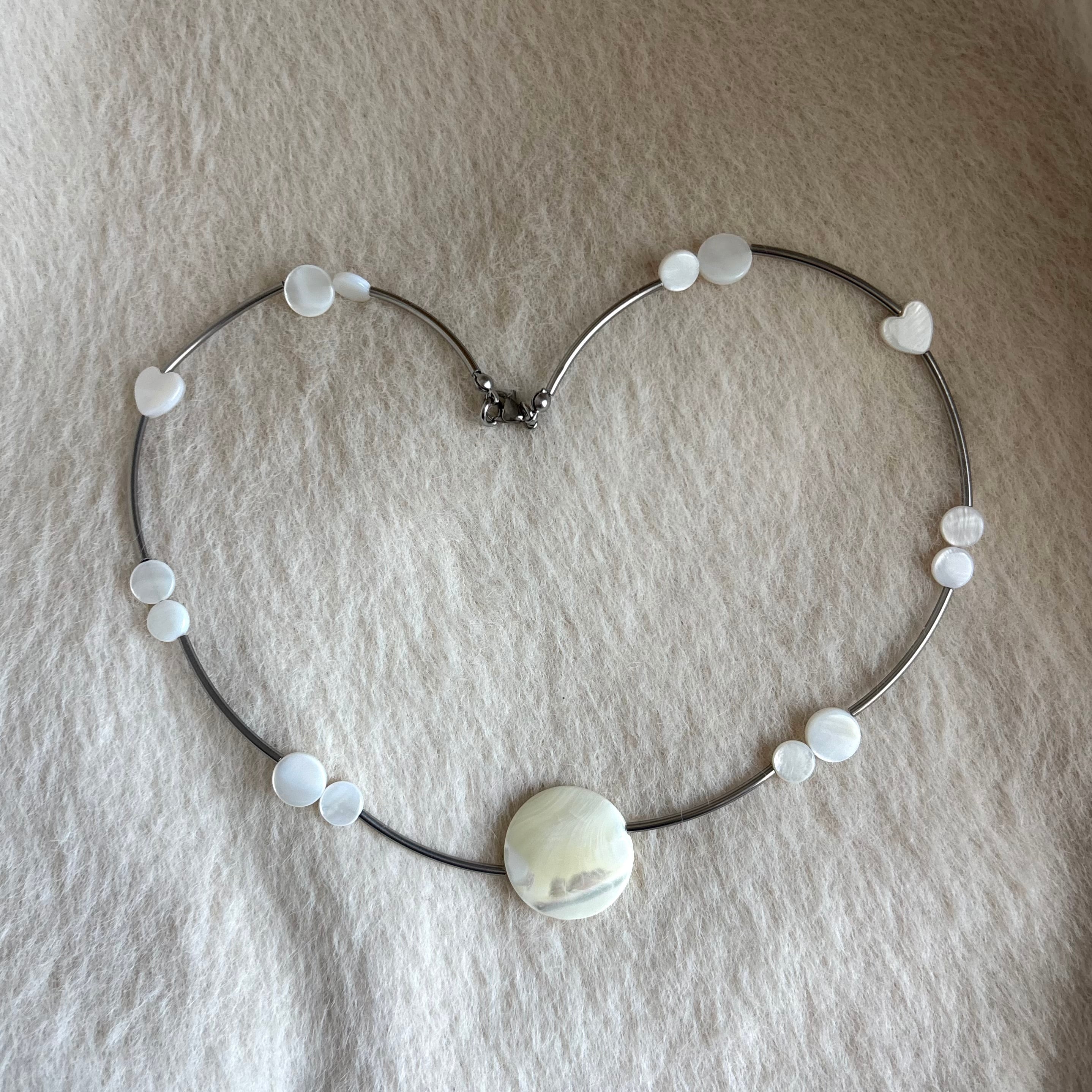 シェルの光沢は月のように輝き、さりげなくハートビーズも仕込んでおり、ふんわりと包み込むようなネックレス。