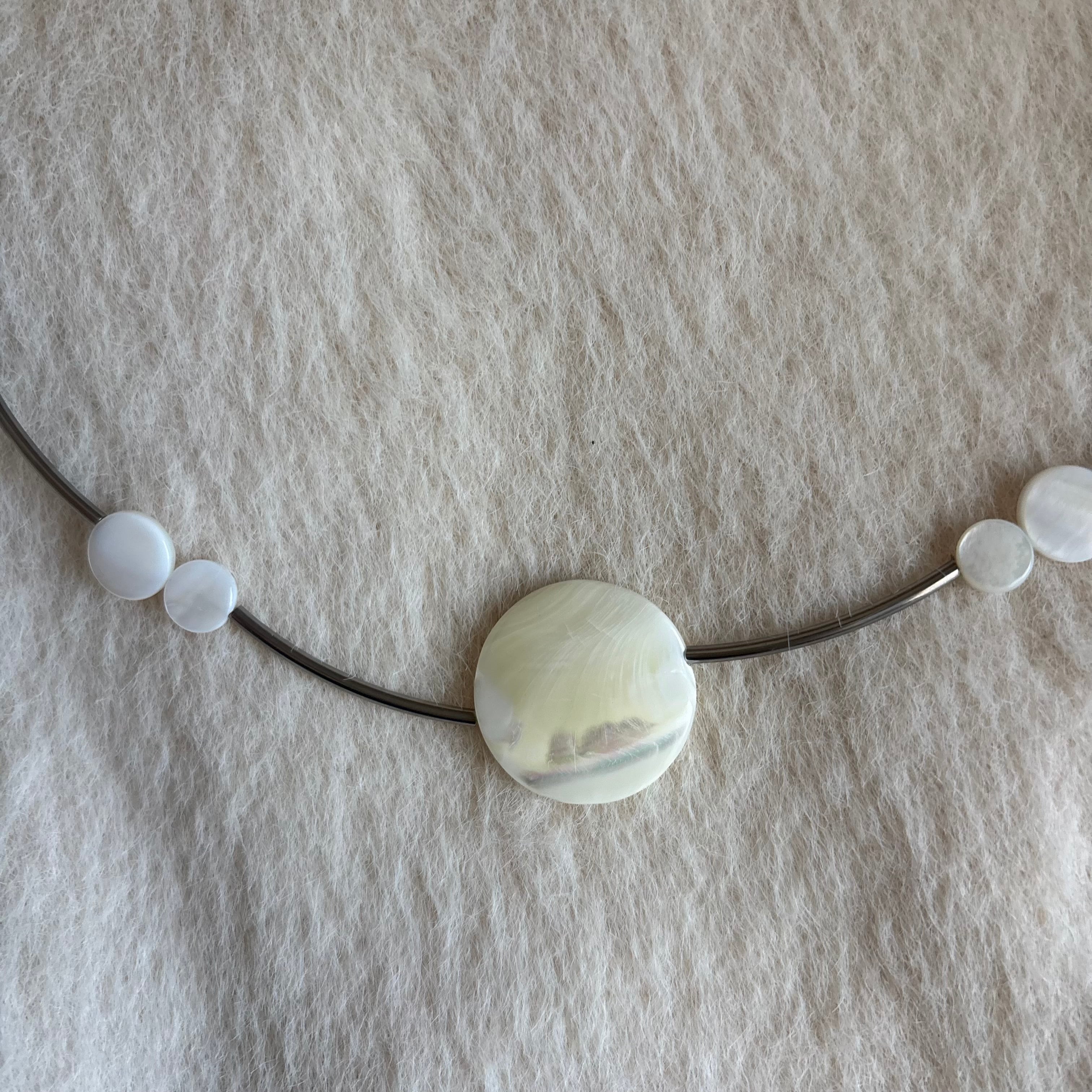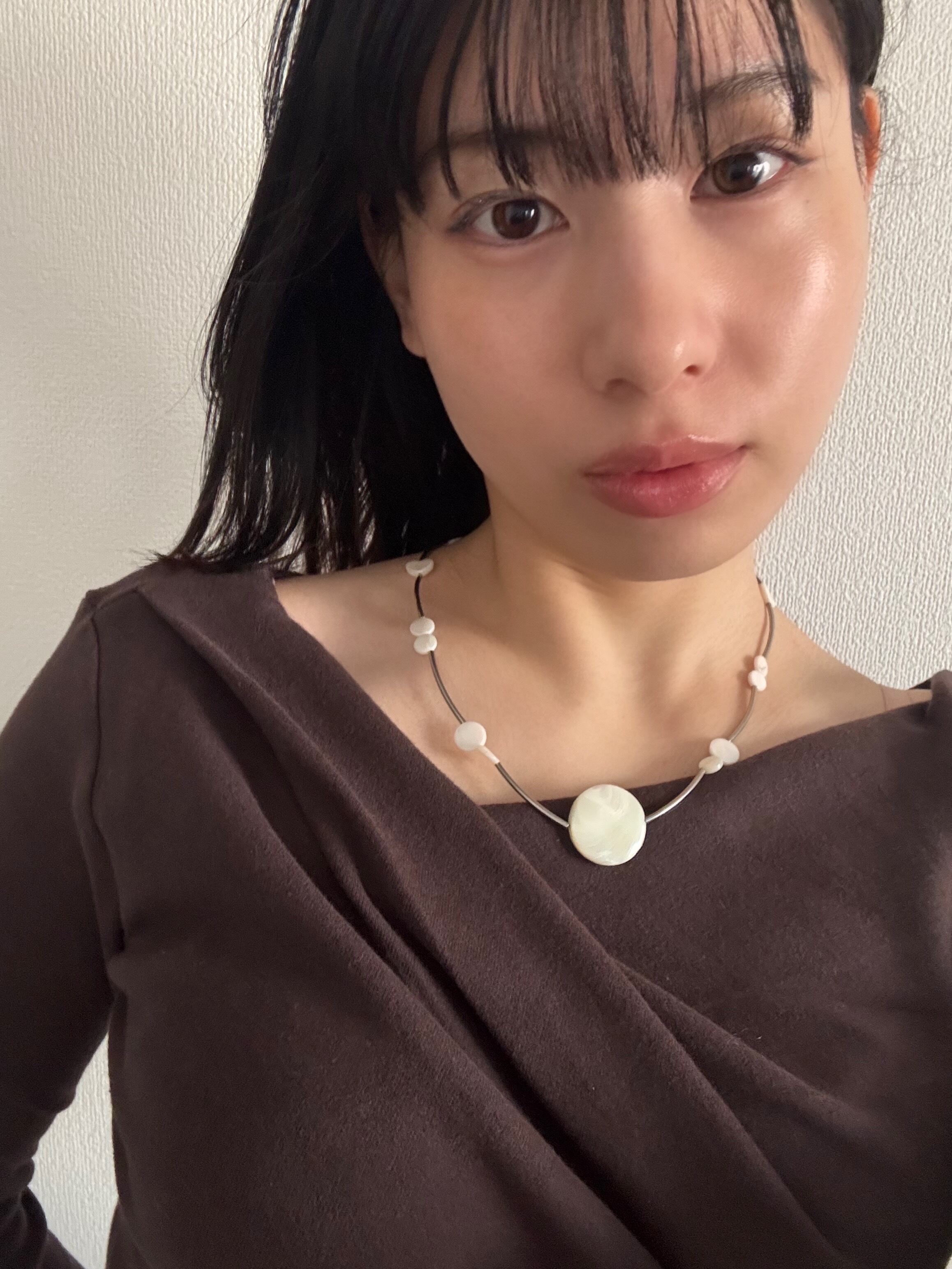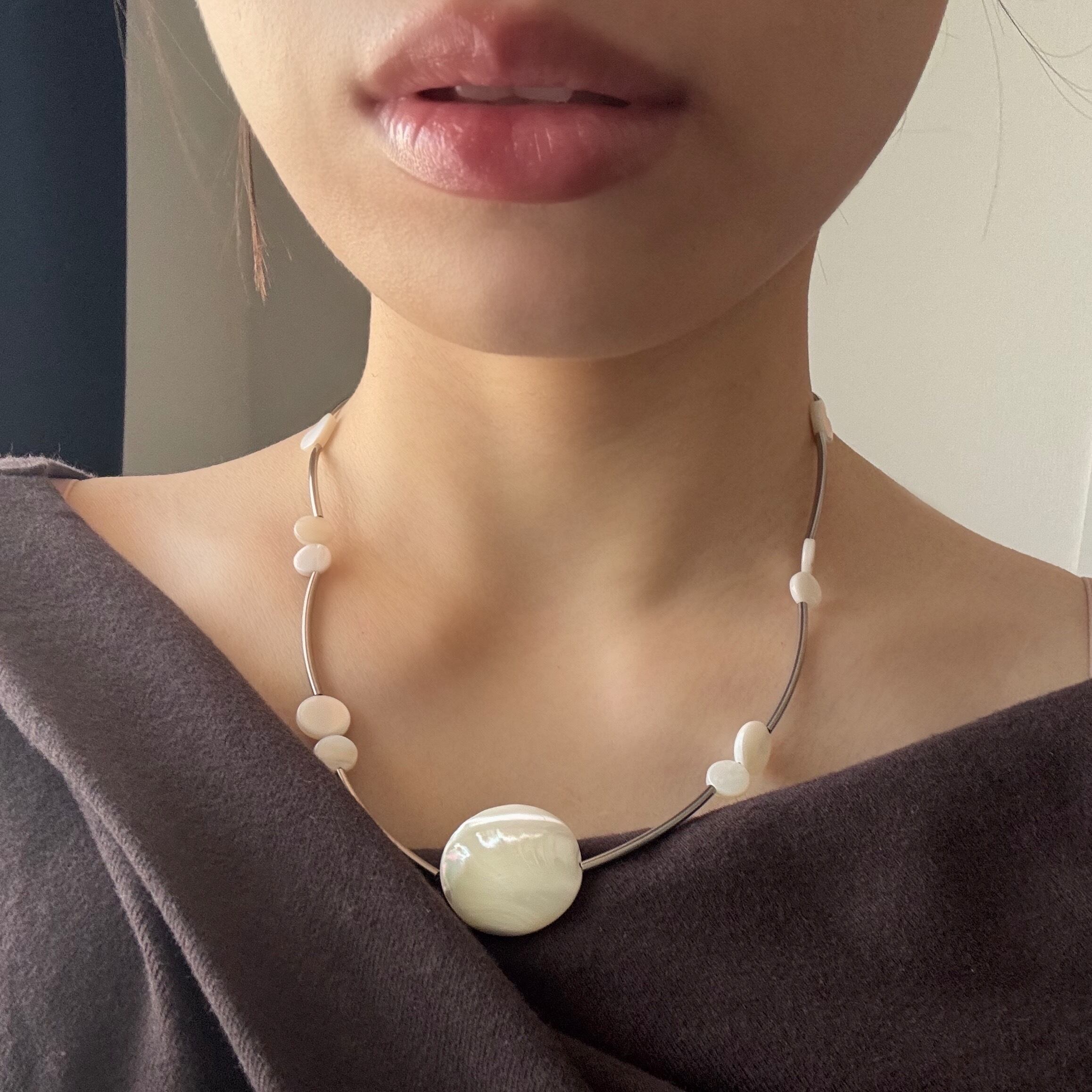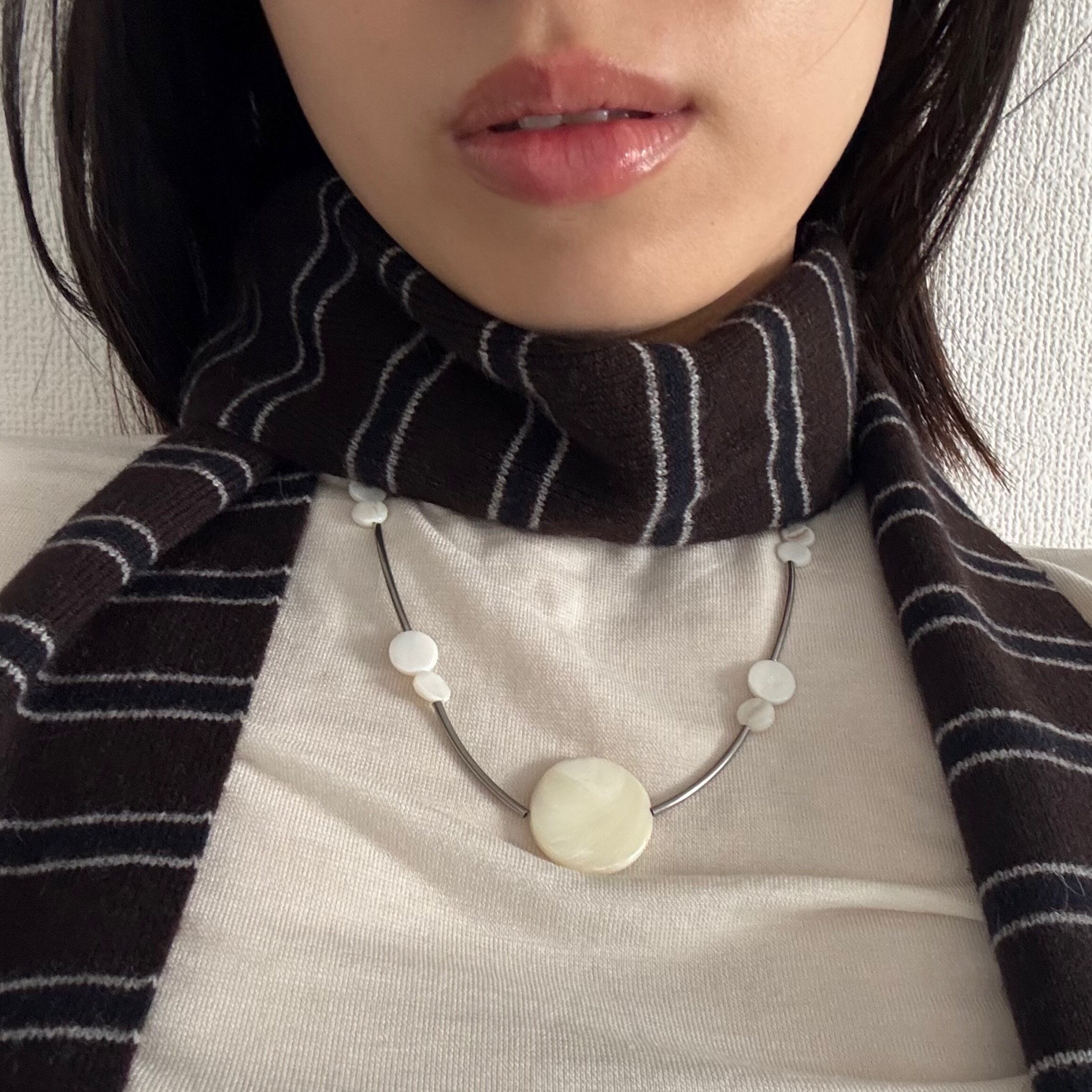 シェルの光沢は月のように輝き、さりげなくハートビーズも仕込んでおり、ふんわりと包み込むようなネックレス。