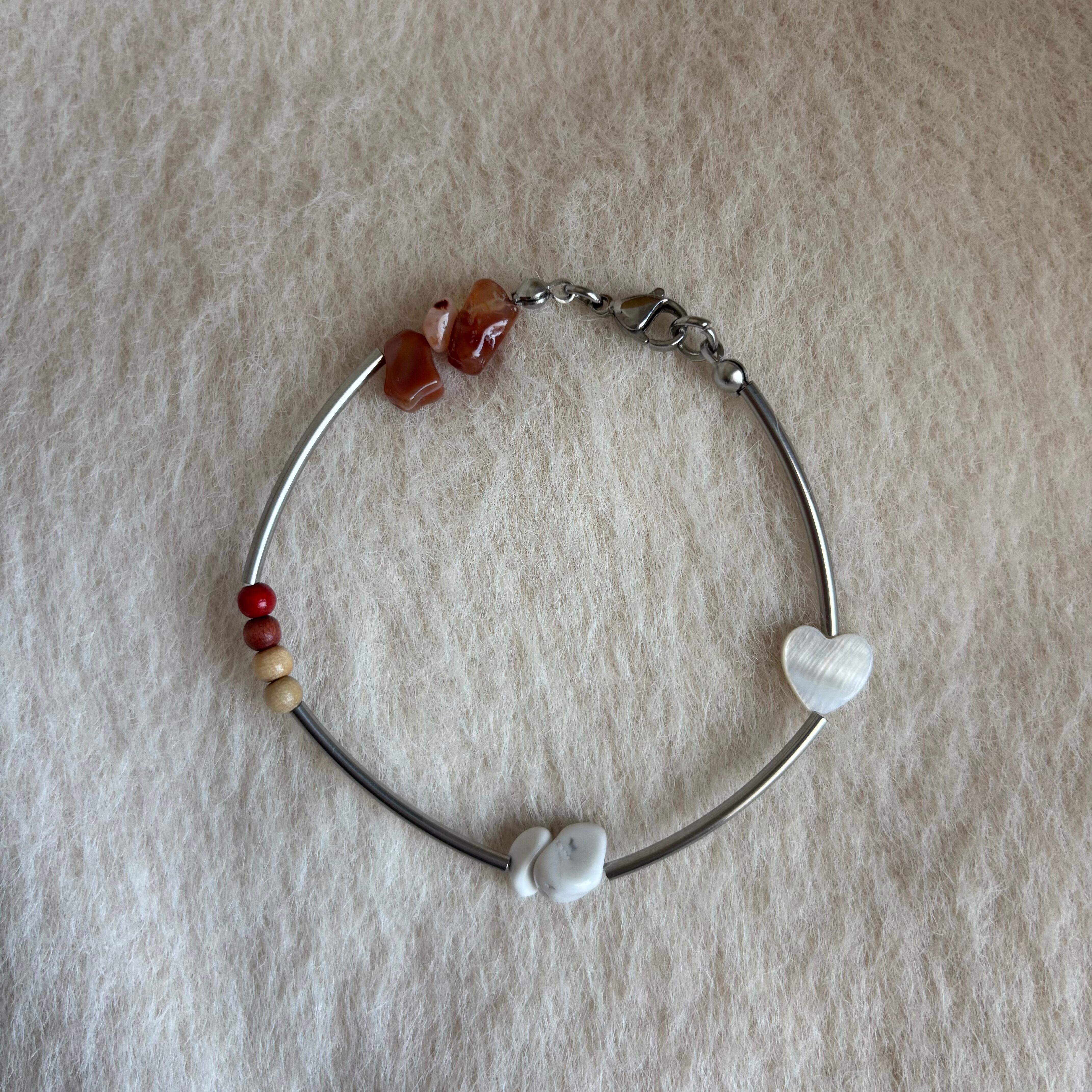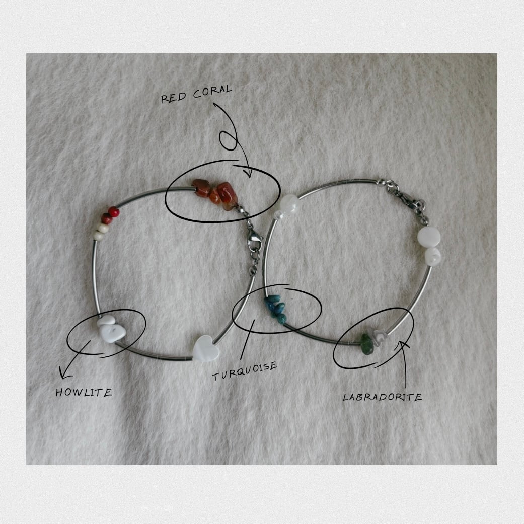 赤珊瑚、ハウライト、ターコイズ、ラブラドライトなどの天然石も散りばめられている。