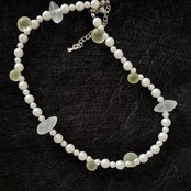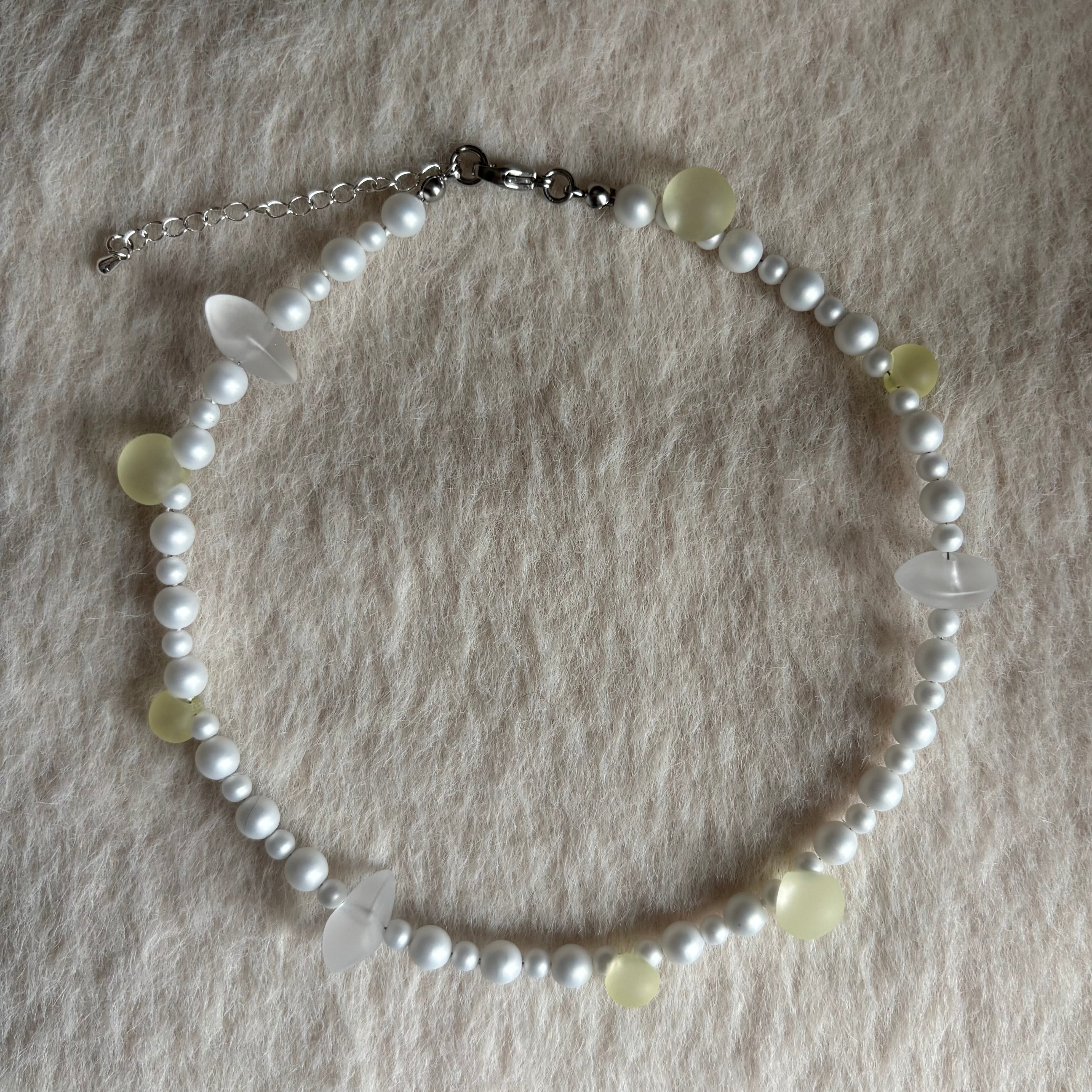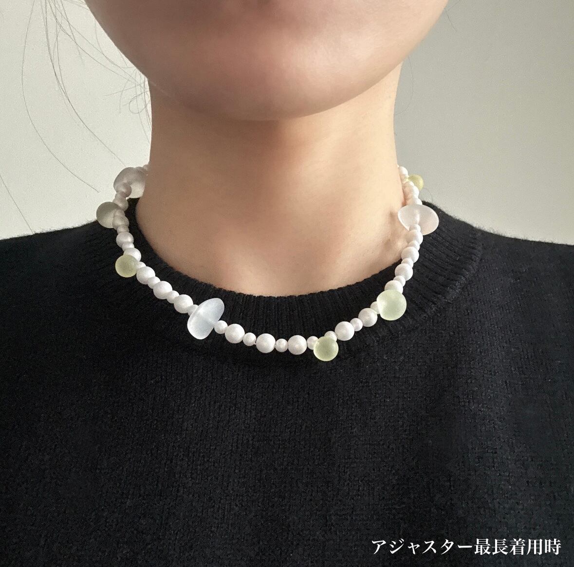 マットなパールビーズに、グミのように透けるビーズを組み合わせたネックレスです。