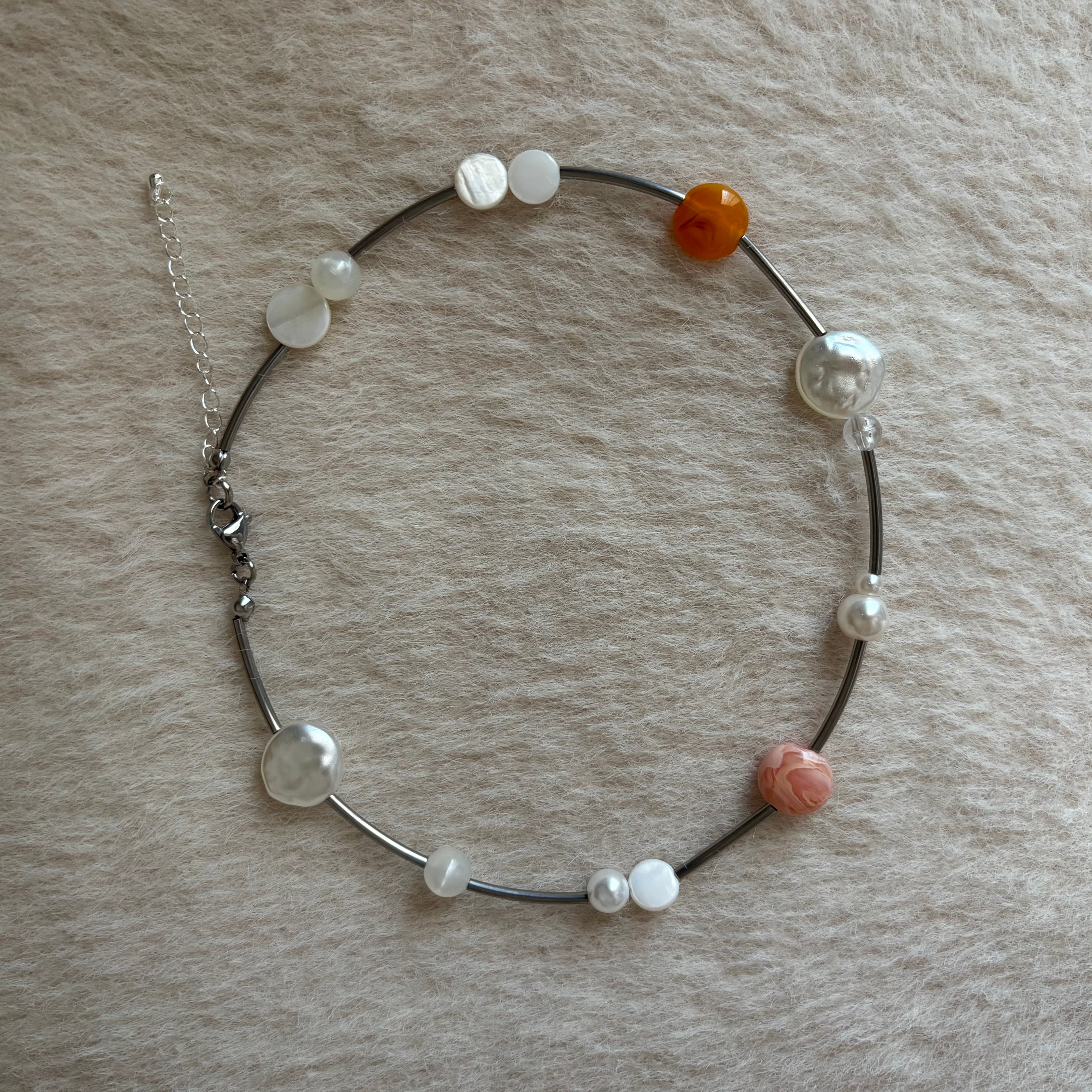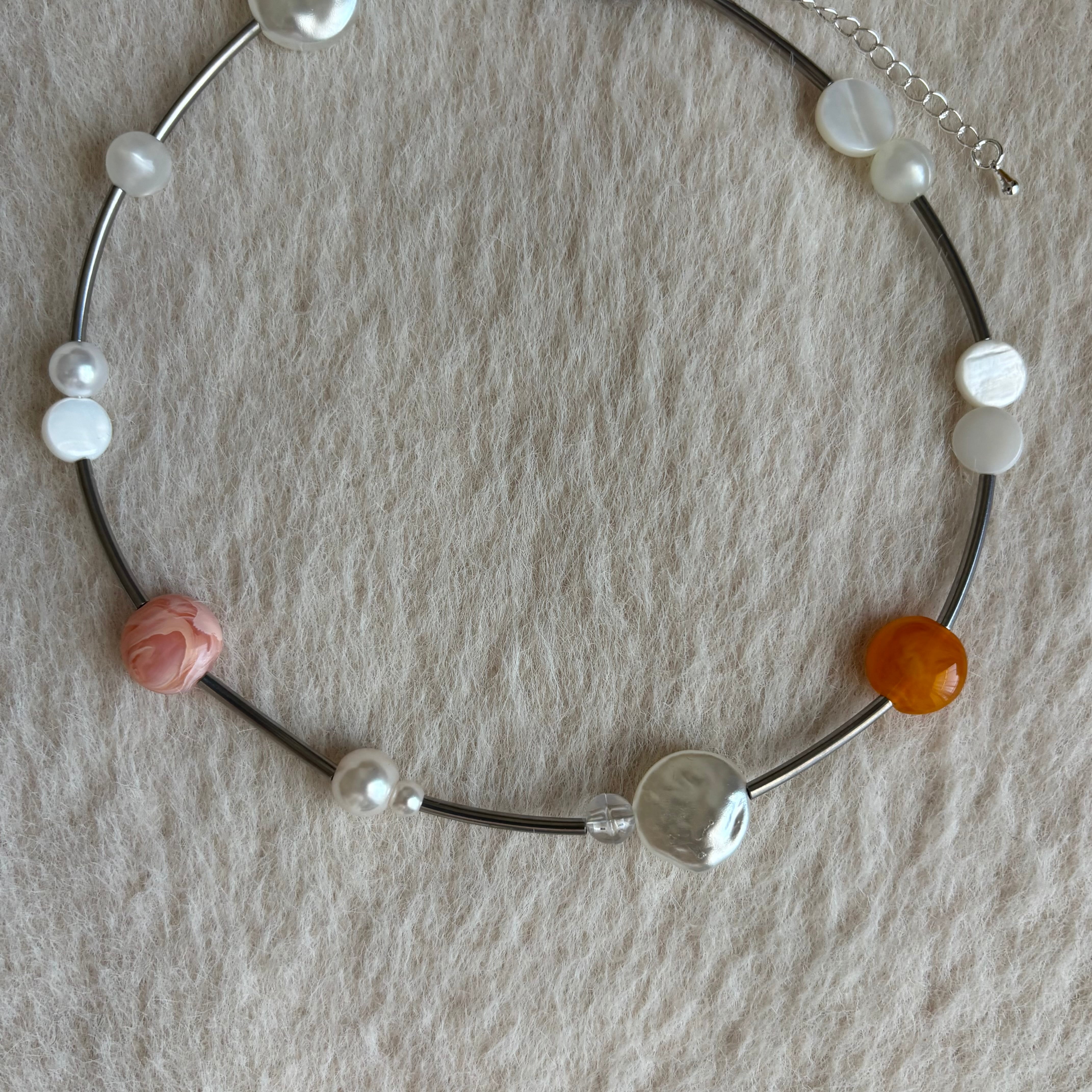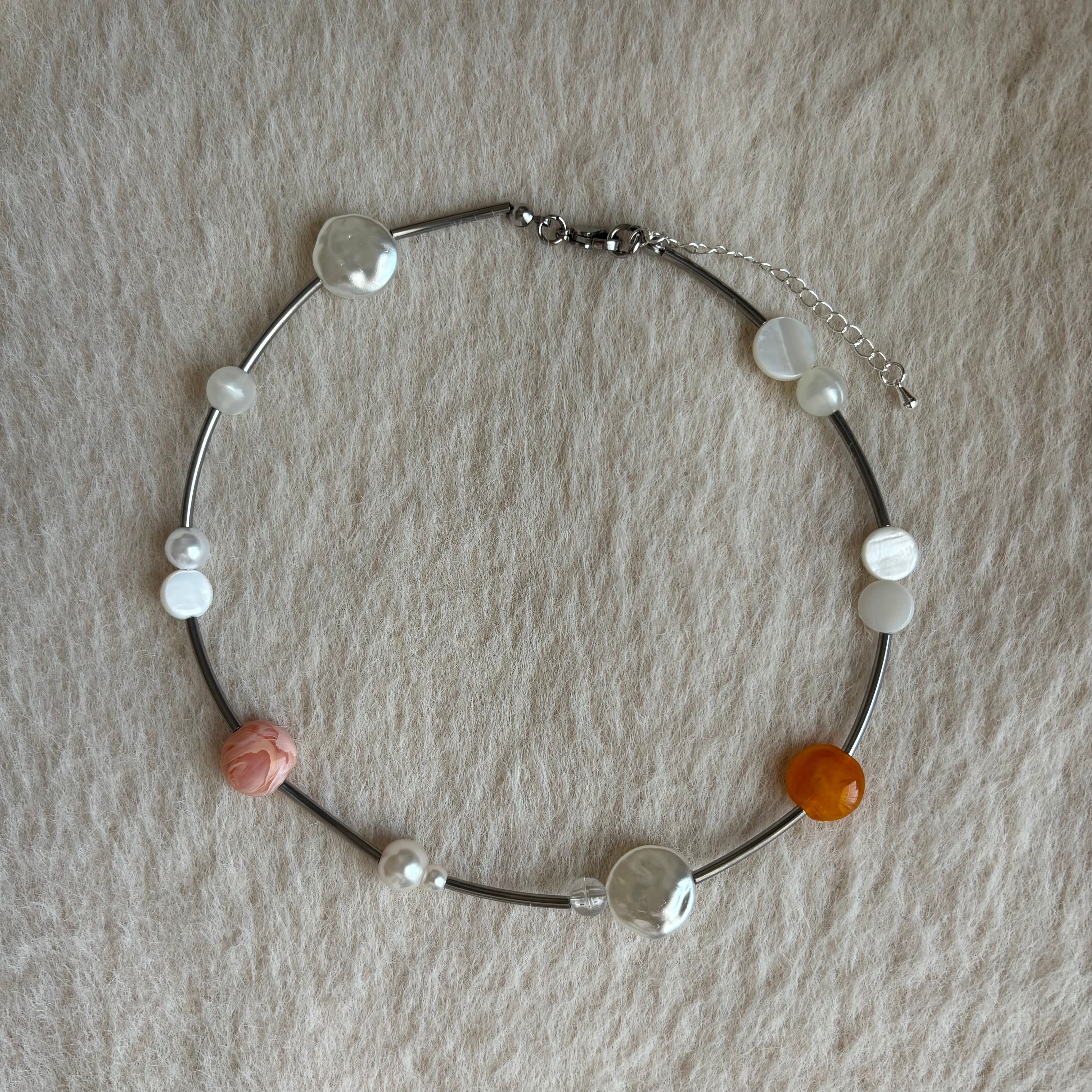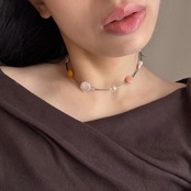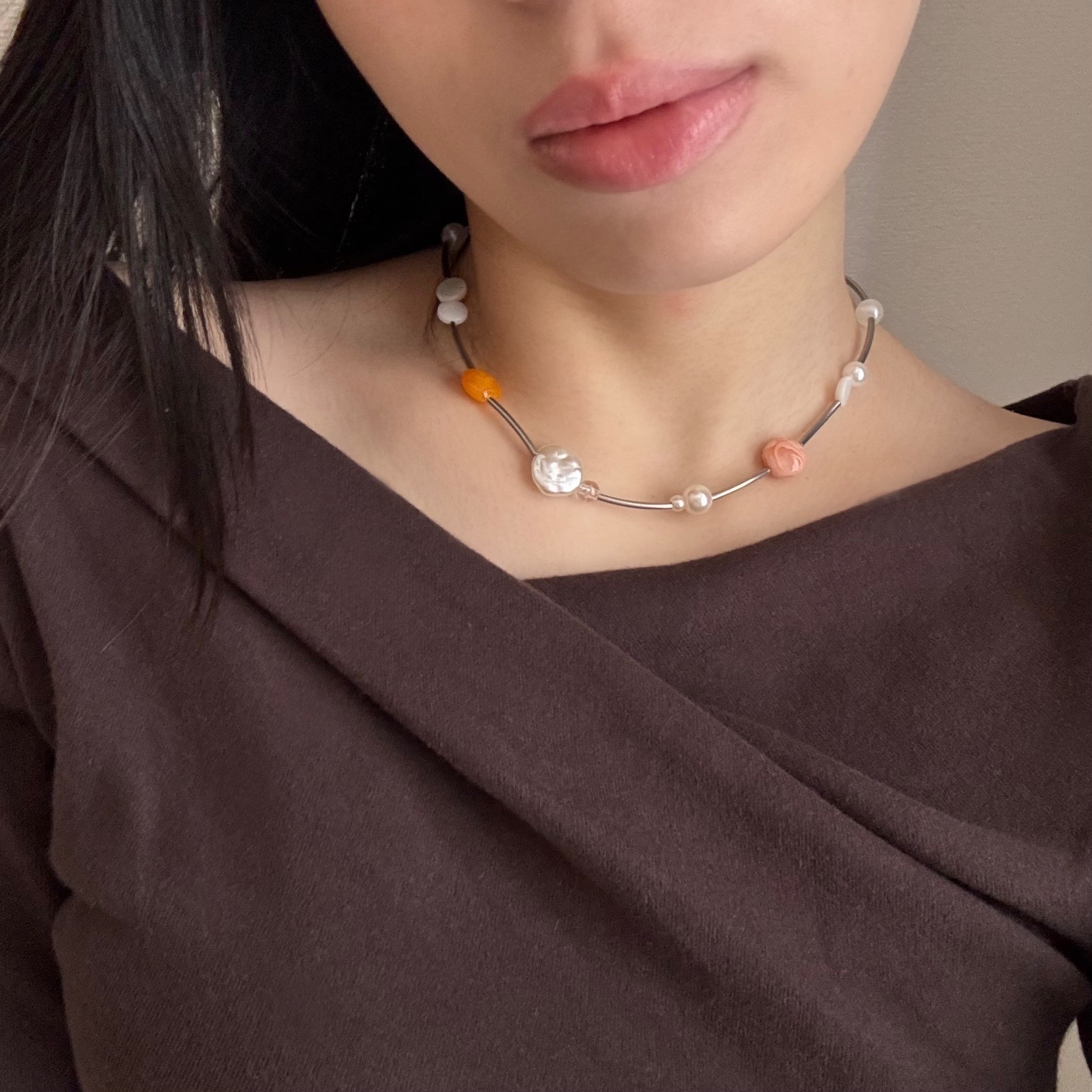 アプリコットみたいな、やわらかくて温度のあるオレンジが主役のネックレス。