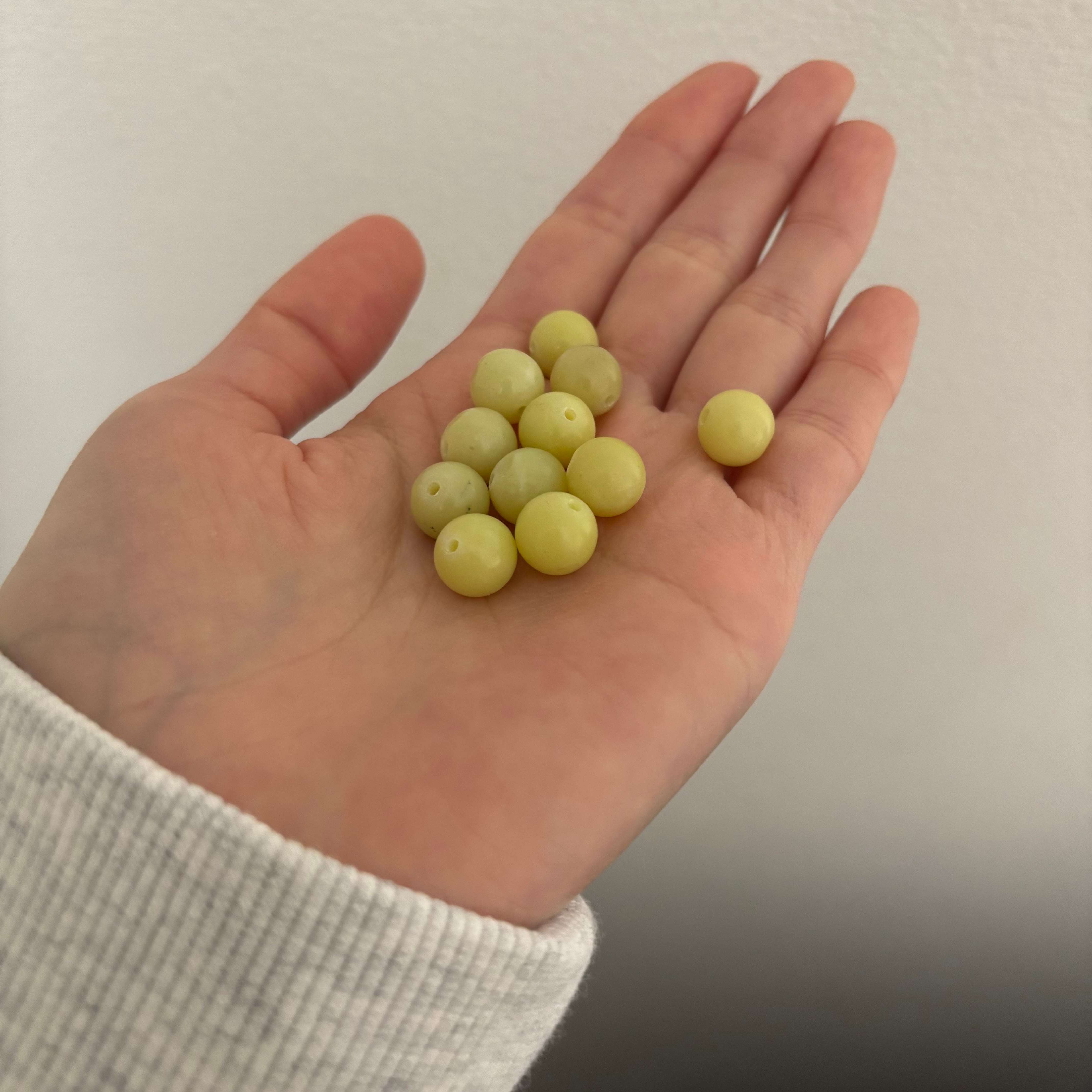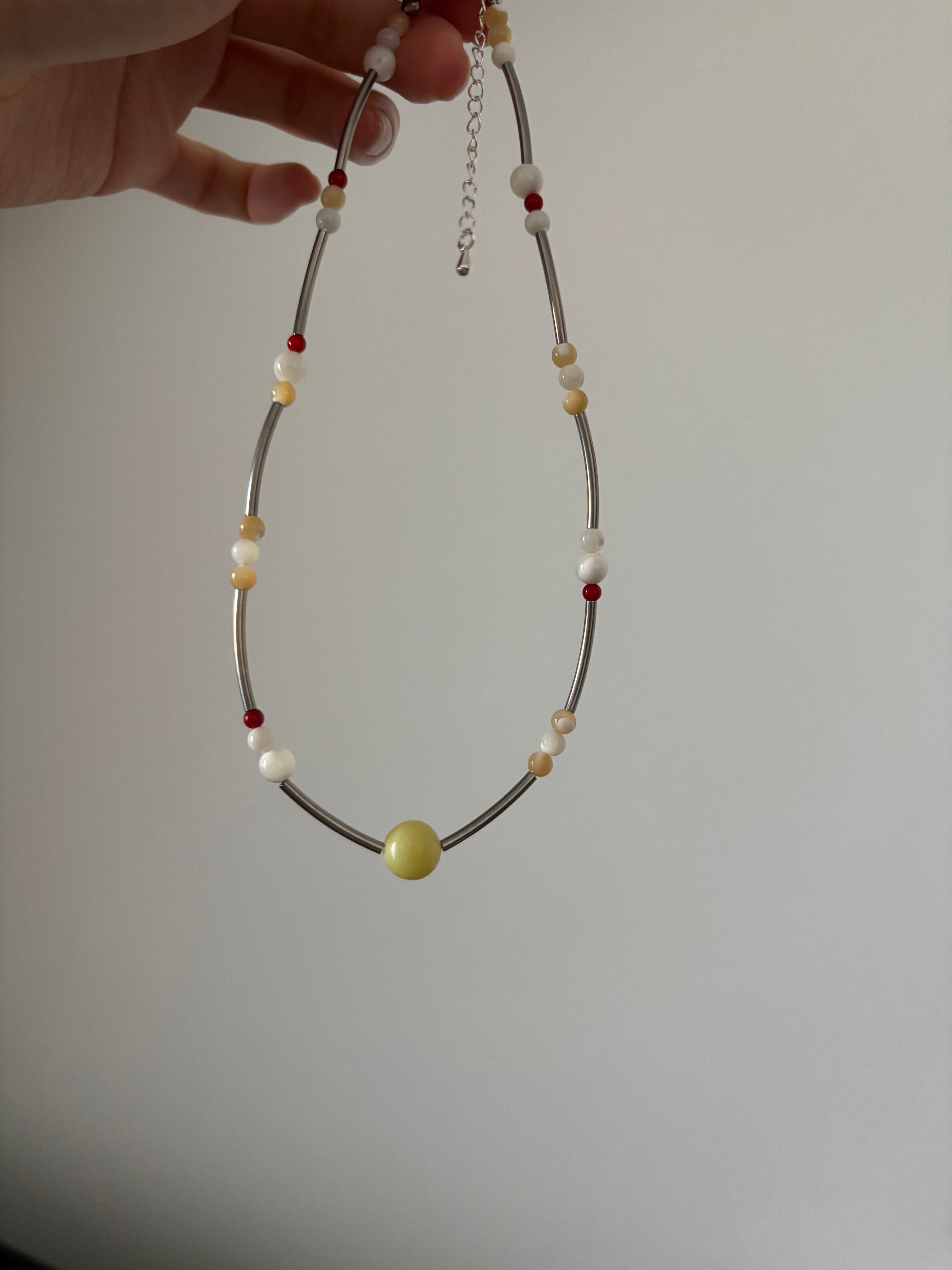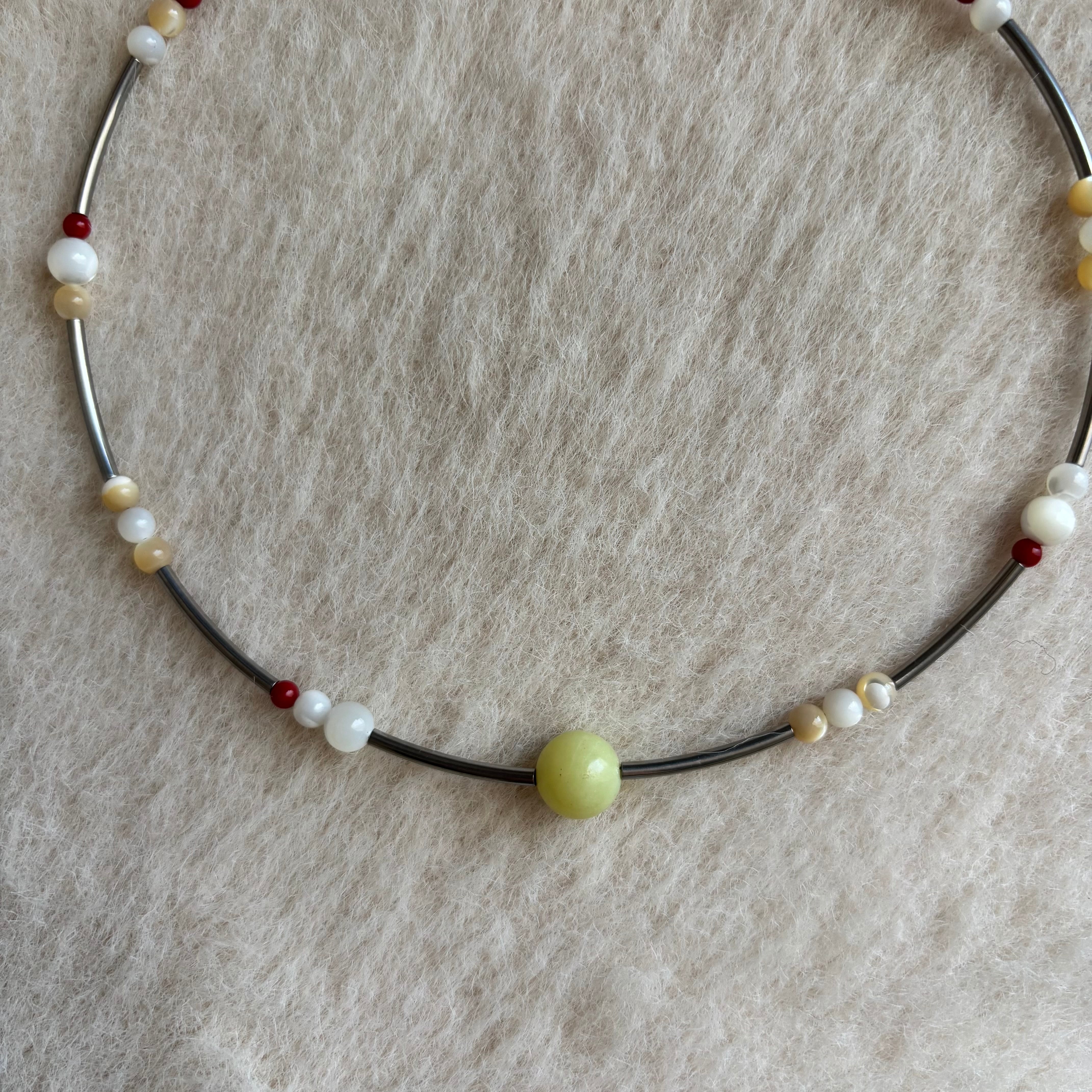 淡く澄んだレモンジェイド(中央のレモンカラーの石)に、上品な光沢を放つマザーオブパール、やわらかな色味のコーラルを組み合わせたネックレス。