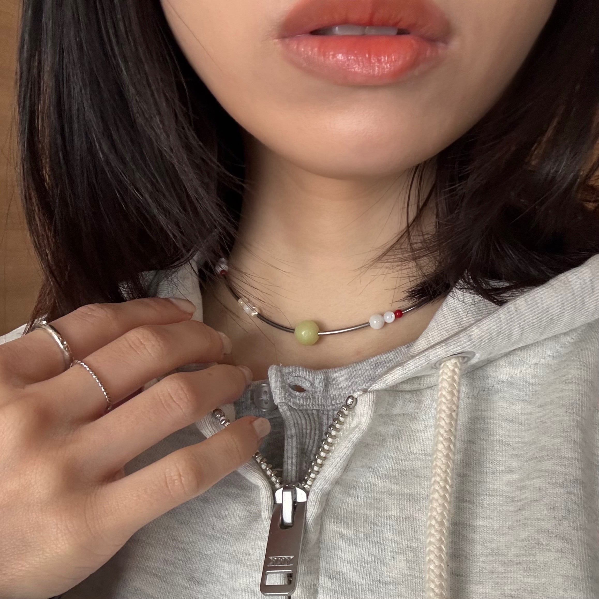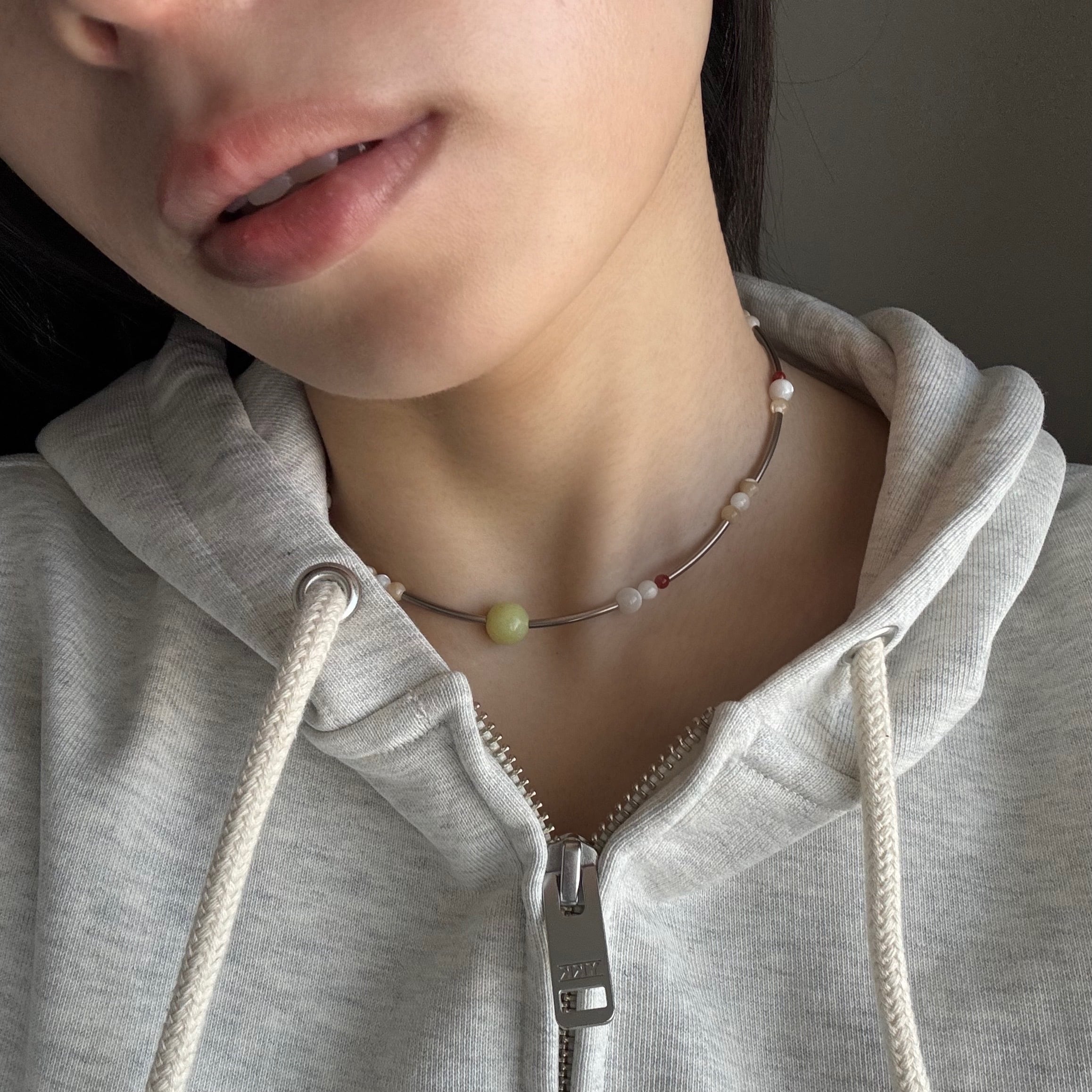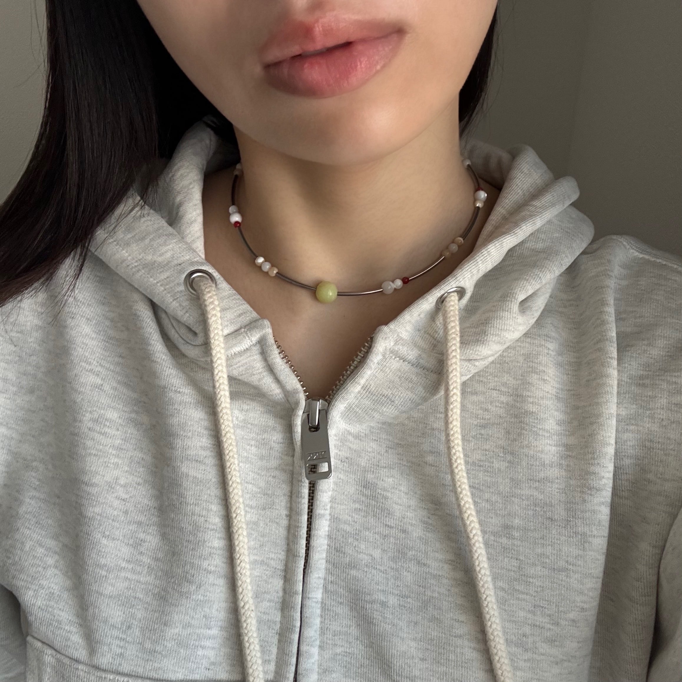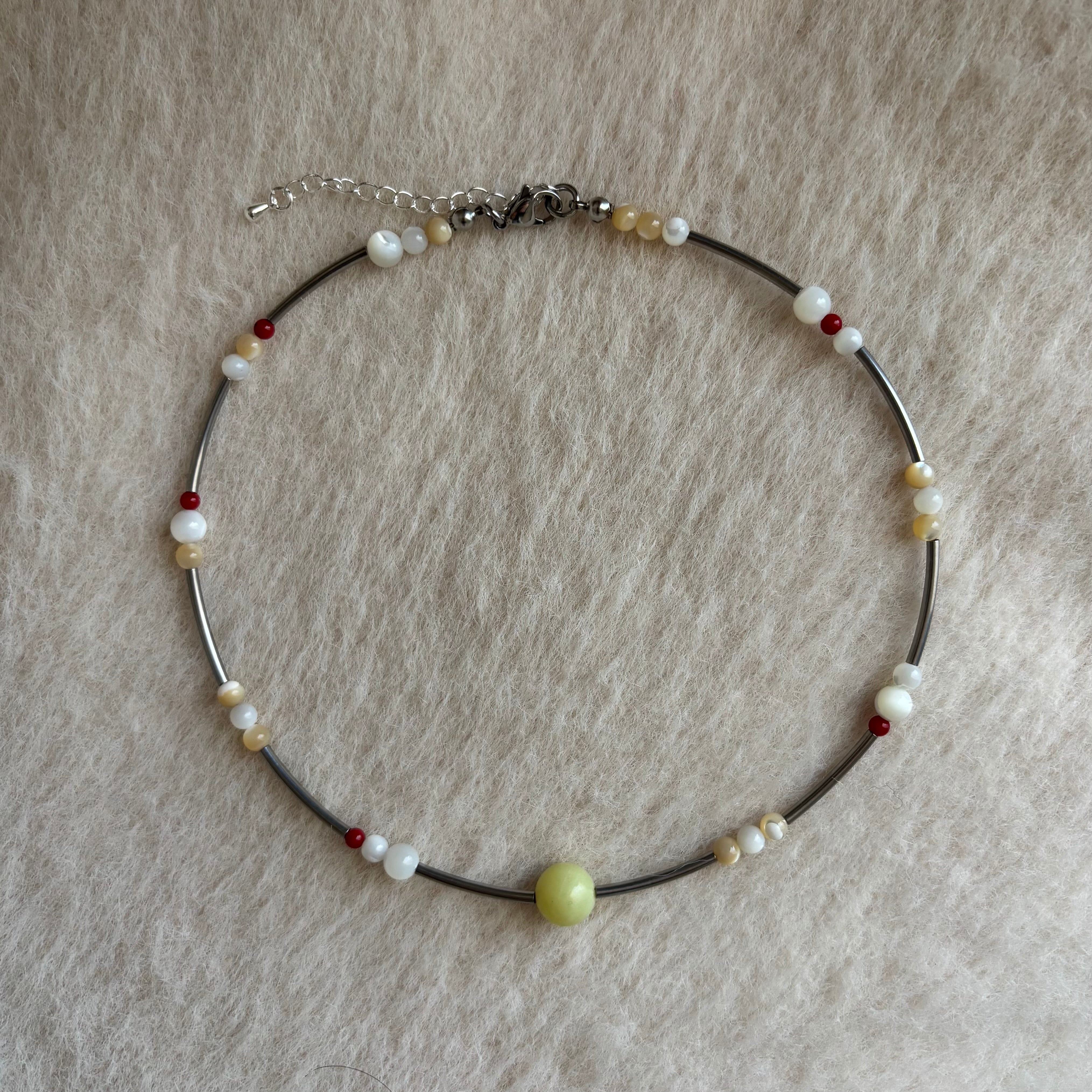 レモンのような透明感のある色合いが首元に軽やかさを添え、マザーオブパールのやさしい艶が肌に溶け込みます。ところどころに配したコーラルが血色を感じさせ、全体にあたたかみのある印象に。