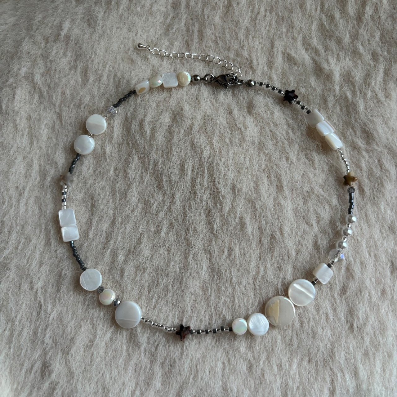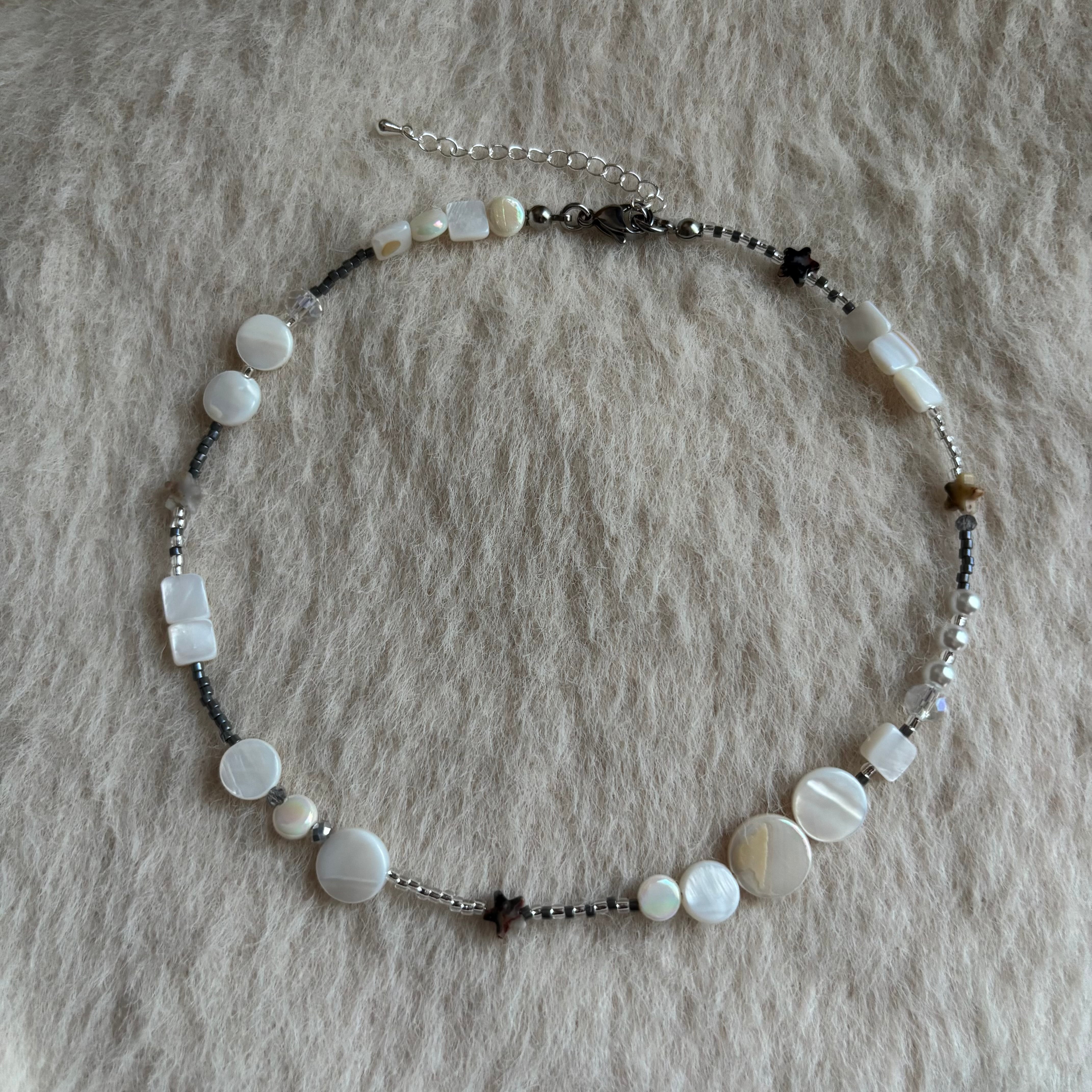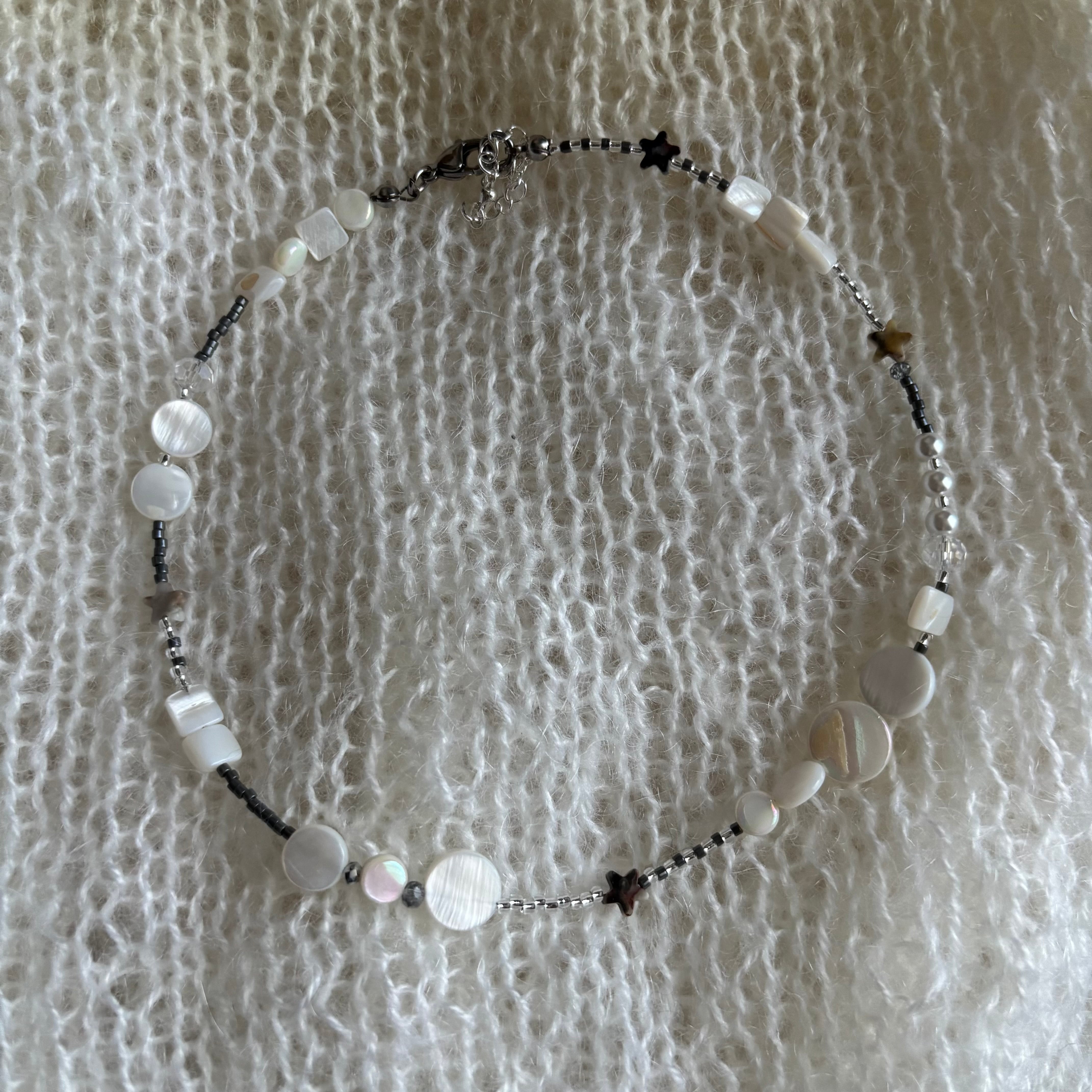 透明感のある丸いビーズが光の粒のように揺れ、小さな星のビーズがそっときらめくネックレス。