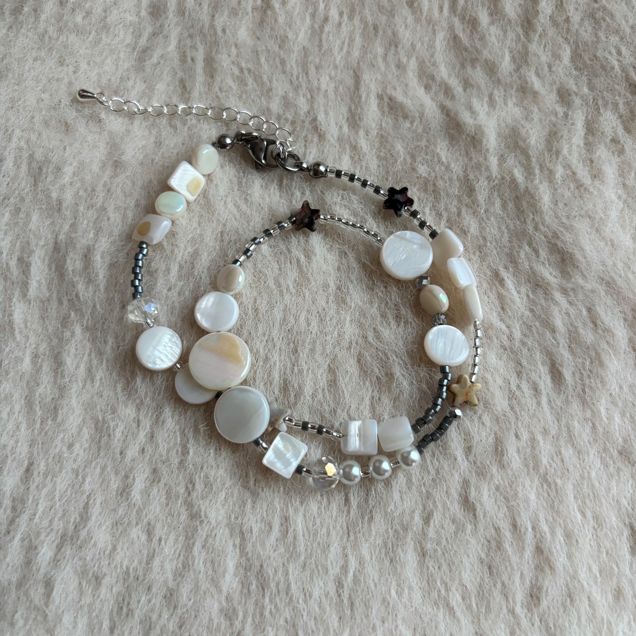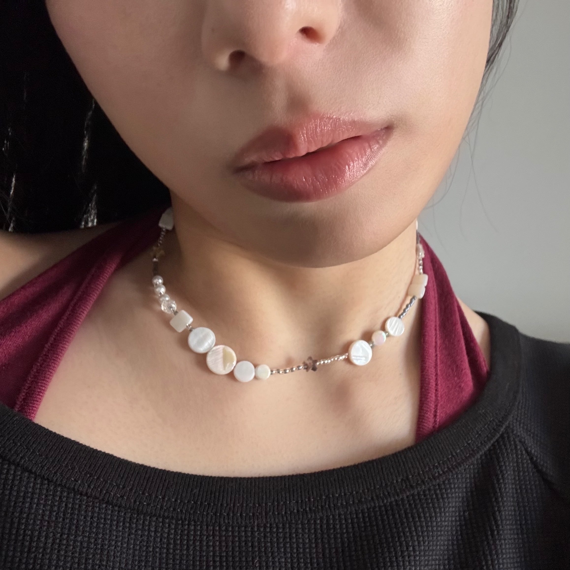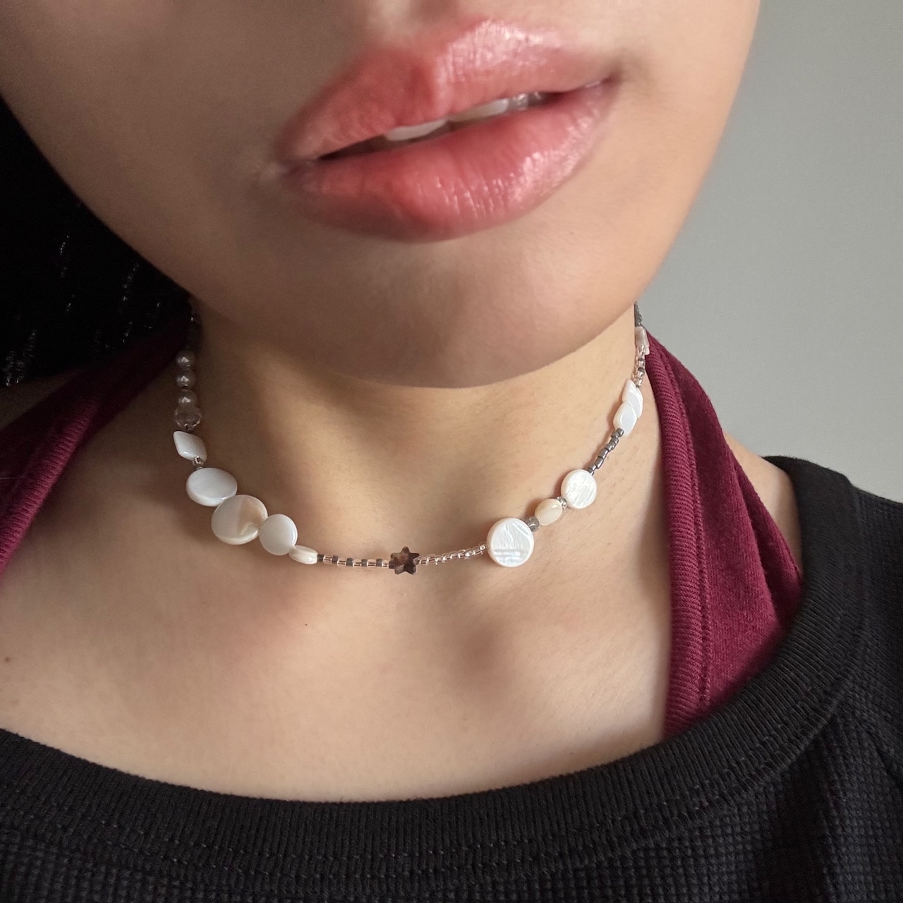 透明感のある丸いビーズが光の粒のように揺れ、小さな星のビーズがそっときらめくネックレス。