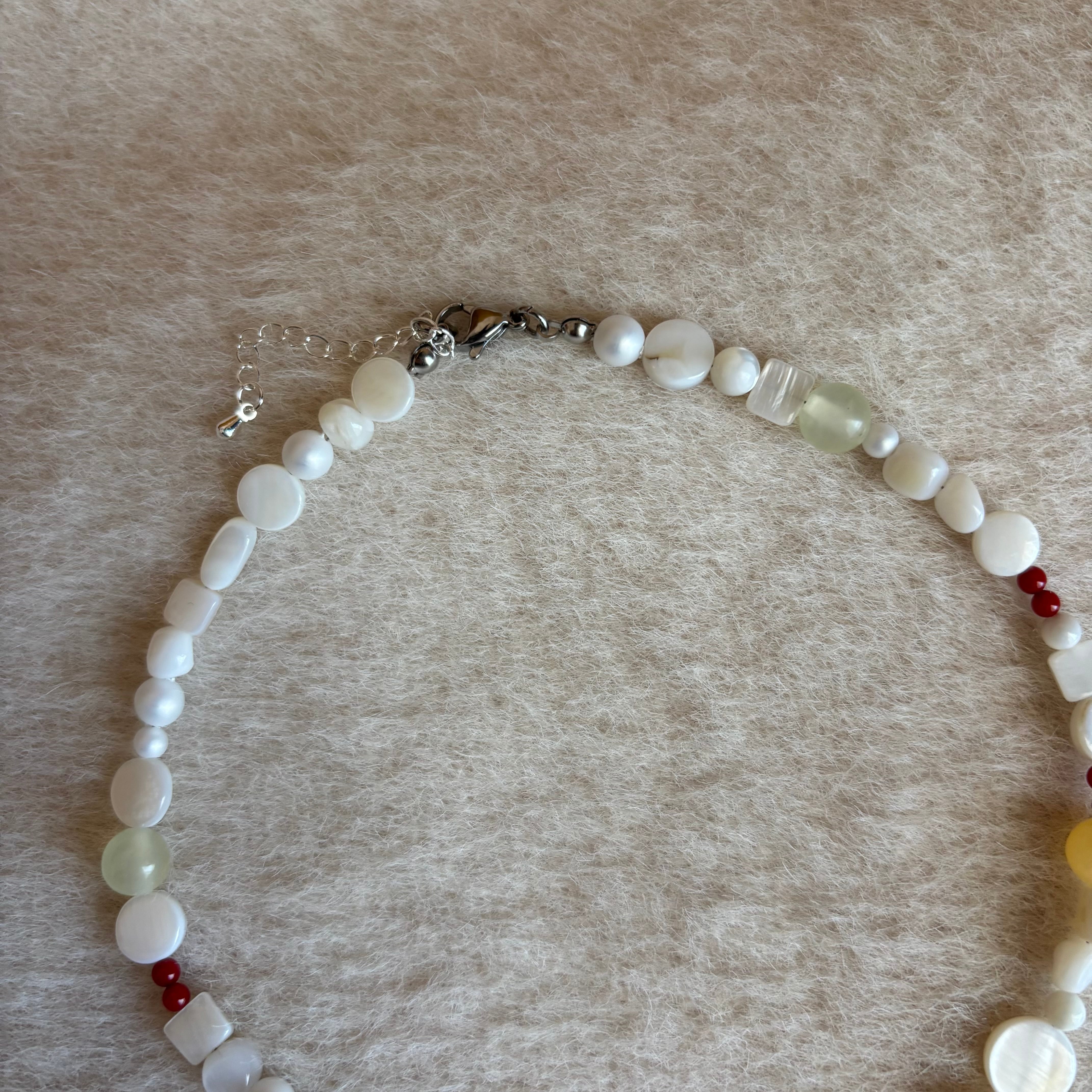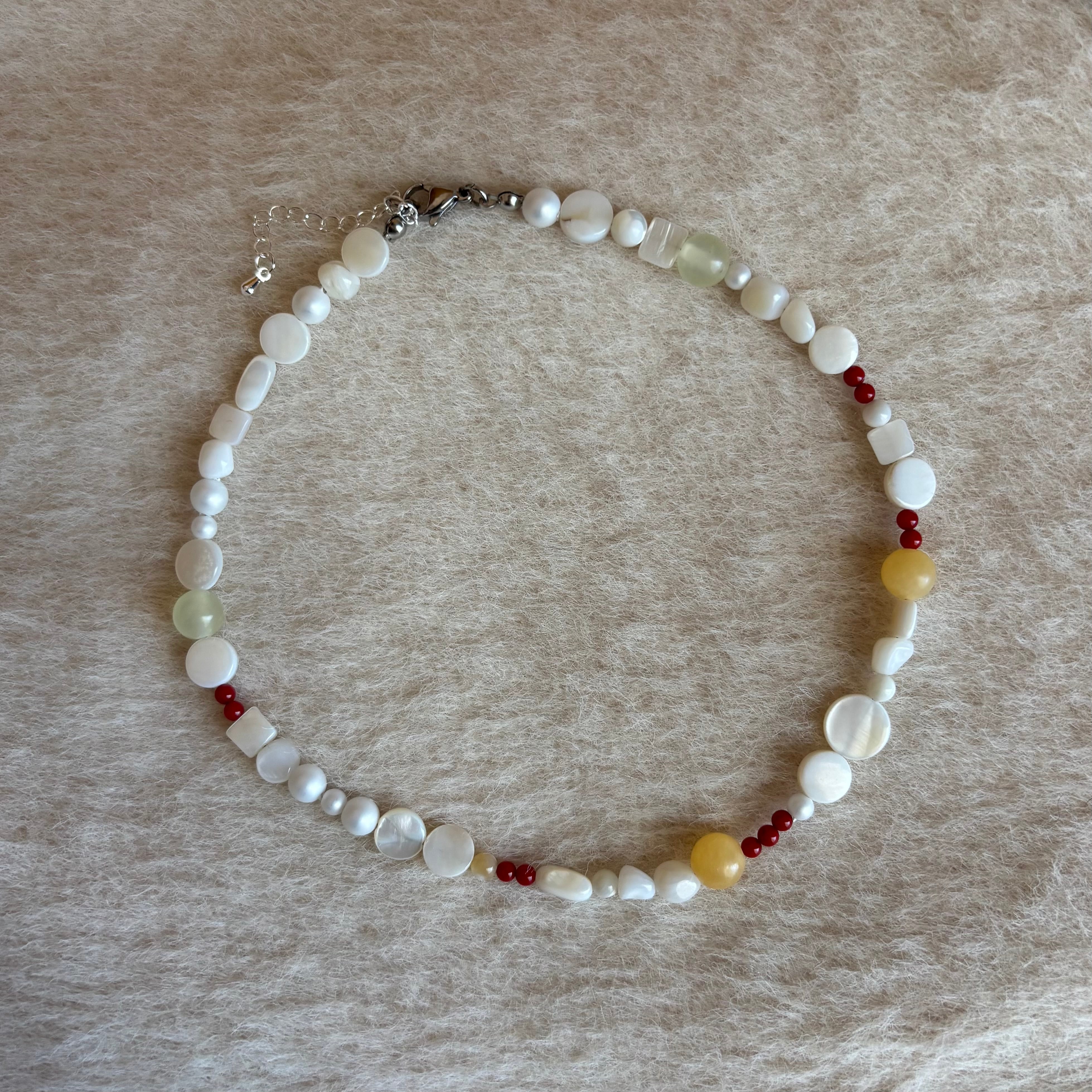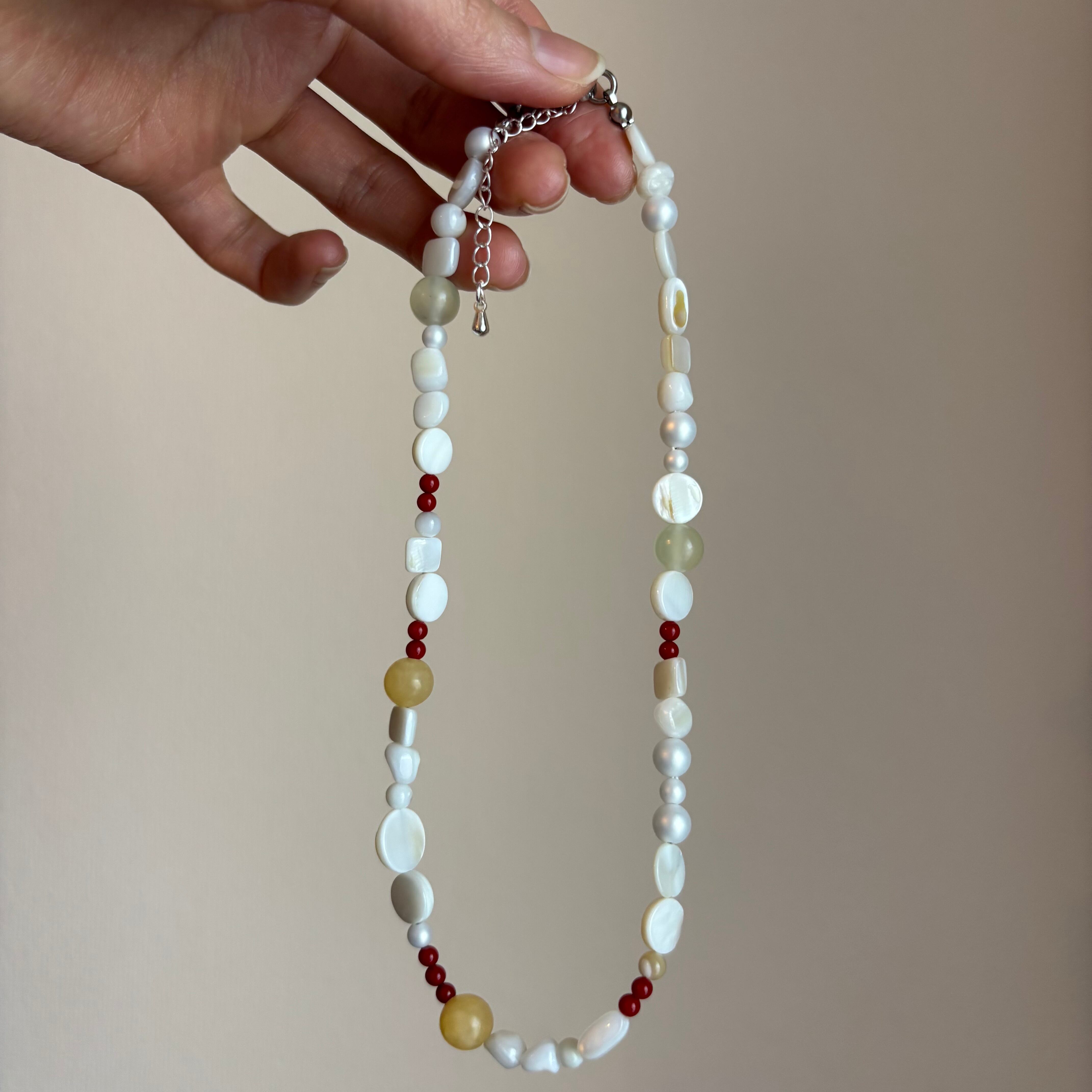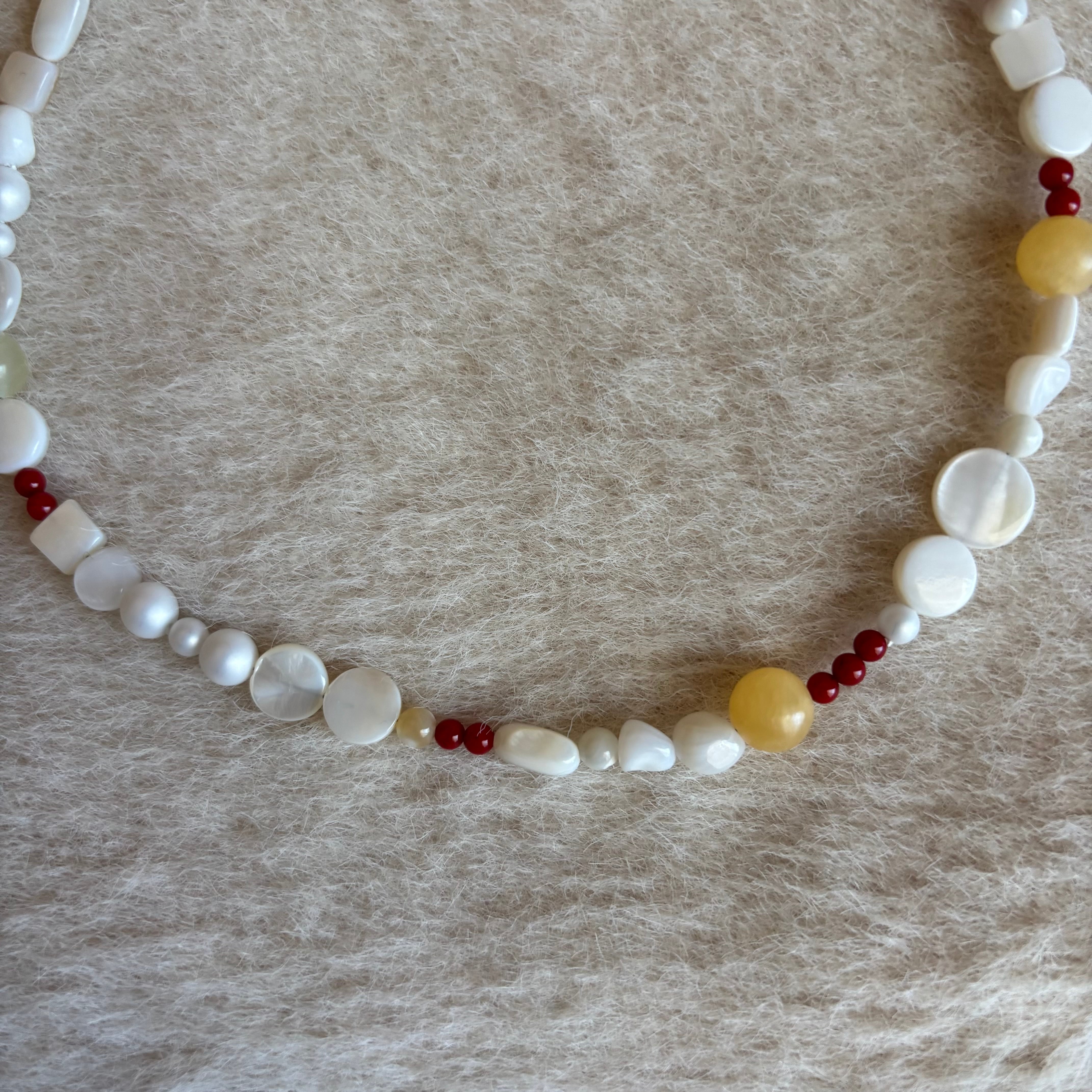 天然石とホワイト光沢ビーズを組み合わせた1本です。