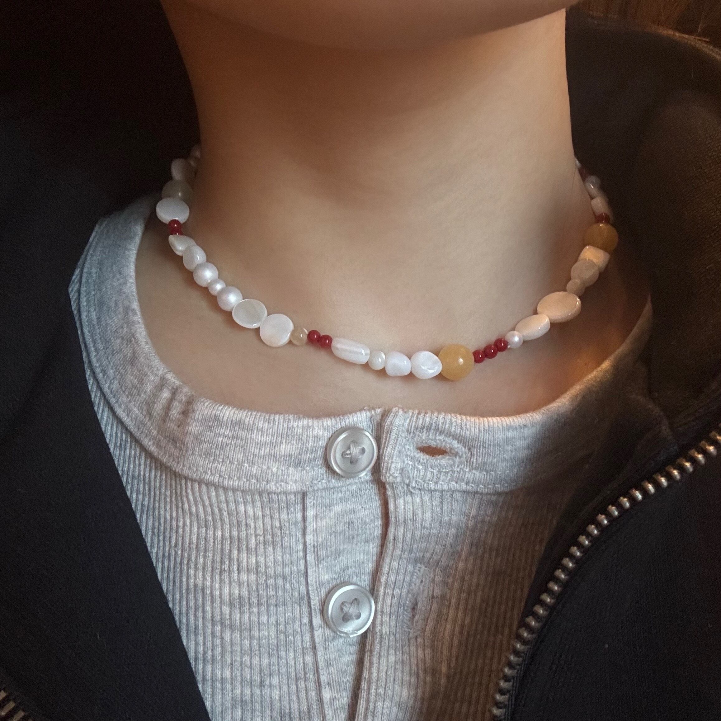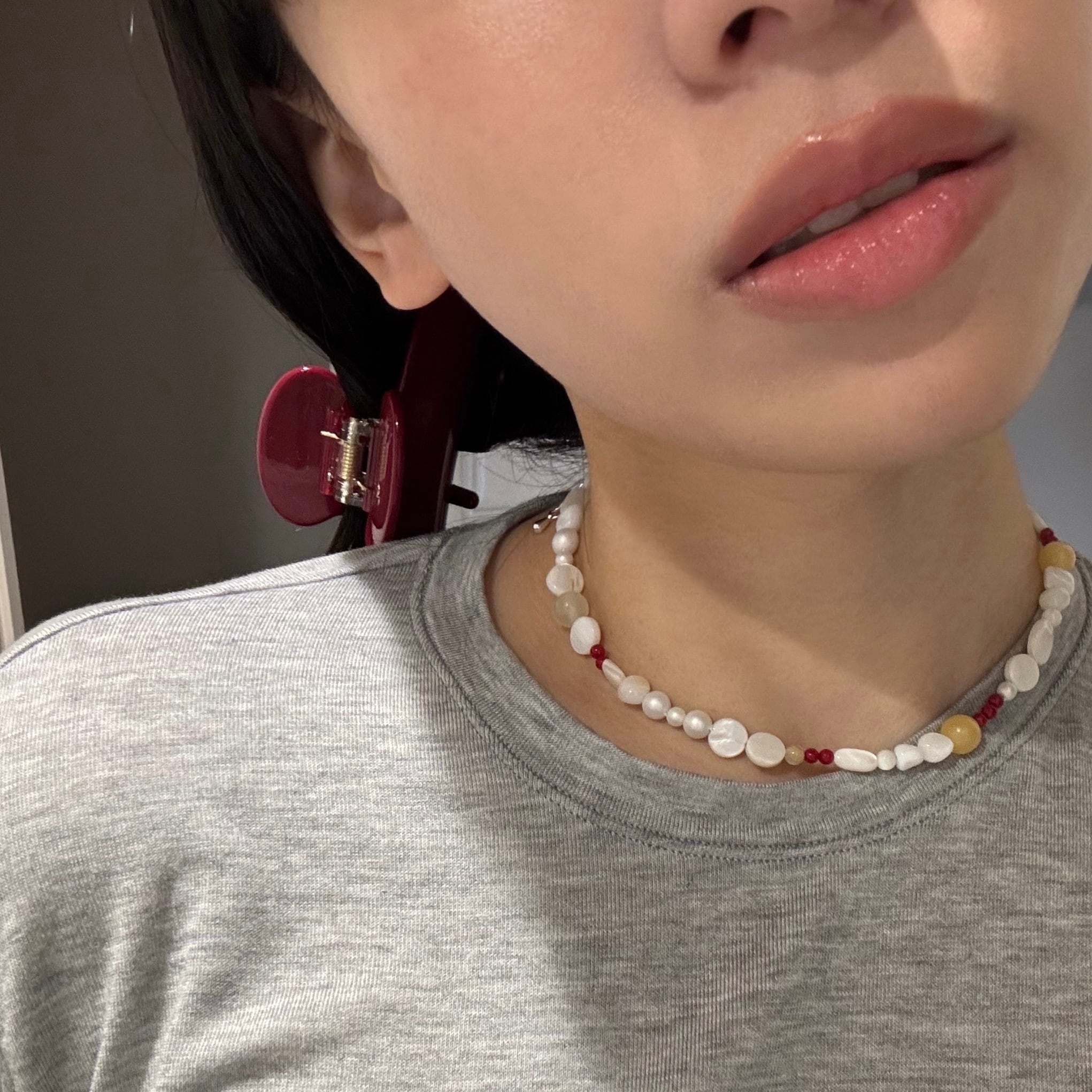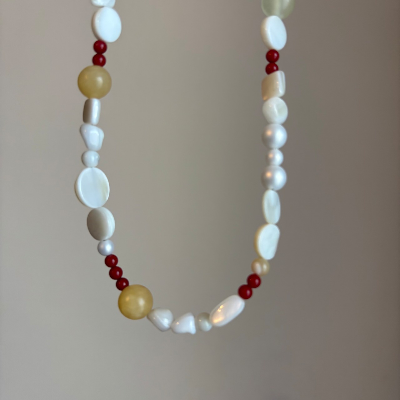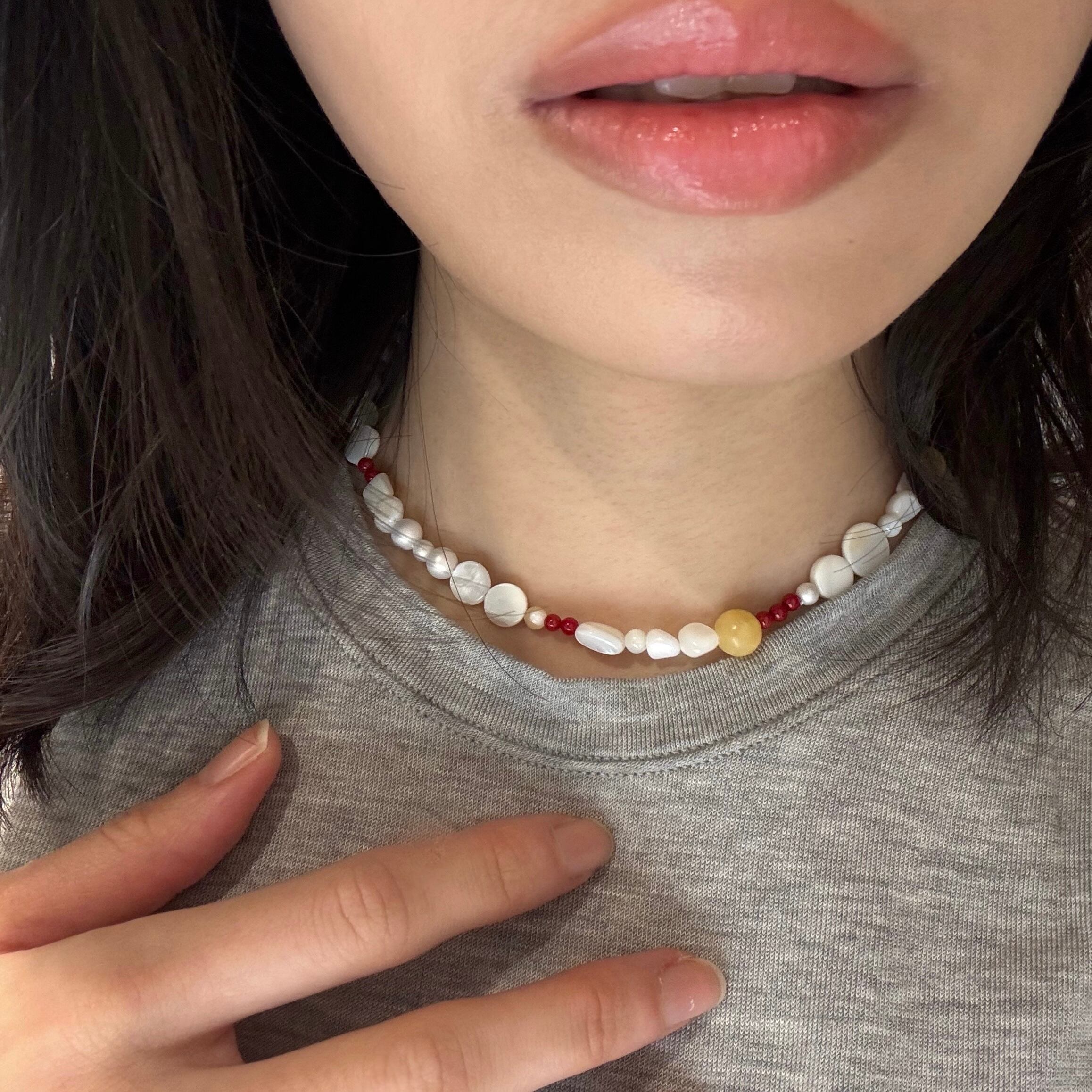 天然石とホワイト光沢ビーズを組み合わせた1本です。