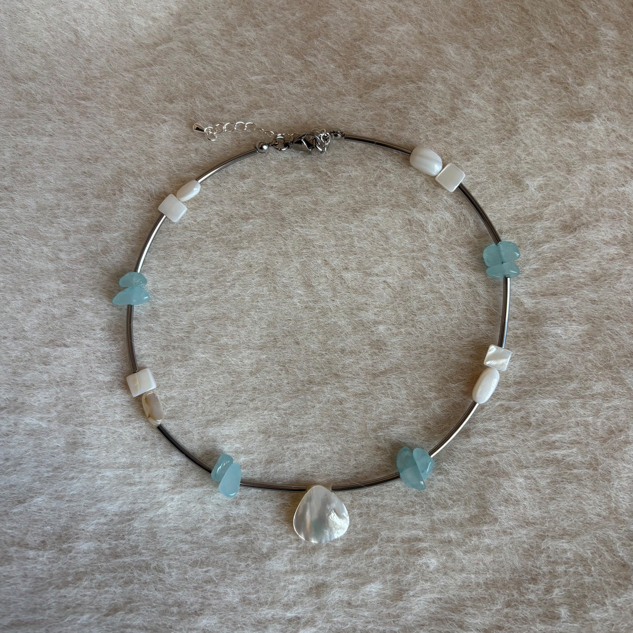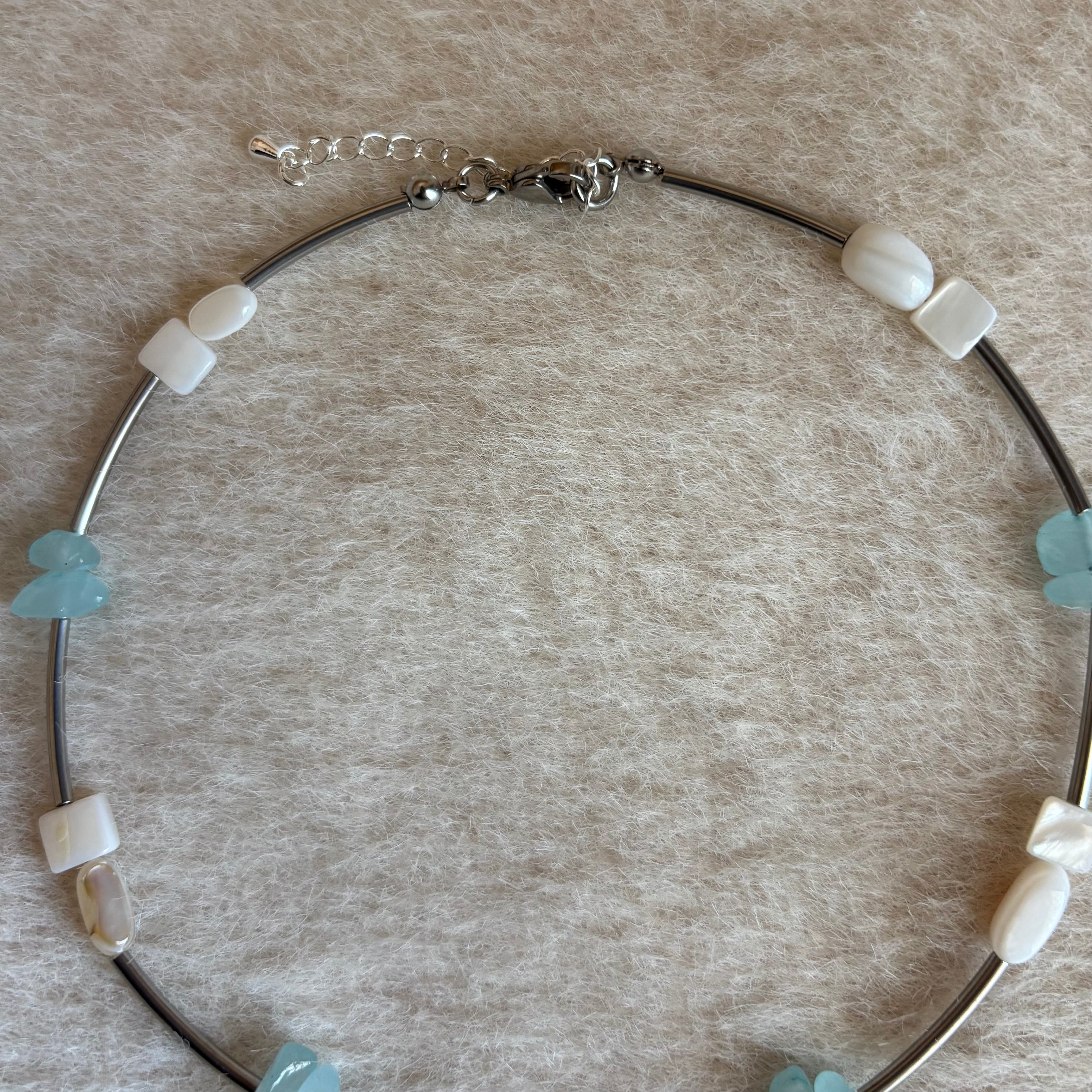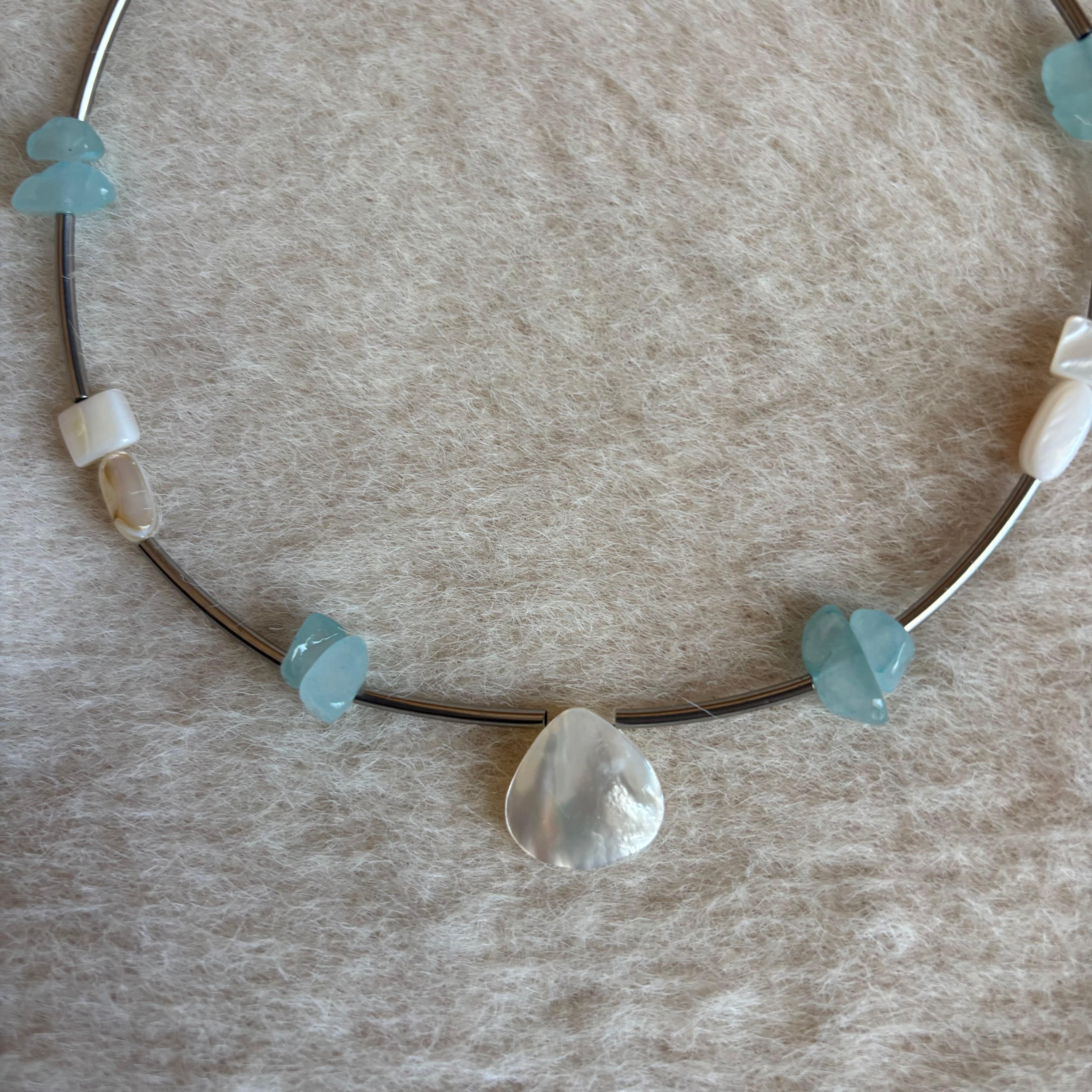 透き通るブルーの石と天然淡水シェルの輝きが印象的なデザイン。
