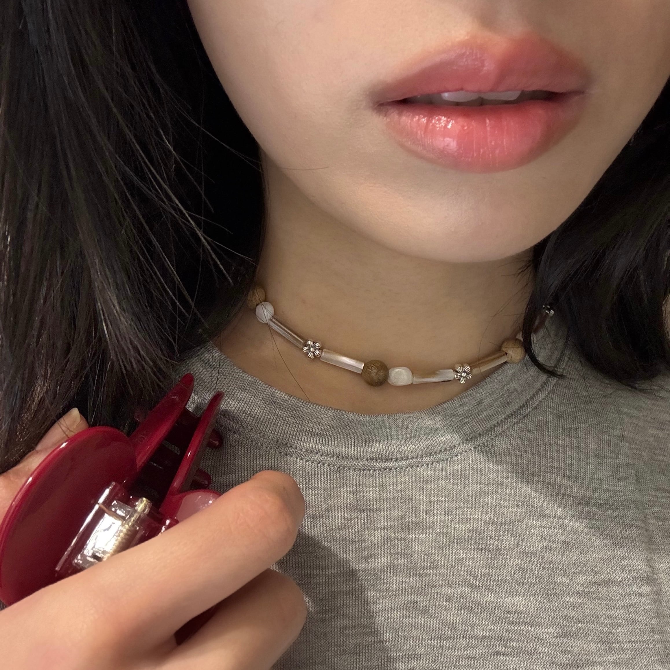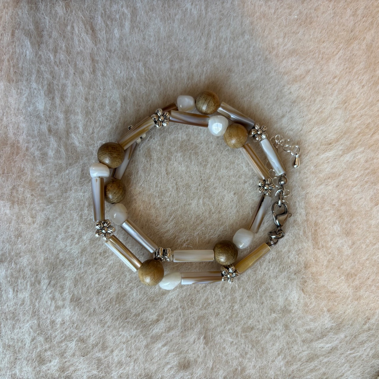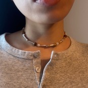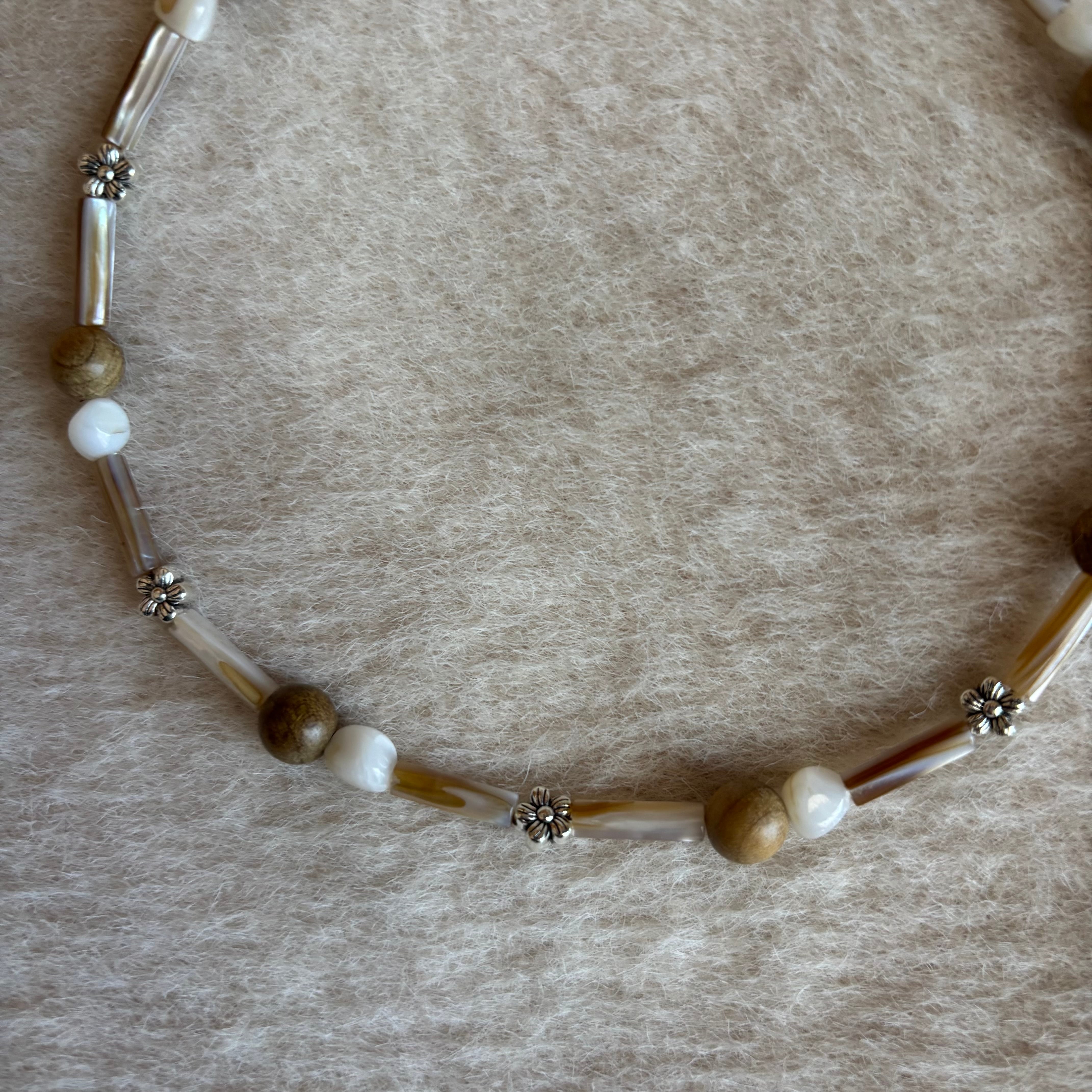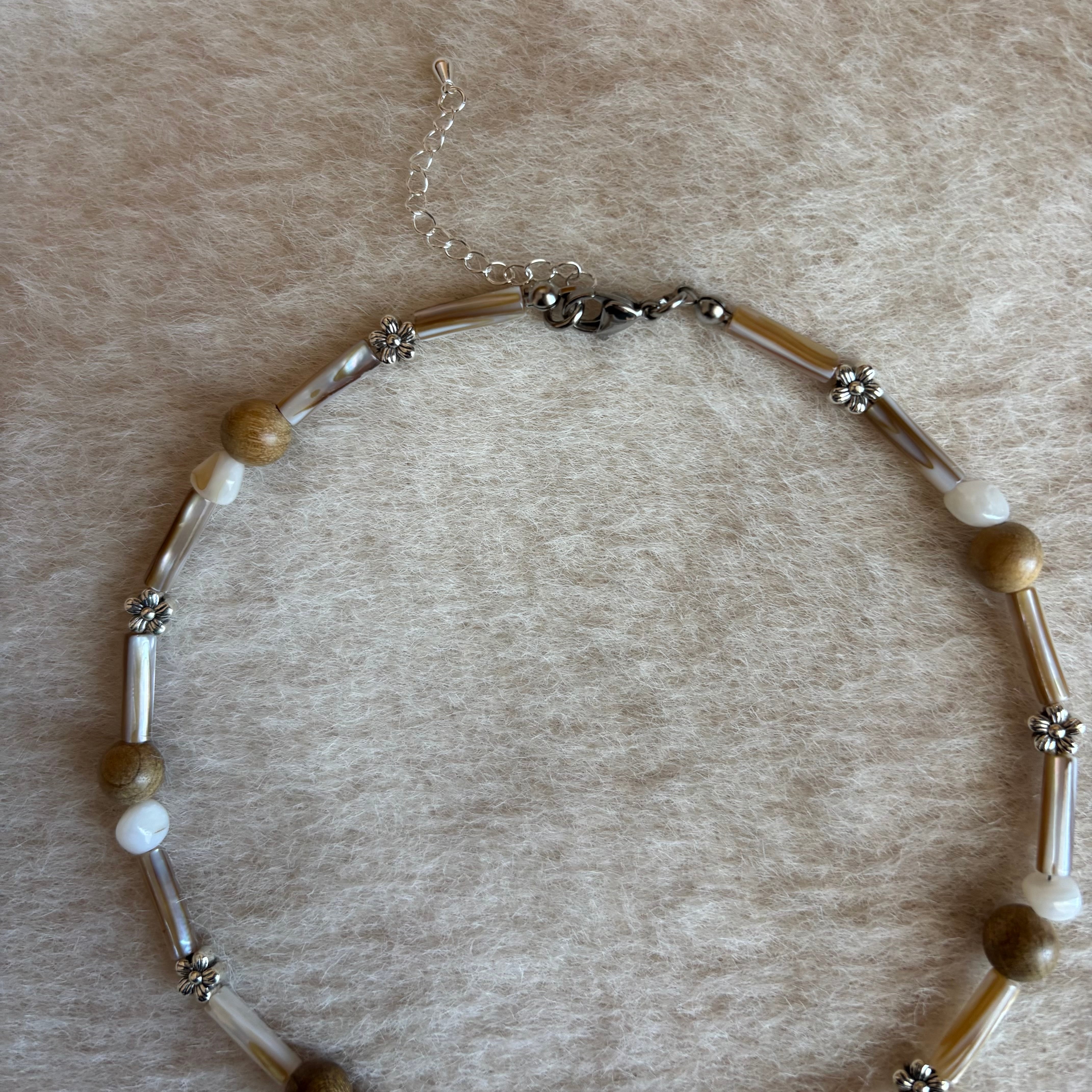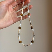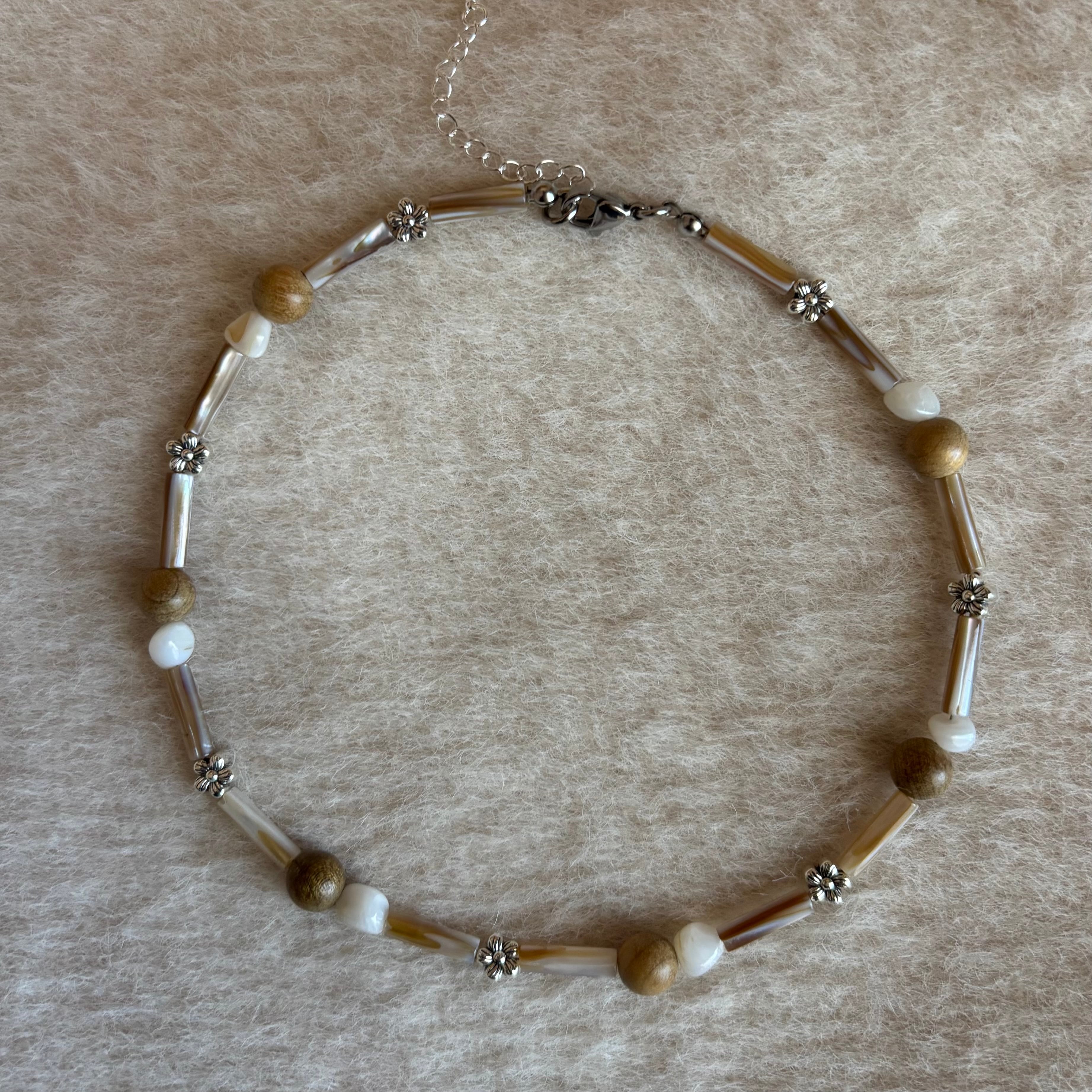 落ち着いたウッドトーンでまとめた温かみのあるネックレス。