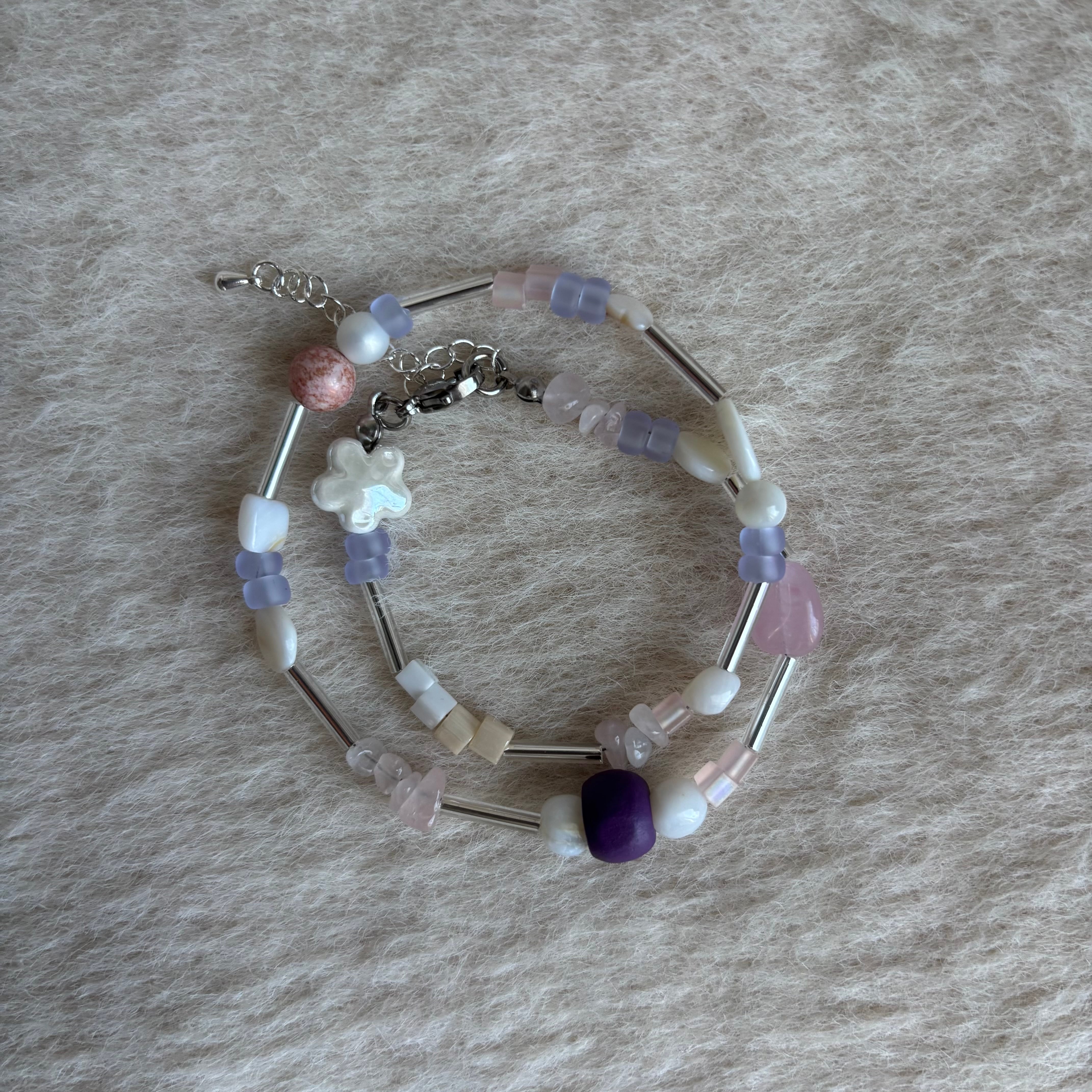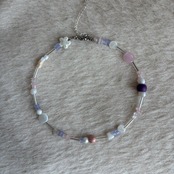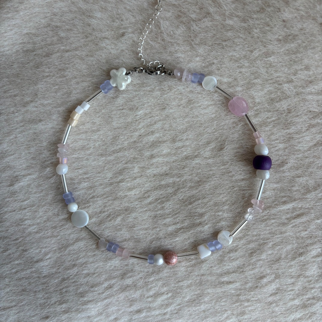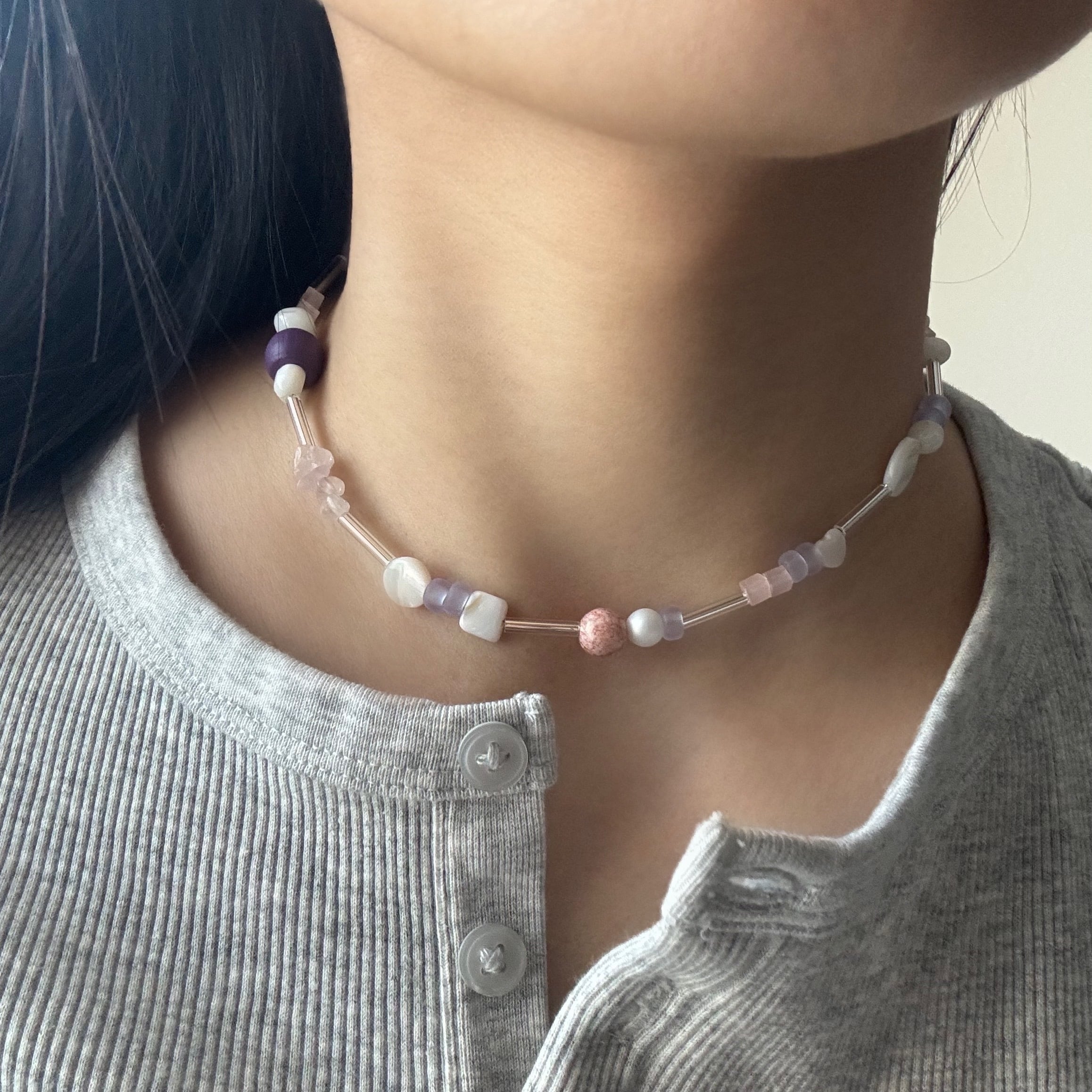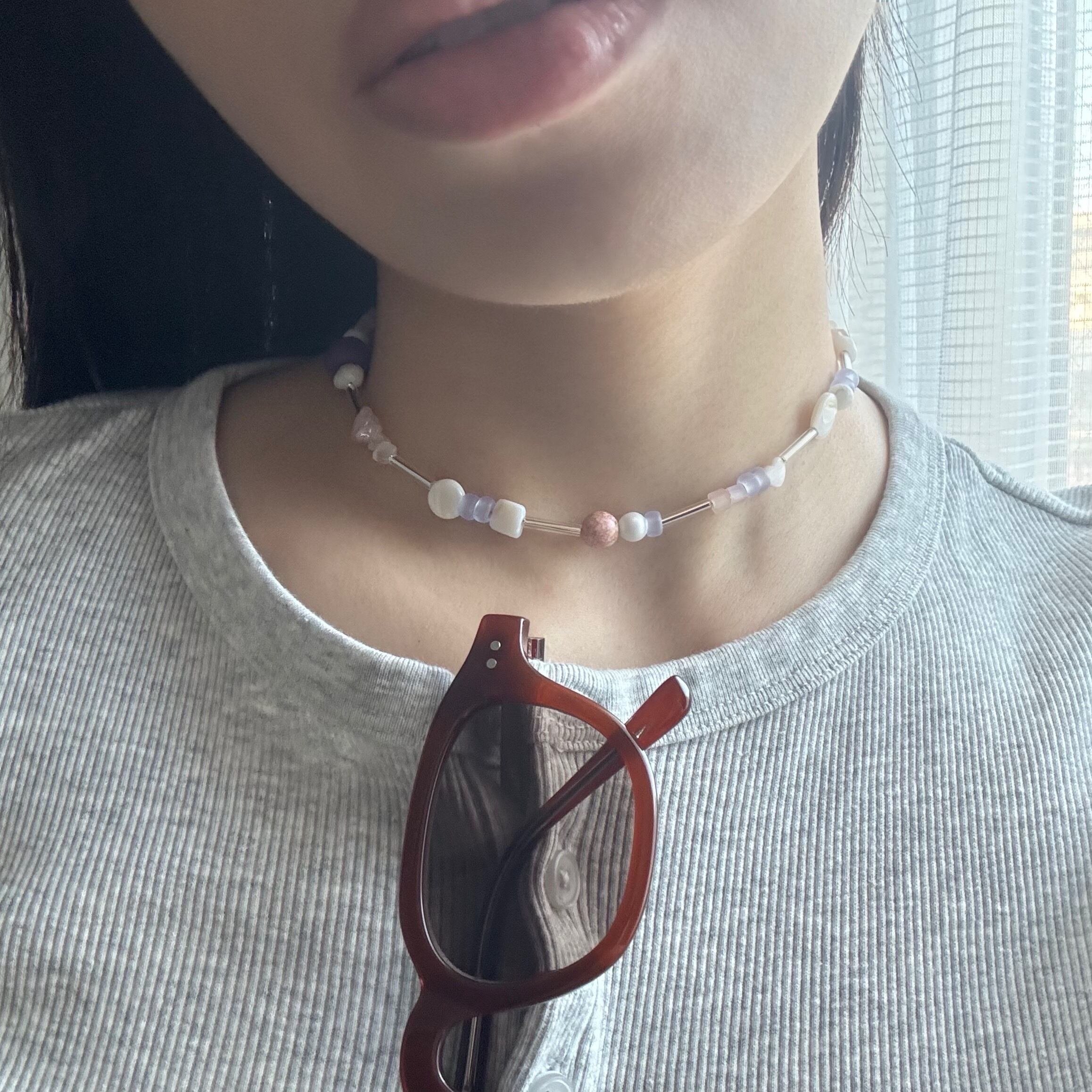 ミルキーホワイトやクリア素材を組み合わせた、静かにきらめくネックレス。
