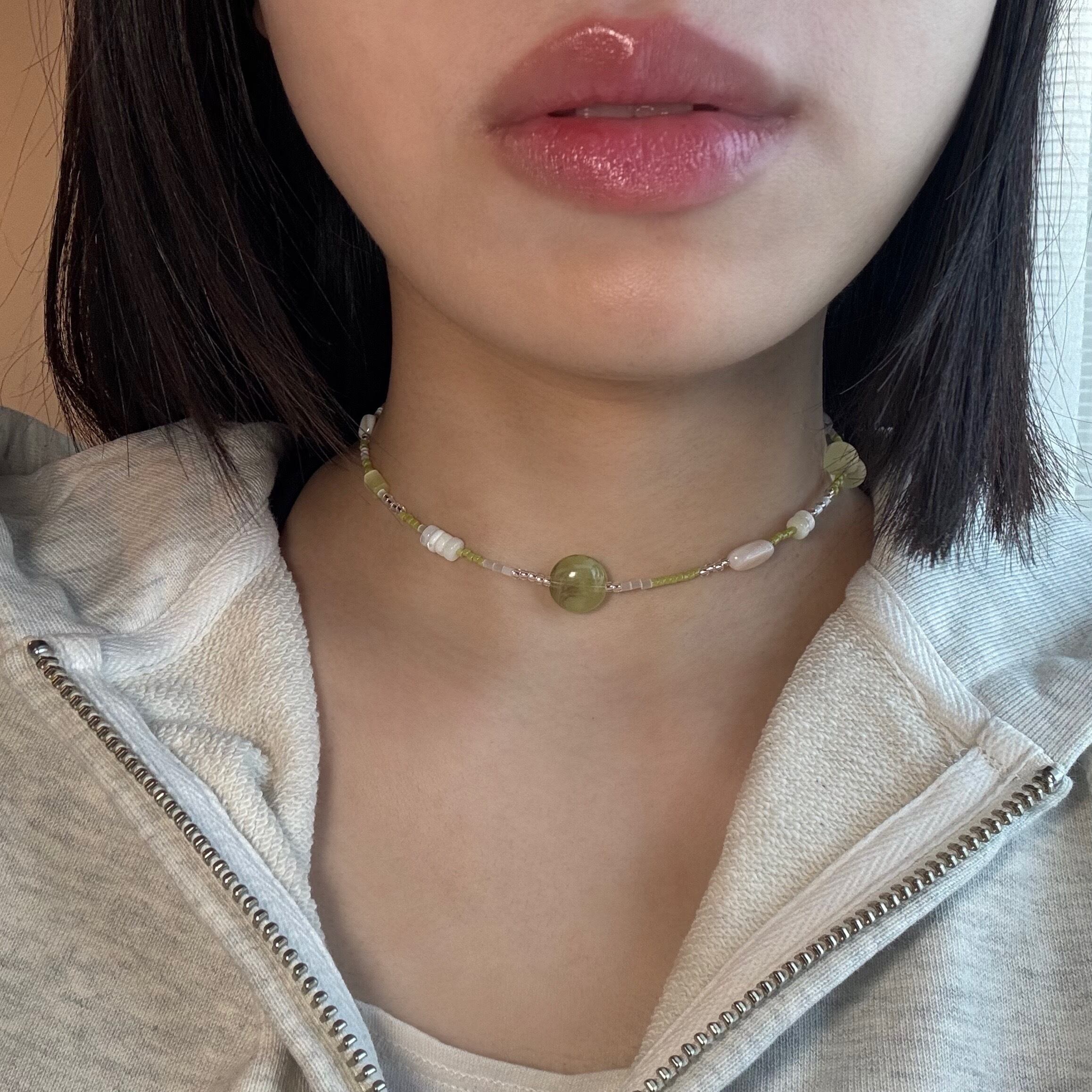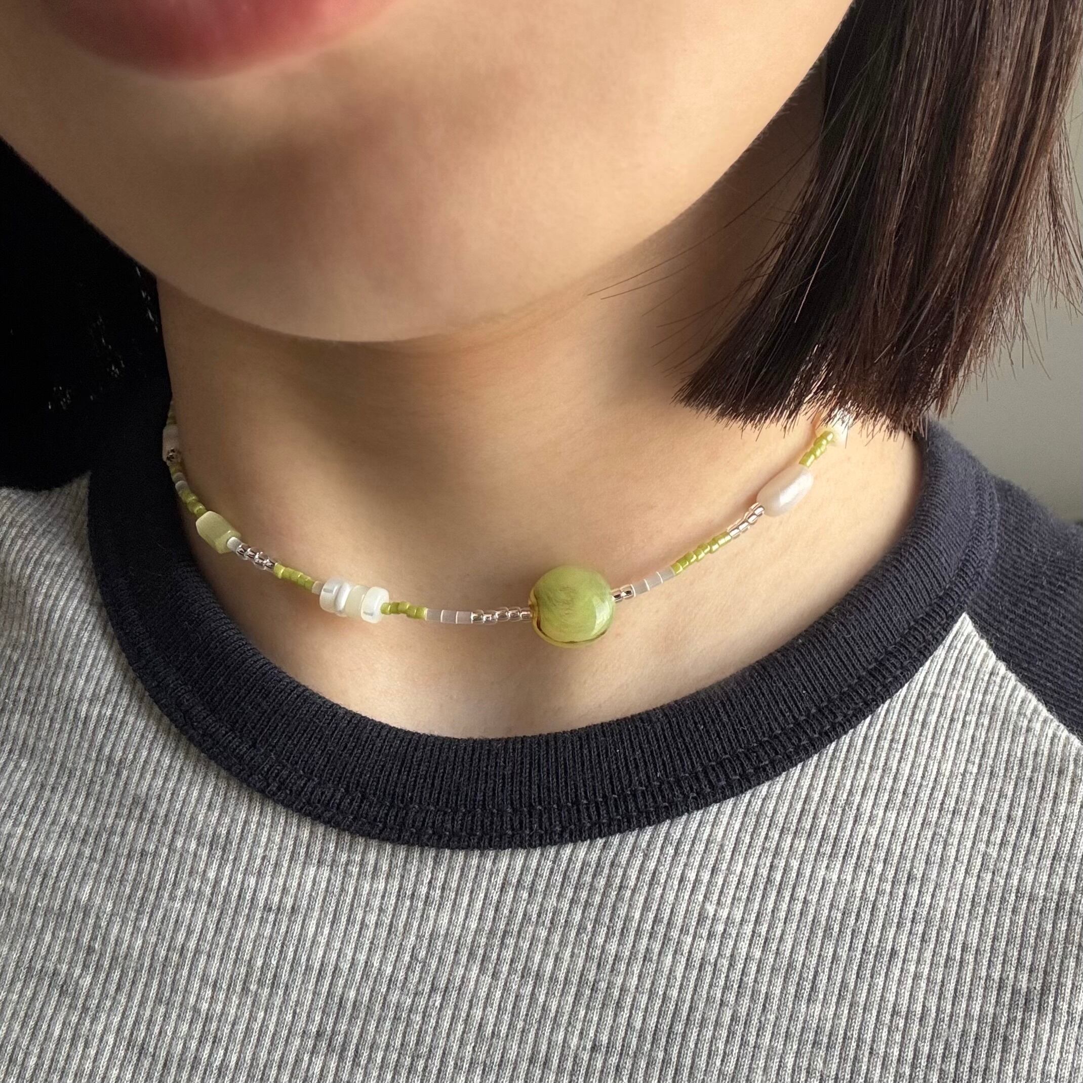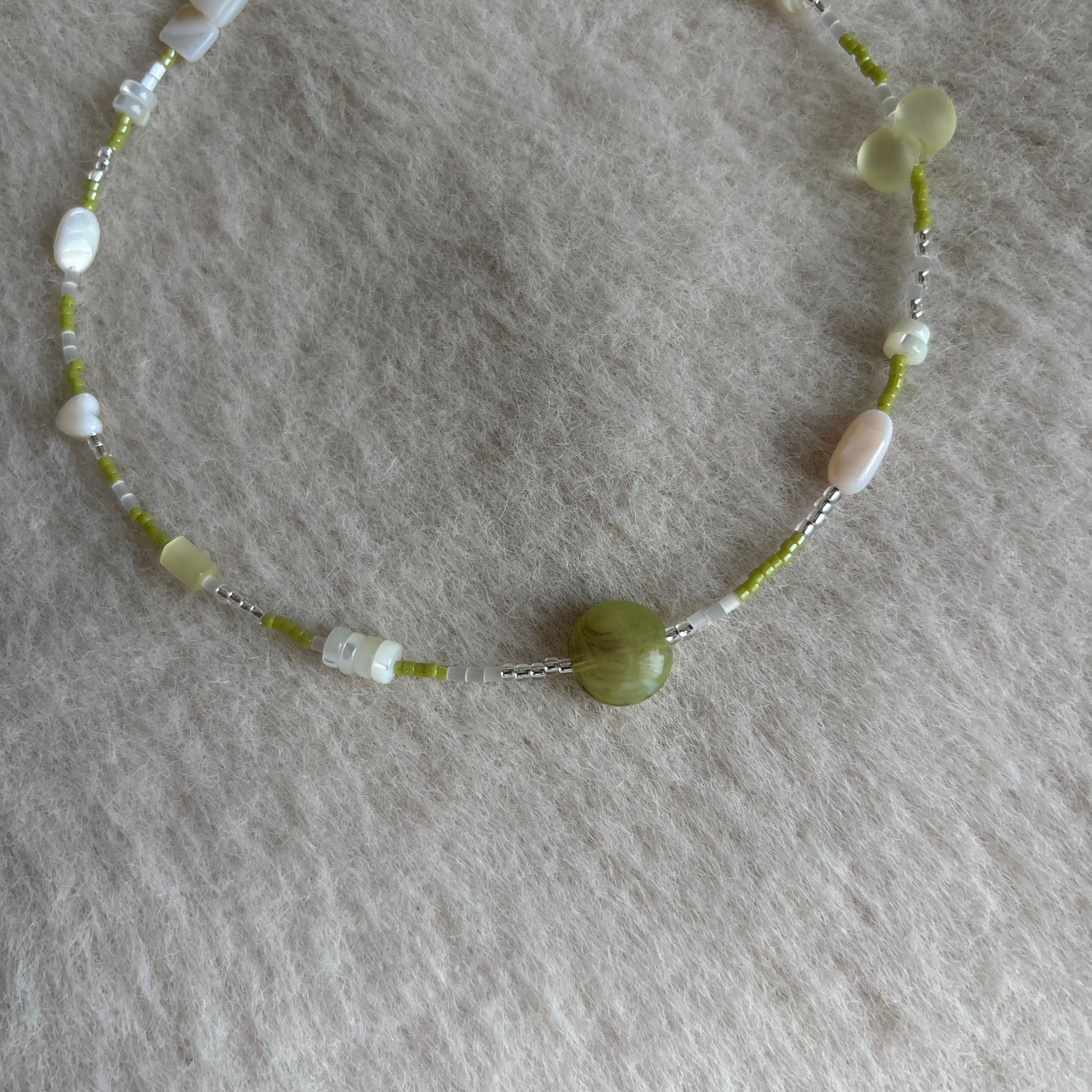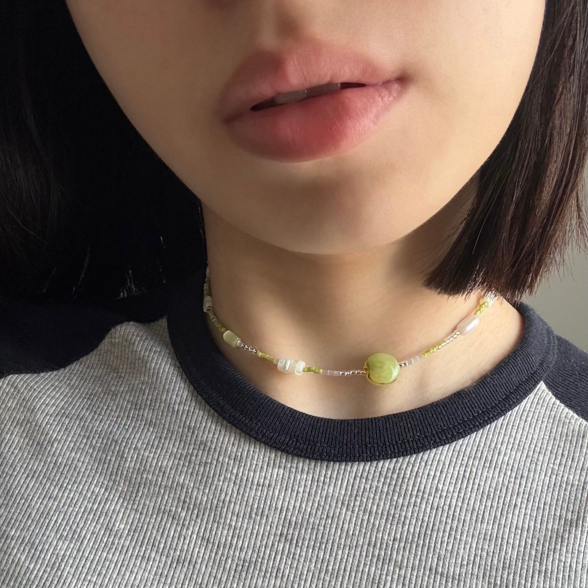 淡いグリーン×ホワイトの優しい雰囲気のネックレスは、シンプルながらも首元にじんわり存在感を与えます。