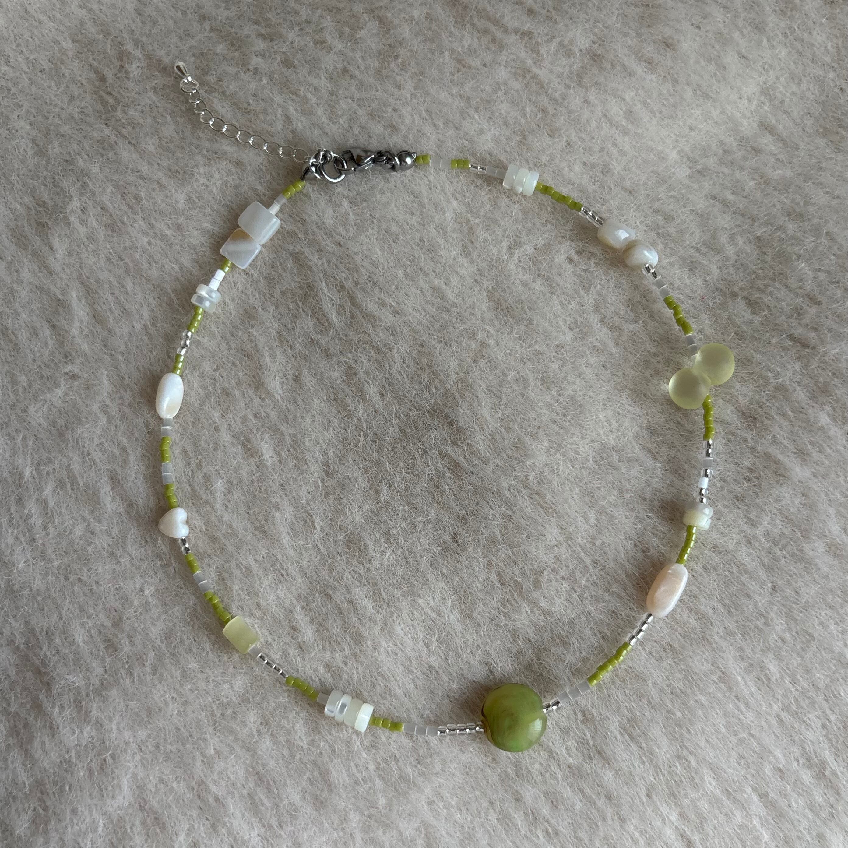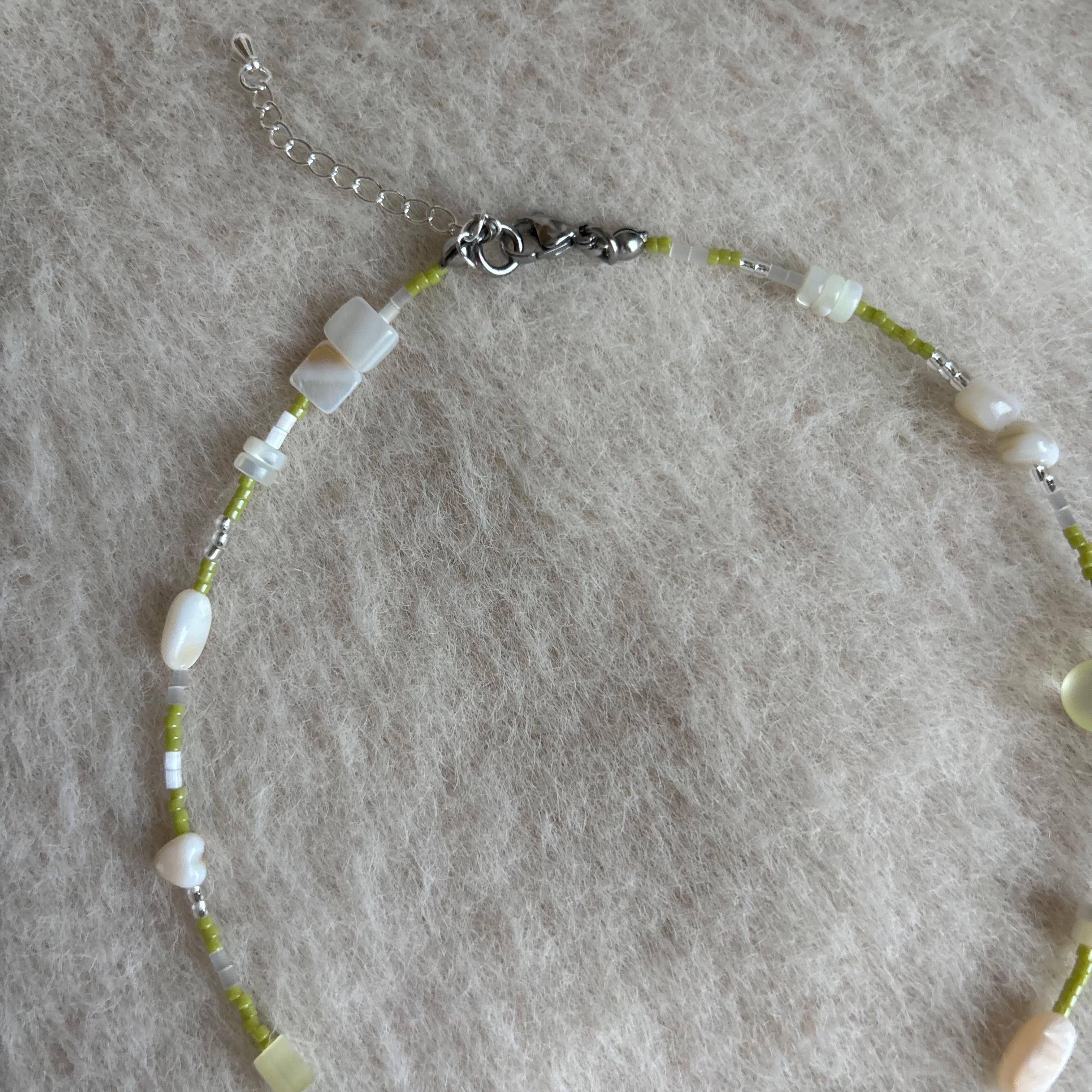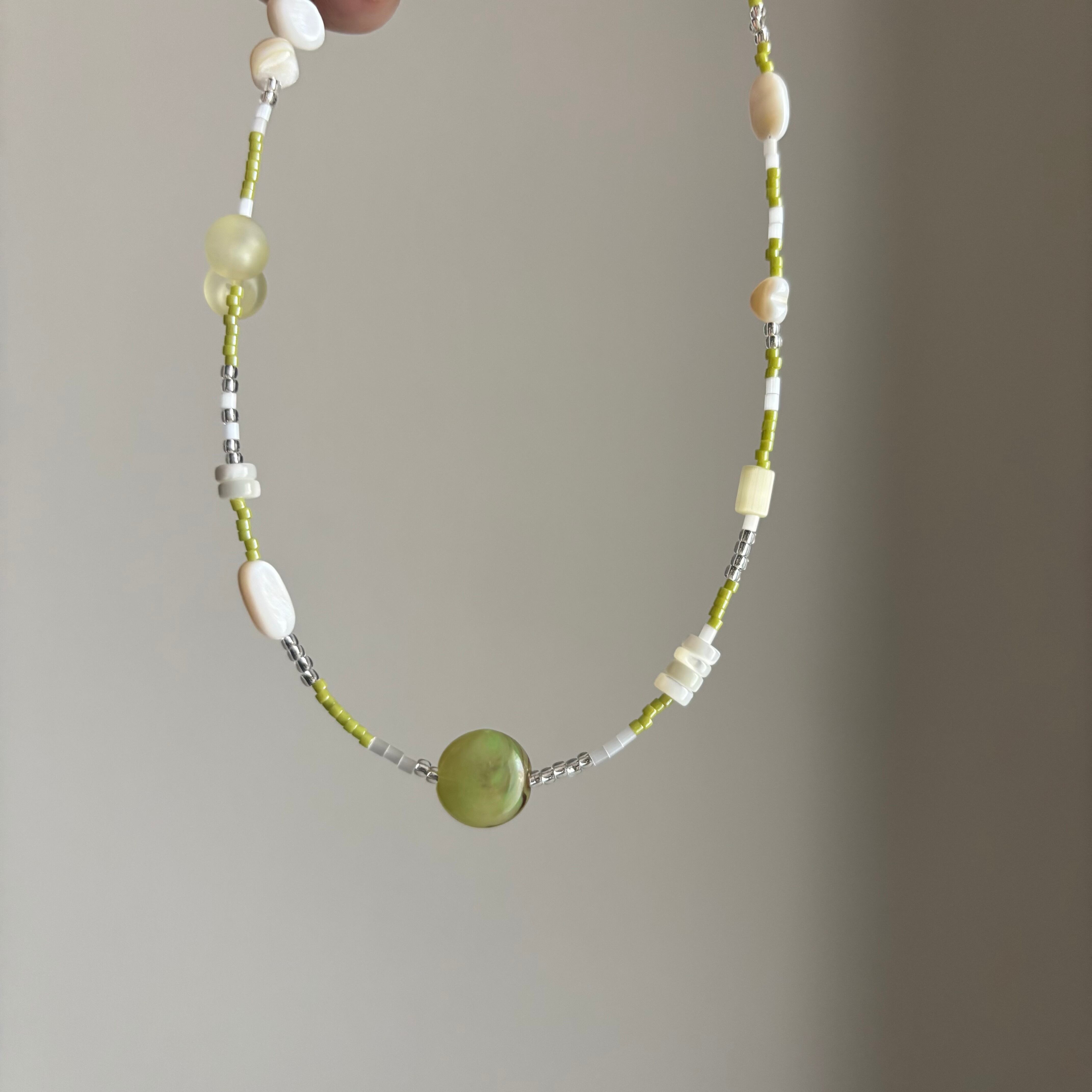 淡いグリーン×ホワイトの優しい雰囲気のネックレスは、シンプルながらも首元にじんわり存在感を与えます。