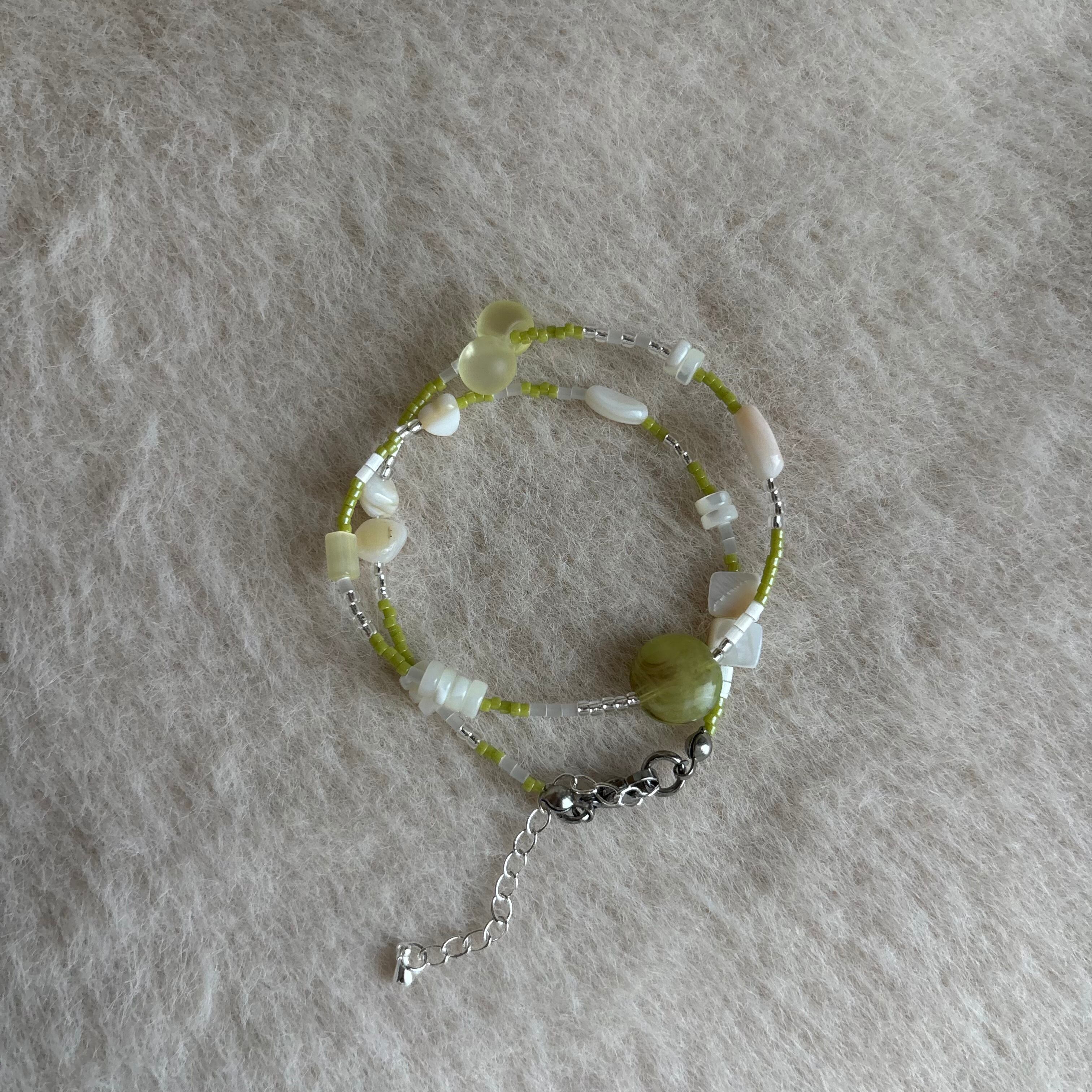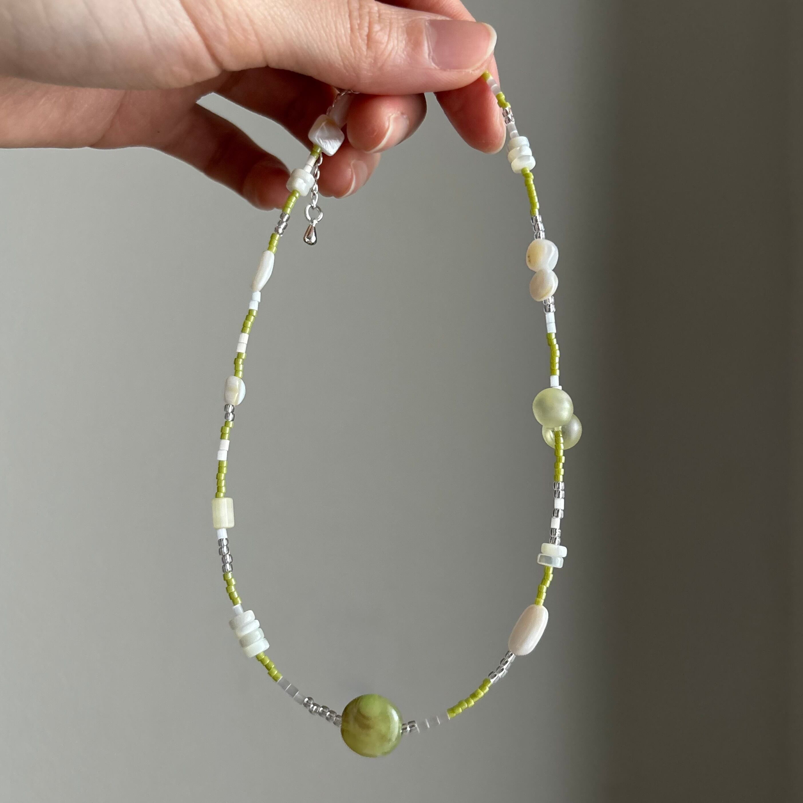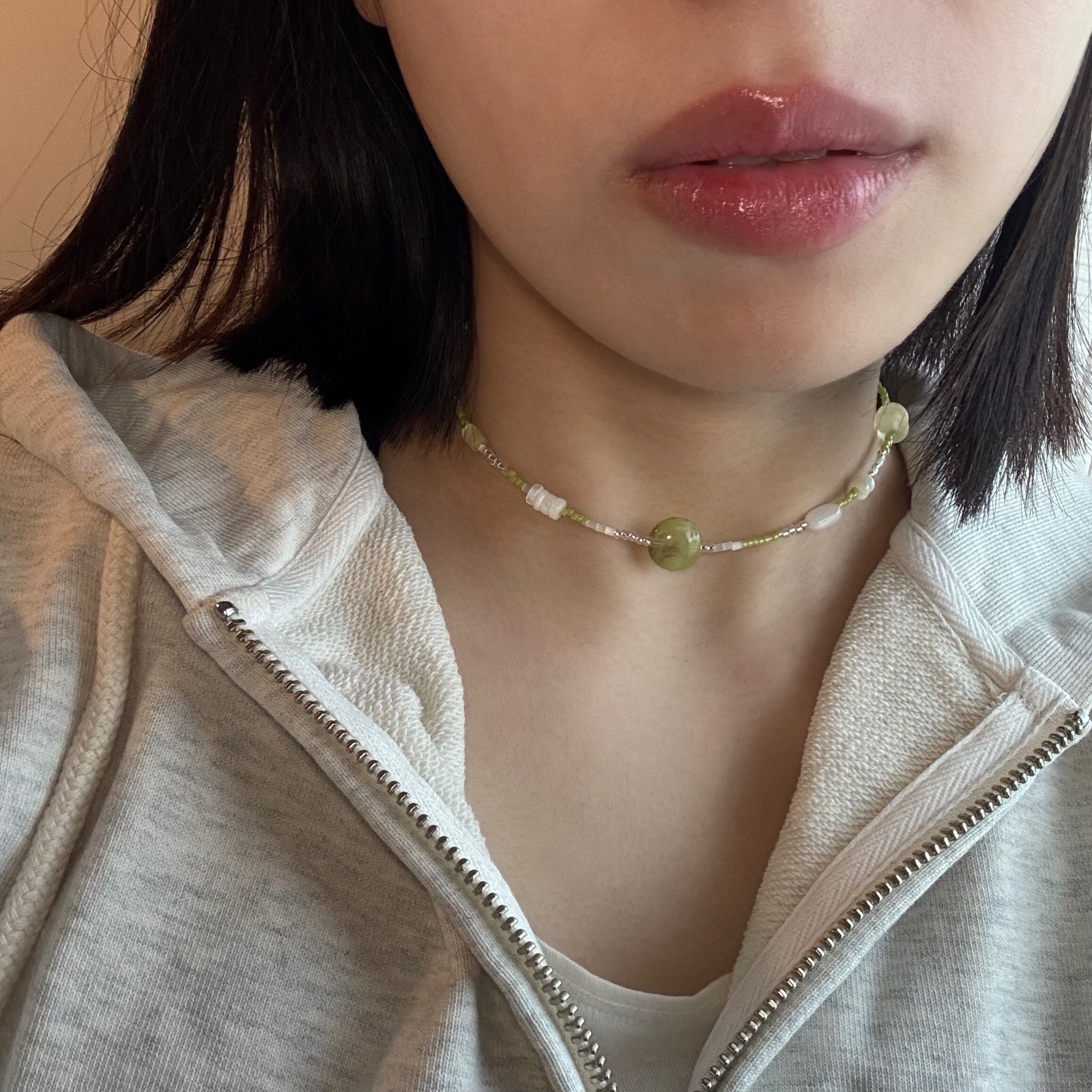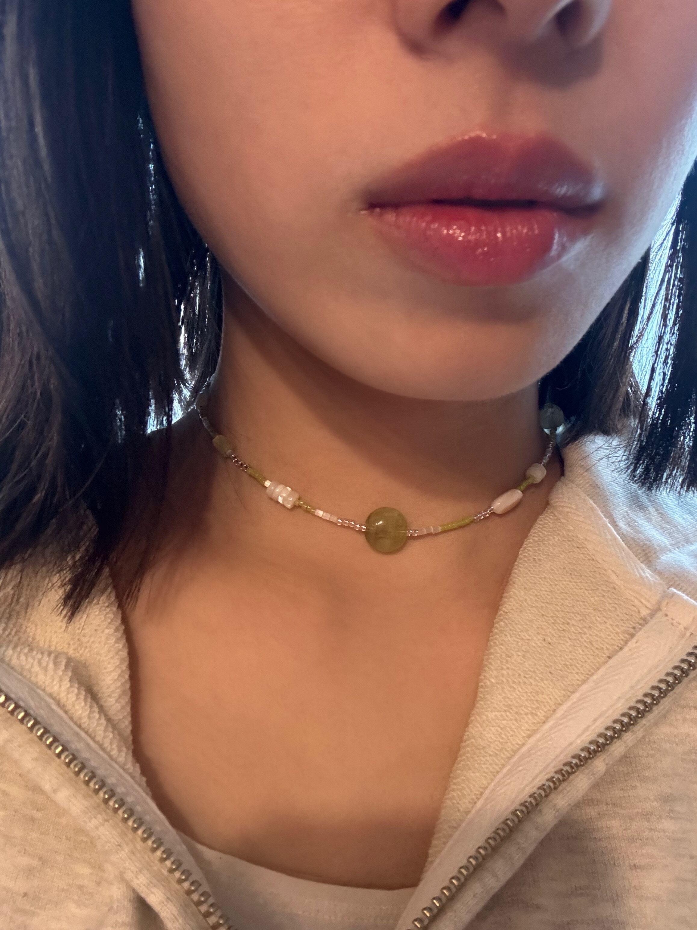 淡いグリーン×ホワイトの優しい雰囲気のネックレスは、シンプルながらも首元にじんわり存在感を与えます。