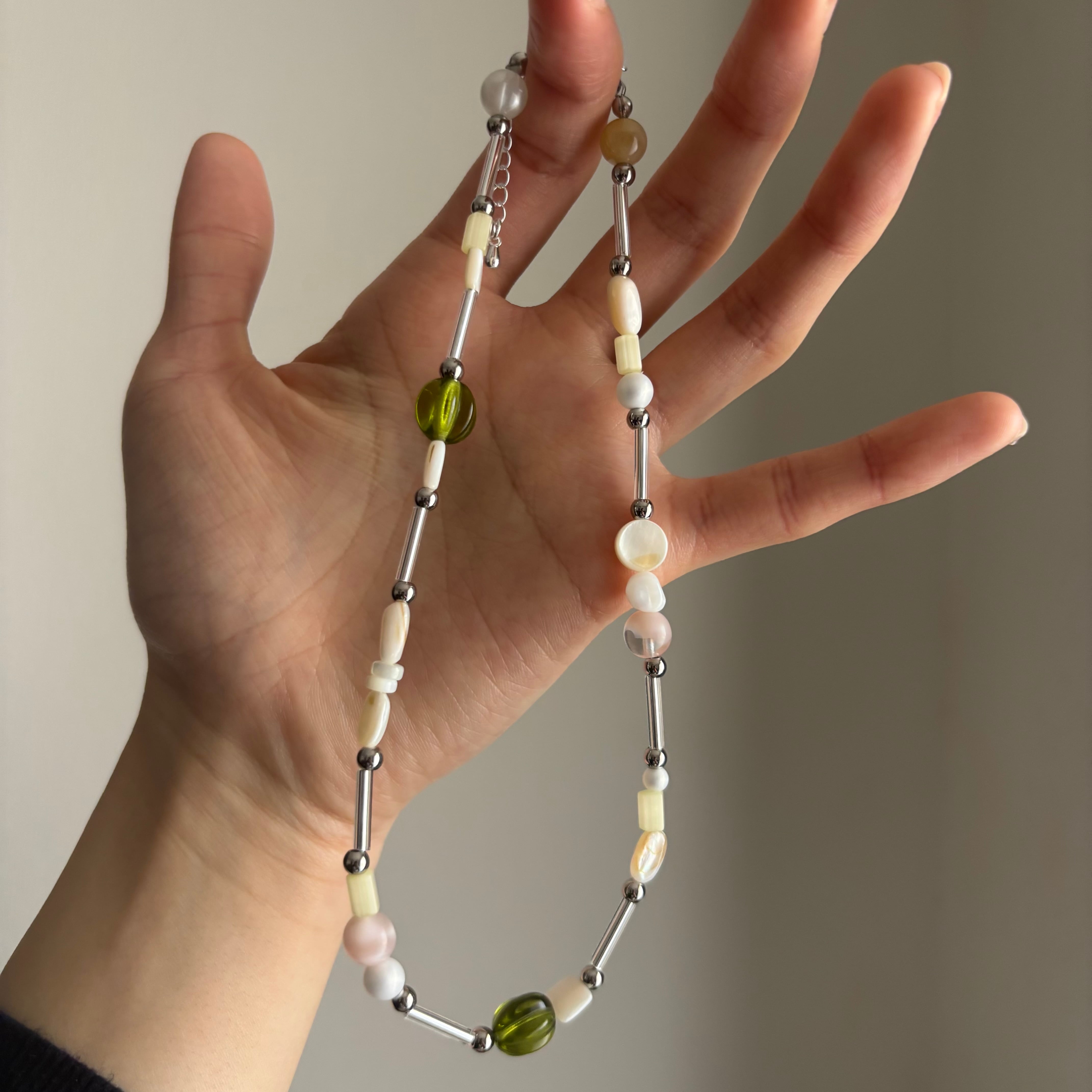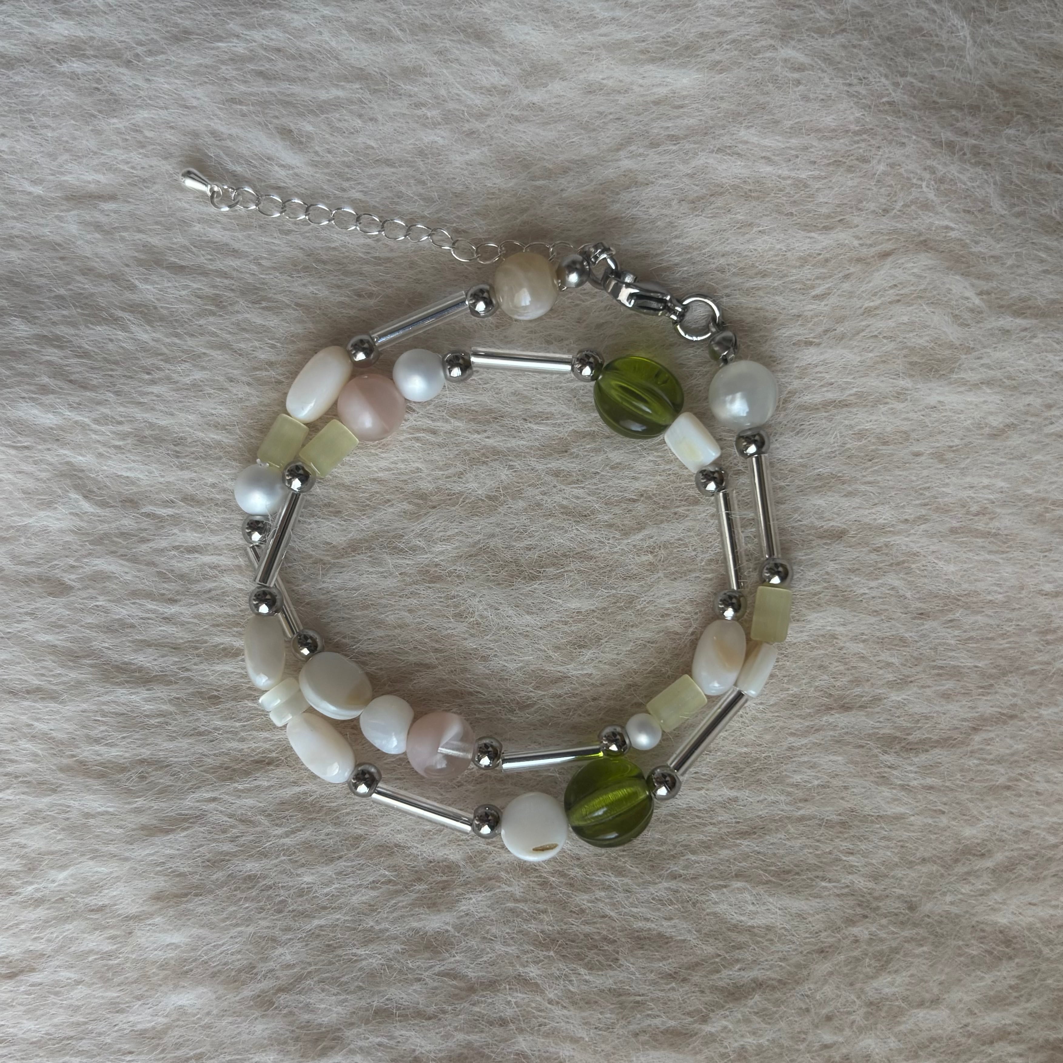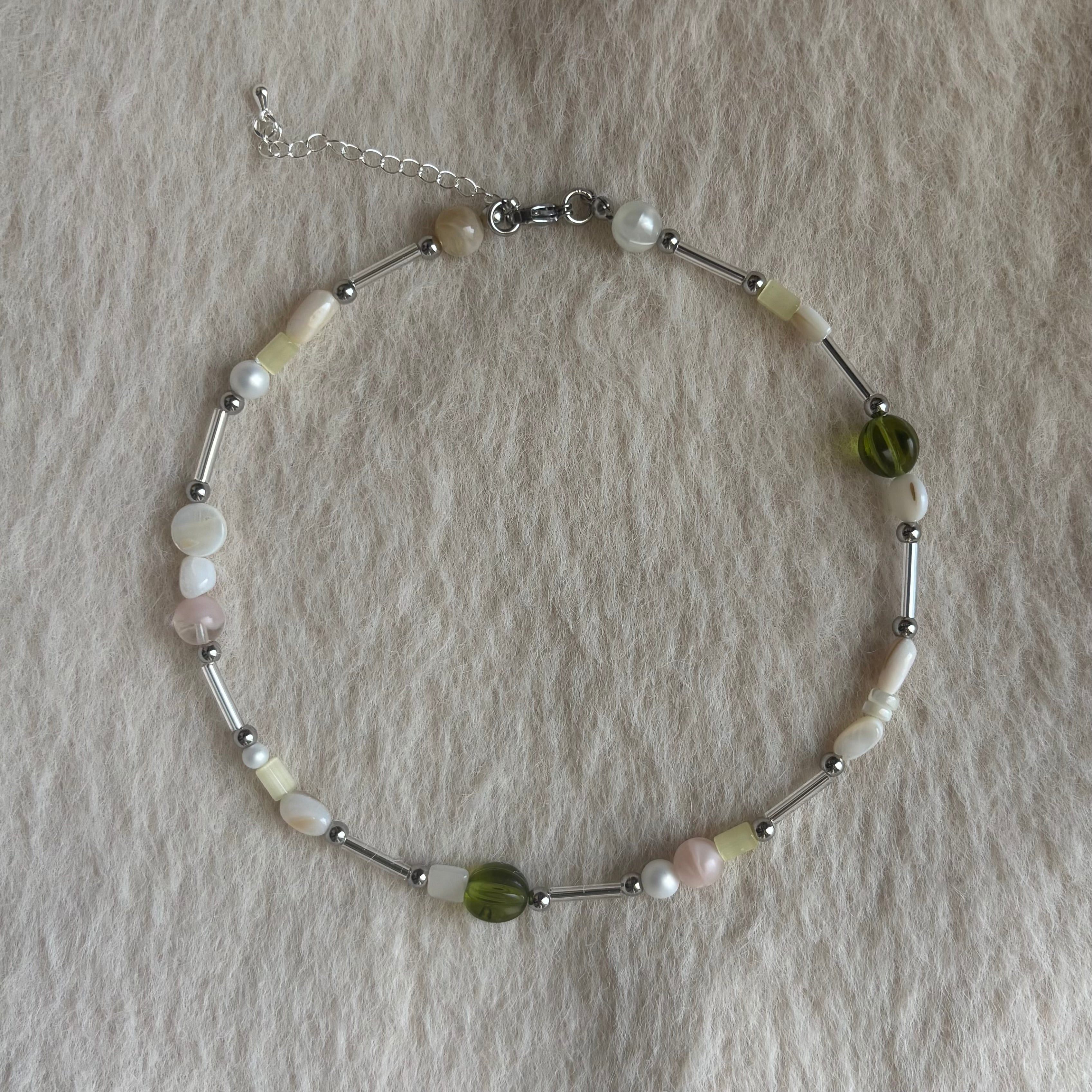 オリーブを思わせる深みのあるグリーンビーズを主役に、透明感のあるパールやミルキーカラーのビーズを繊細に組み合わせ、ナチュラルで洗練された印象に仕上げました。