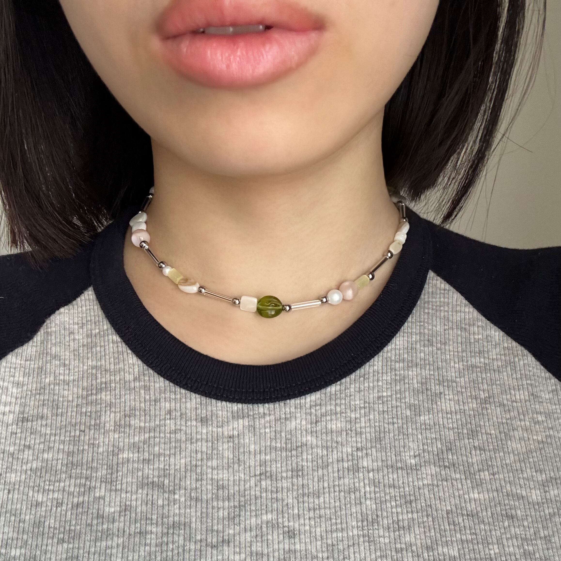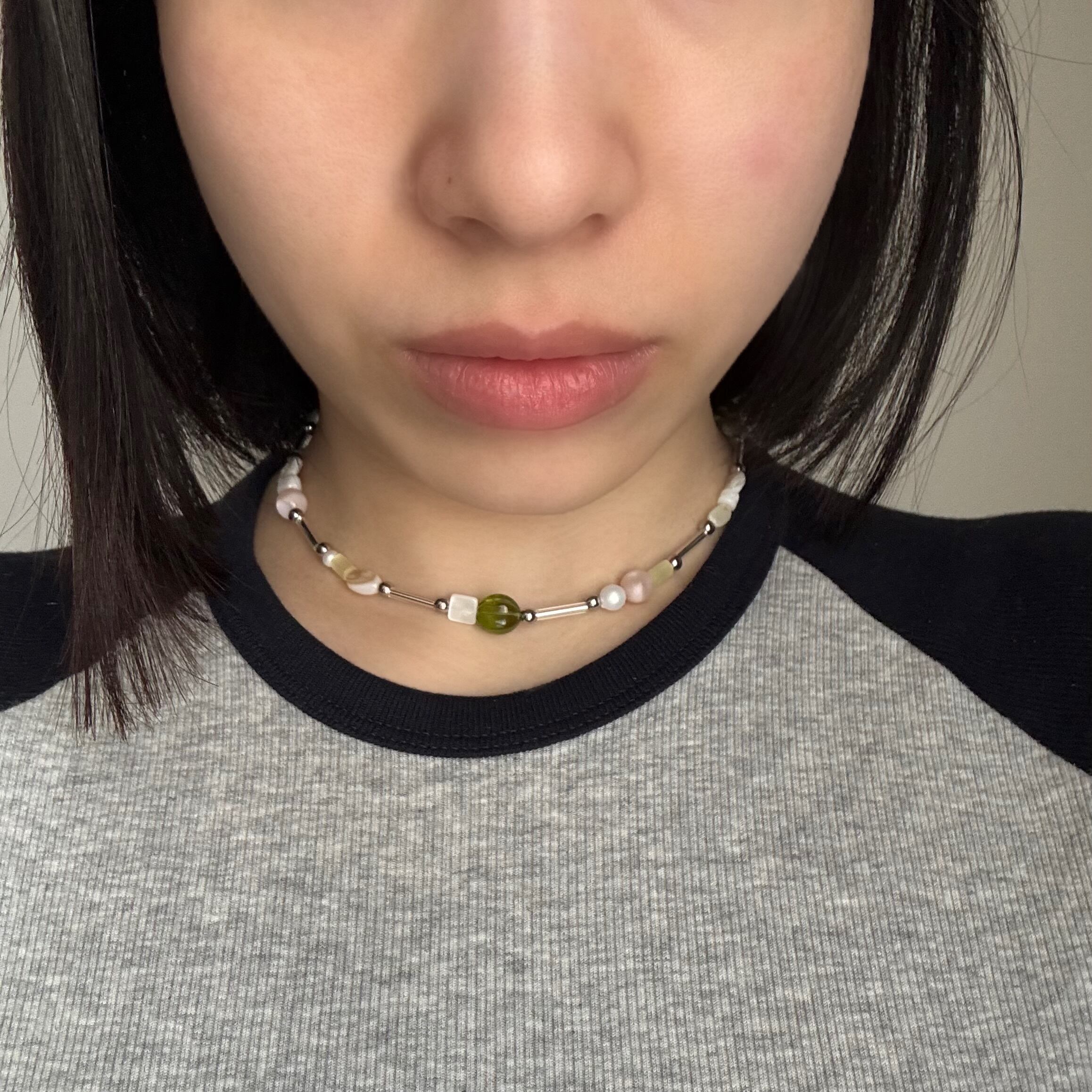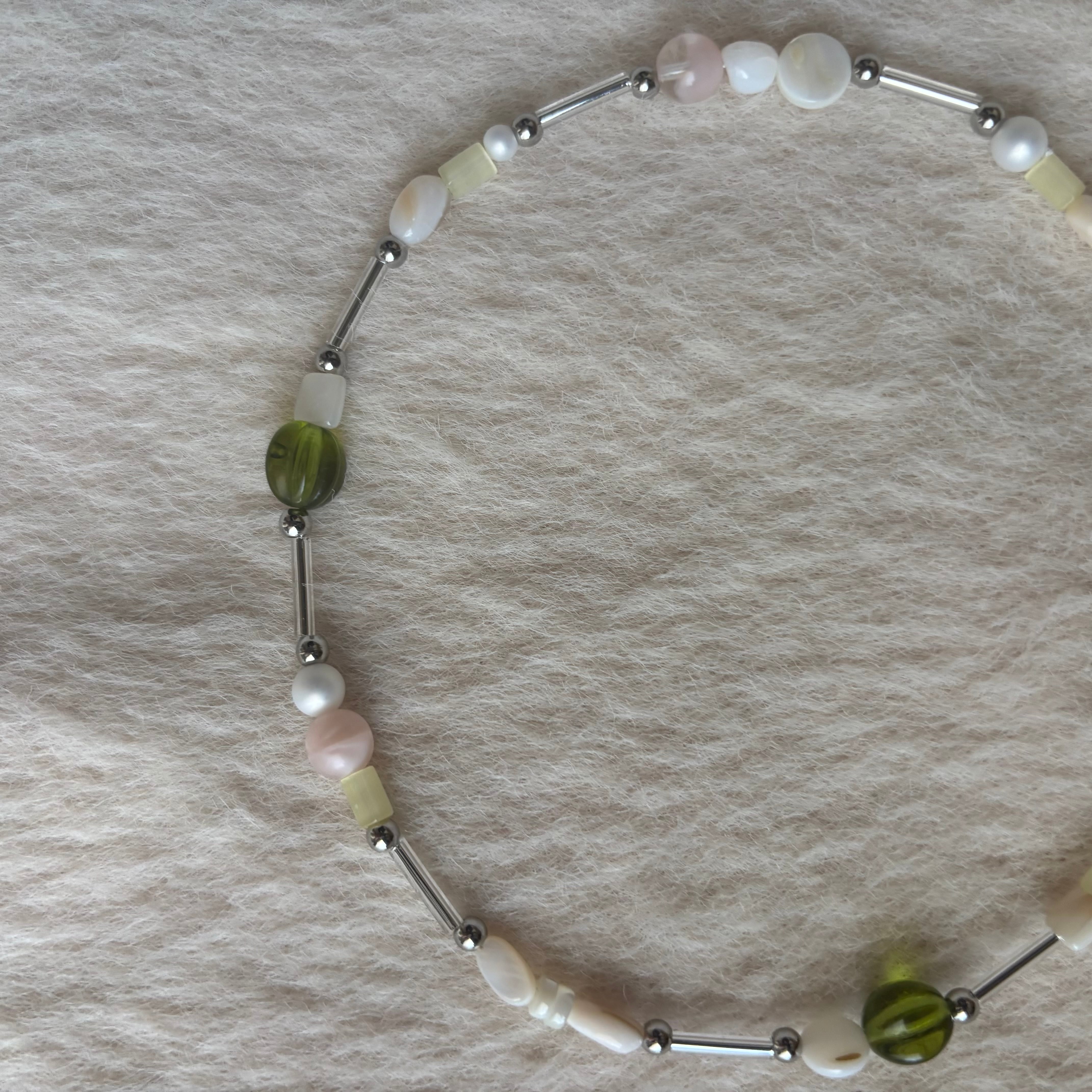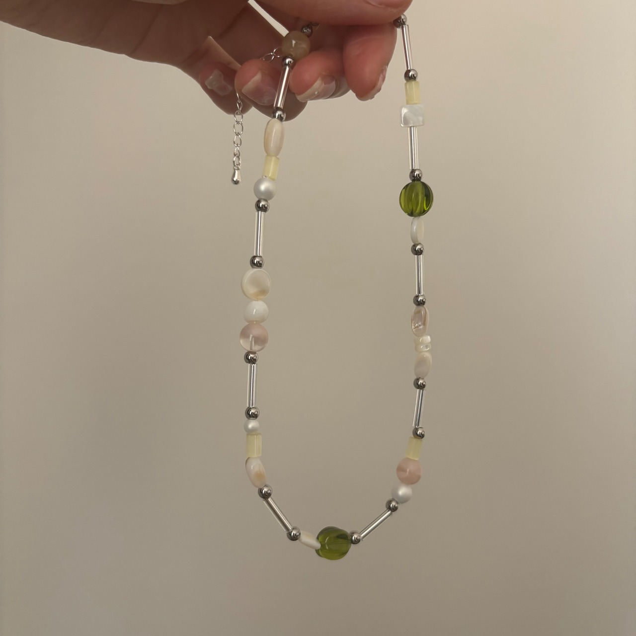 オリーブを思わせる深みのあるグリーンビーズを主役に、透明感のあるパールやミルキーカラーのビーズを繊細に組み合わせ、ナチュラルで洗練された印象に仕上げました。