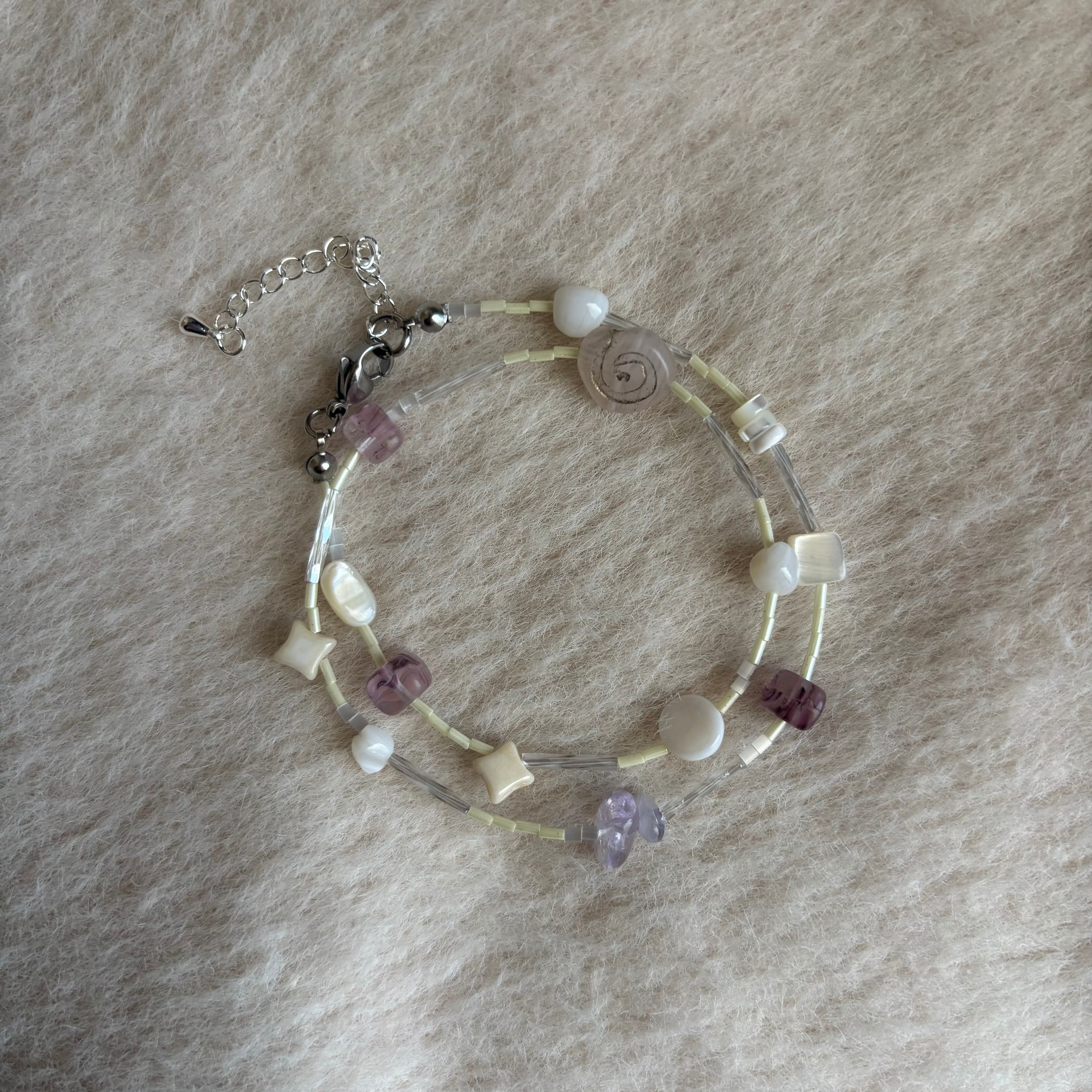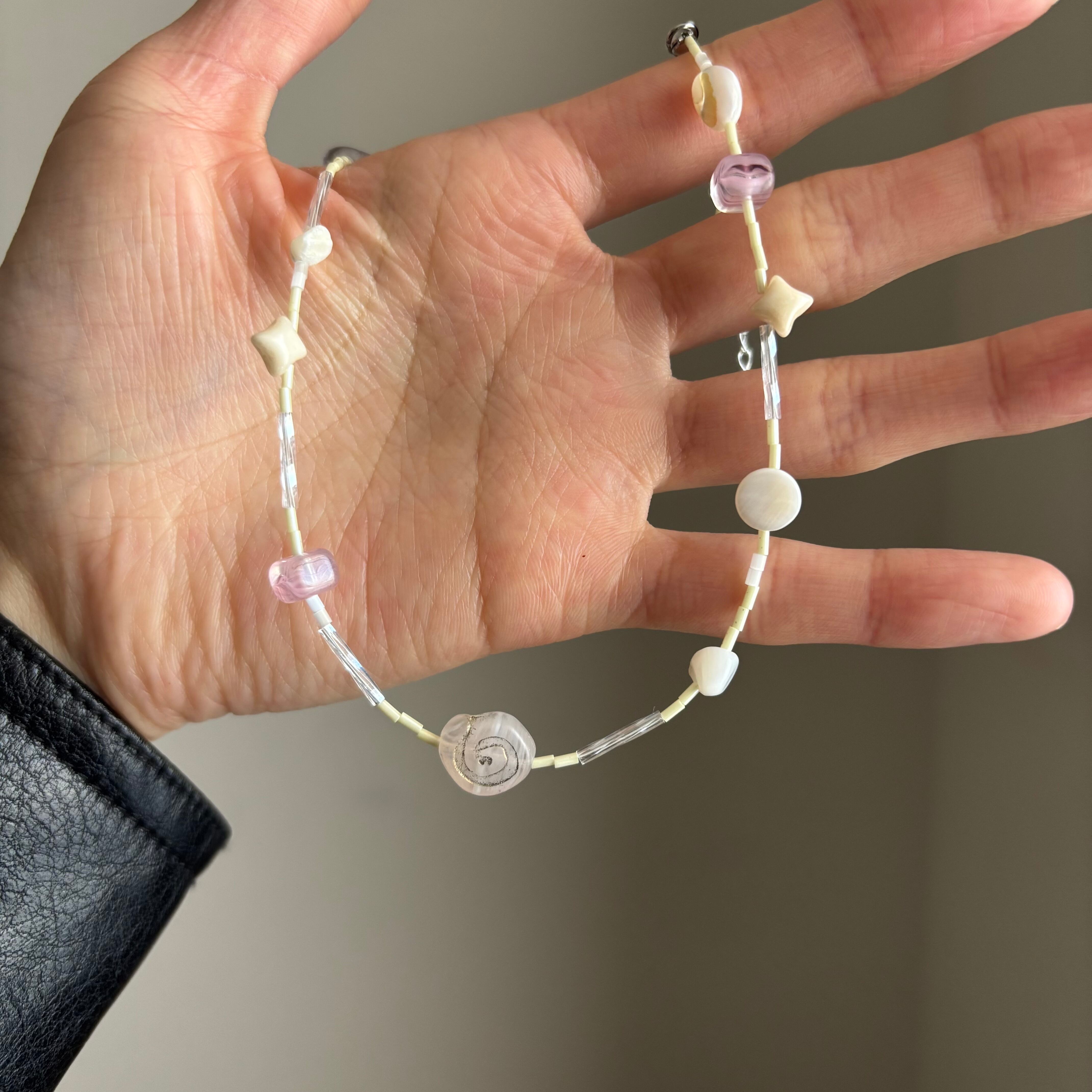 白や薄紫をベースとしたパーツをベースにくるりとした渦ビーズ。