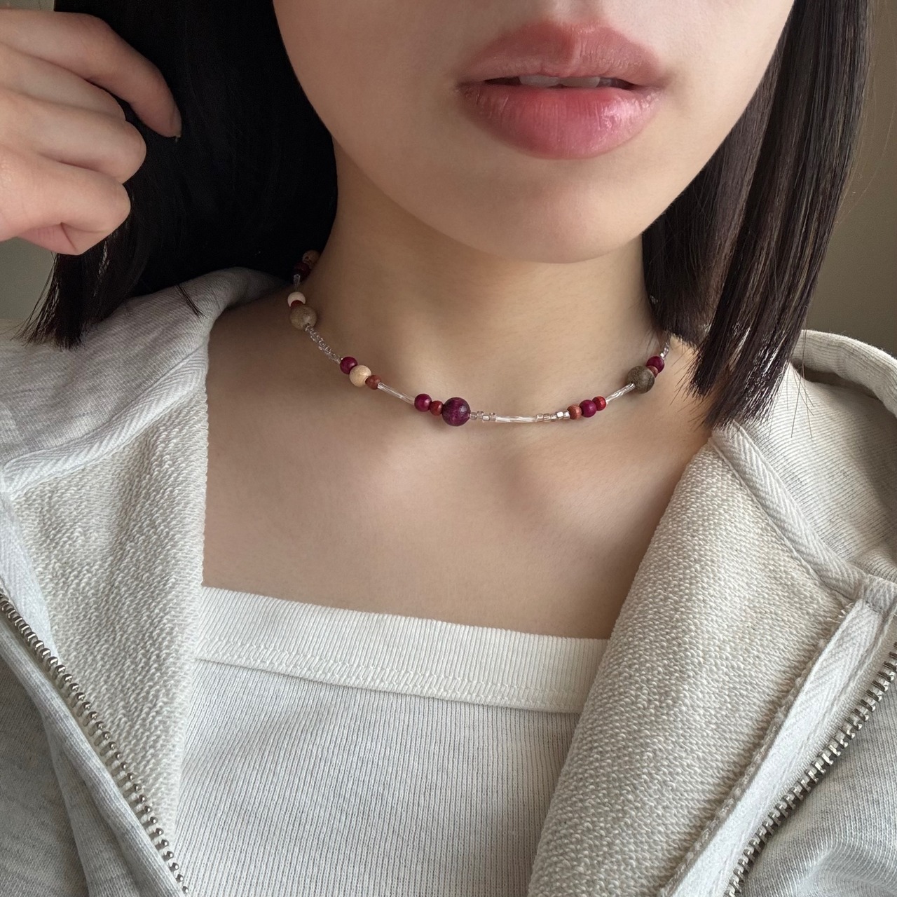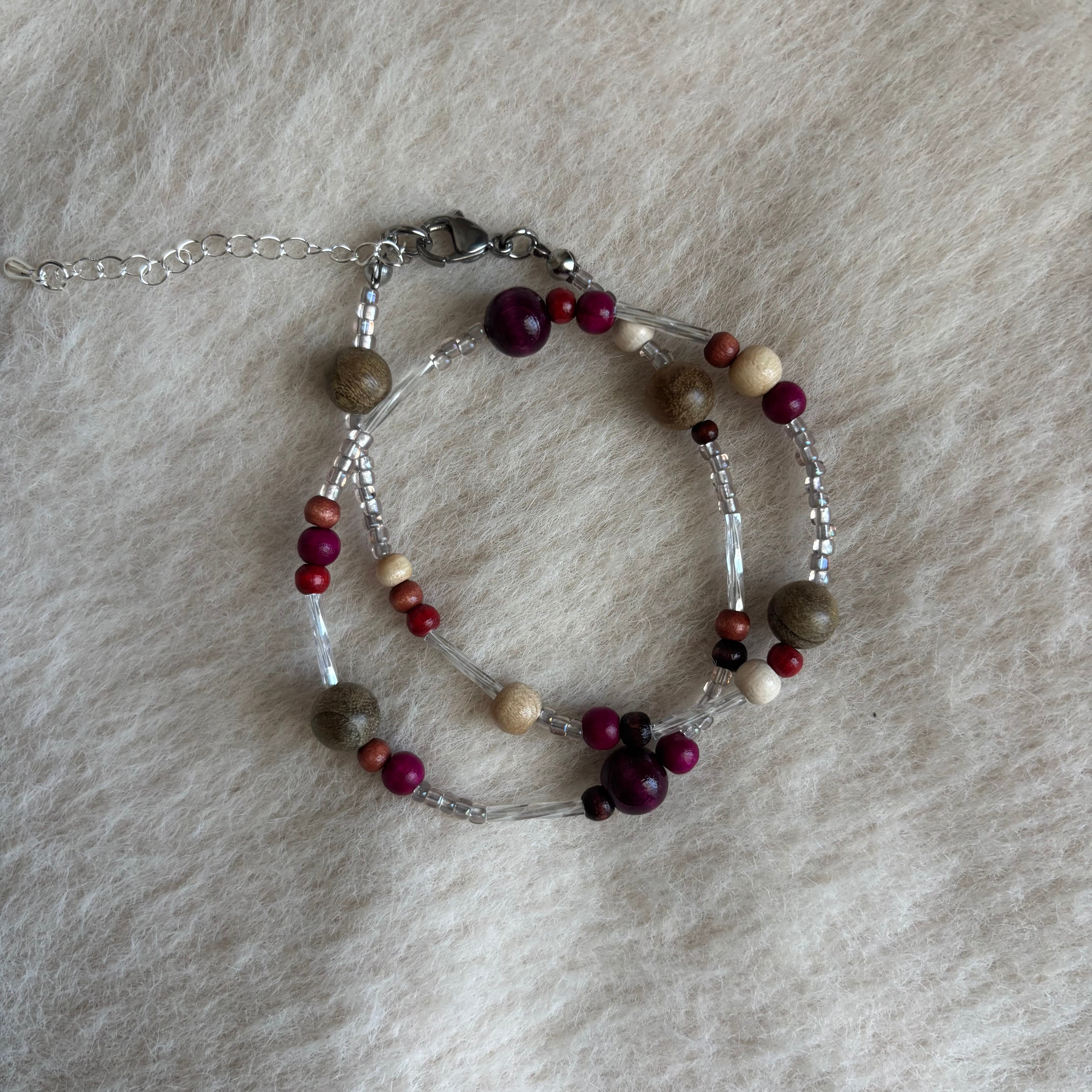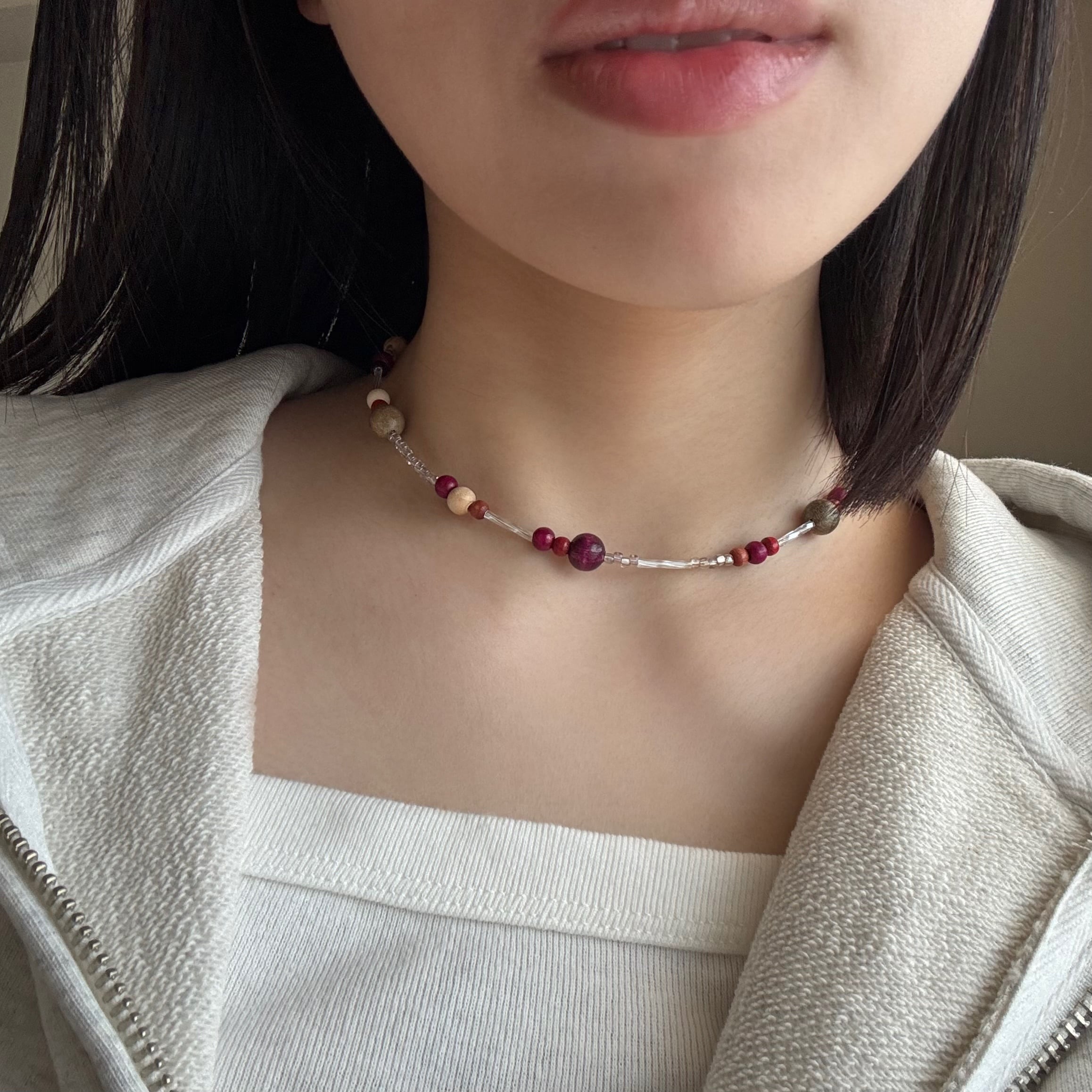 プラムカラーのウッドビーズがさりげないポイントに。