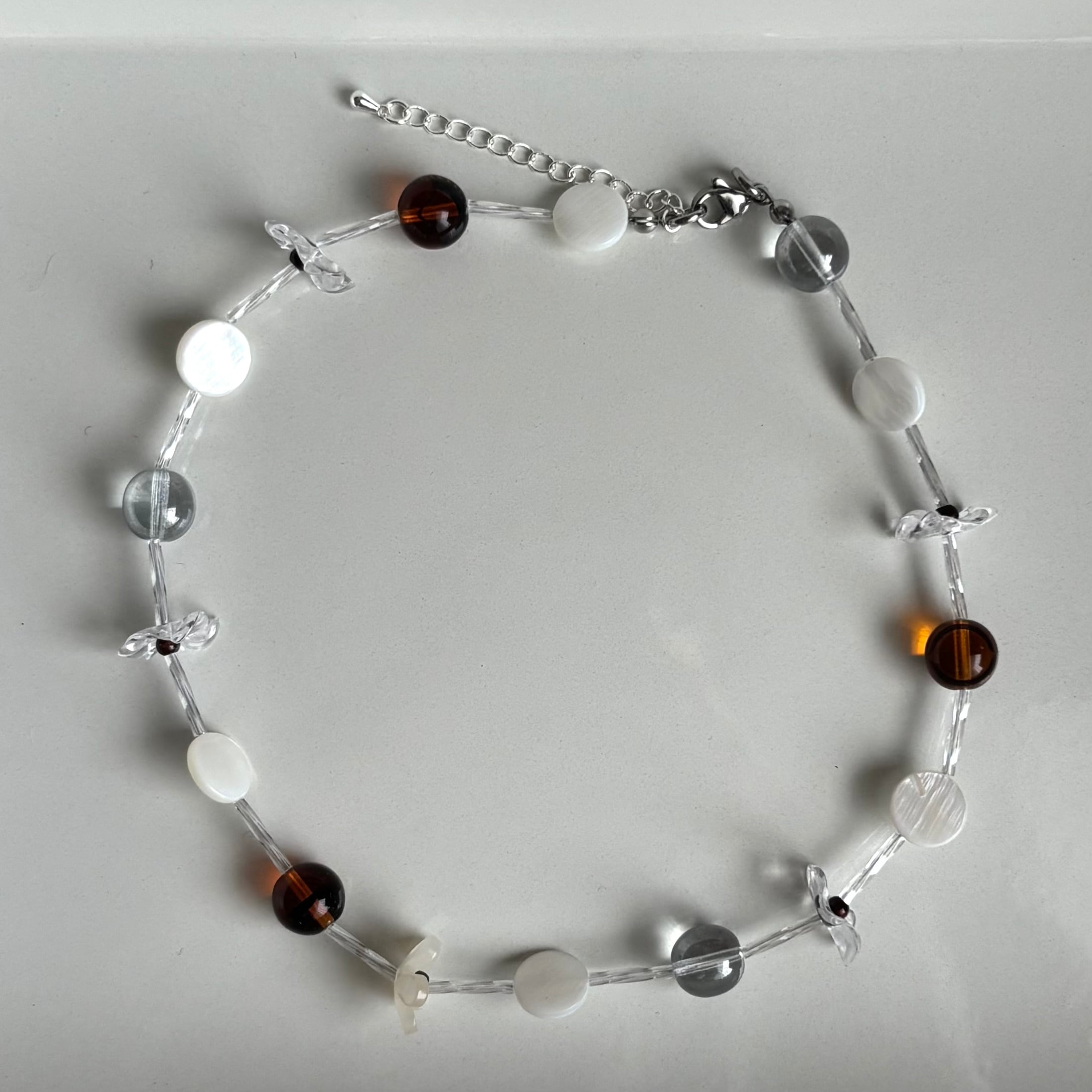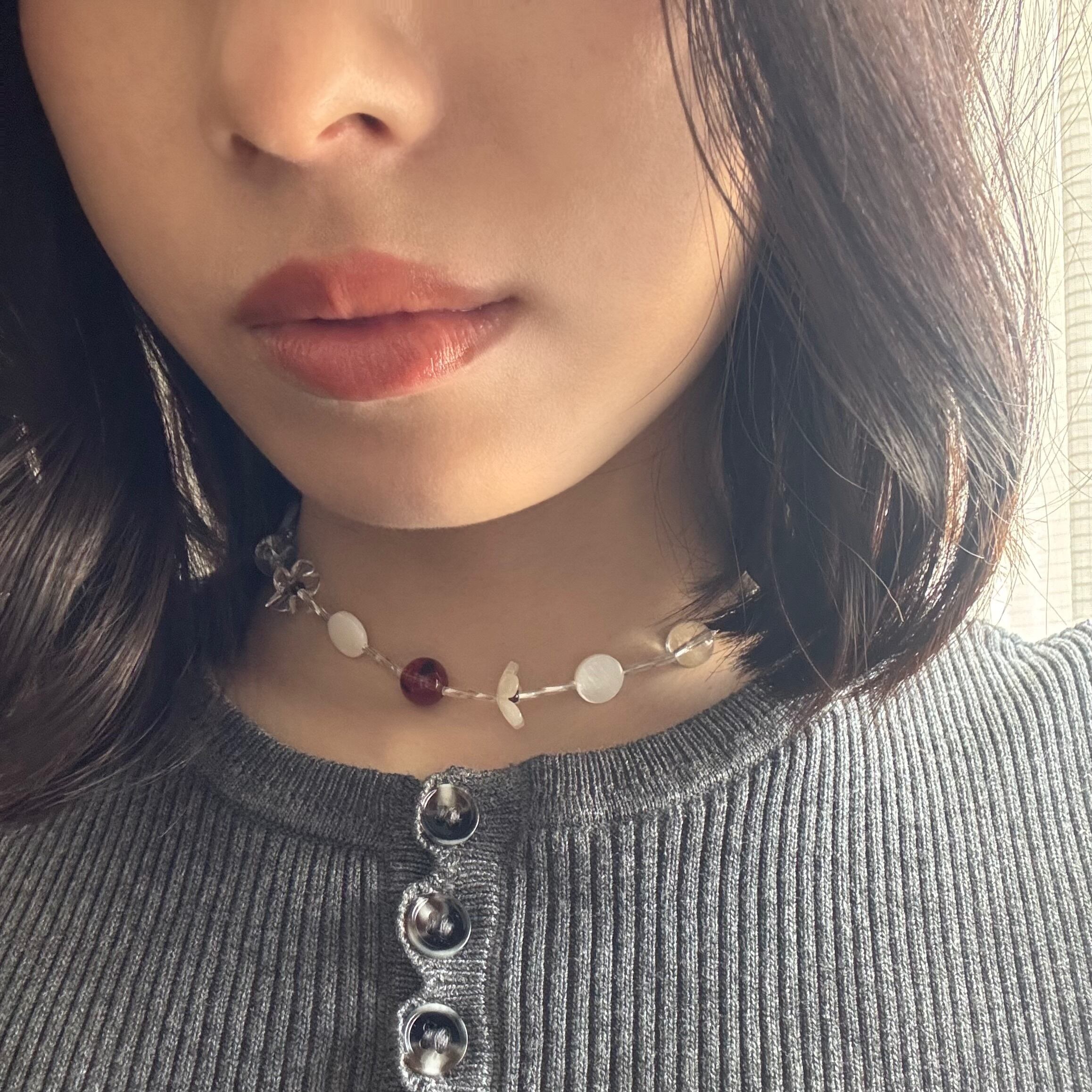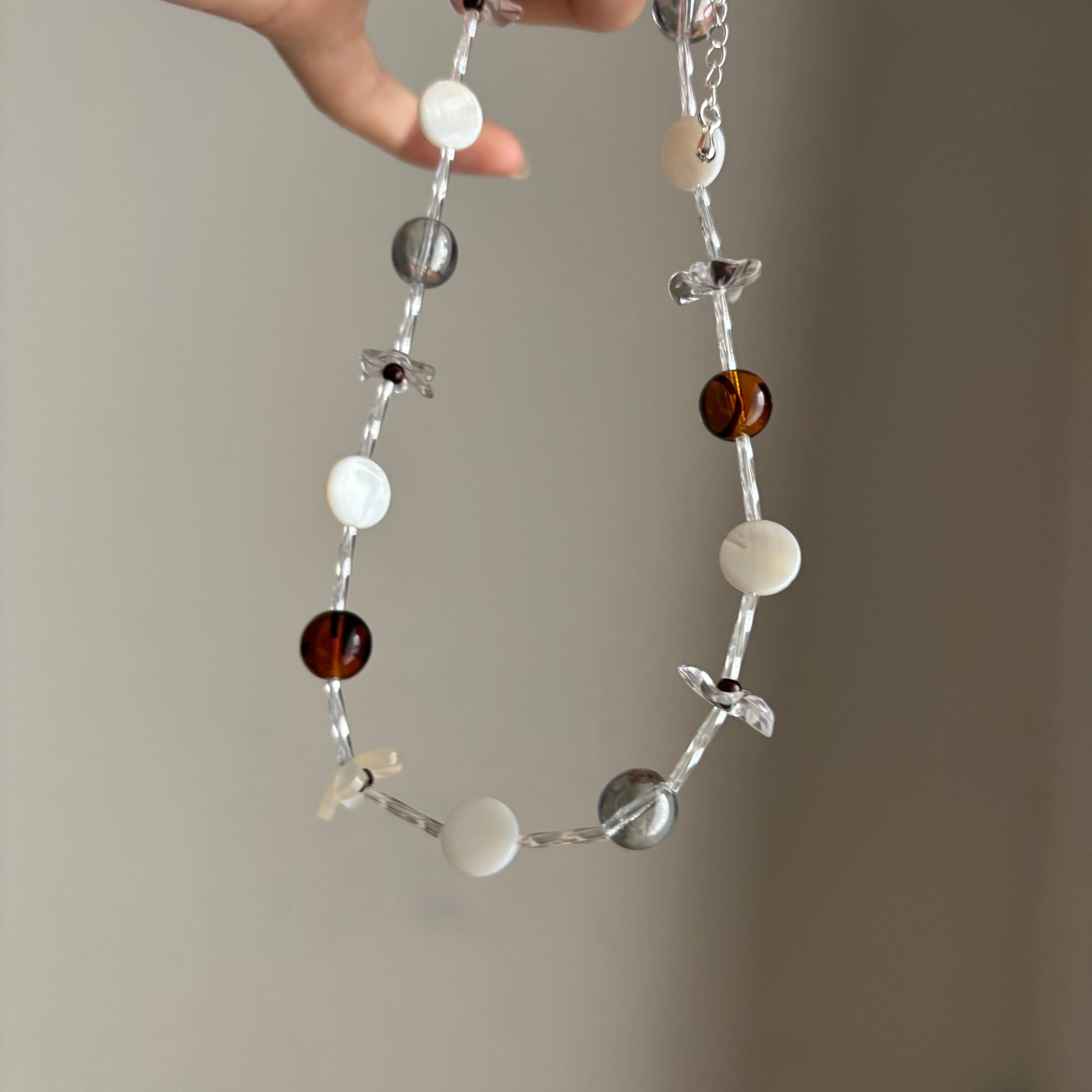 クリアパーツやシェルビーズの透き通る美しさと、お花のモチーフを掛け合わせたネックレス。