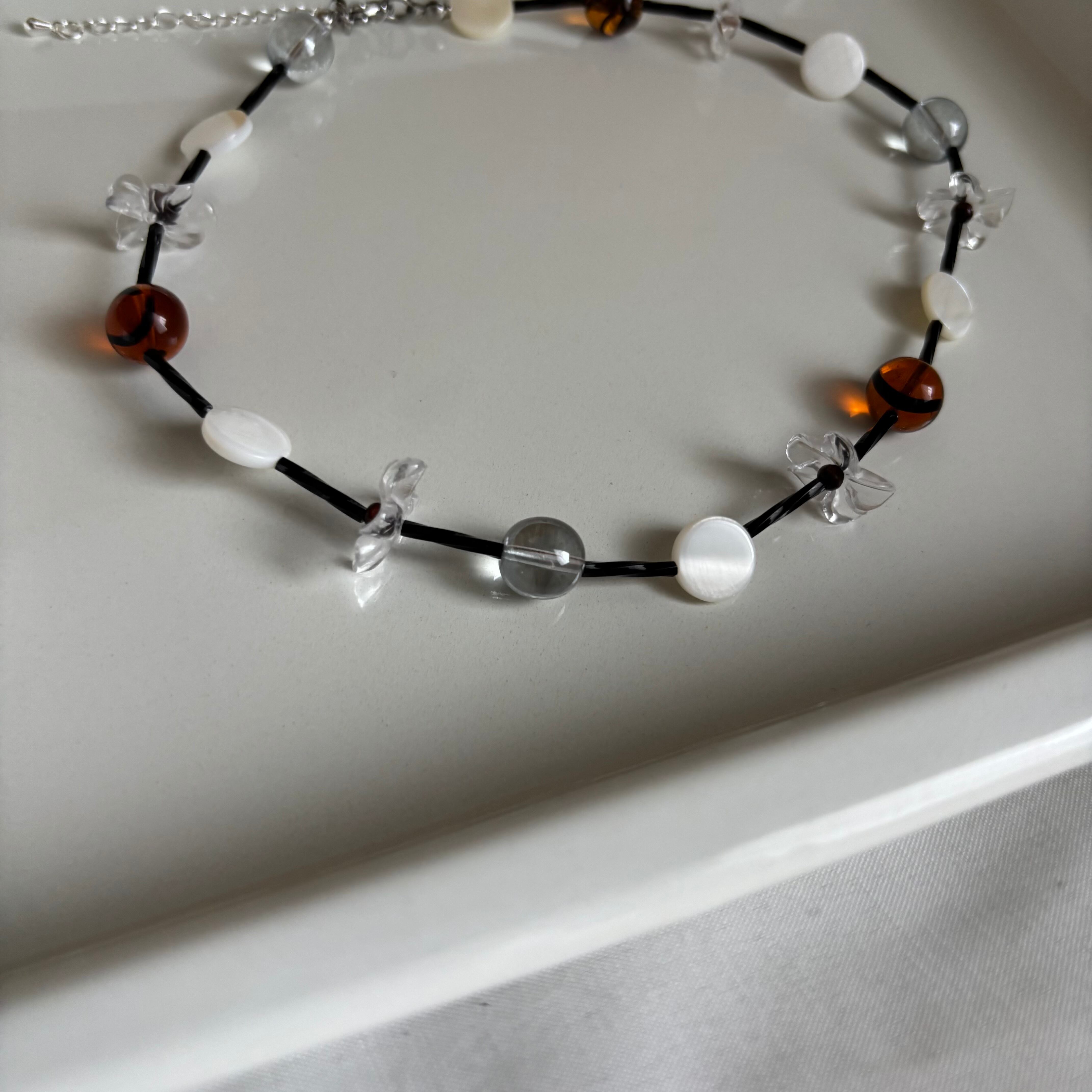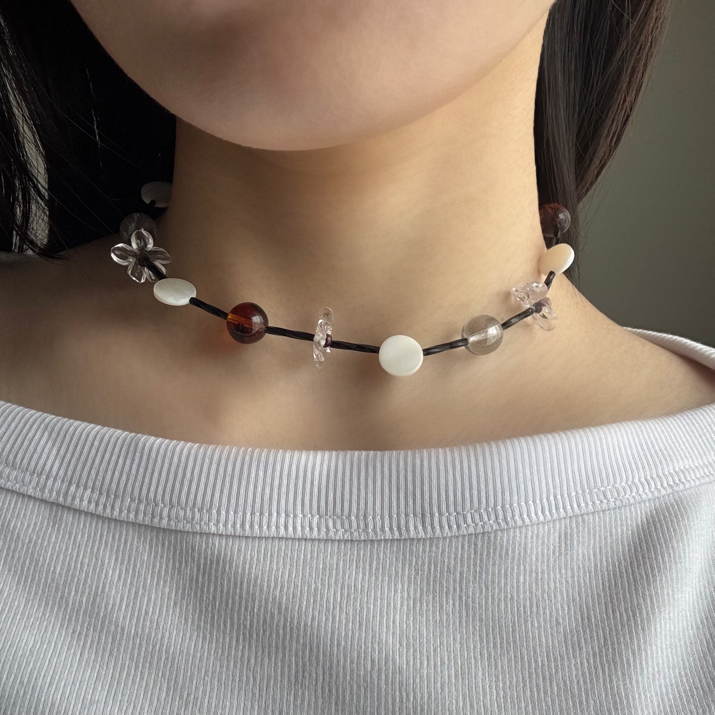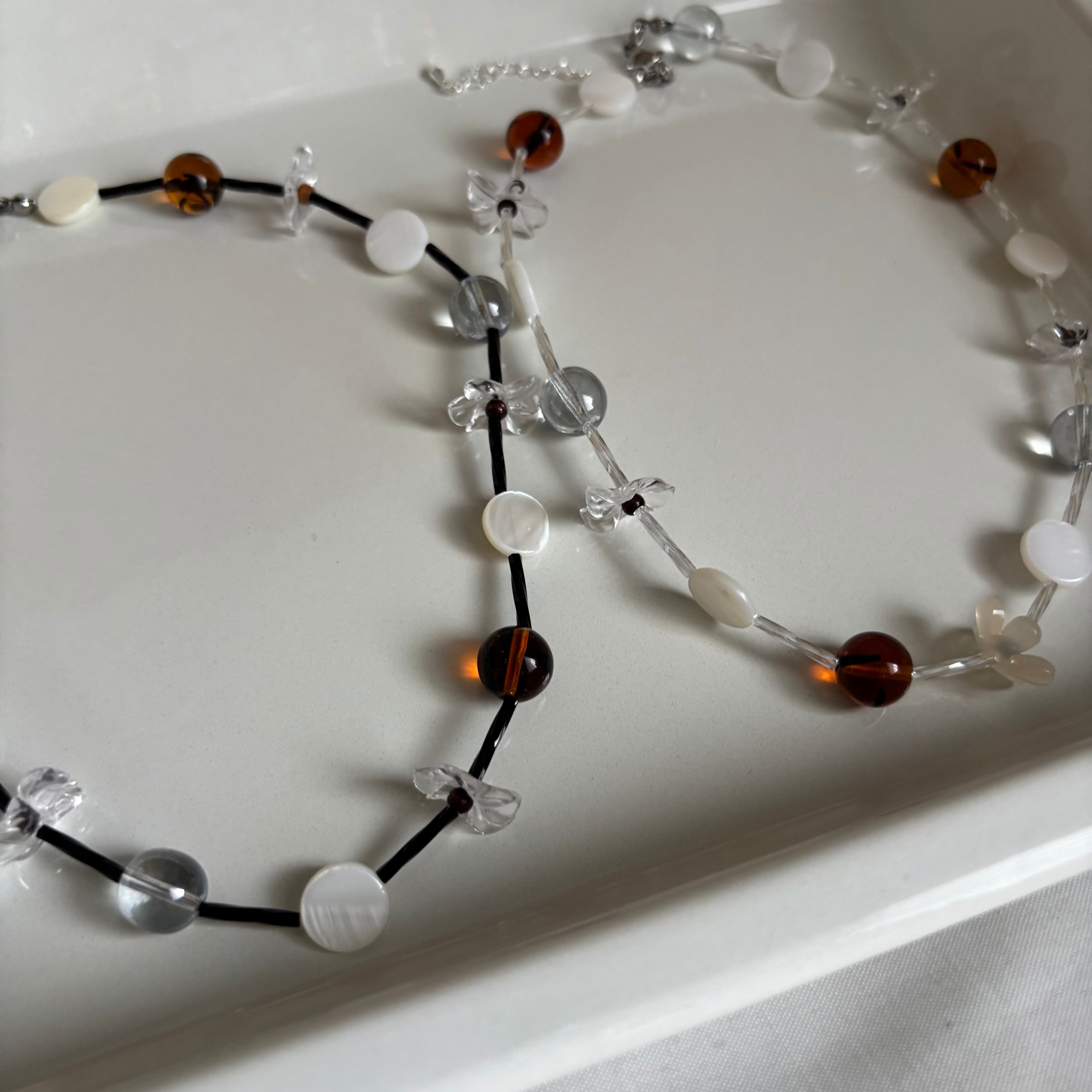 クリアパーツやシェルビーズの透き通る美しさと、お花のモチーフを掛け合わせたネックレス。
