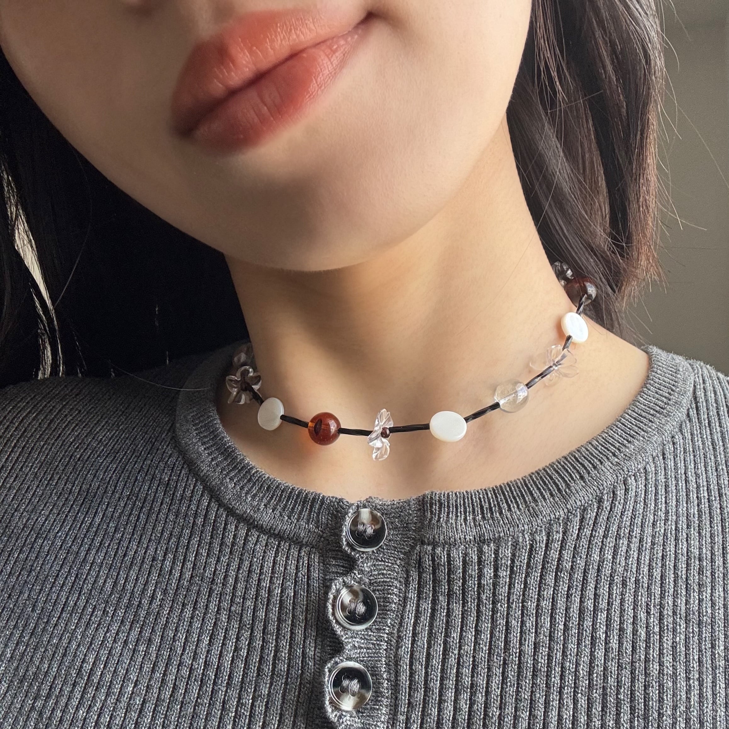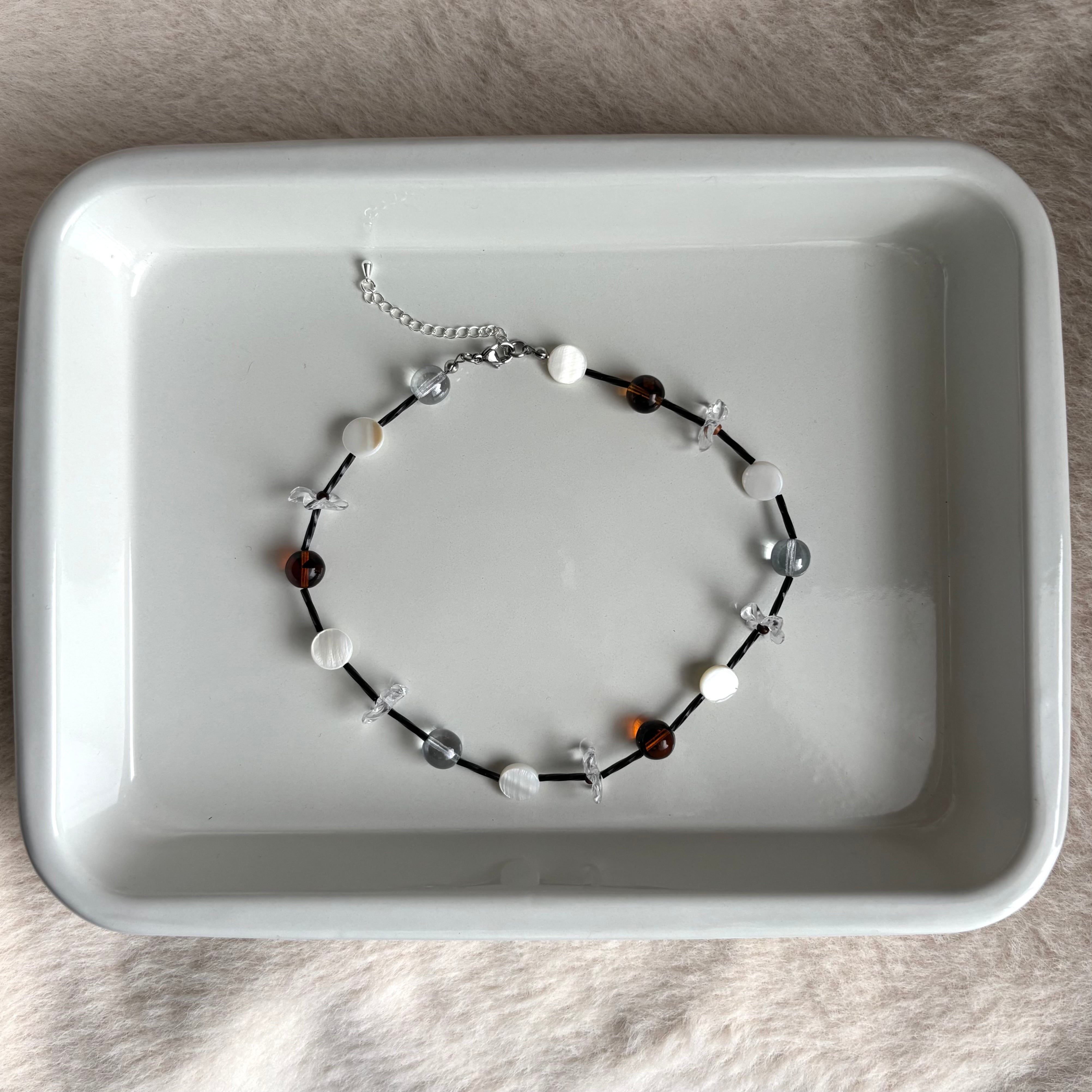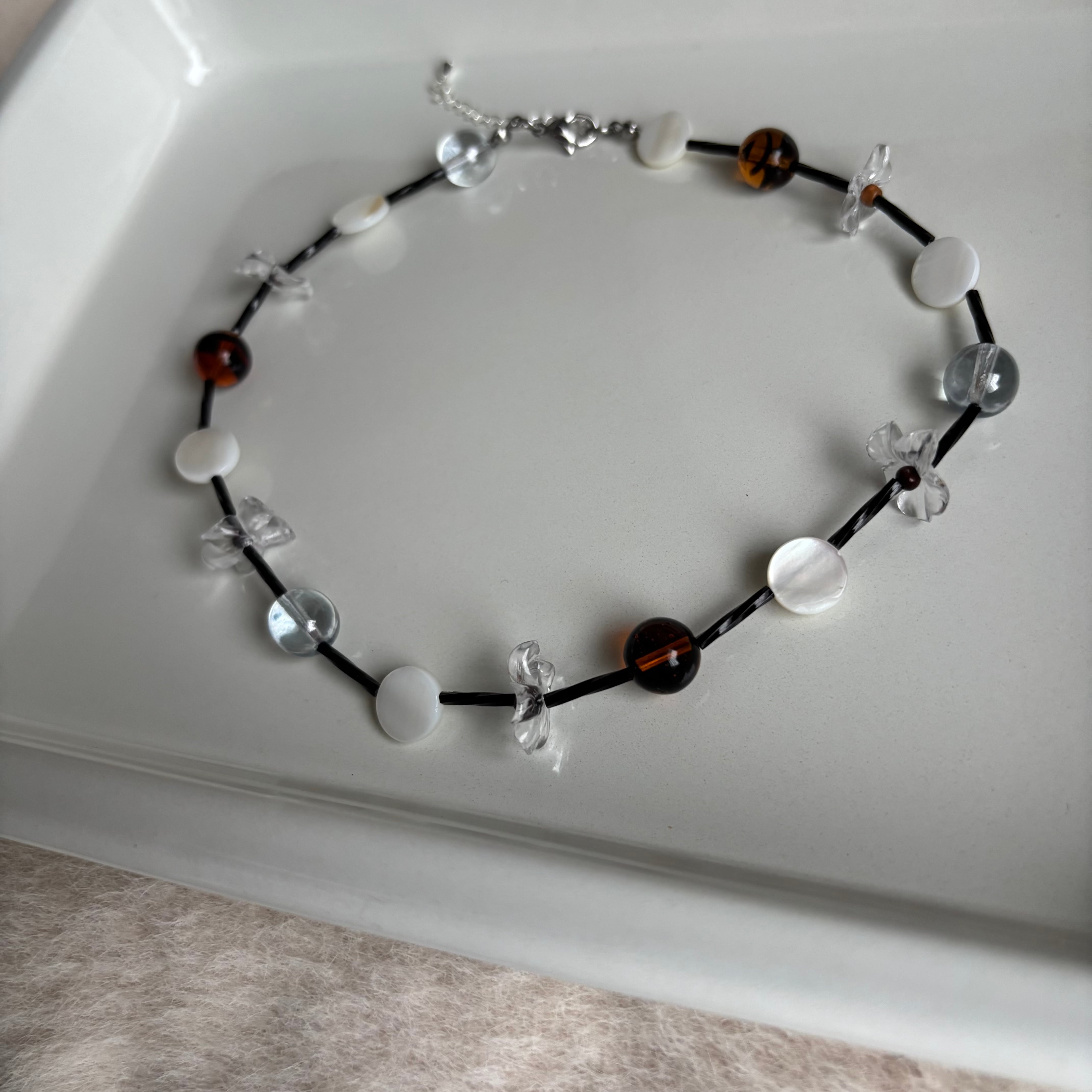 クリアパーツやシェルビーズの透き通る美しさと、お花のモチーフを掛け合わせたネックレス。