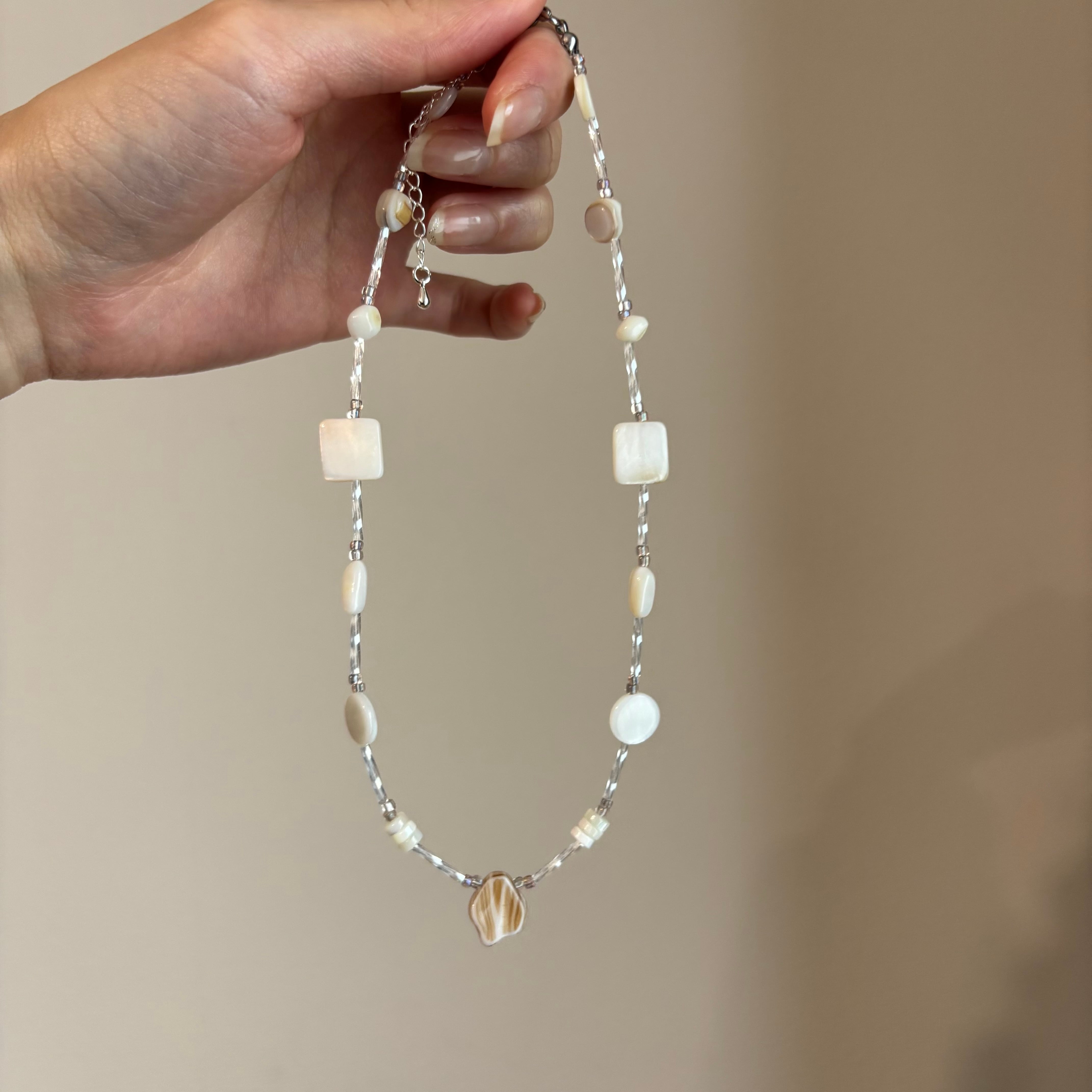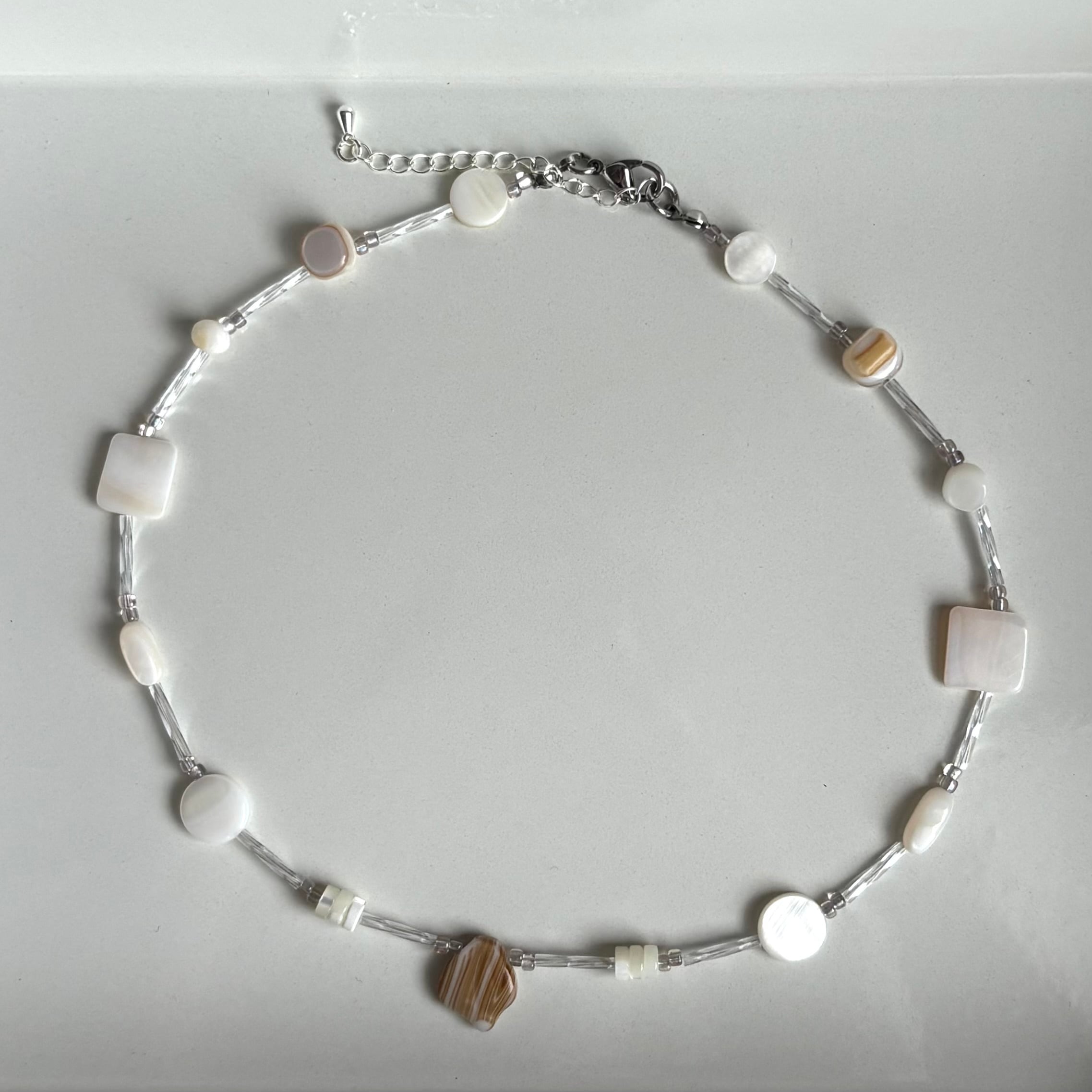 小さい頃、砂浜で拾い集めたお気に入りの貝殻を、そのまま繋ぎ合わせたようなどこか懐かしいネックレス。