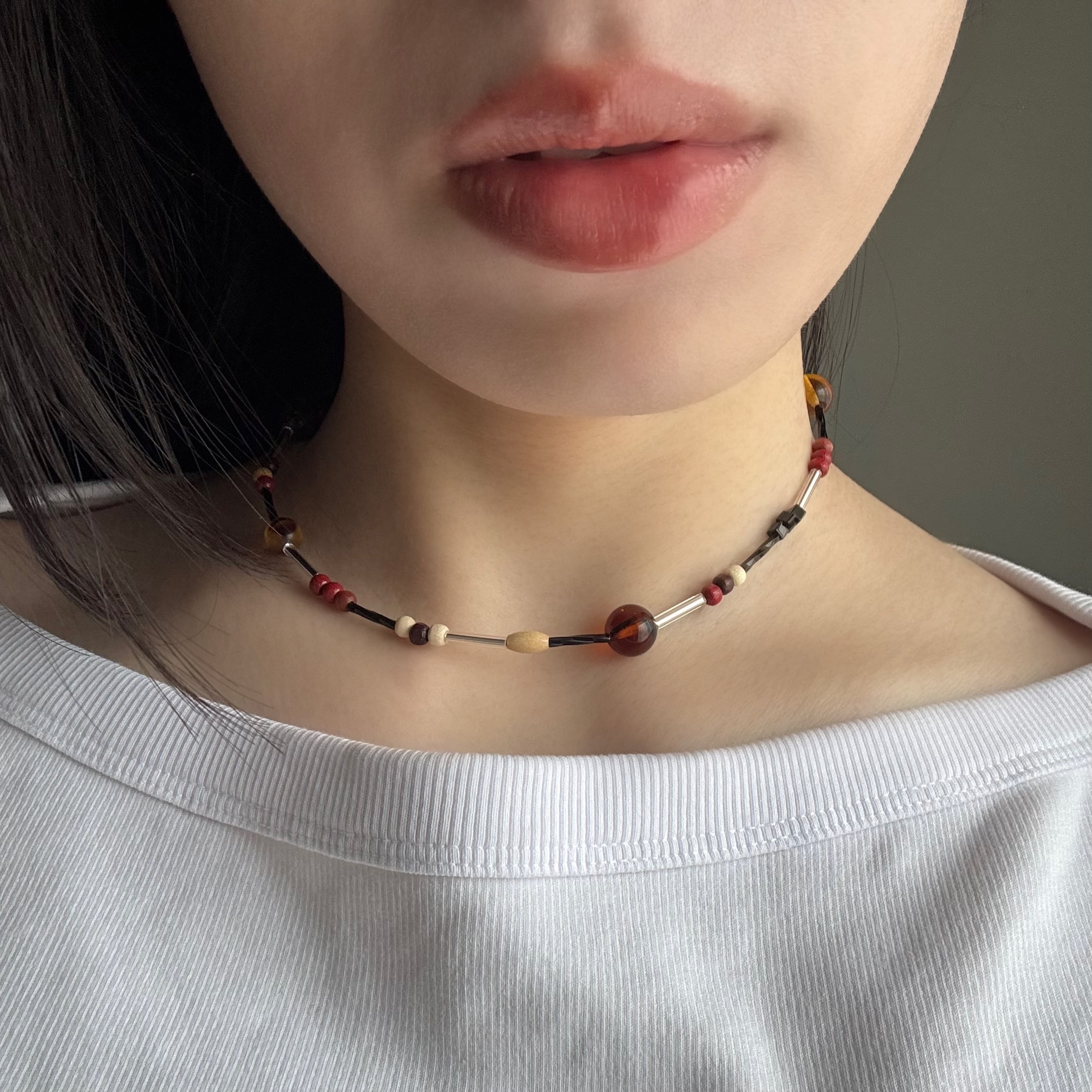 ウッドビーズのやさしいぬくもりに、赤茶のスパイスカラーを効かせた和モダンなデザイン。