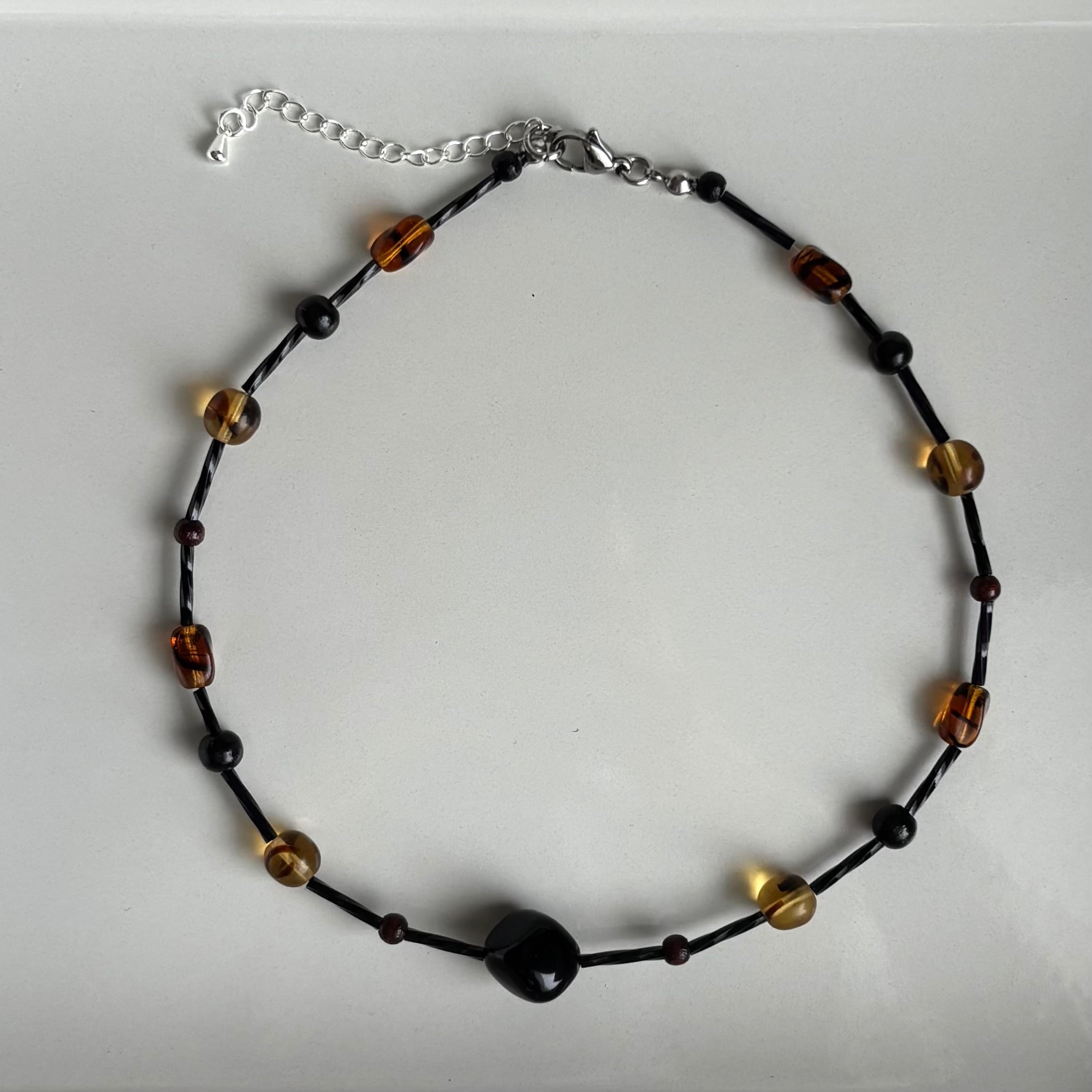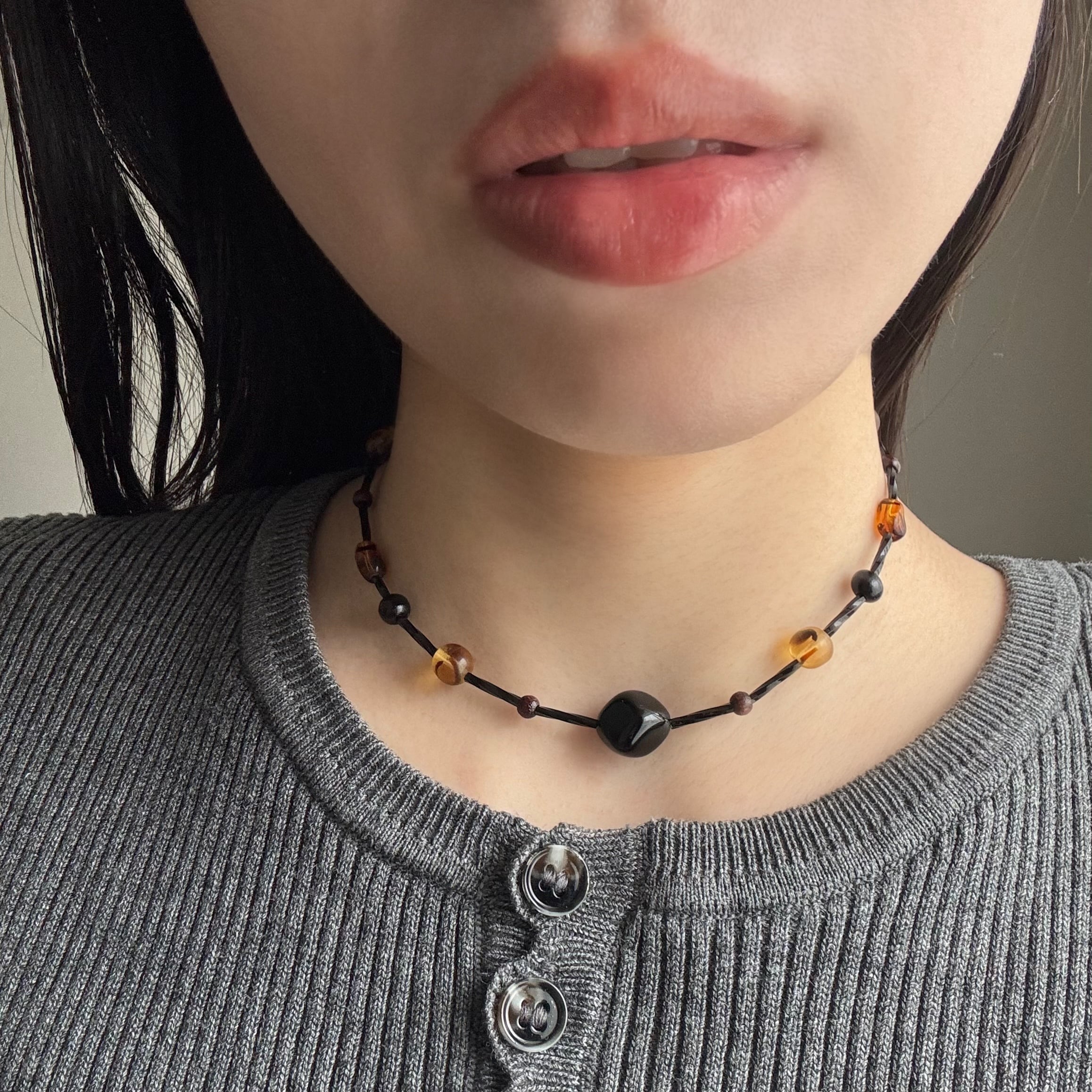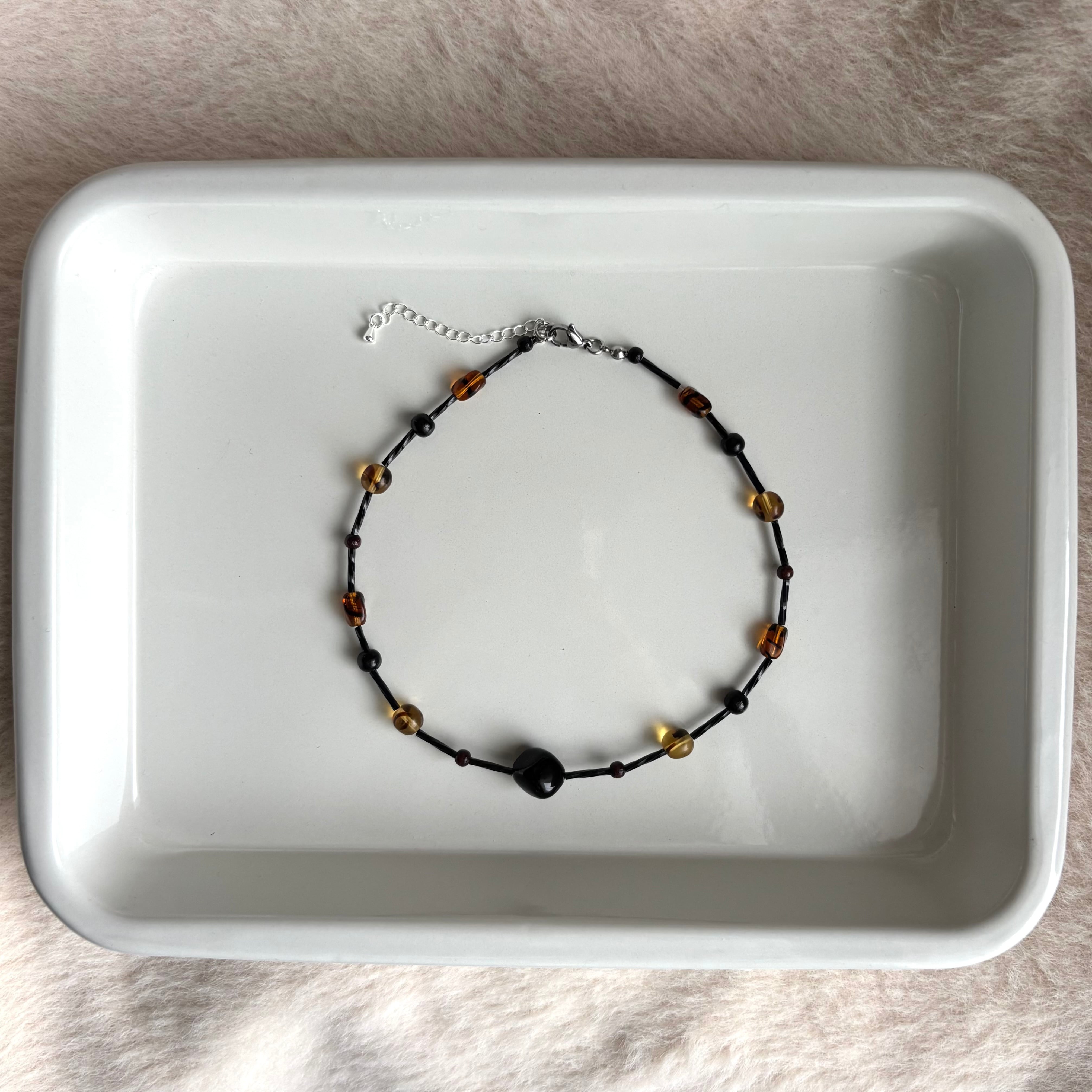 黒のビーズと透明感あふれるアンバーカラーを組み合わせた、