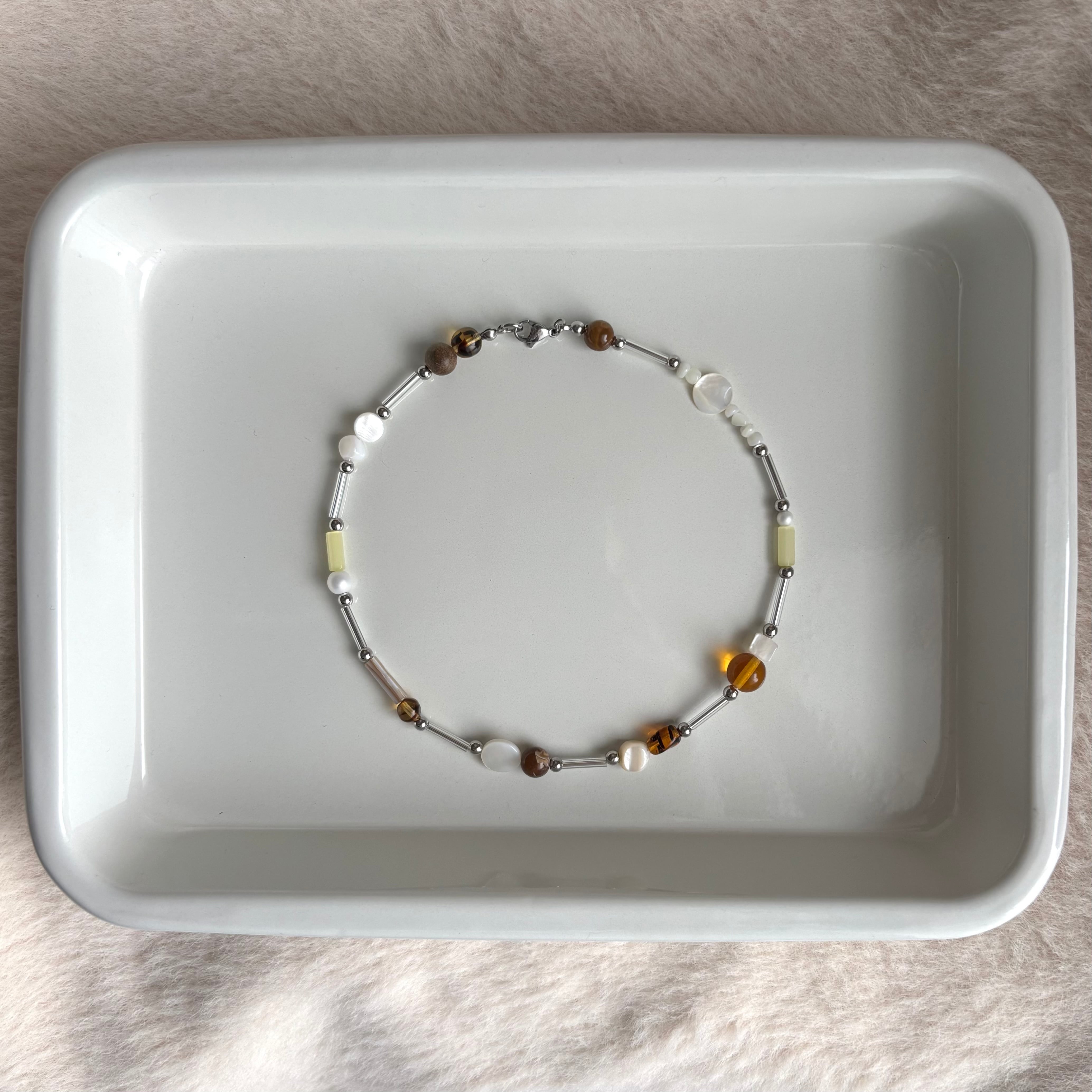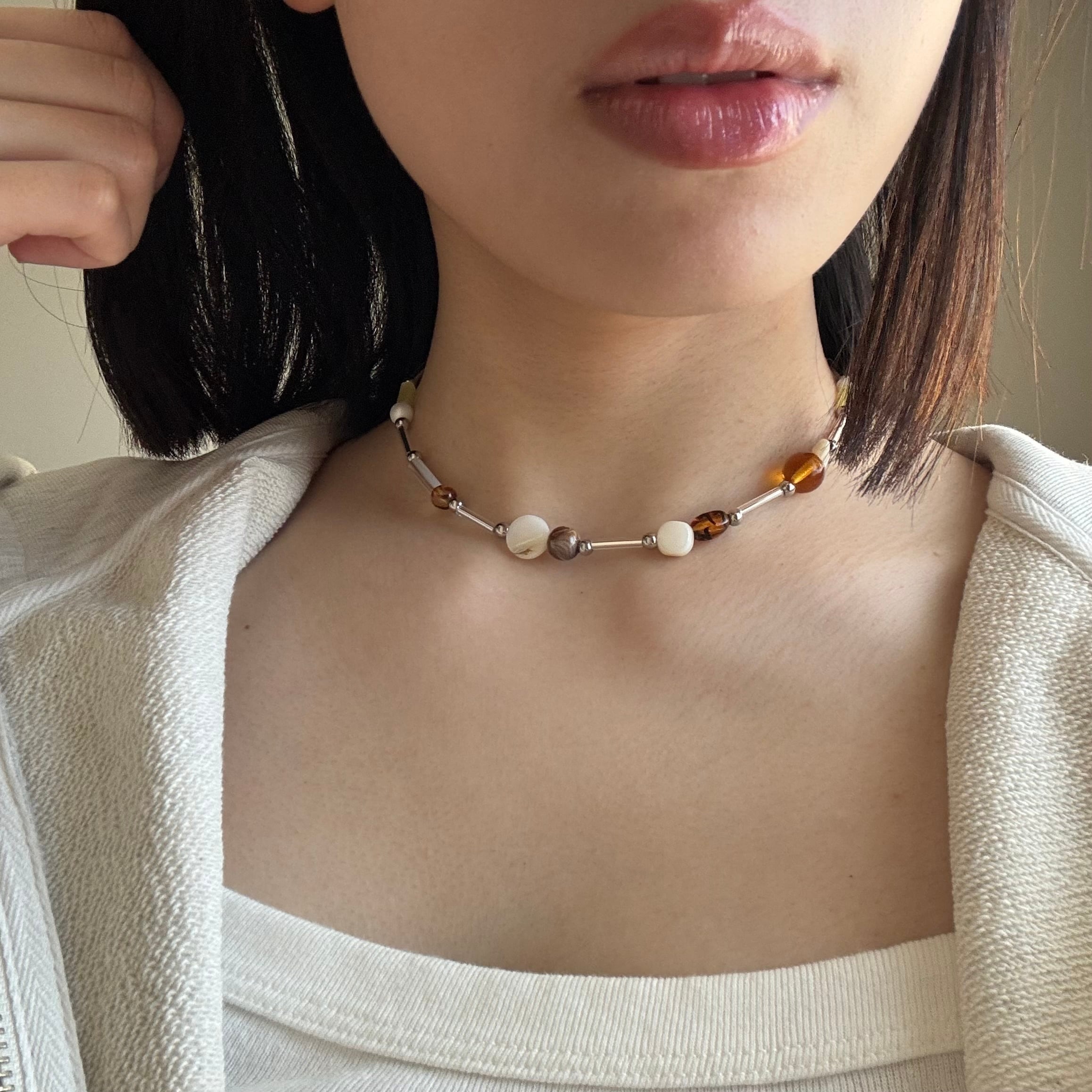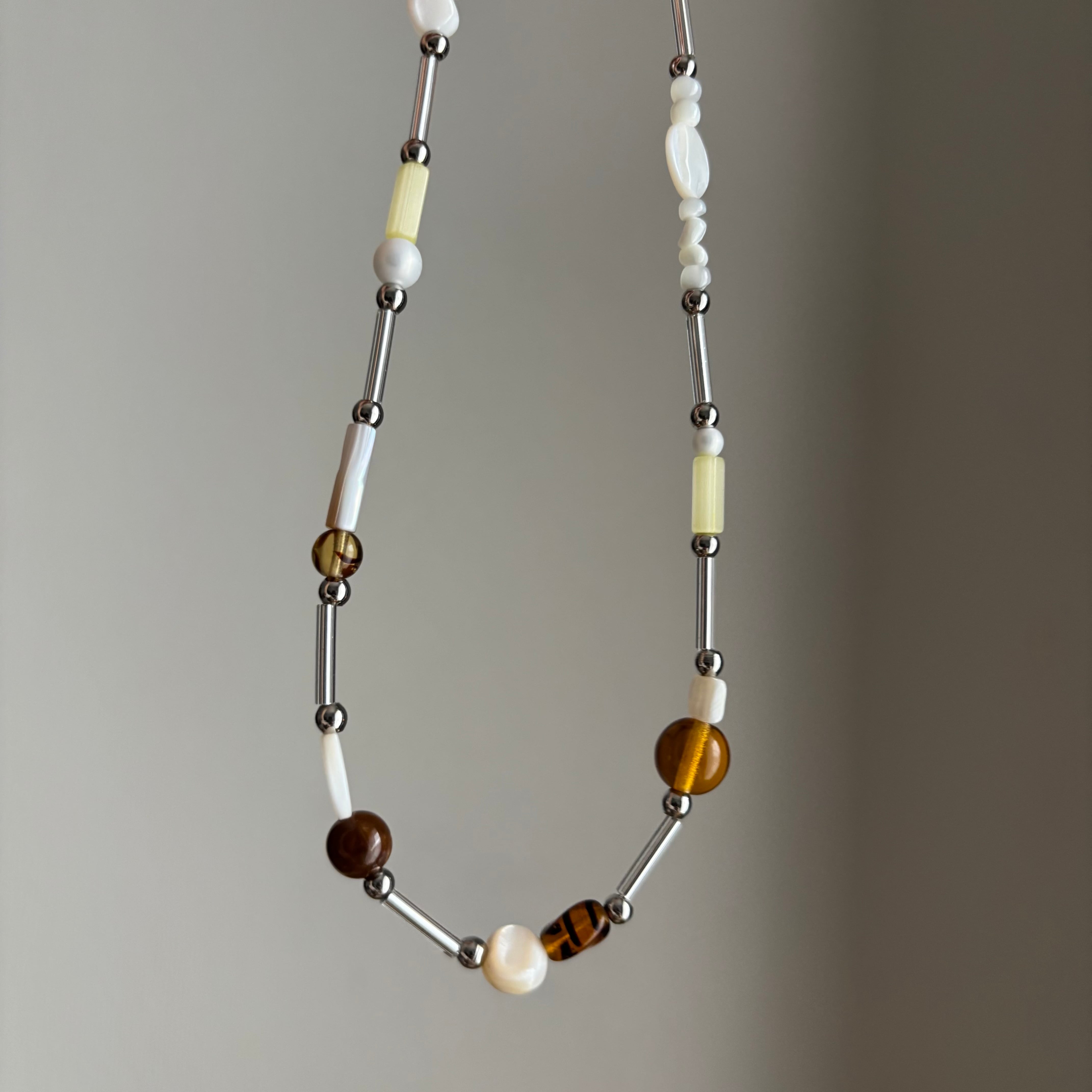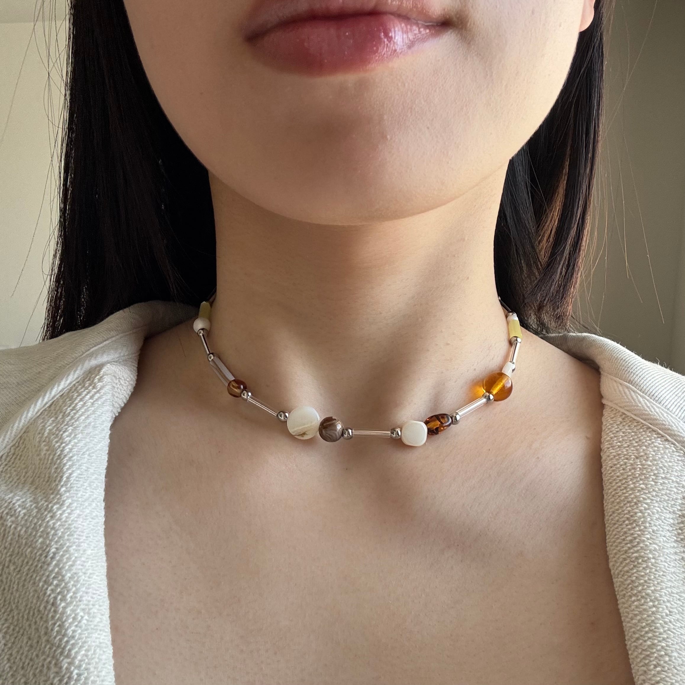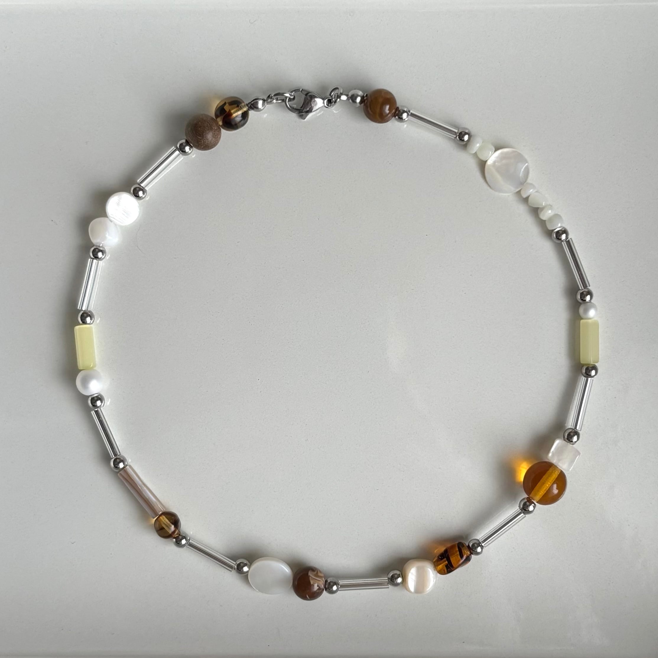 琥珀色やシルバーなど、質感の異なるパーツを不規則に配置し、遊び心を描いたネックレス。