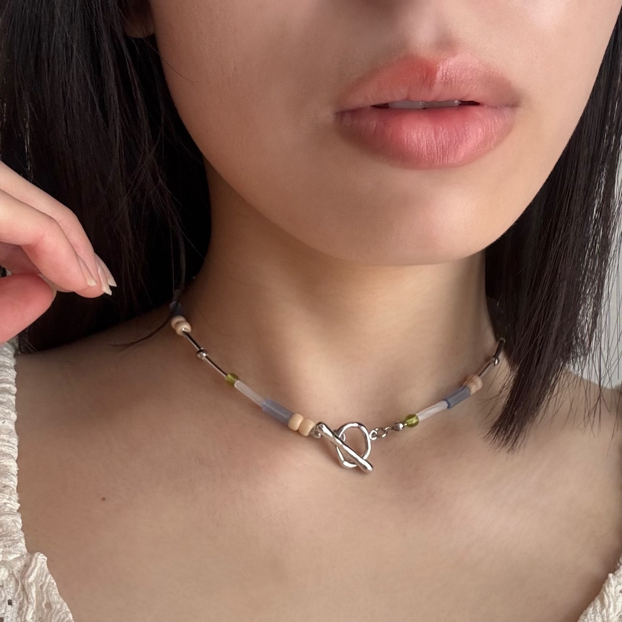 相反する二つのトーンを、透明感のあるビーズで軽やかに繋ぎました。