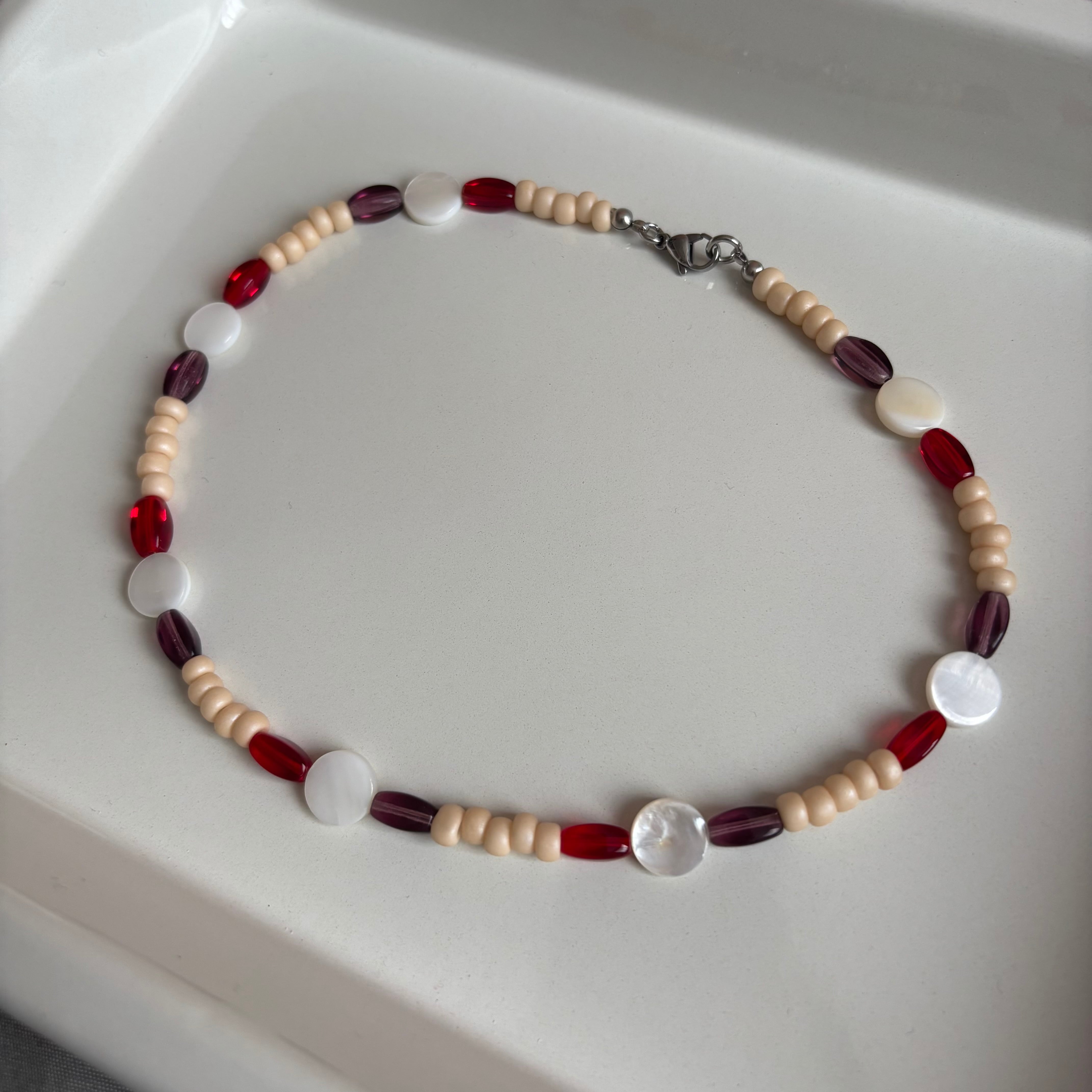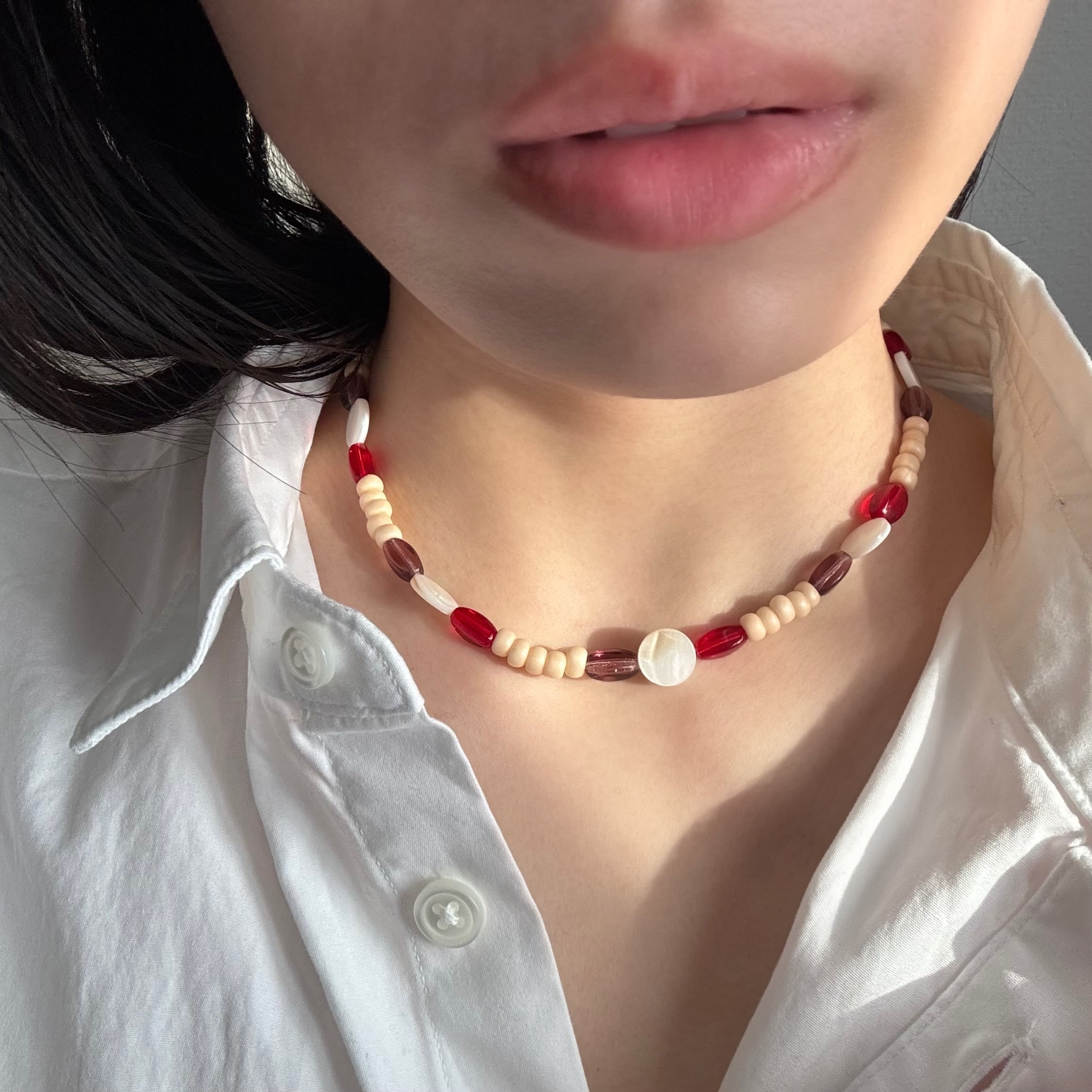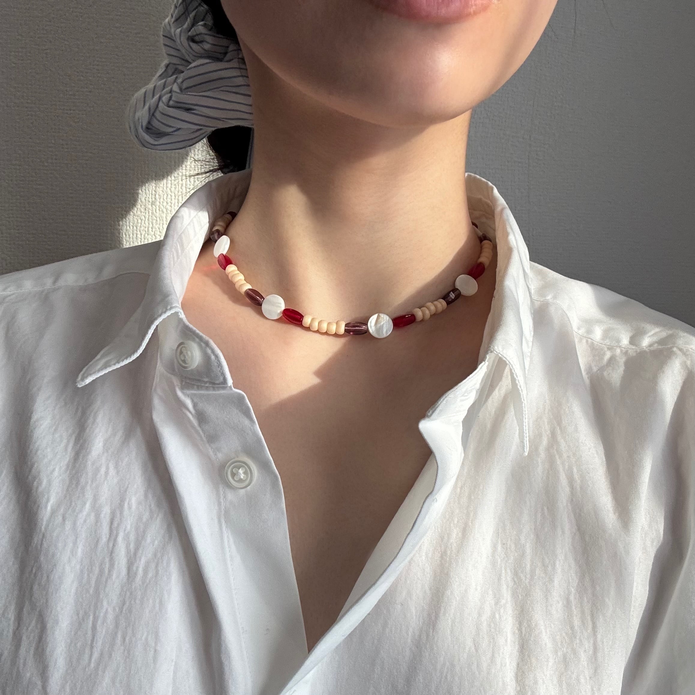 マットな質感で温かみの感じるベージュビーズと、光を反射するシェルのコントラスト。柔らかなトーンの中に、赤と紫のアクセント。反する要素が一つに調和した、存在感のあるデザインです。
