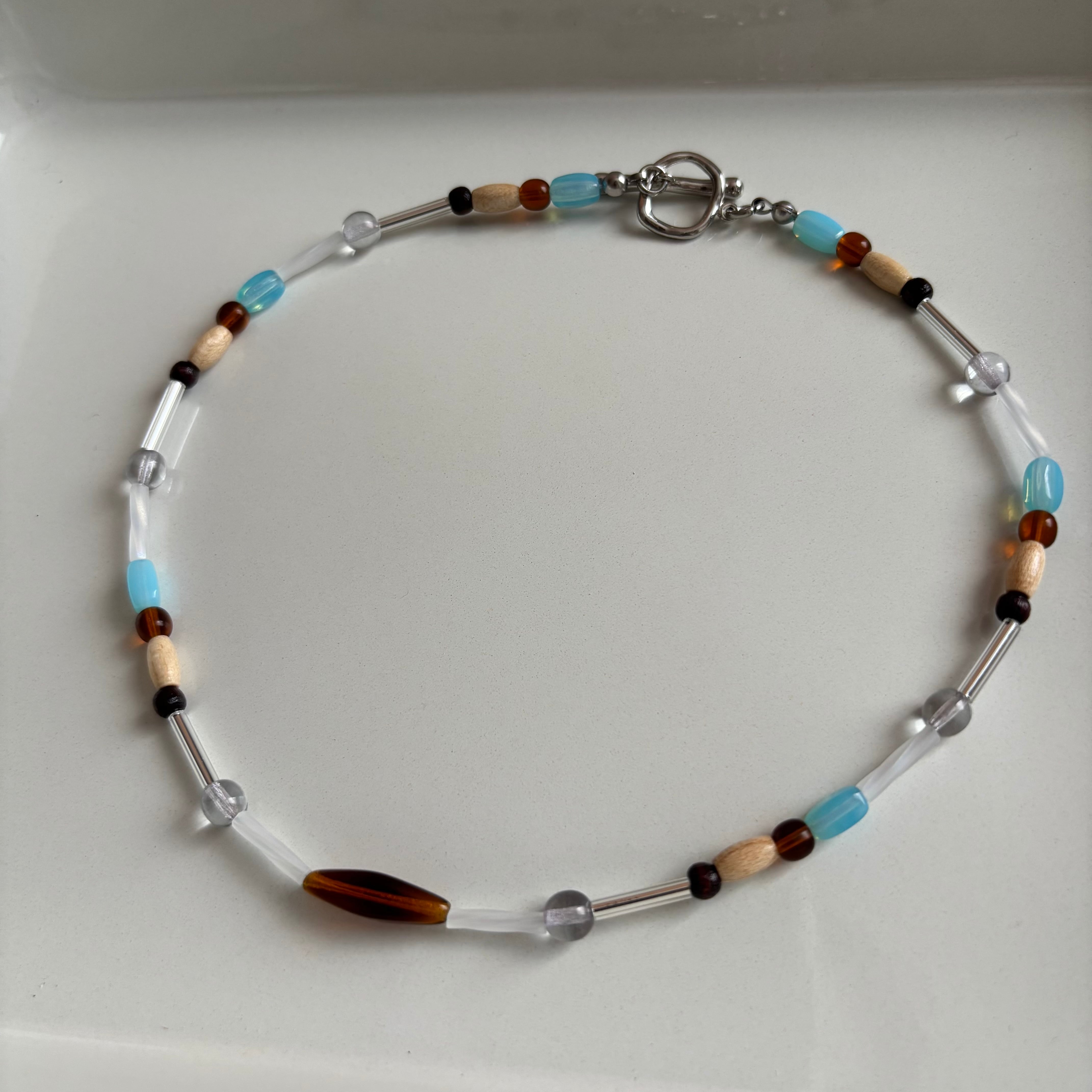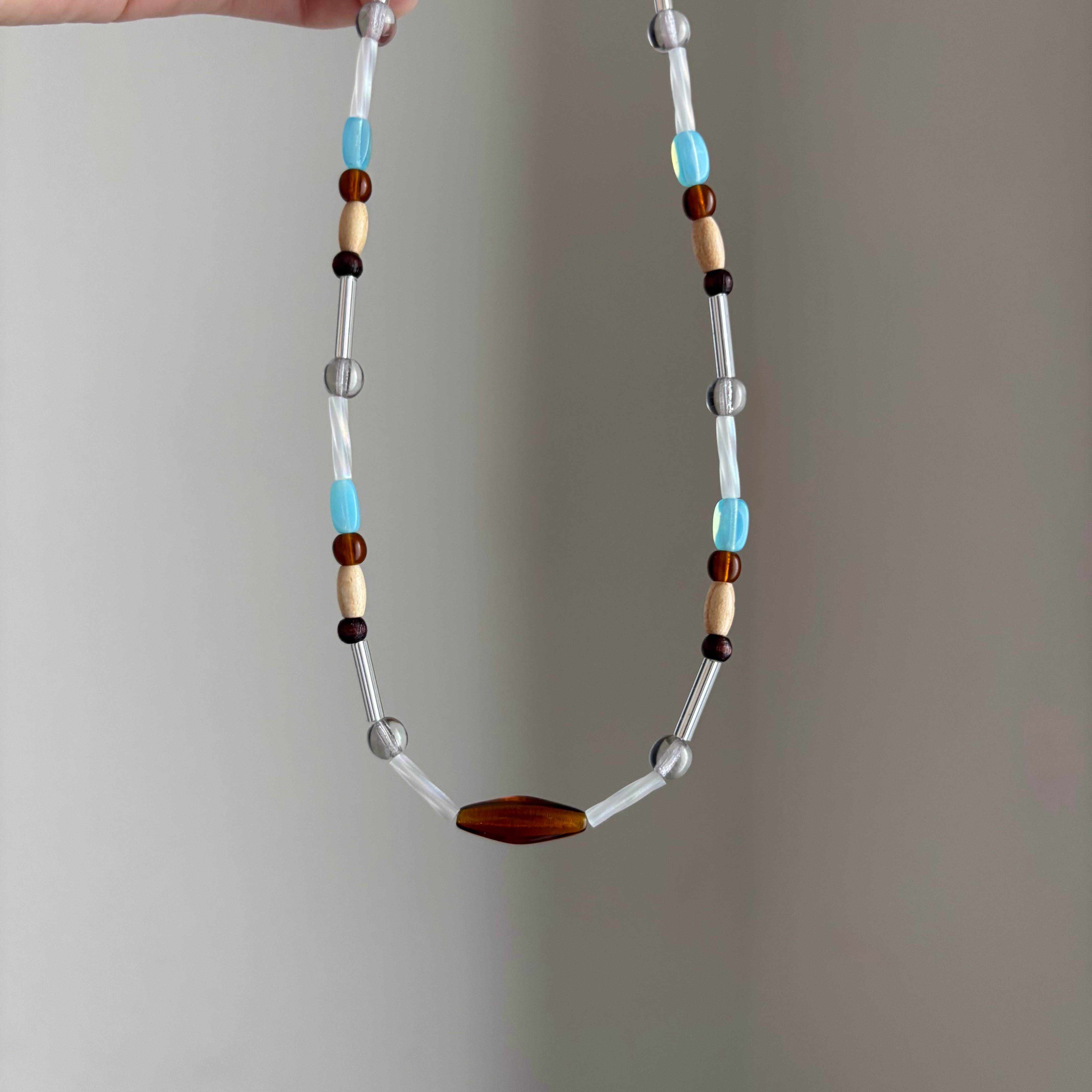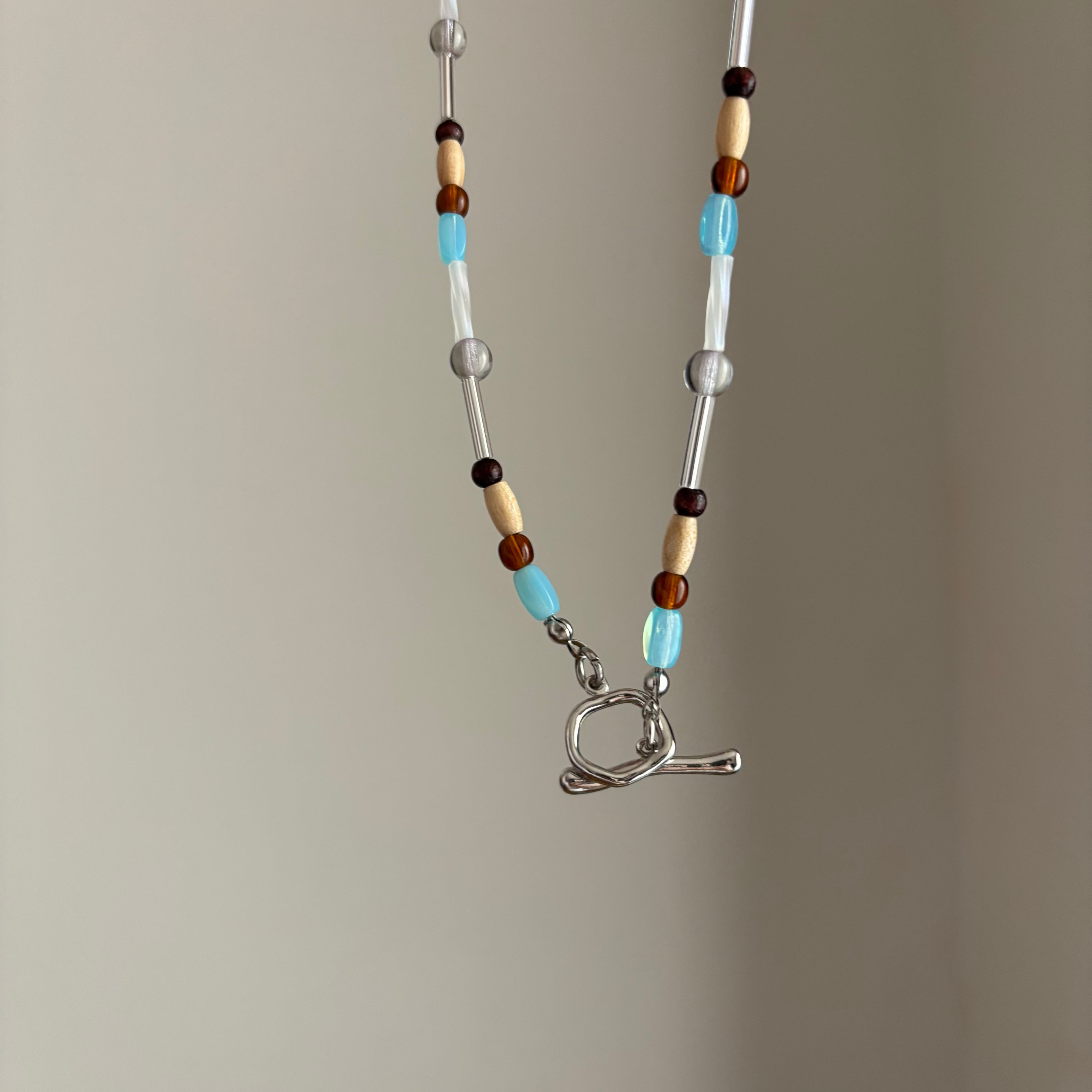 落ち着いたブラウンと、鮮やかなスカイブルー。相反する二つの色彩が首元で並行(parallel)し、互いの存在感を引き立て合うデザインです。計算された色の配置が、モダンで知的なエッジを演出します。