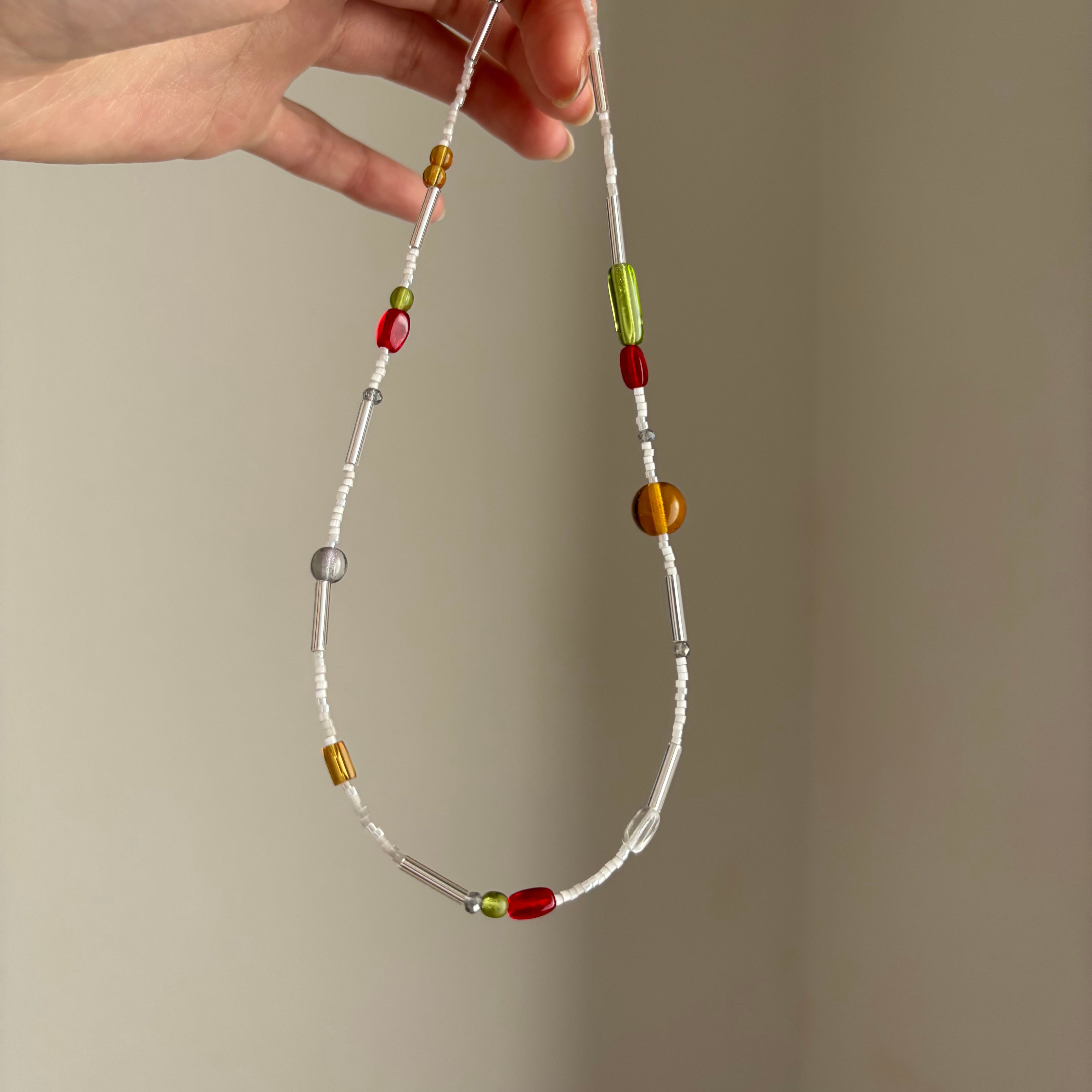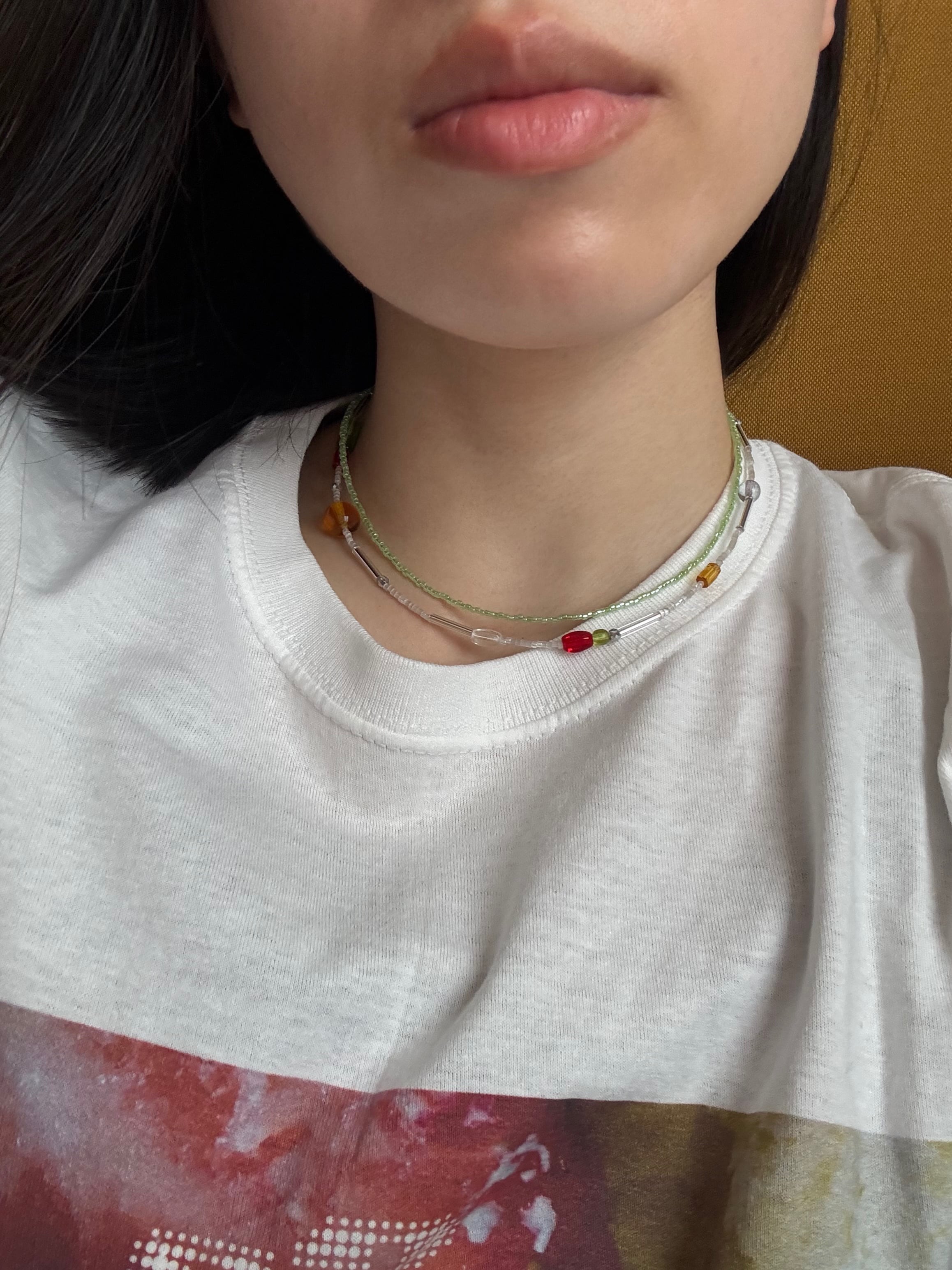 透け感のある原色のビーズが、クリアなラインの中を流れるように配置され、色彩のエネルギーと、モダンな透明感が融合した、首元で視線を惹きつけるエッジの効いた一本です。