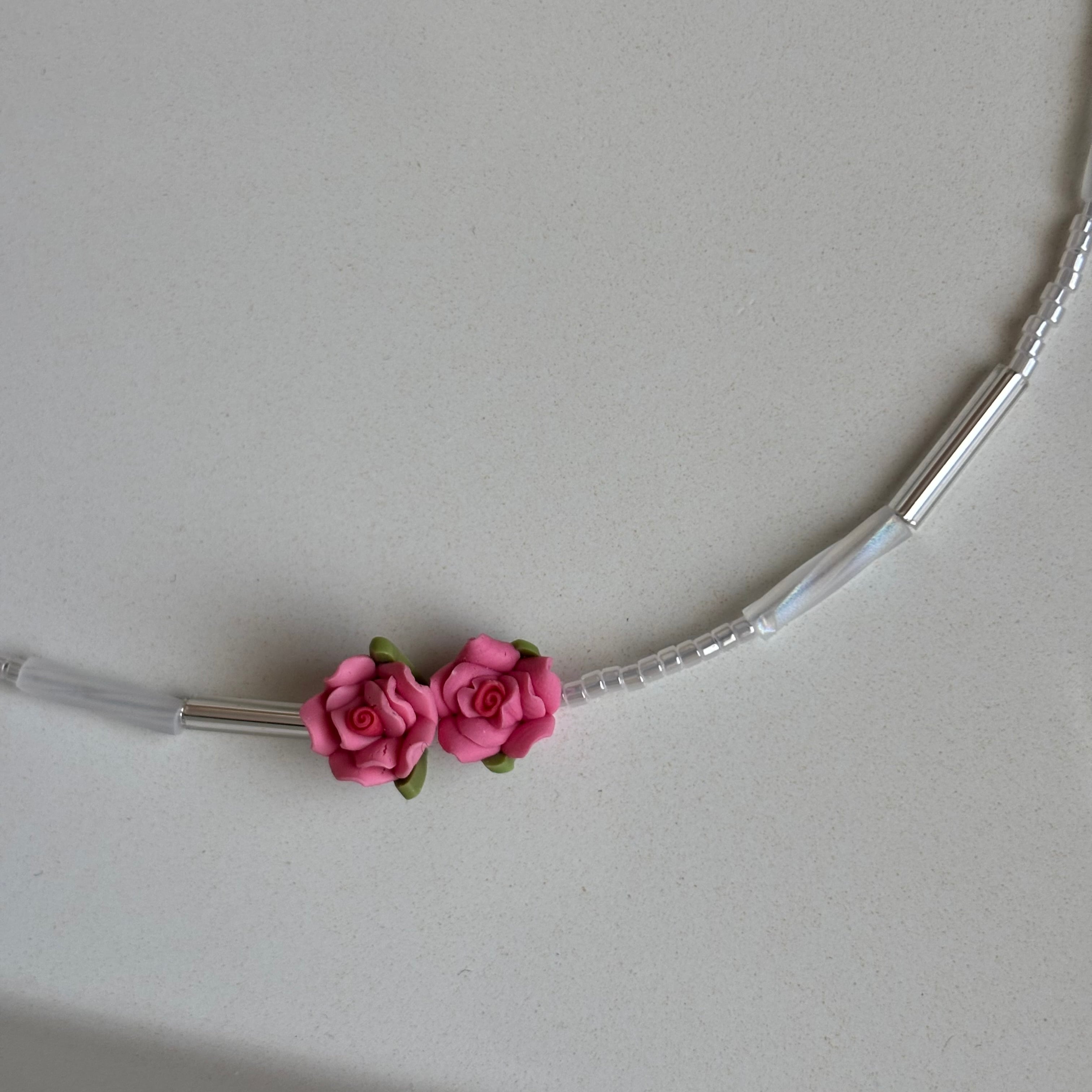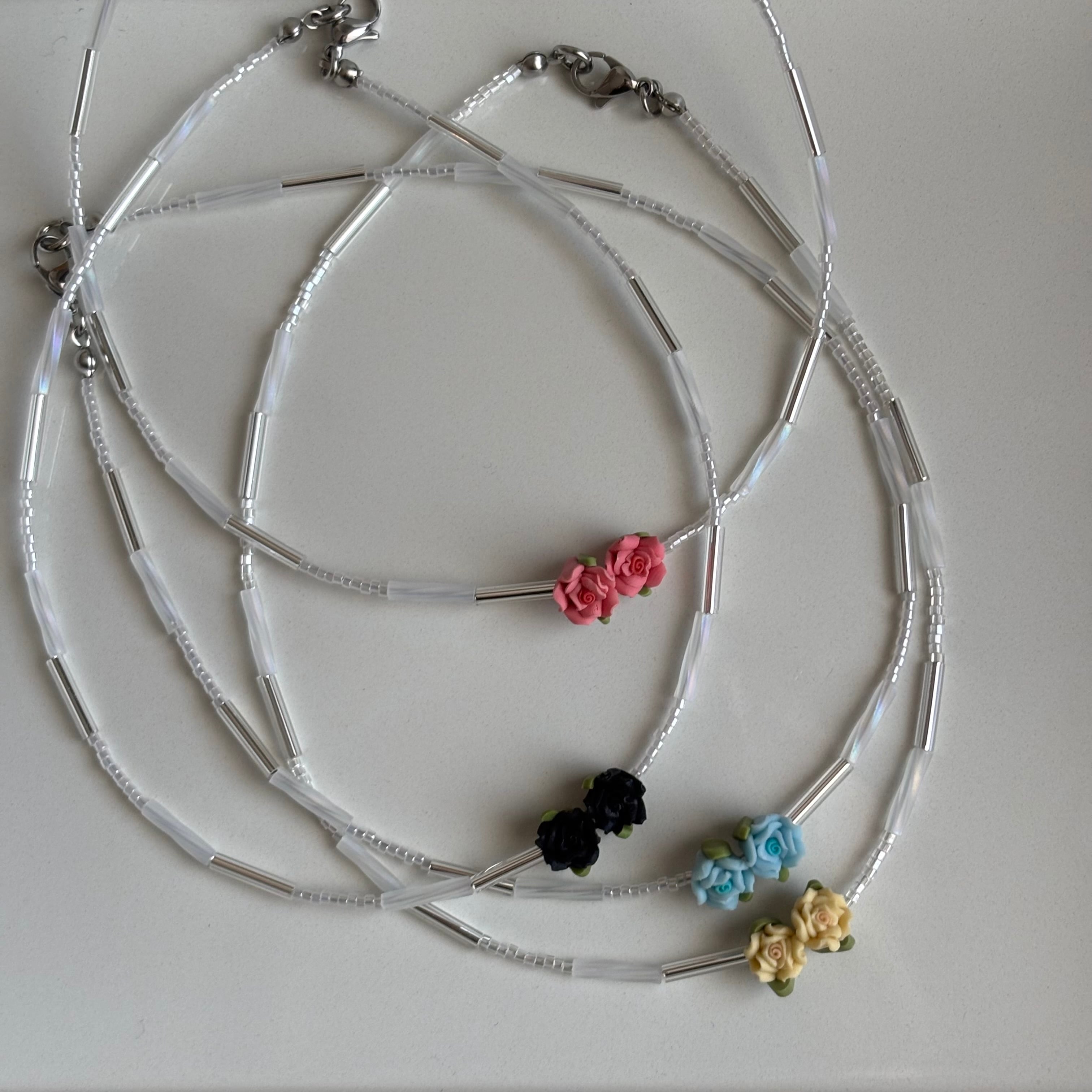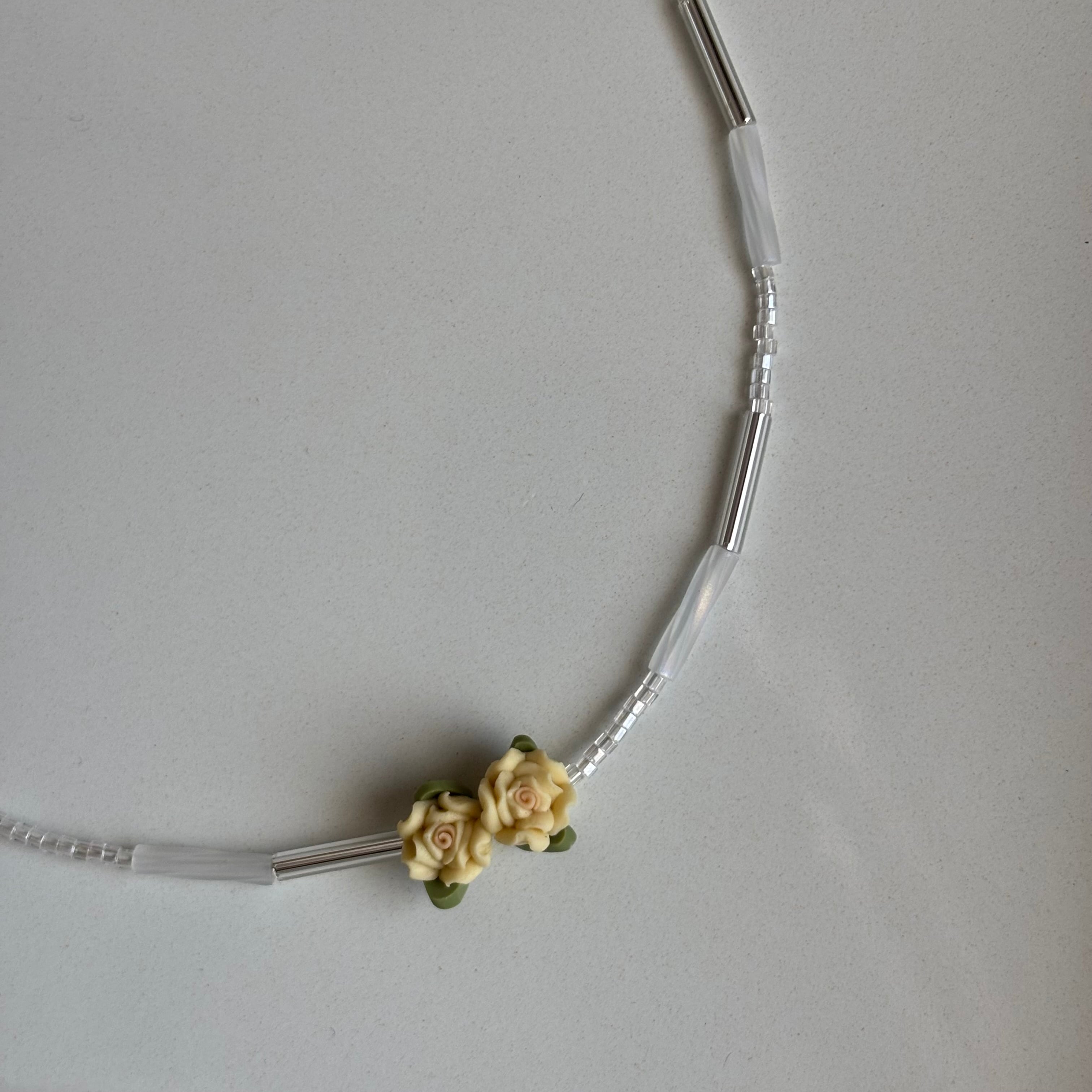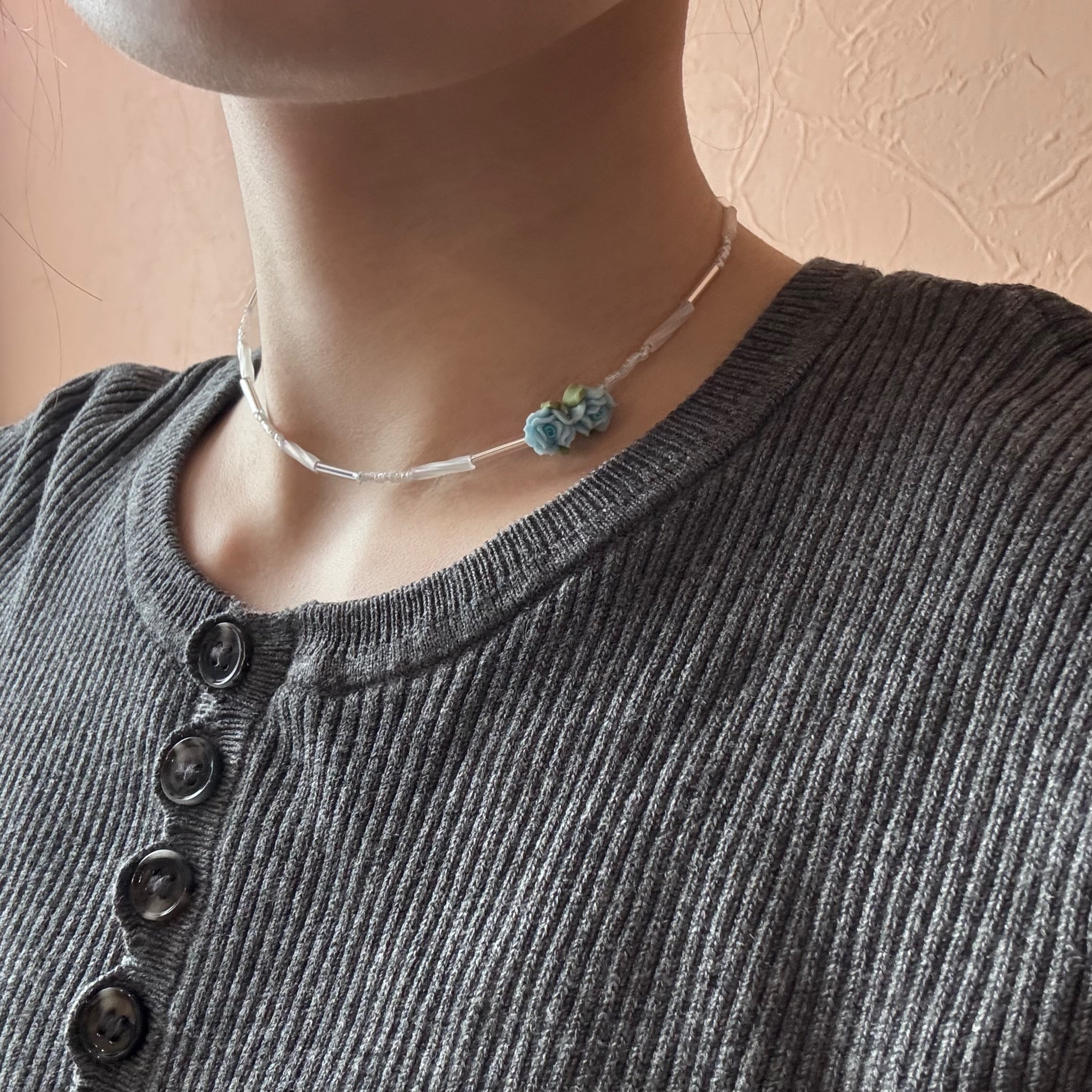 敢えてセンターを外したバラパーツが大人かわいいネックレス。