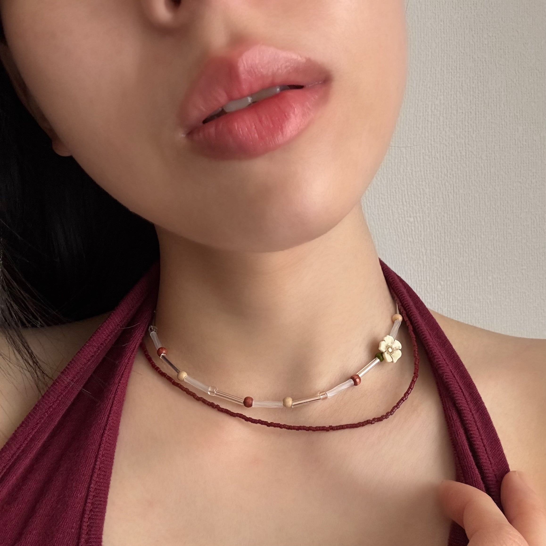 温もりのあるウッドビーズと、瑞々しい透明感。